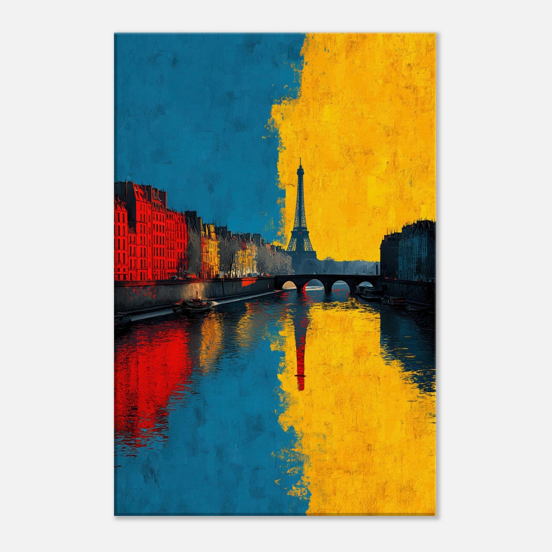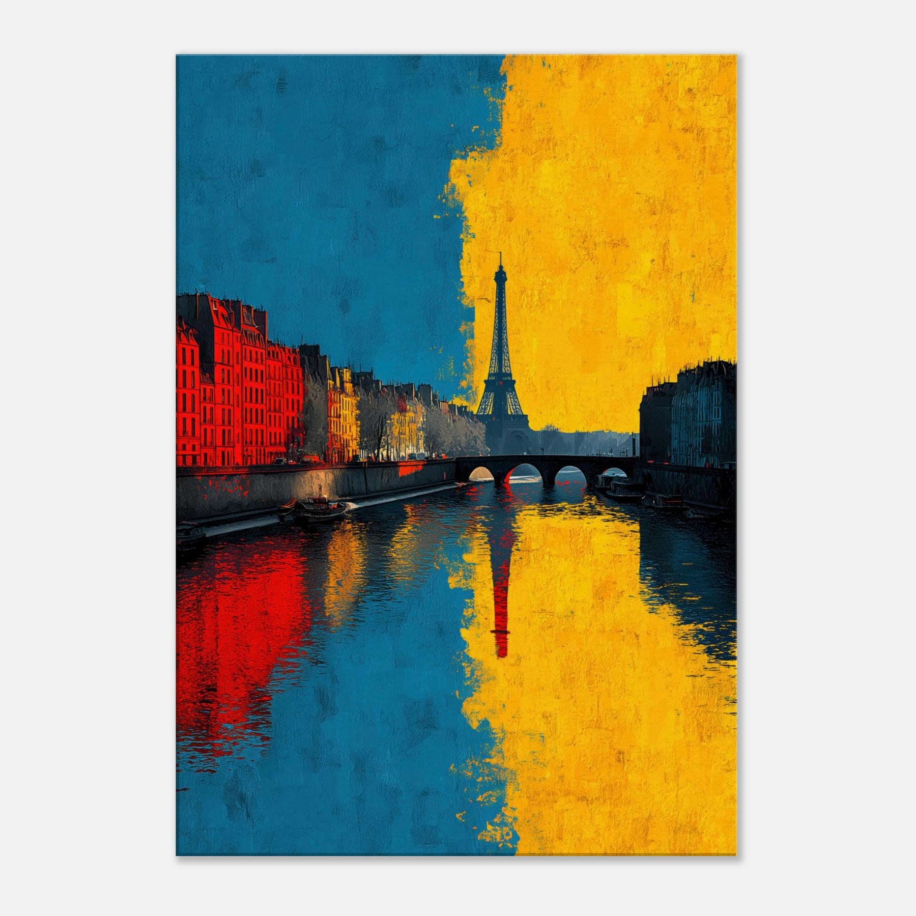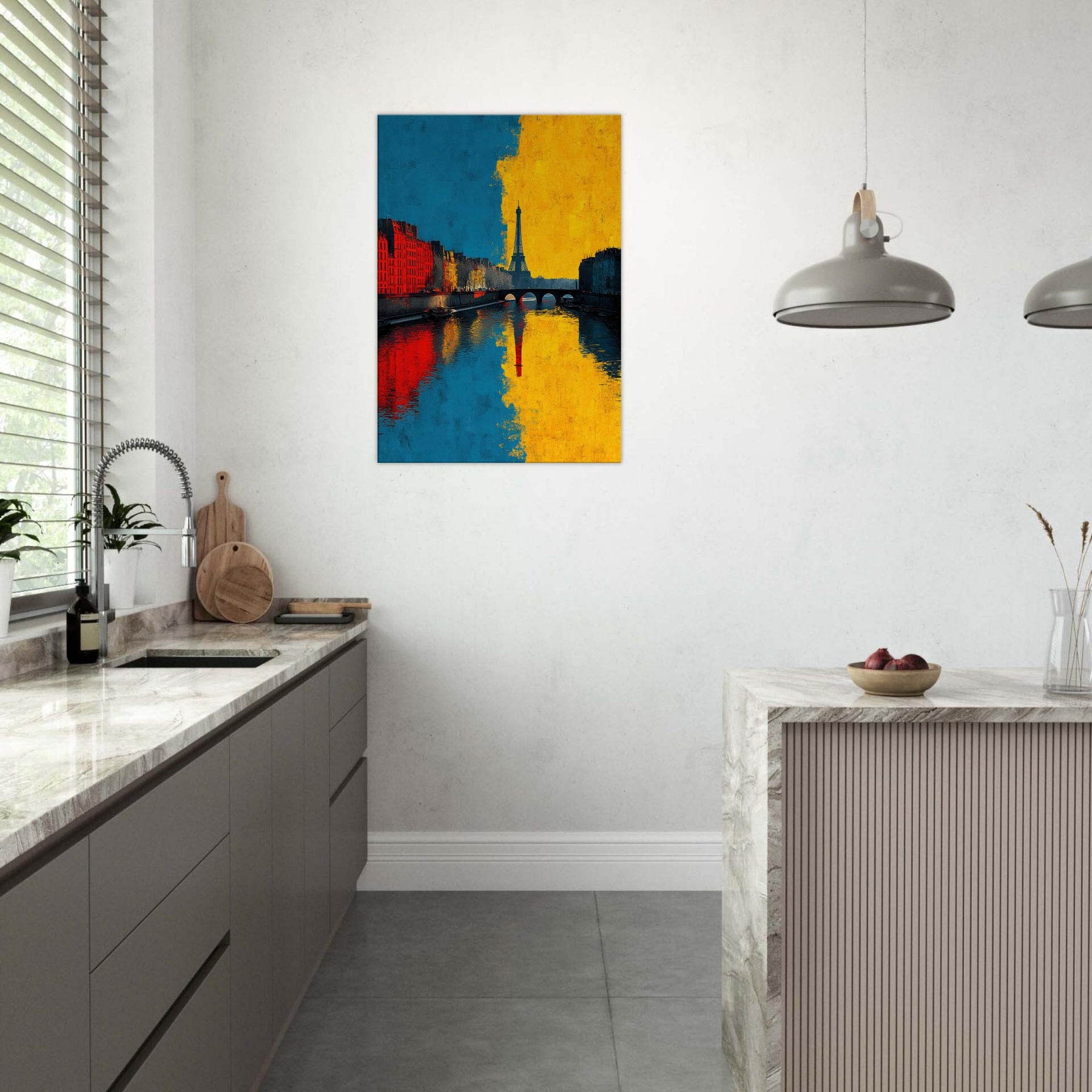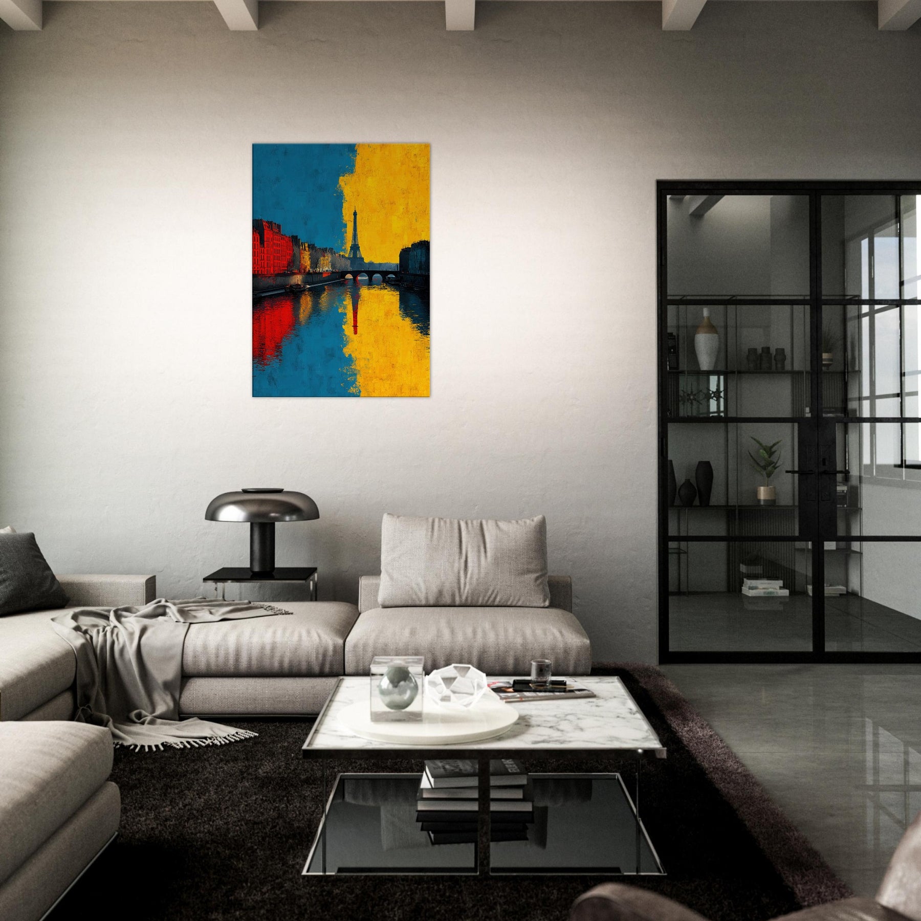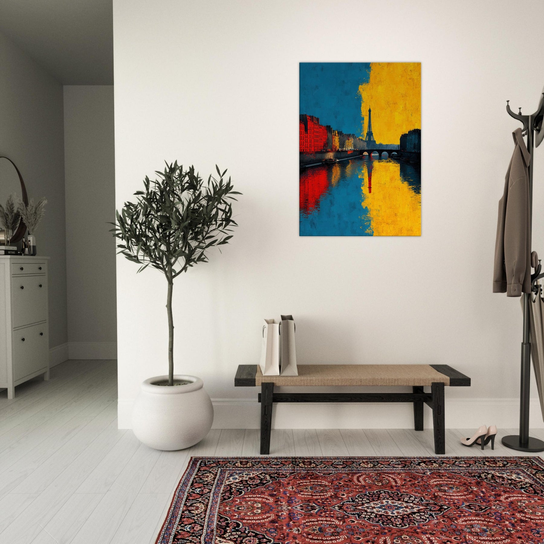 Immerse your space in a Paris dreamscape where night and day collide in bold color. This abstract city scene washes the Seine in cobalt, red, and sunlit gold, with the Eiffel Tower rising as a quiet beacon. The layered texture and luminous reflections invite lingering attention, turning walls into a window where conversations begin and moods shift from intimate dusk to electric midday. Perfect for a living room or study, it lends drama, warmth, and a chic, urbane rhythm to any contemporary interior.