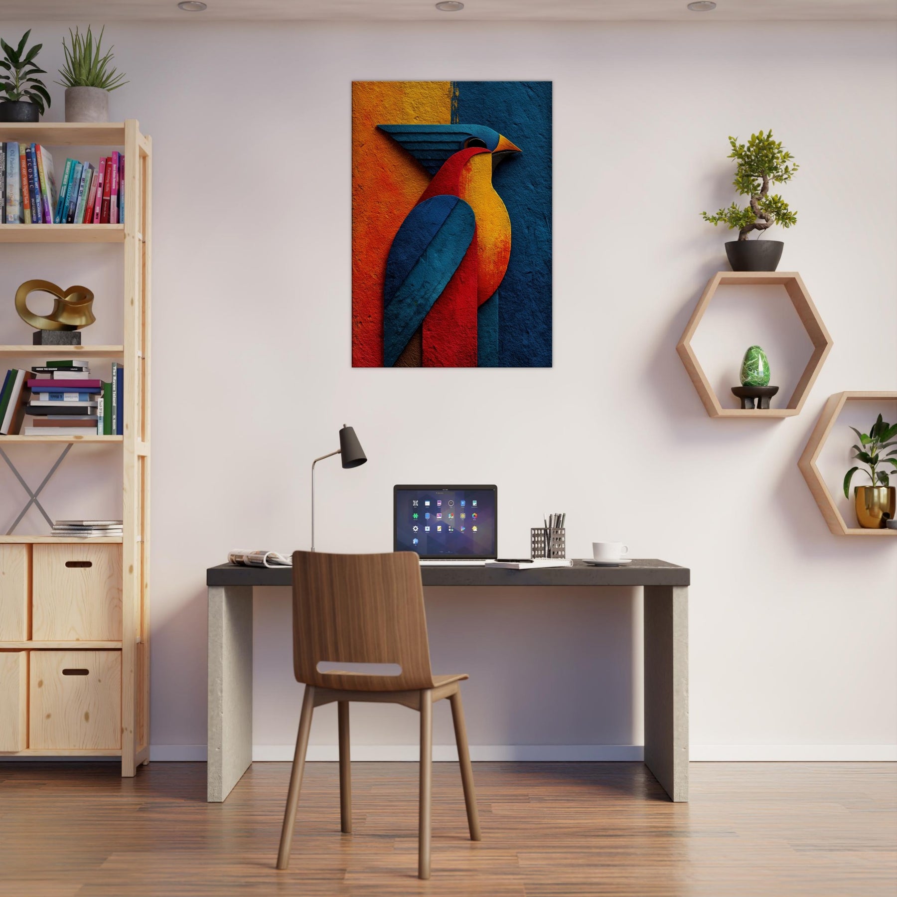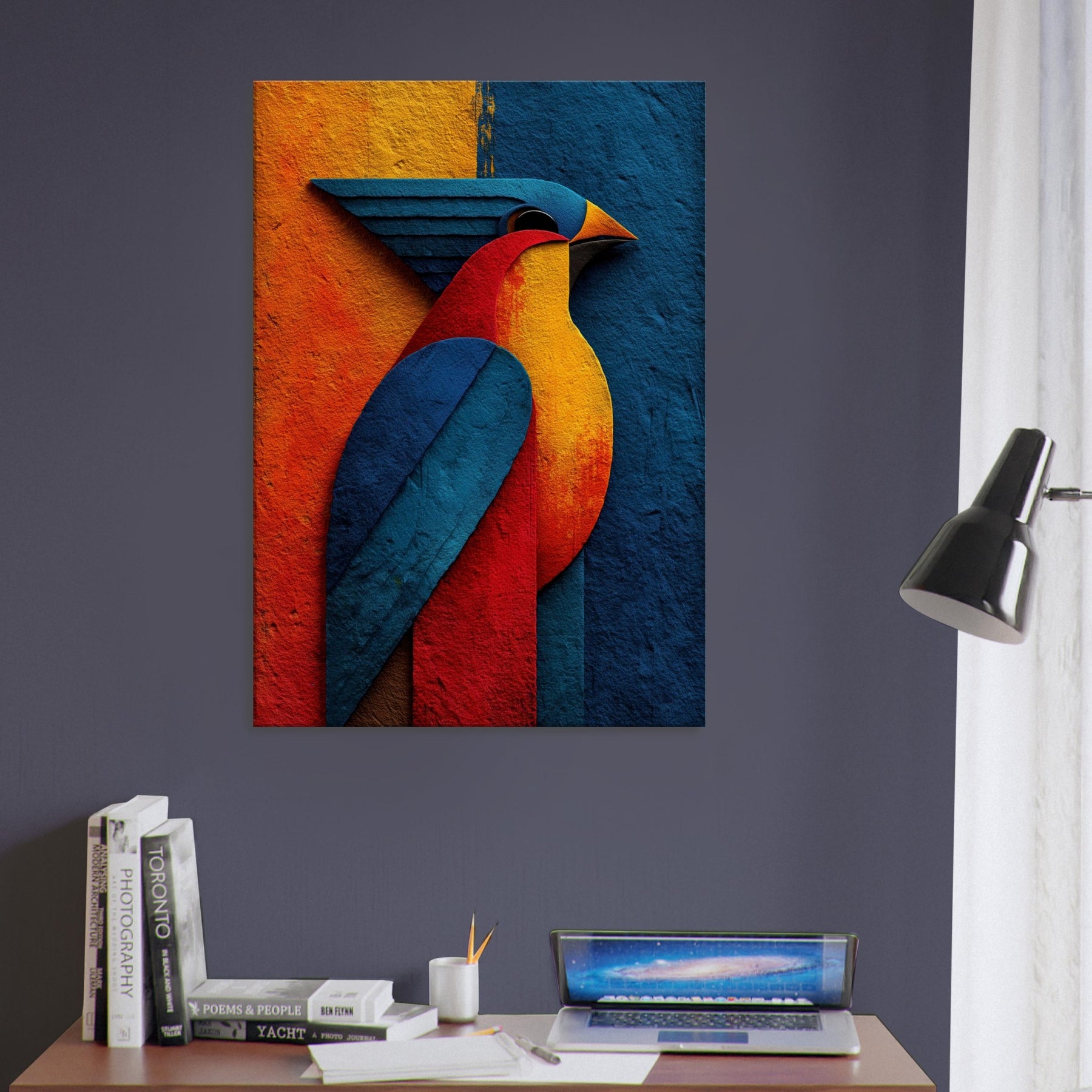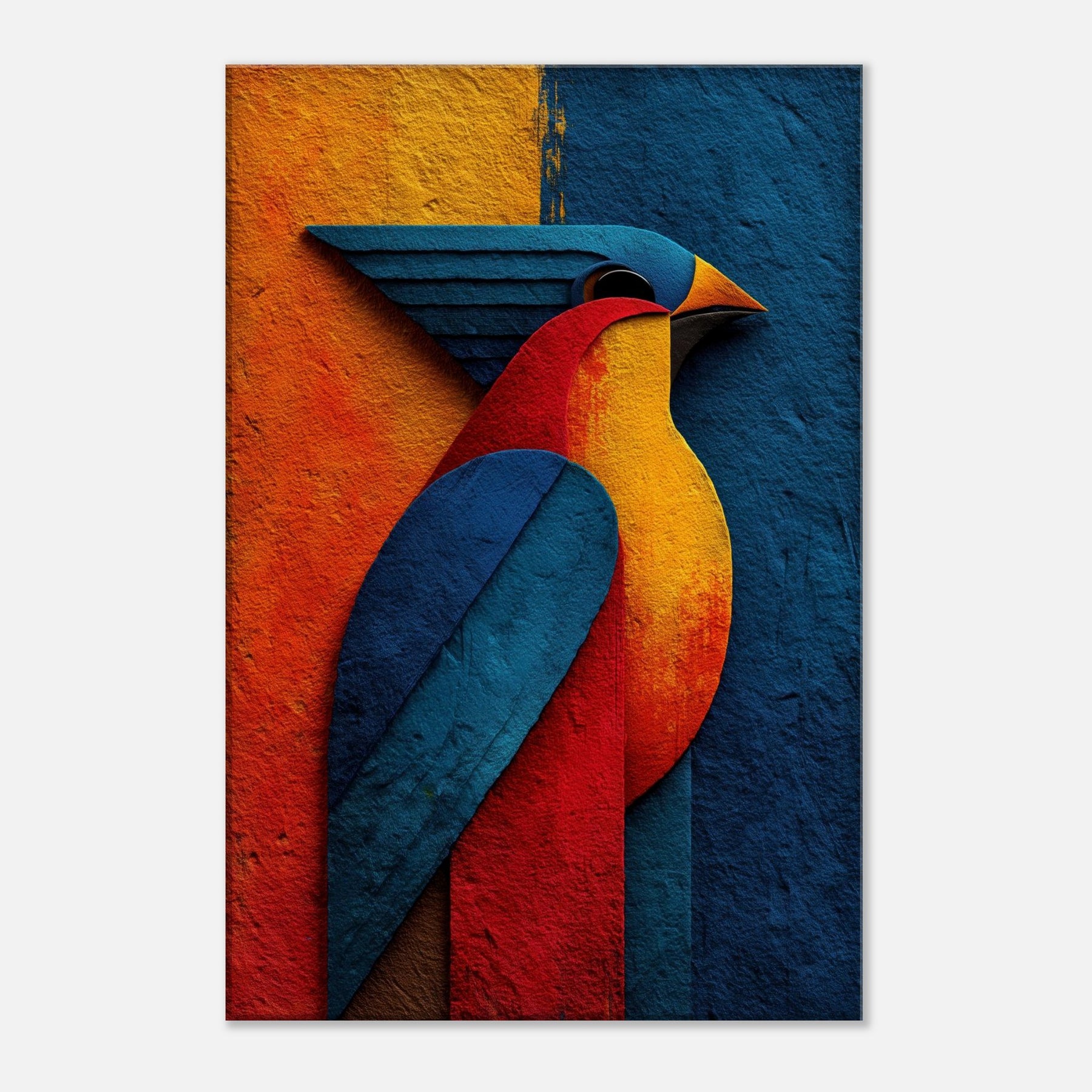 Allow this abstract Phoenix to breathe fire into your living room. A sculpture of color crimson, sapphire, molten gold it glides across your wall with a luminous, otherworldly presence. The phoenix becomes a ritual of renewal: wings sweep through the room, inviting warmth and focus. The textured surface catches light and shade, shifting mood from dawn to dusk. Perfect above a sofa or dining nook, it conjures fantasy and myth in a modern, serene way.