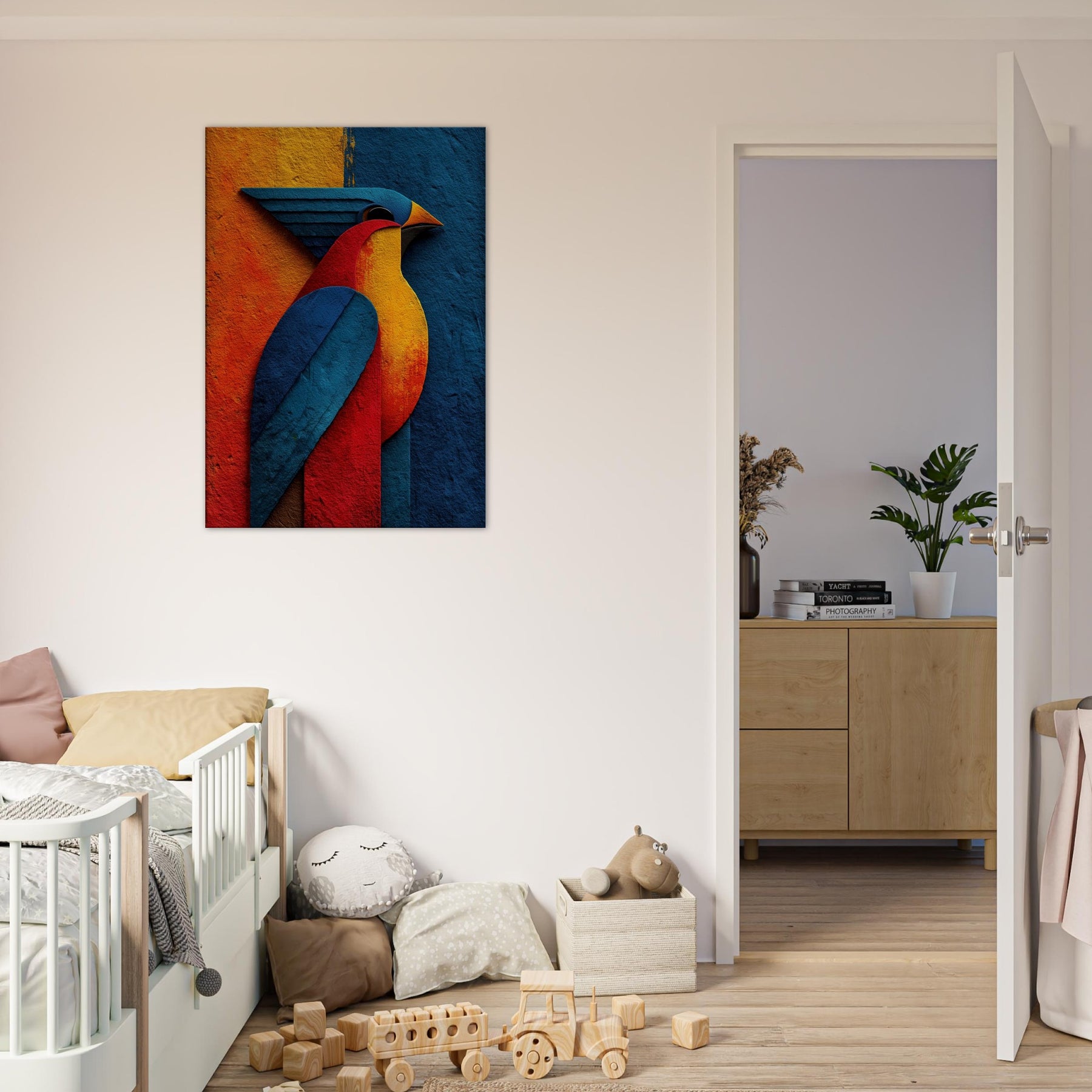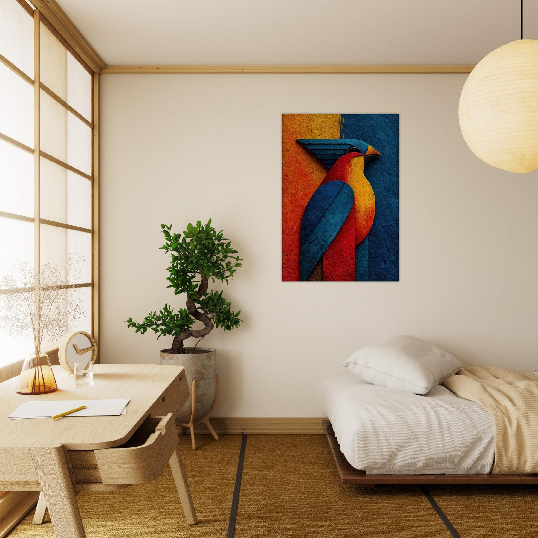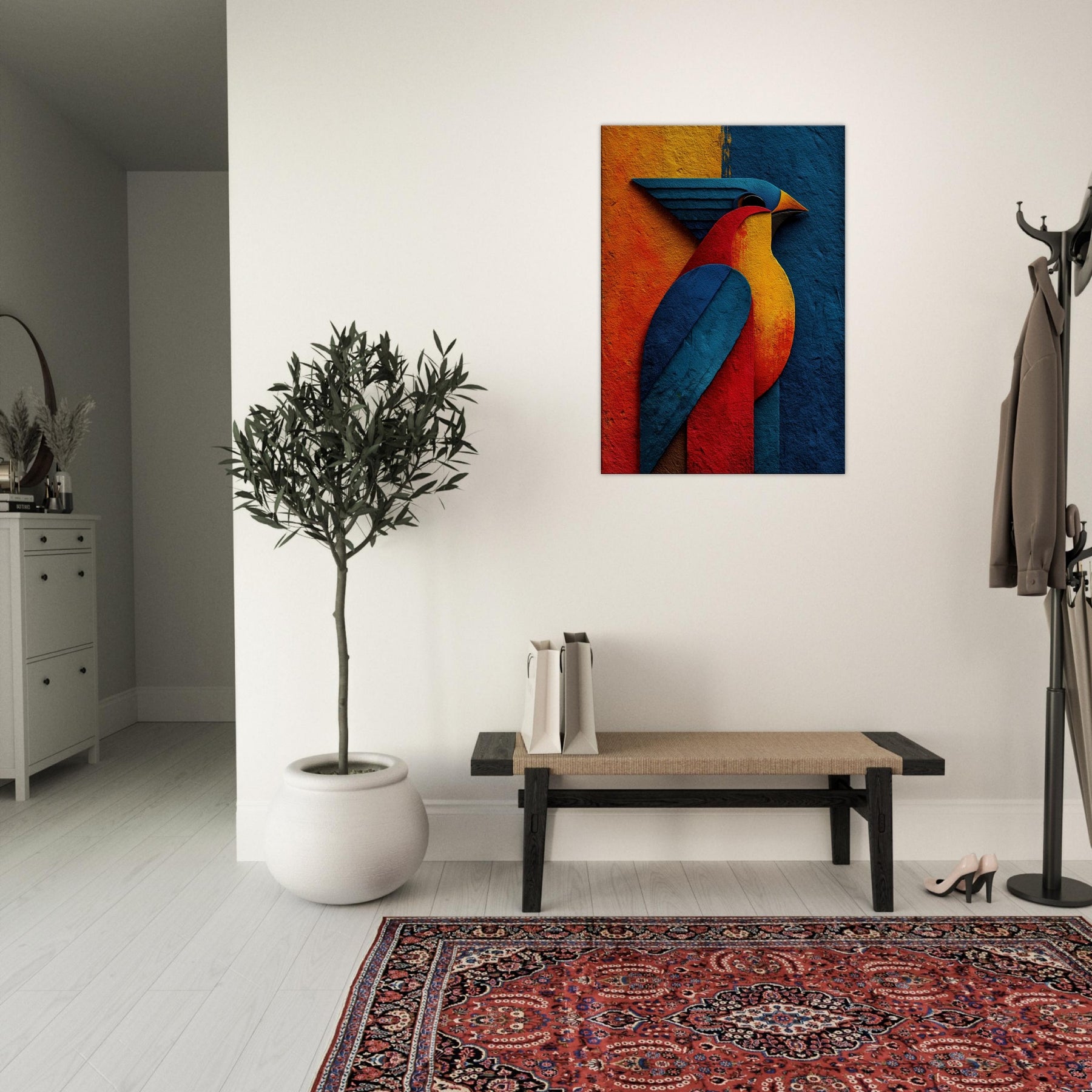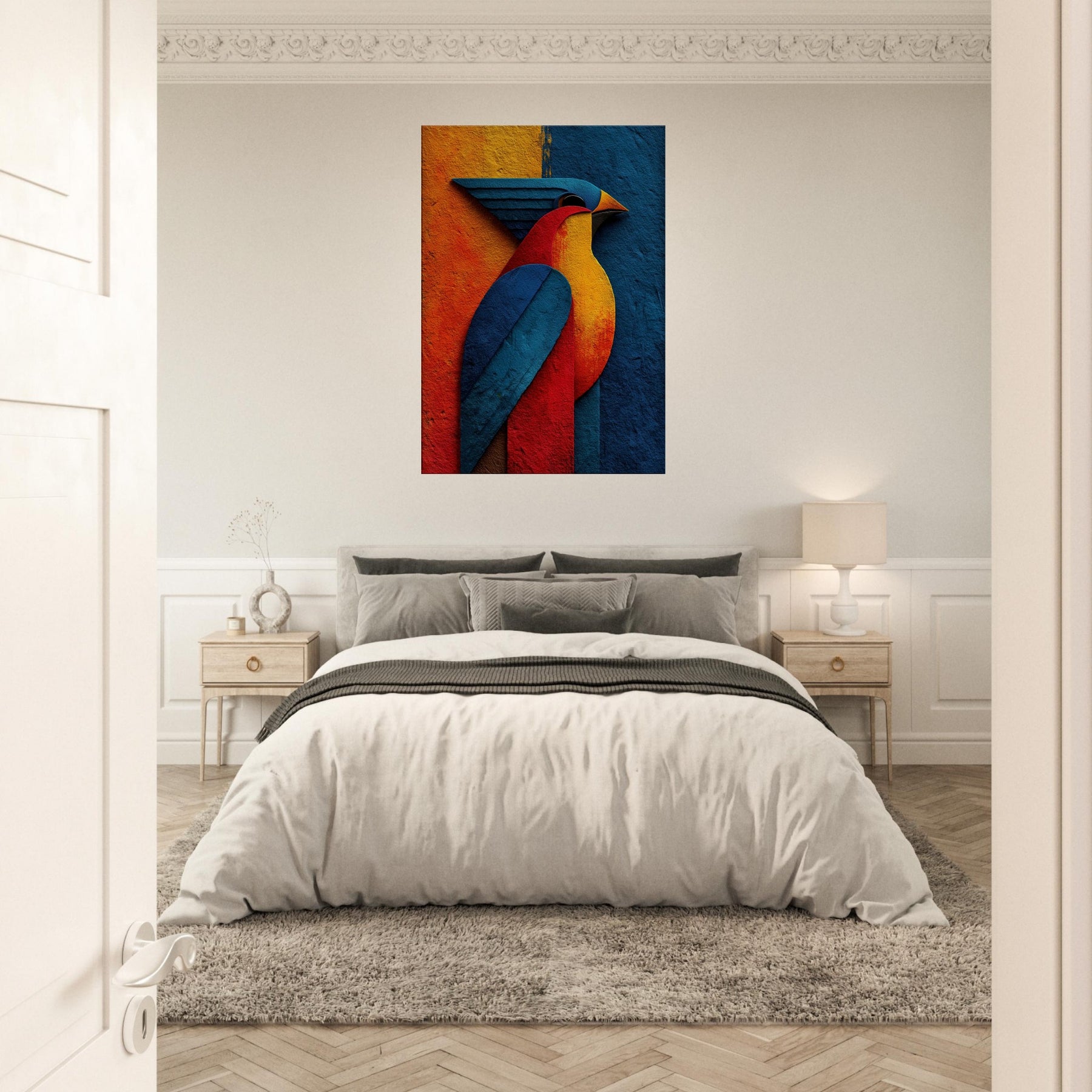 Allow this abstract Phoenix to breathe fire into your living room. A sculpture of color crimson, sapphire, molten gold it glides across your wall with a luminous, otherworldly presence. The phoenix becomes a ritual of renewal: wings sweep through the room, inviting warmth and focus. The textured surface catches light and shade, shifting mood from dawn to dusk. Perfect above a sofa or dining nook, it conjures fantasy and myth in a modern, serene way.