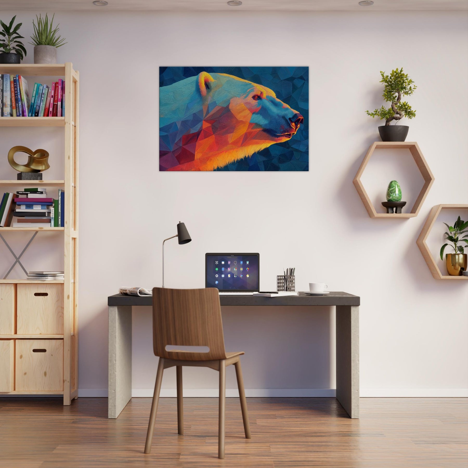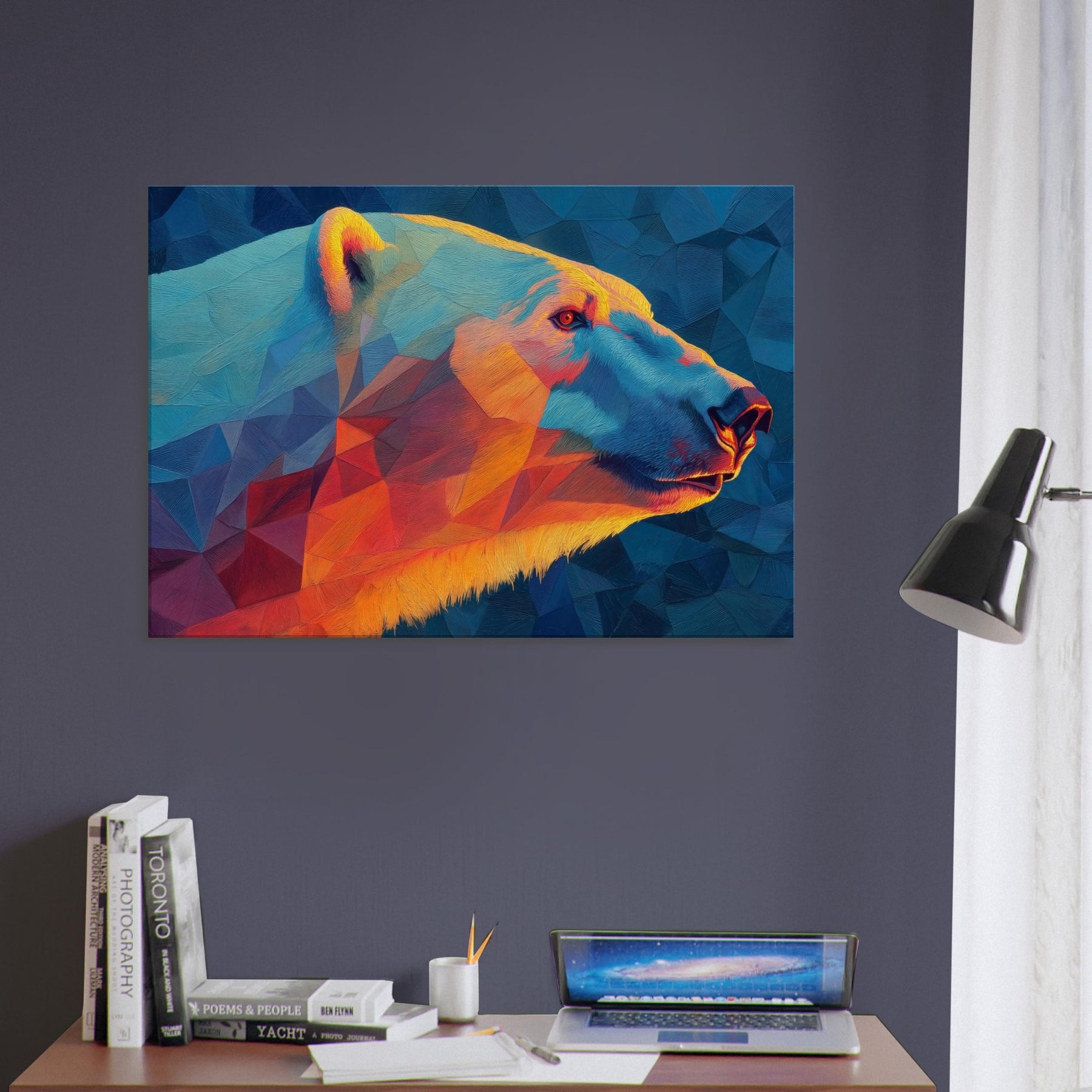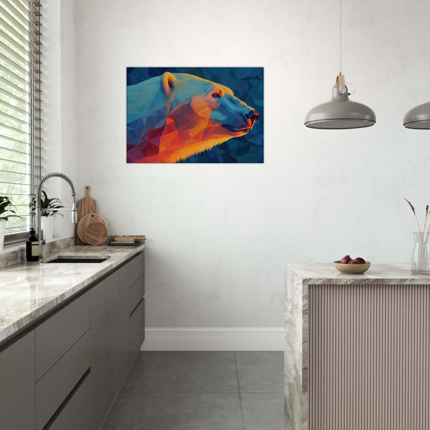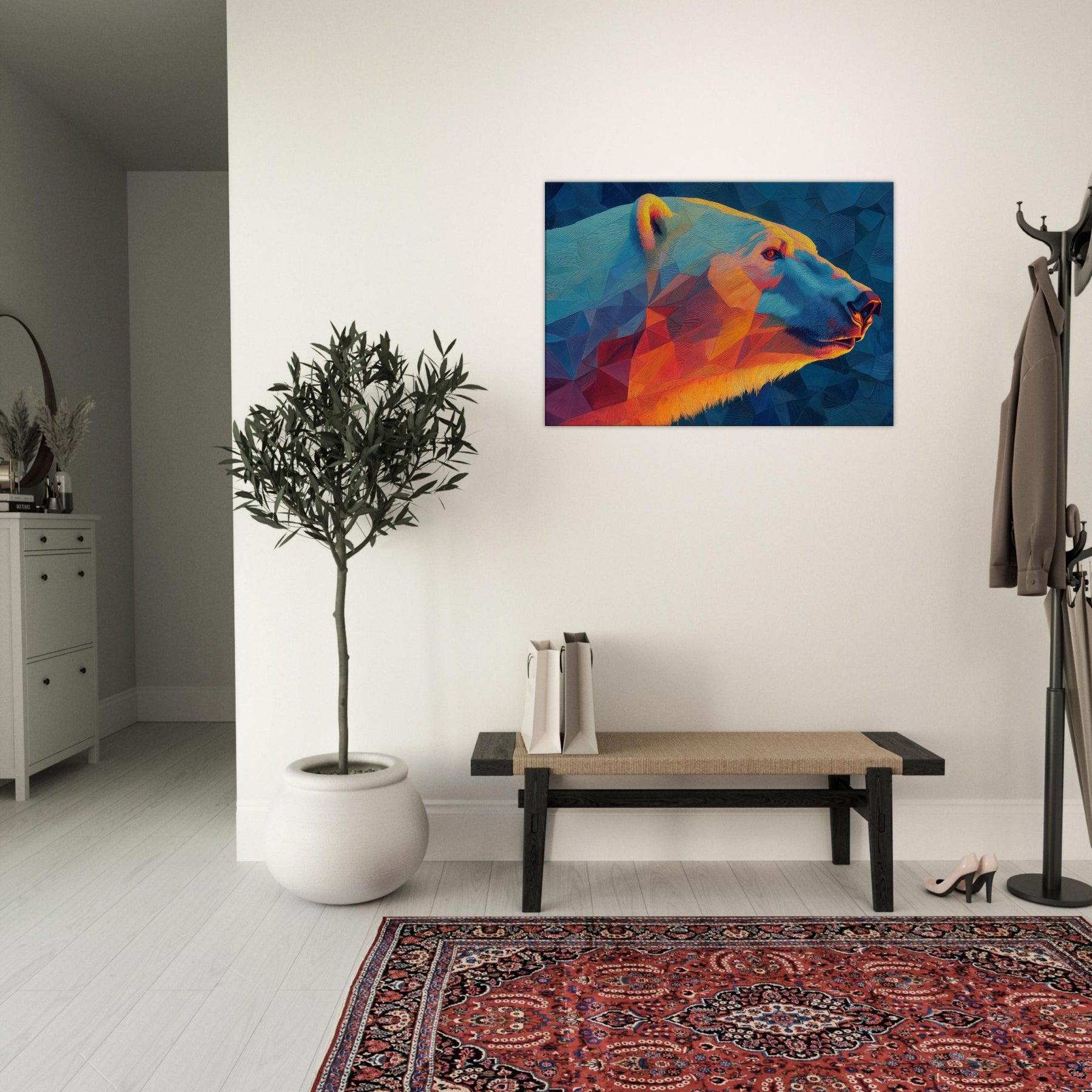 Let the Polar Bear drift across your room in a blaze of color and quiet motion. This sculpted mosaic of warm ambers, electric blues, and midnight purples gathers the chill of the Arctic with the glow of sunset, creating a hypnotic presence that shifts with the light. Its layered facets invite the eye to wander, while the calm, expansive gaze anchors a space with grace. Perfect above a sofa or console, it invites reflection and a breath of wonder into daily life.