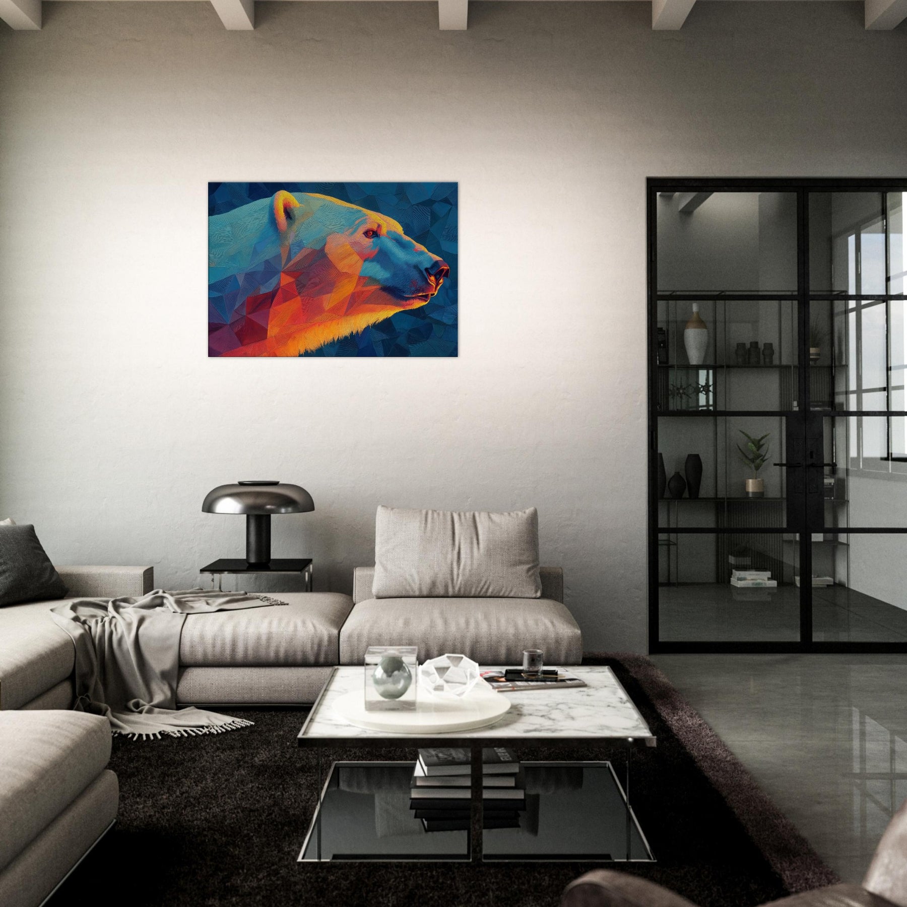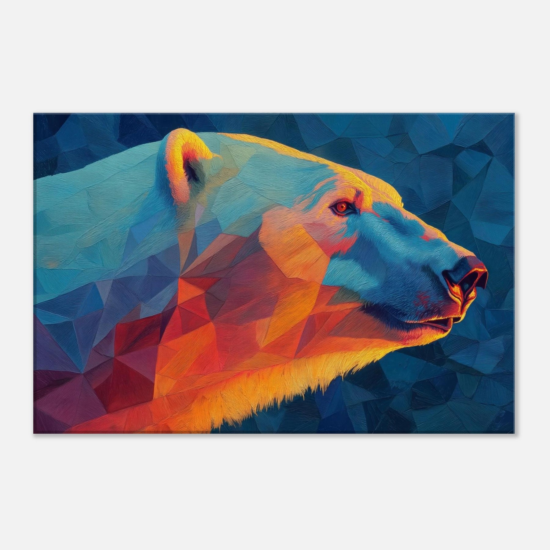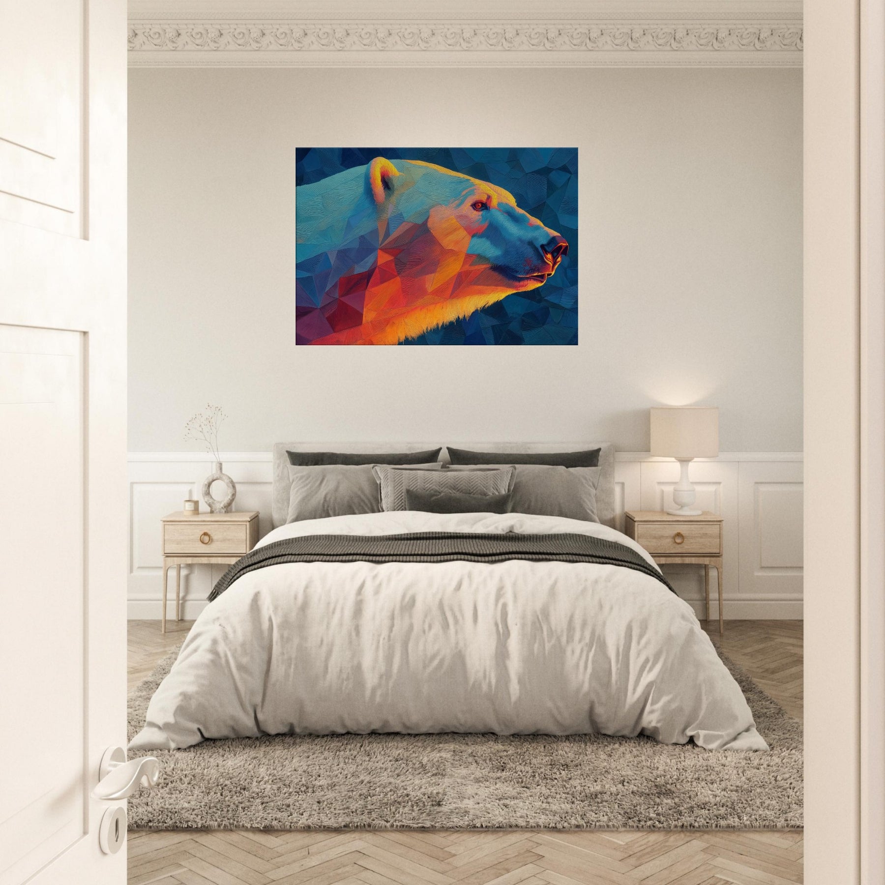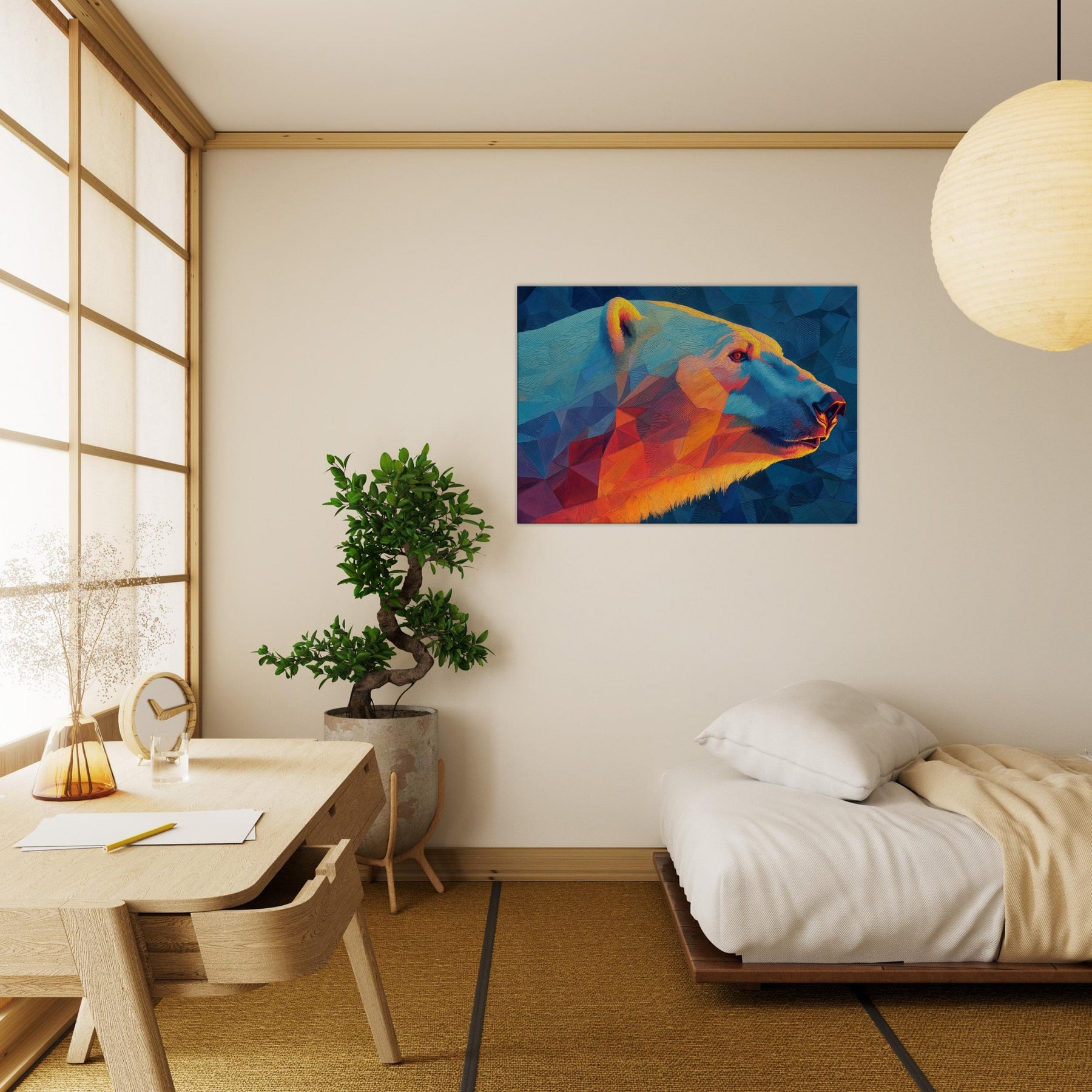 Let the Polar Bear drift across your room in a blaze of color and quiet motion. This sculpted mosaic of warm ambers, electric blues, and midnight purples gathers the chill of the Arctic with the glow of sunset, creating a hypnotic presence that shifts with the light. Its layered facets invite the eye to wander, while the calm, expansive gaze anchors a space with grace. Perfect above a sofa or console, it invites reflection and a breath of wonder into daily life.