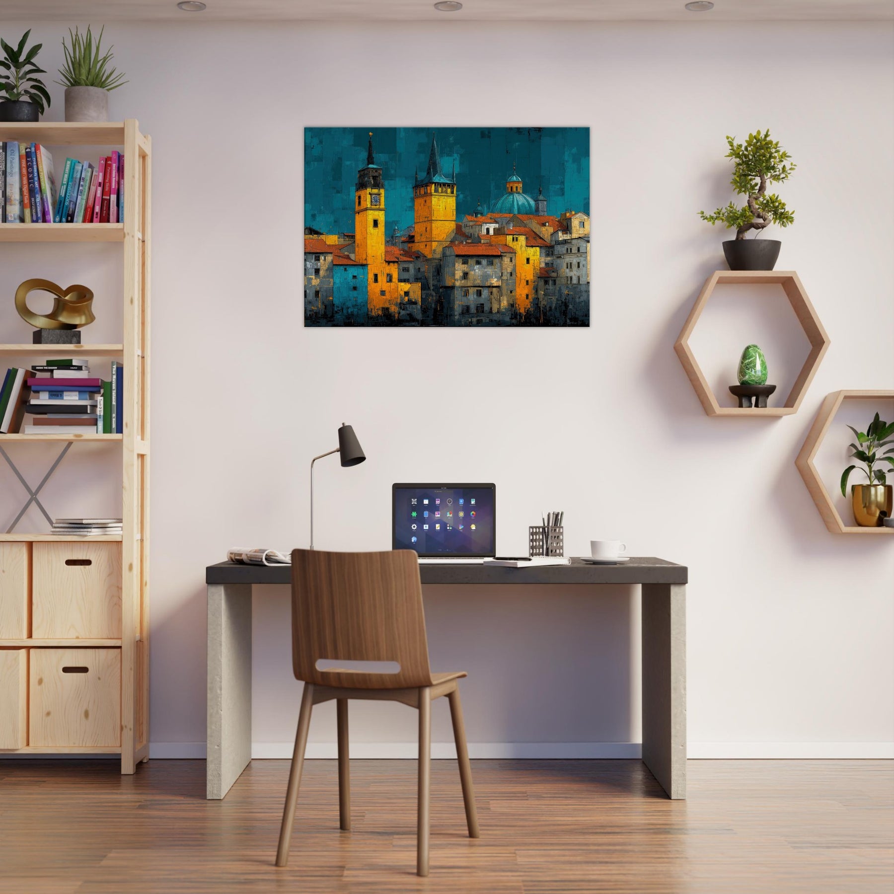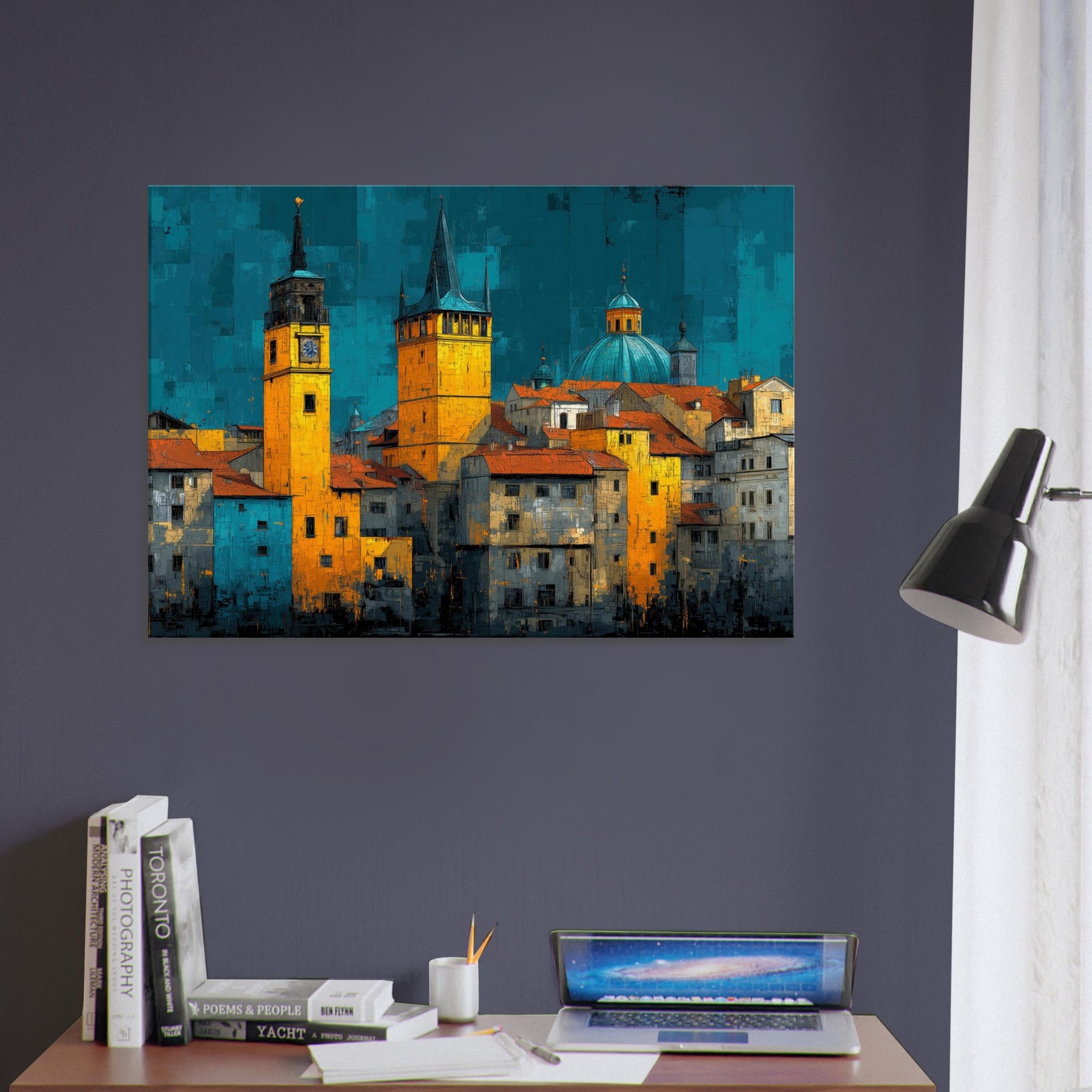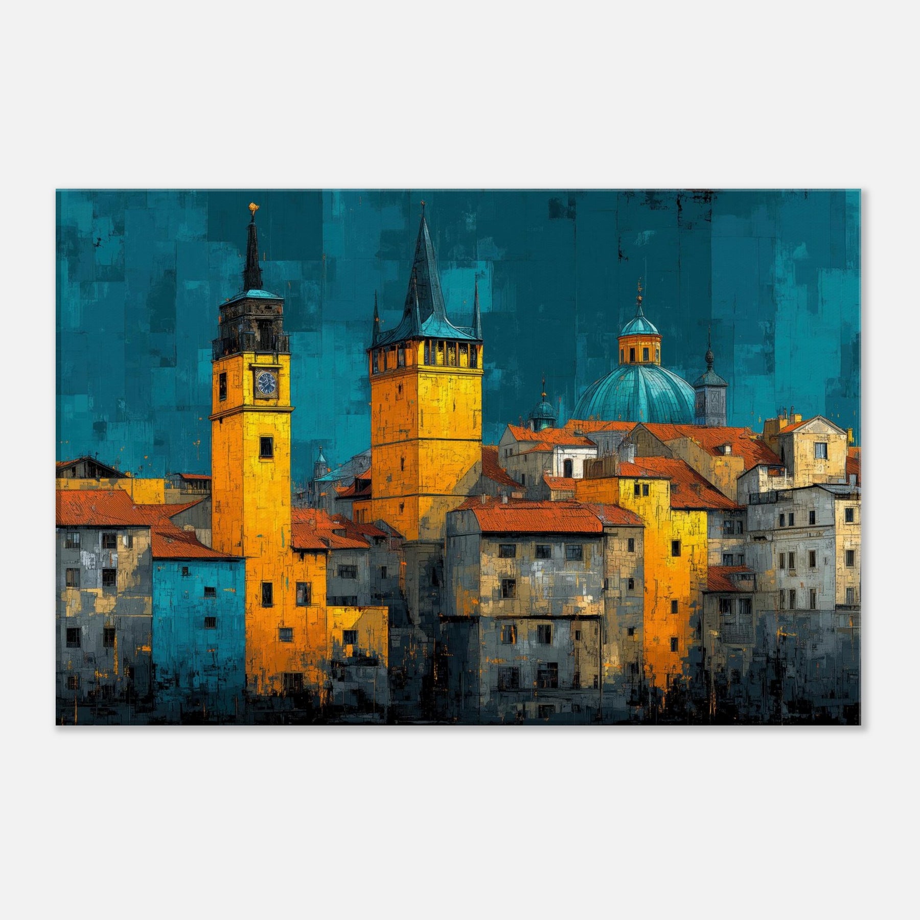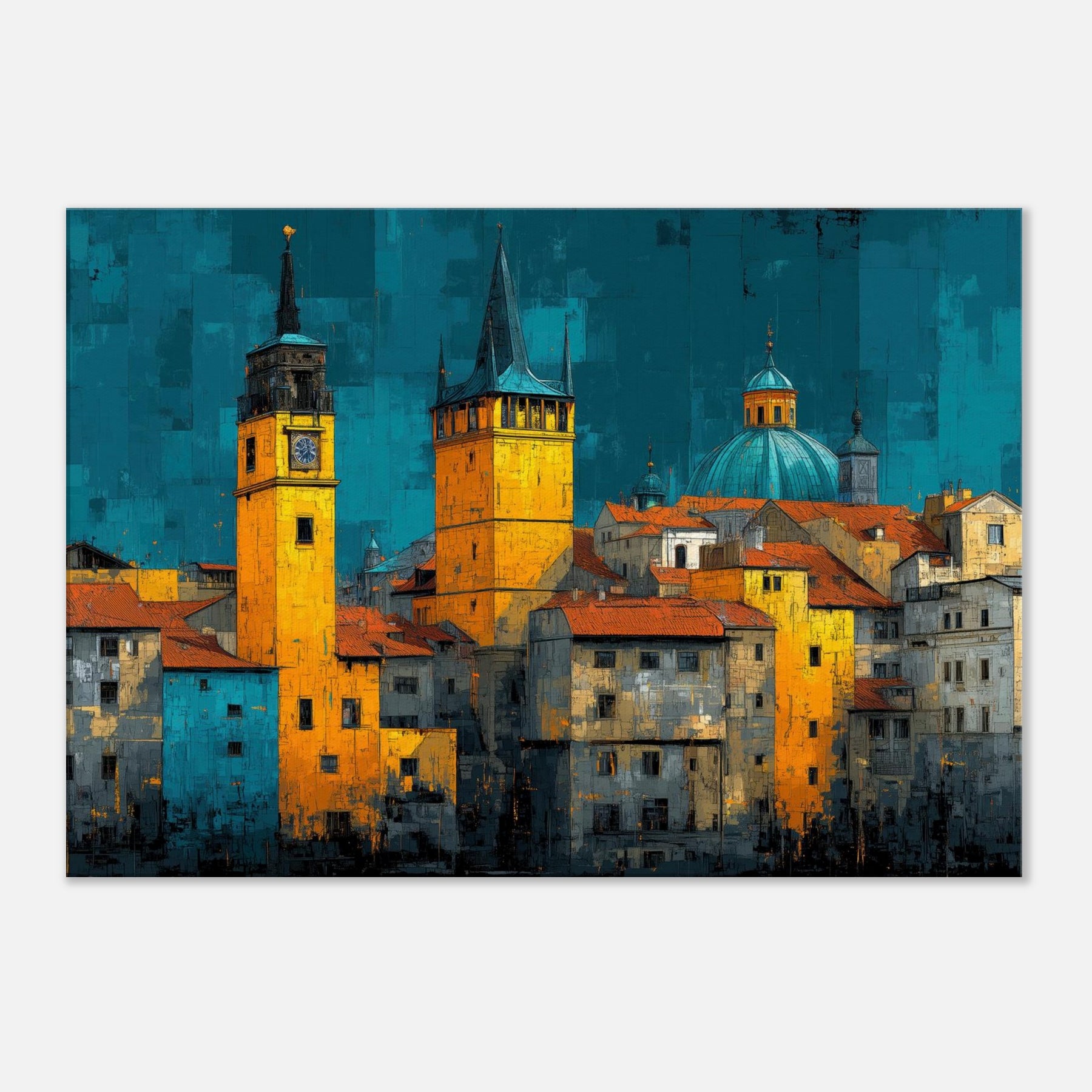 Prague Echoes: An abstract meditation on a city of bridges and amber light. The composition collapses skyline into a pulse of teal sky and sunlit towers, inviting the viewer to stroll through memory and distance. The warm yellows and rusty terracotta lift a living space with a sense of drama and warmth, while the cool blues add calm. Hang this work in a living room or study to soften edges, spark conversation, and make every moment feel closer to Prague.