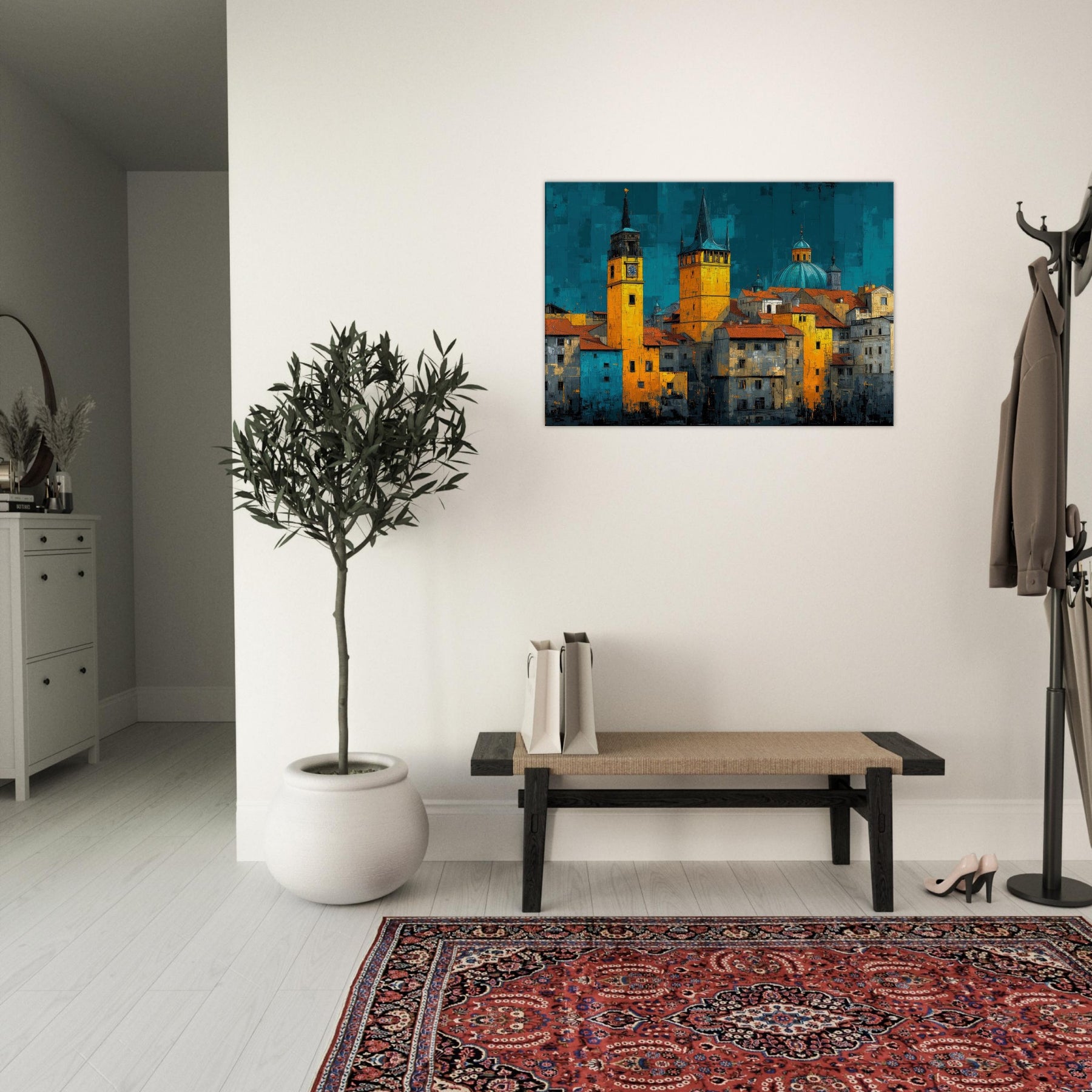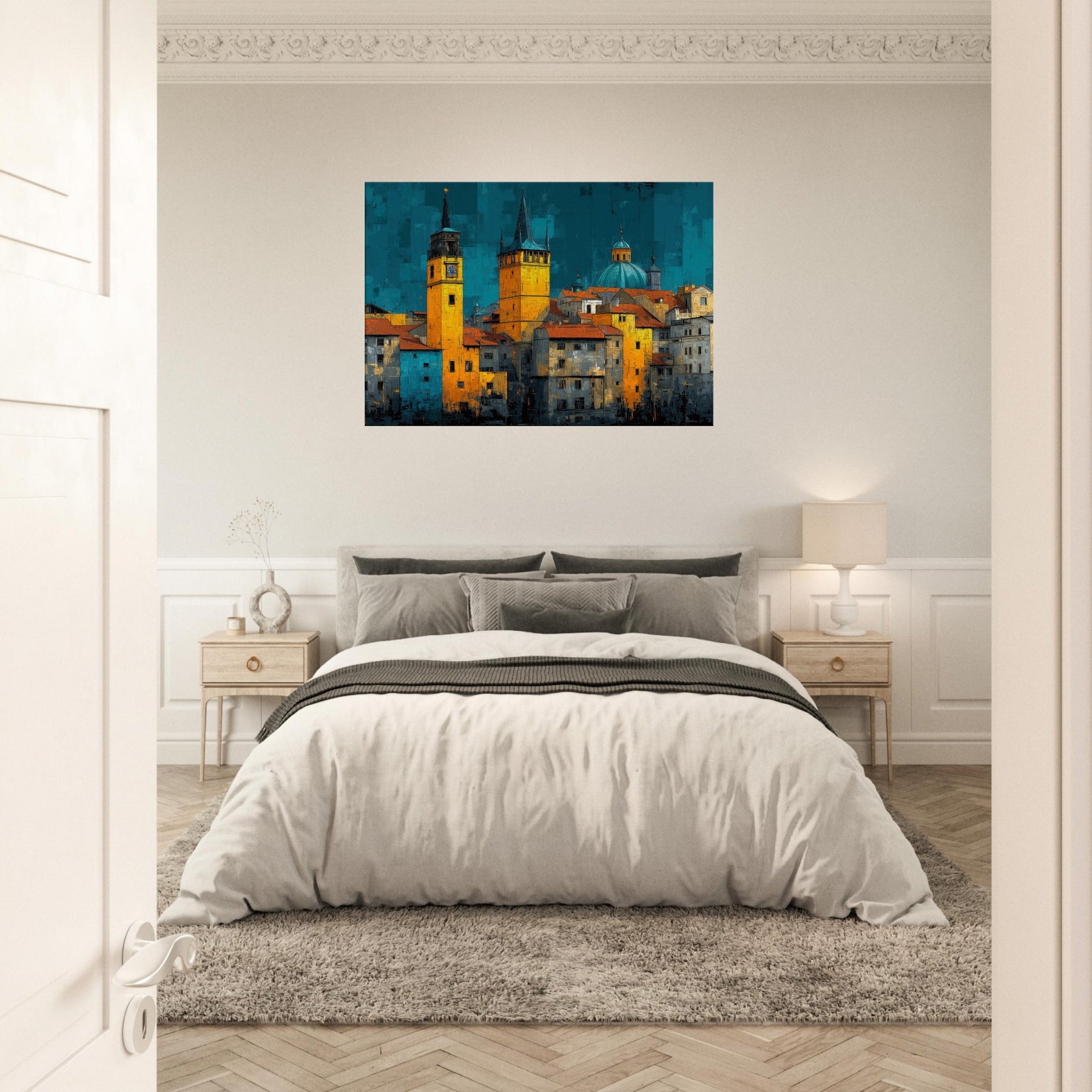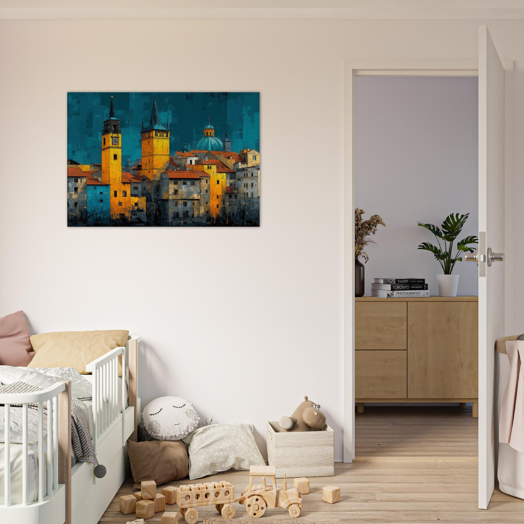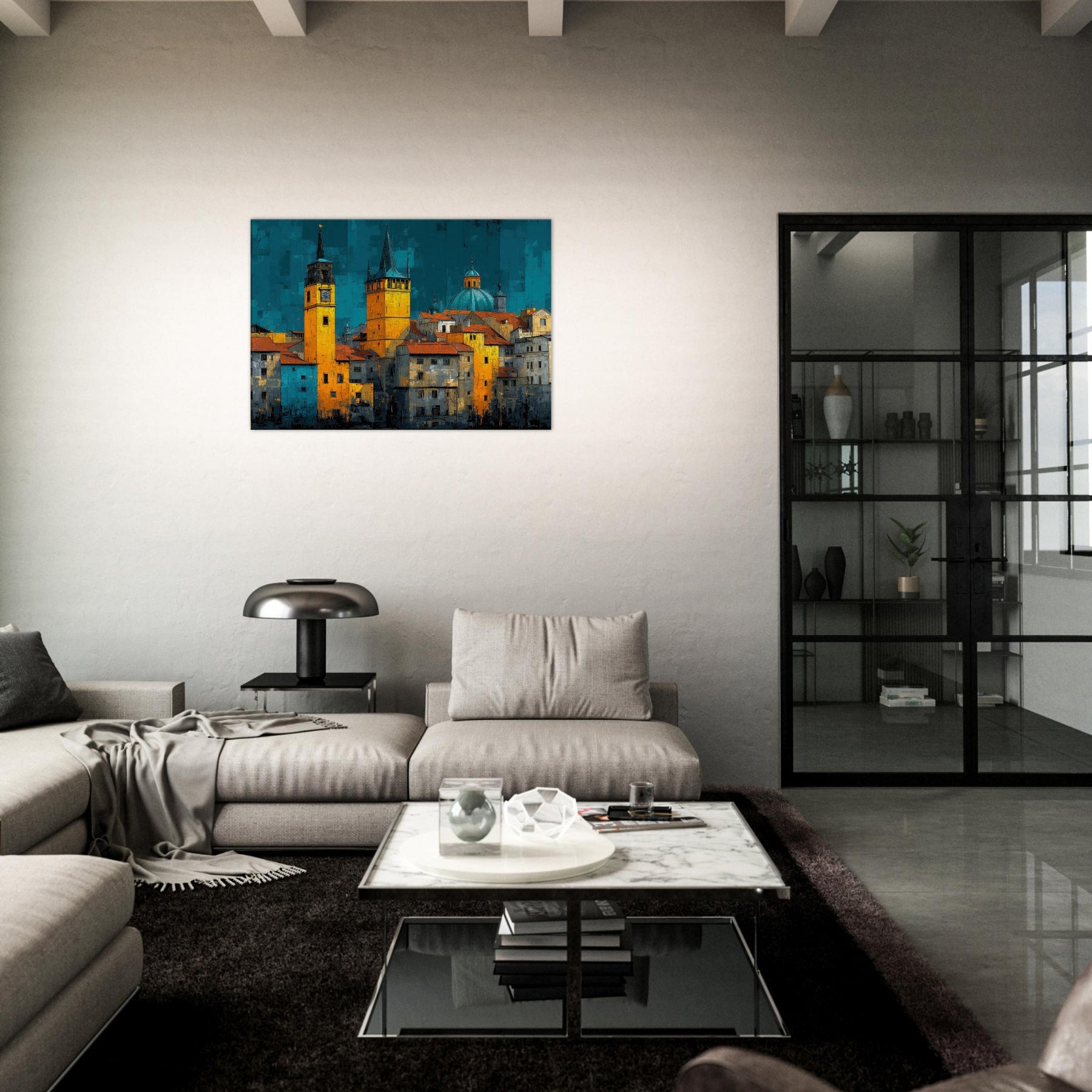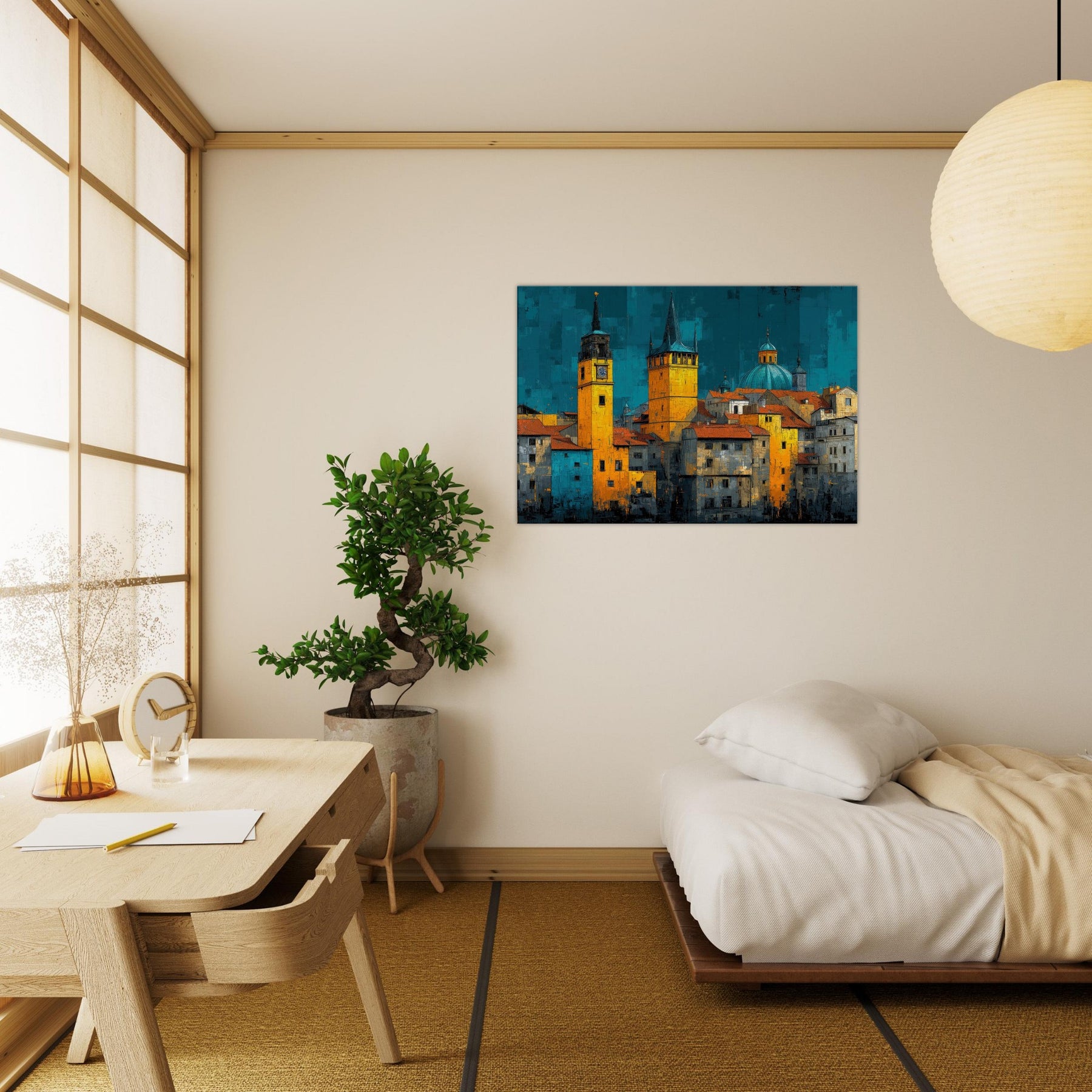 Prague Echoes: An abstract meditation on a city of bridges and amber light. The composition collapses skyline into a pulse of teal sky and sunlit towers, inviting the viewer to stroll through memory and distance. The warm yellows and rusty terracotta lift a living space with a sense of drama and warmth, while the cool blues add calm. Hang this work in a living room or study to soften edges, spark conversation, and make every moment feel closer to Prague.