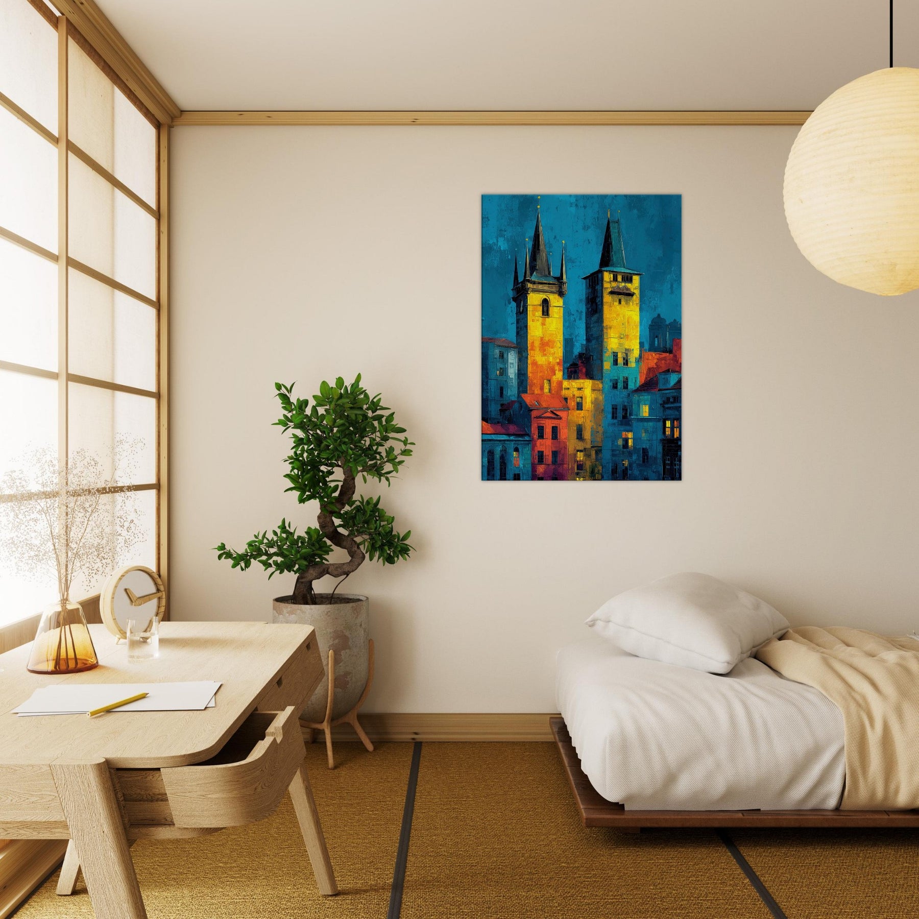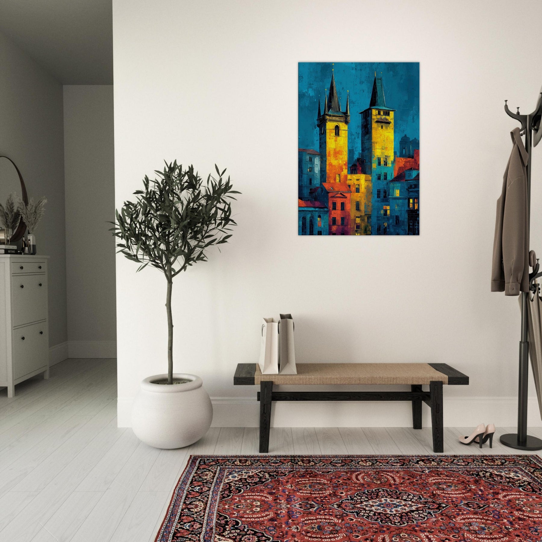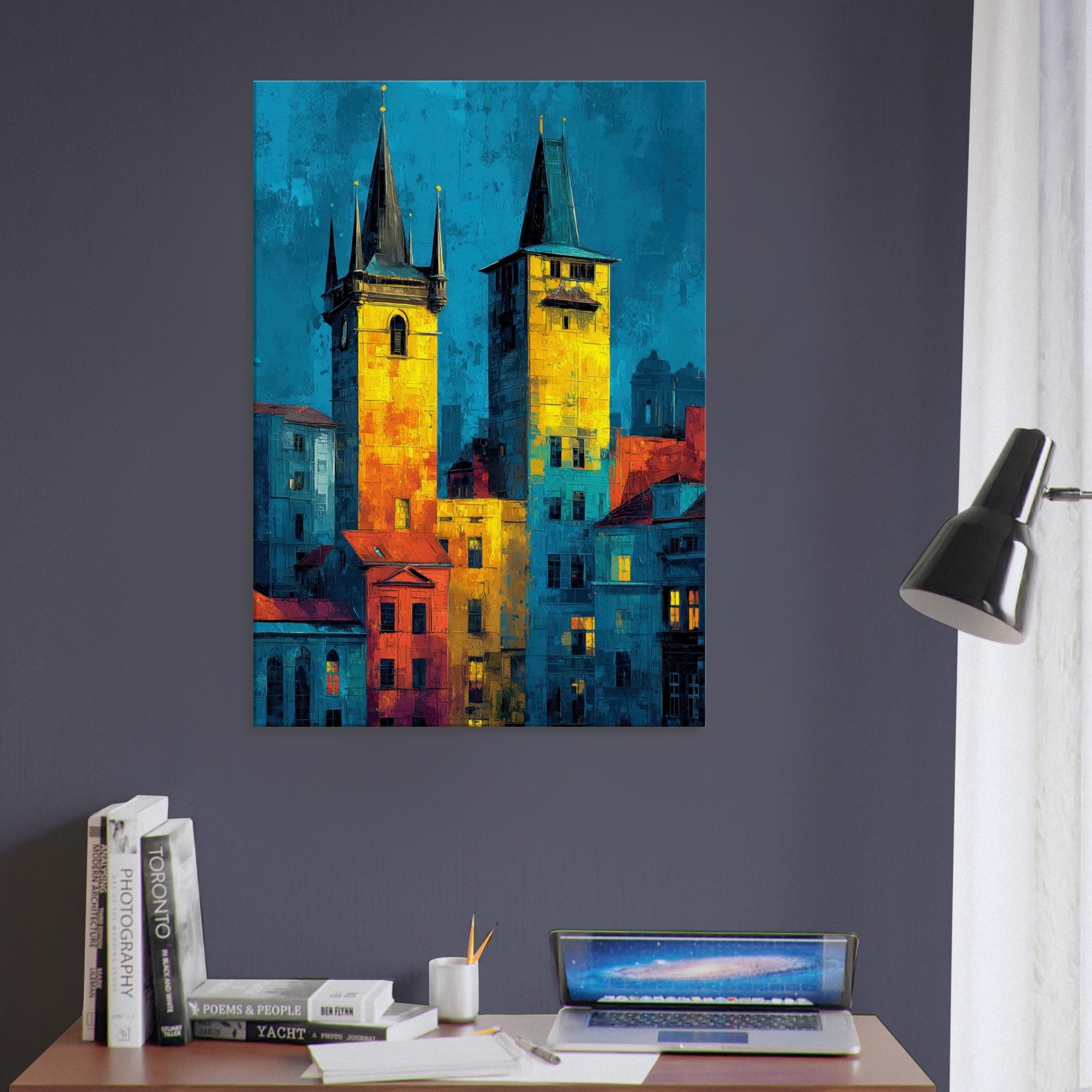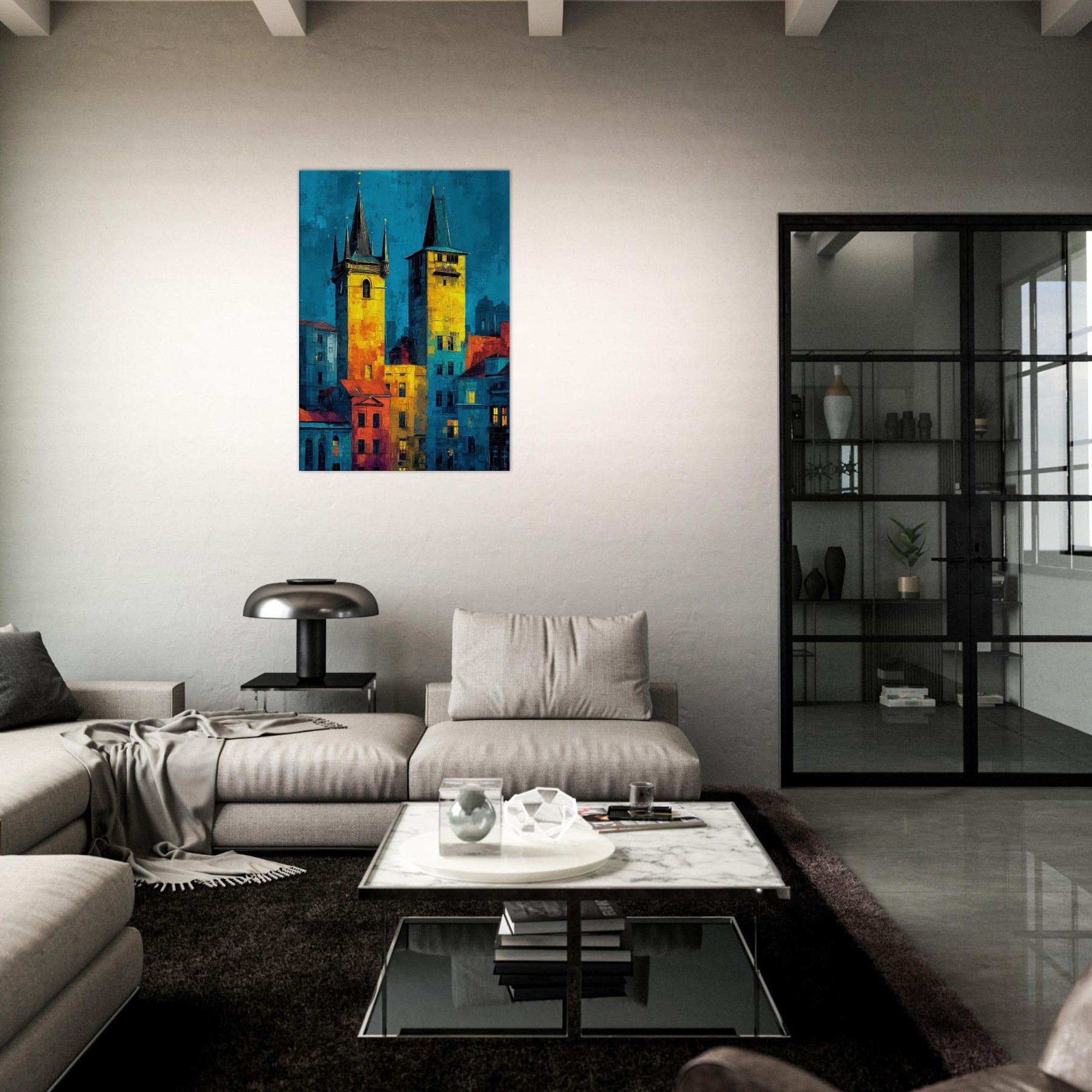 Immerse your space in a horizon of color where Prague rises in bold, sunlit towers. This artwork stitches the city's charm into a radiant tapestry of warm yellows, coral rooftops, and cobalt skies, inviting soft reflections in the living room or study. Each layered hue hums with memory, the morning bells, lantern glow, and street conversations, so your walls carry the quiet drama of a river side evening and the pulse of a timeless city.
