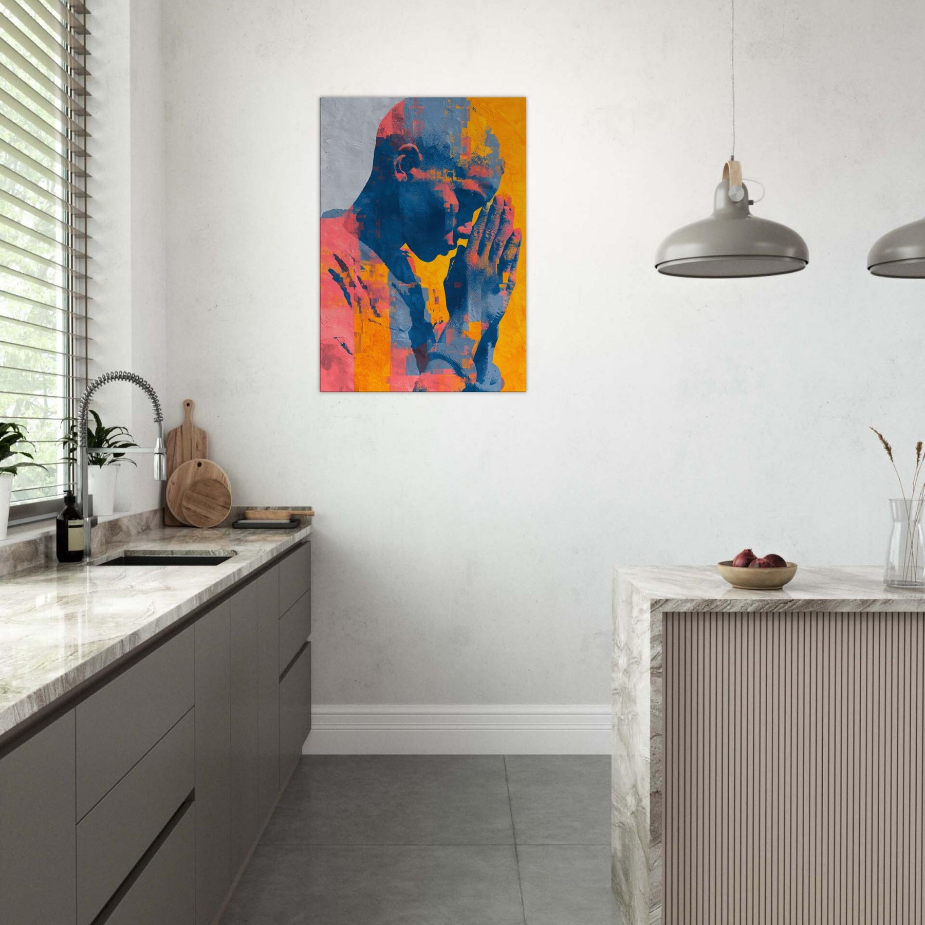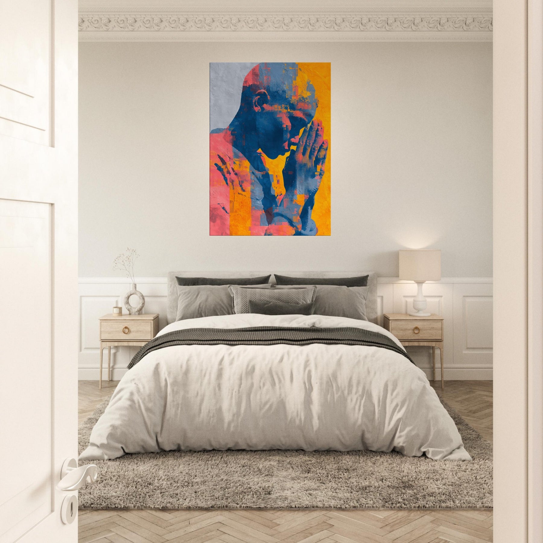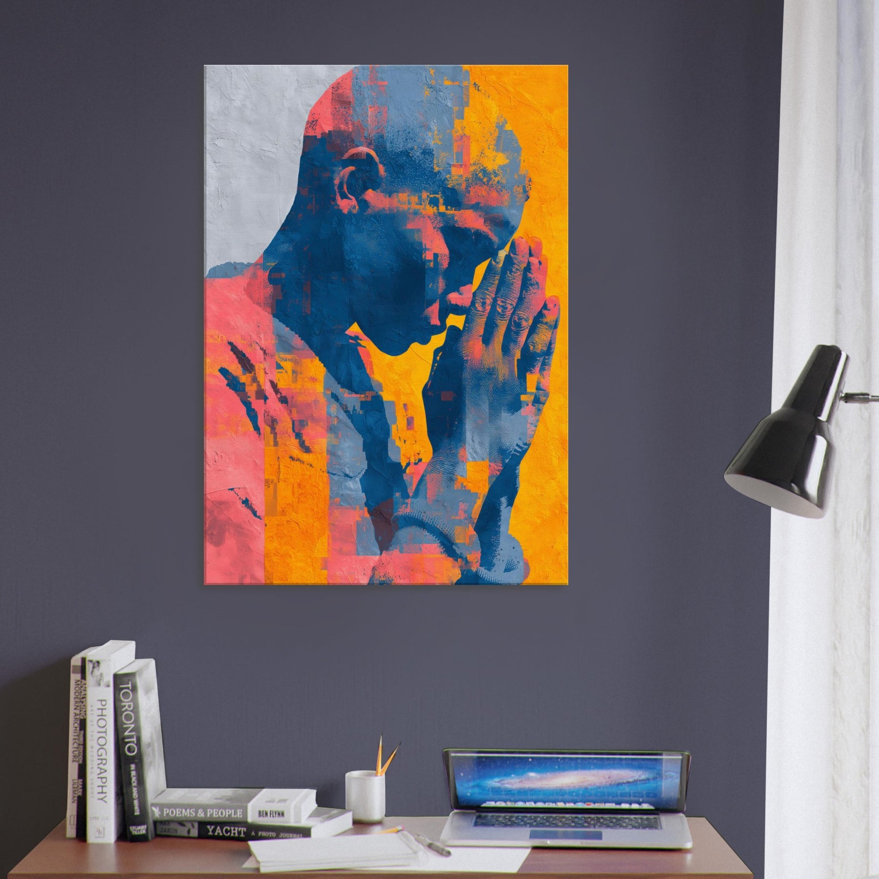 Hands in Prayer rises as a luminous meditation, where gesture becomes verse and color carries breath. The piece bathes a room in warm citron, coral and deep cobalt, inviting quiet reflection amid daily bustle. Abstract fragments gather like memories in motion, yet the central form remains space held in supplication, calm and intimate. A living space gains a sanctuary of stillness, where the Hands in Prayer becomes a soft focal point, guiding light, and a gentle invitation to pause, listen, and breathe.