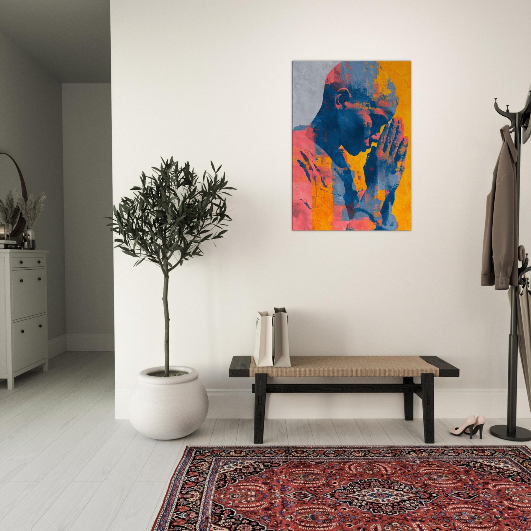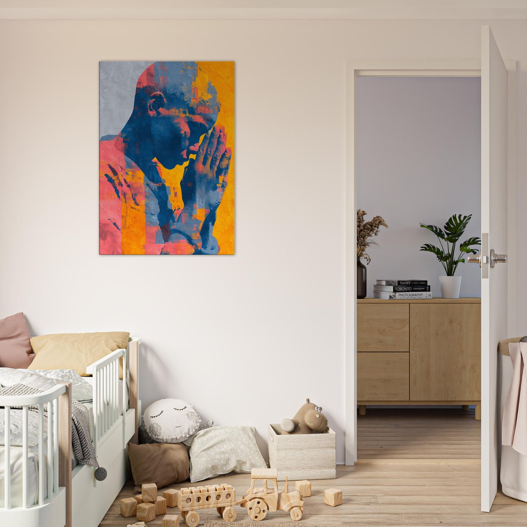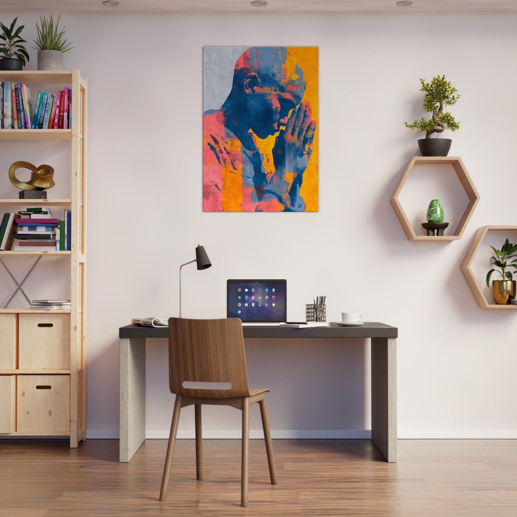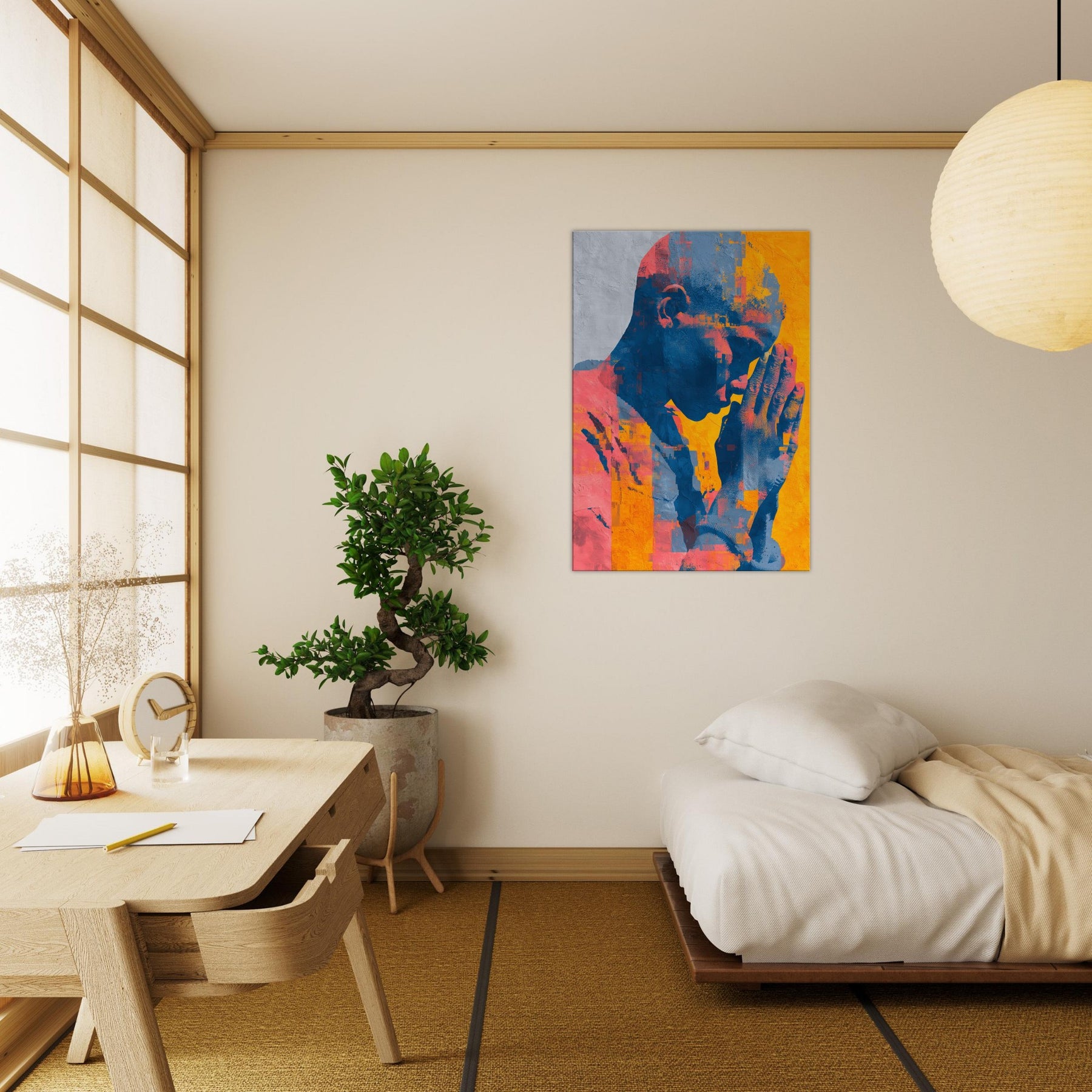 Hands in Prayer rises as a luminous meditation, where gesture becomes verse and color carries breath. The piece bathes a room in warm citron, coral and deep cobalt, inviting quiet reflection amid daily bustle. Abstract fragments gather like memories in motion, yet the central form remains space held in supplication, calm and intimate. A living space gains a sanctuary of stillness, where the Hands in Prayer becomes a soft focal point, guiding light, and a gentle invitation to pause, listen, and breathe.