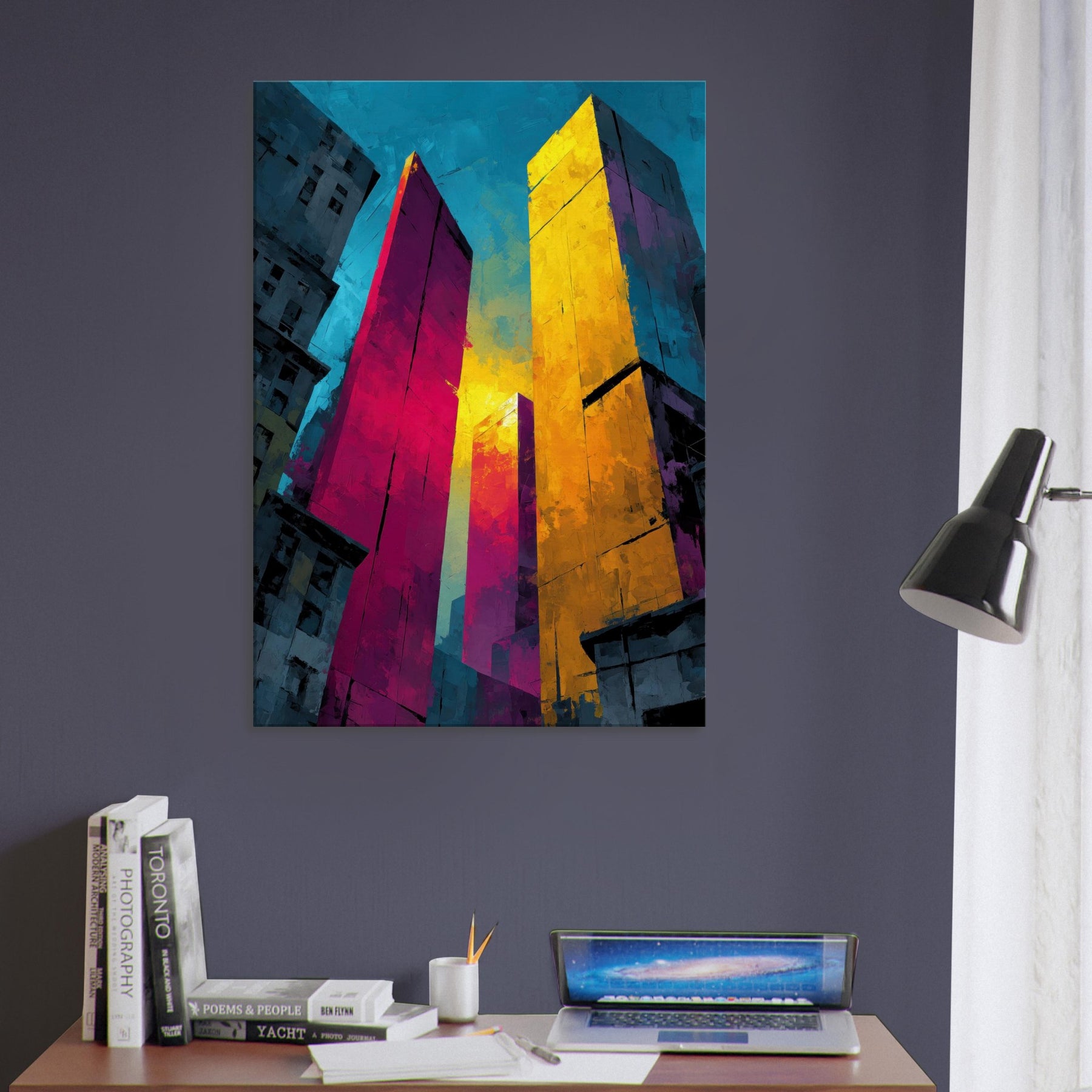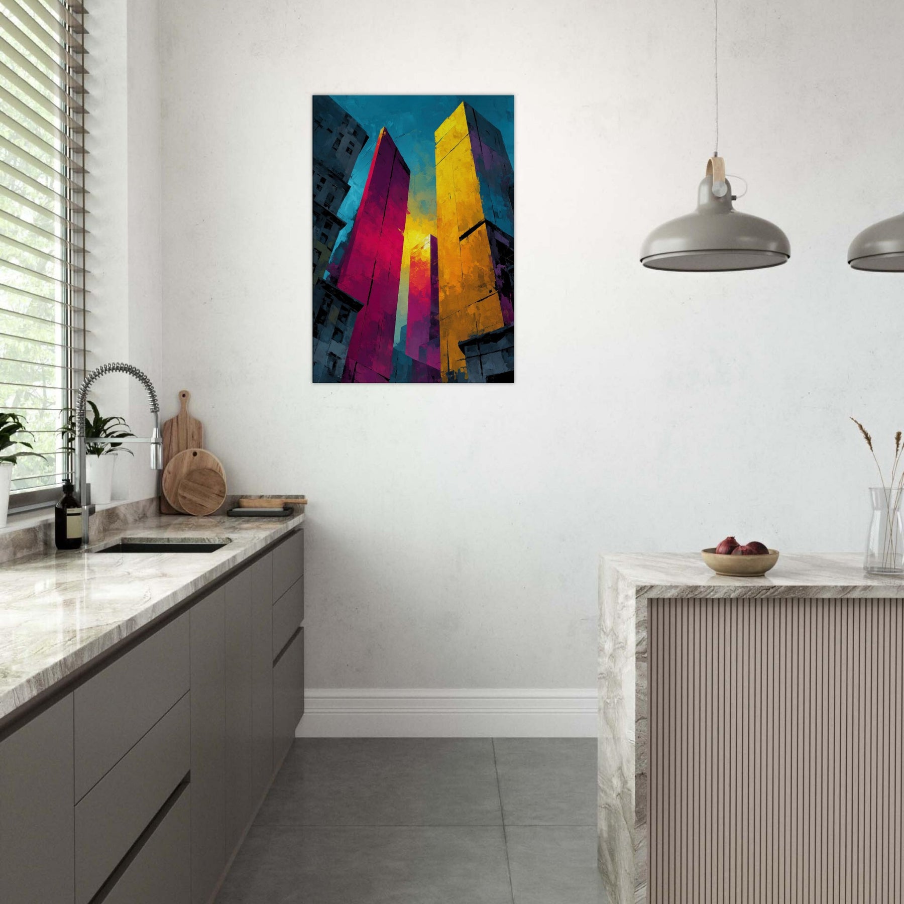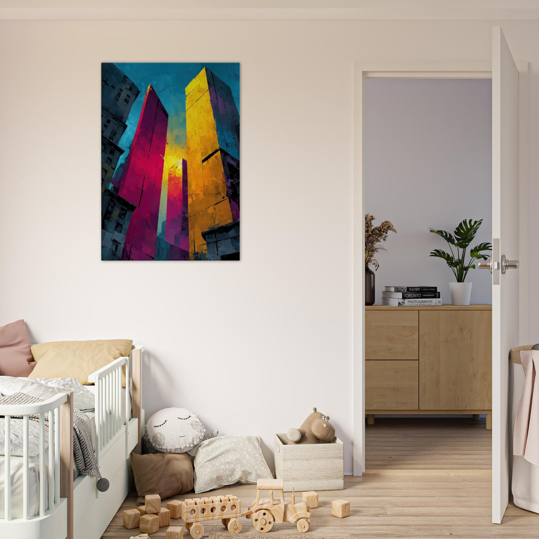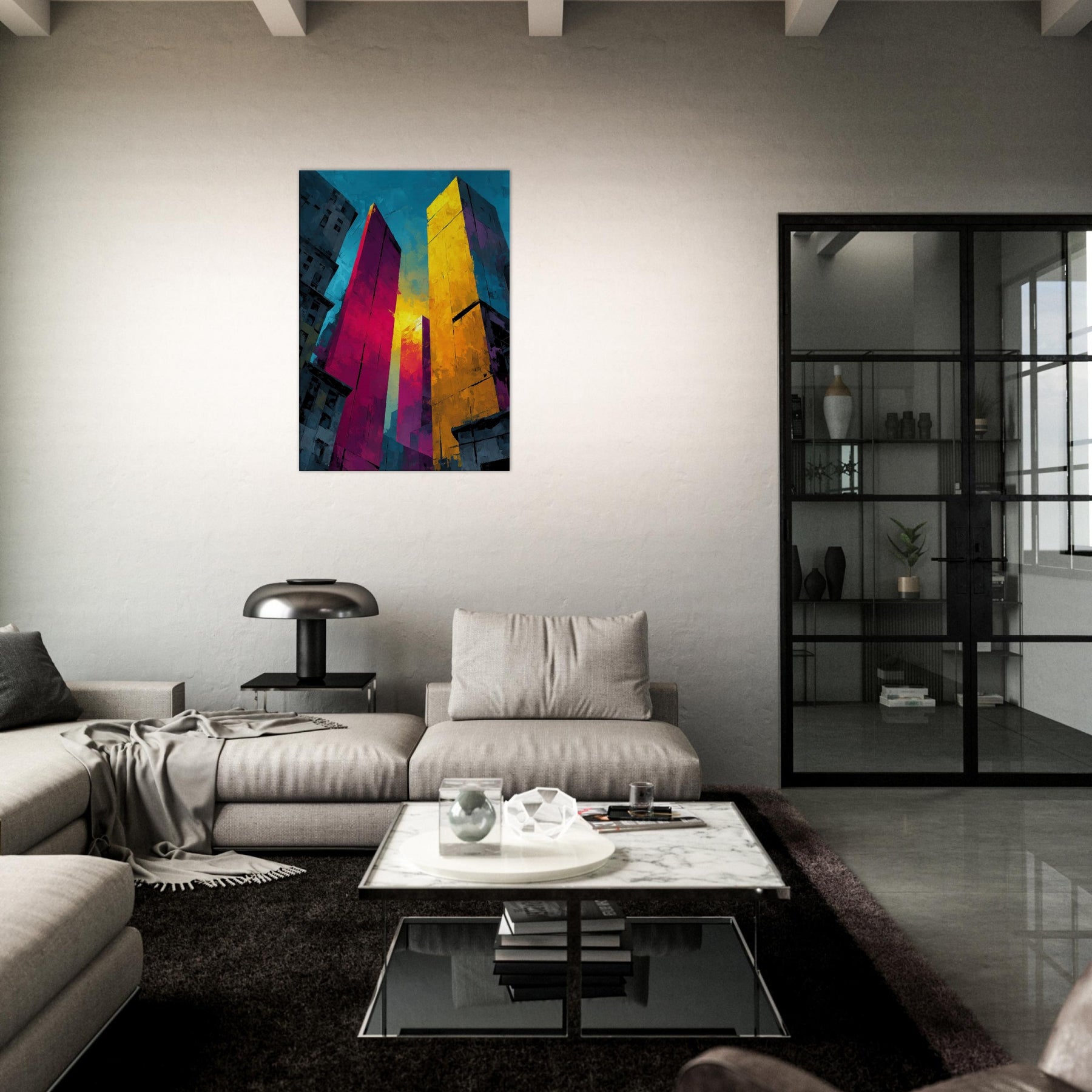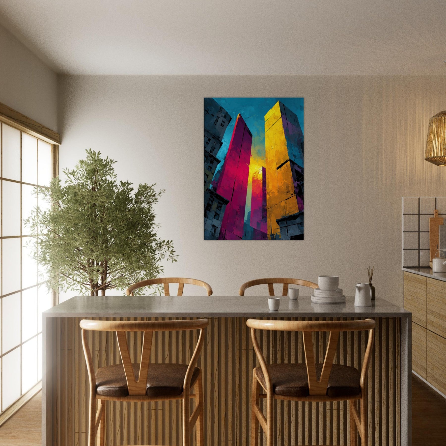 Step beneath towering silhouettes and let color carve a skyline in motion. This Amsterdam inspired piece dissolves the city's architecture into bold, luminous slabs of yellow, magenta, and teal, inviting the eye to wander and the breath to slow. The abstract cityscape hums with urban energy, yet remains intimate an atmospheric companion to a living room or study. Hang it where light shifts daily, and watch the space awaken with a cinematic glow that makes conversations glow and memories feel newly painted.