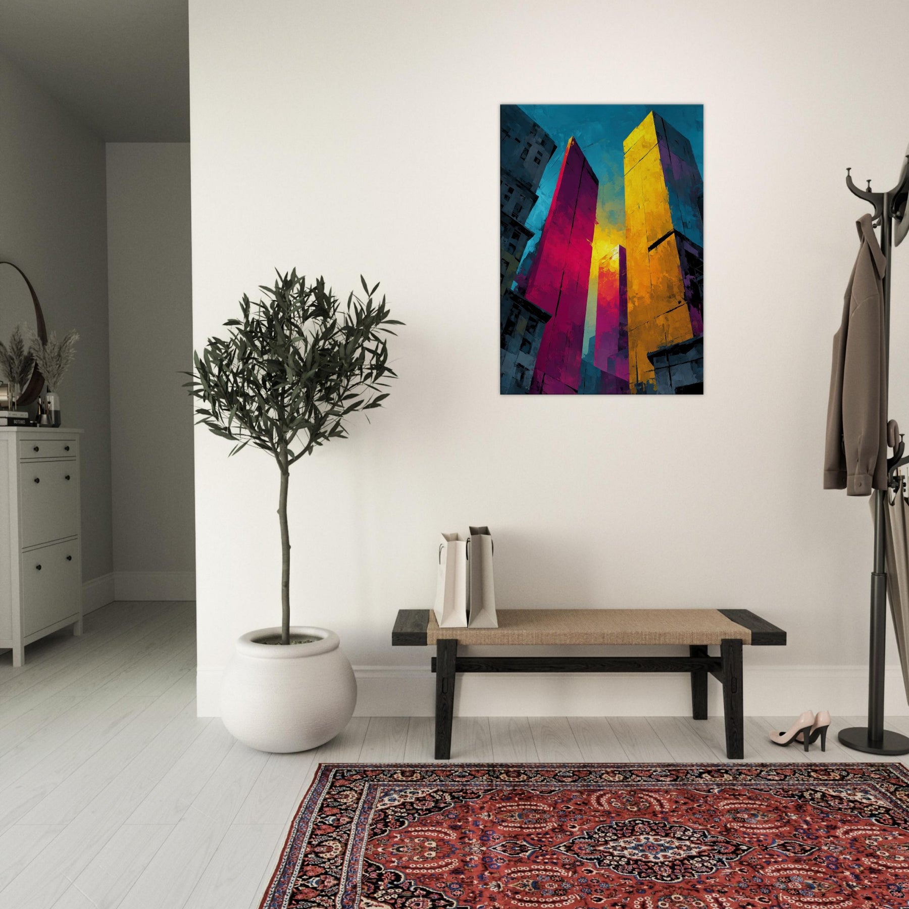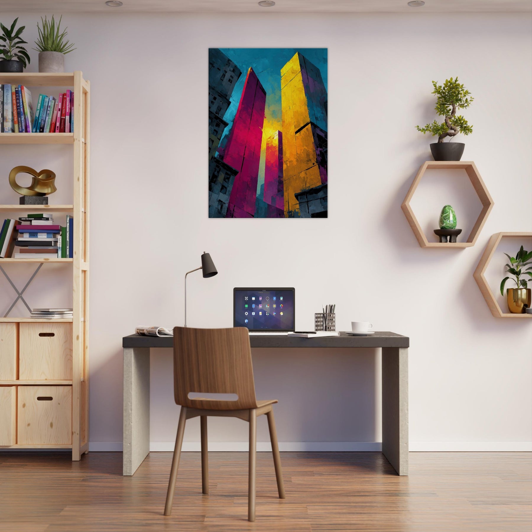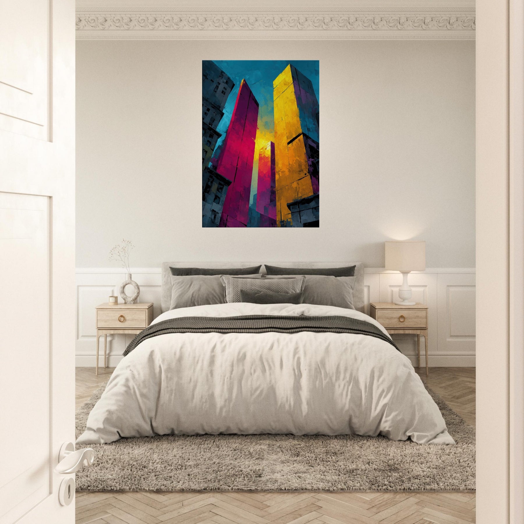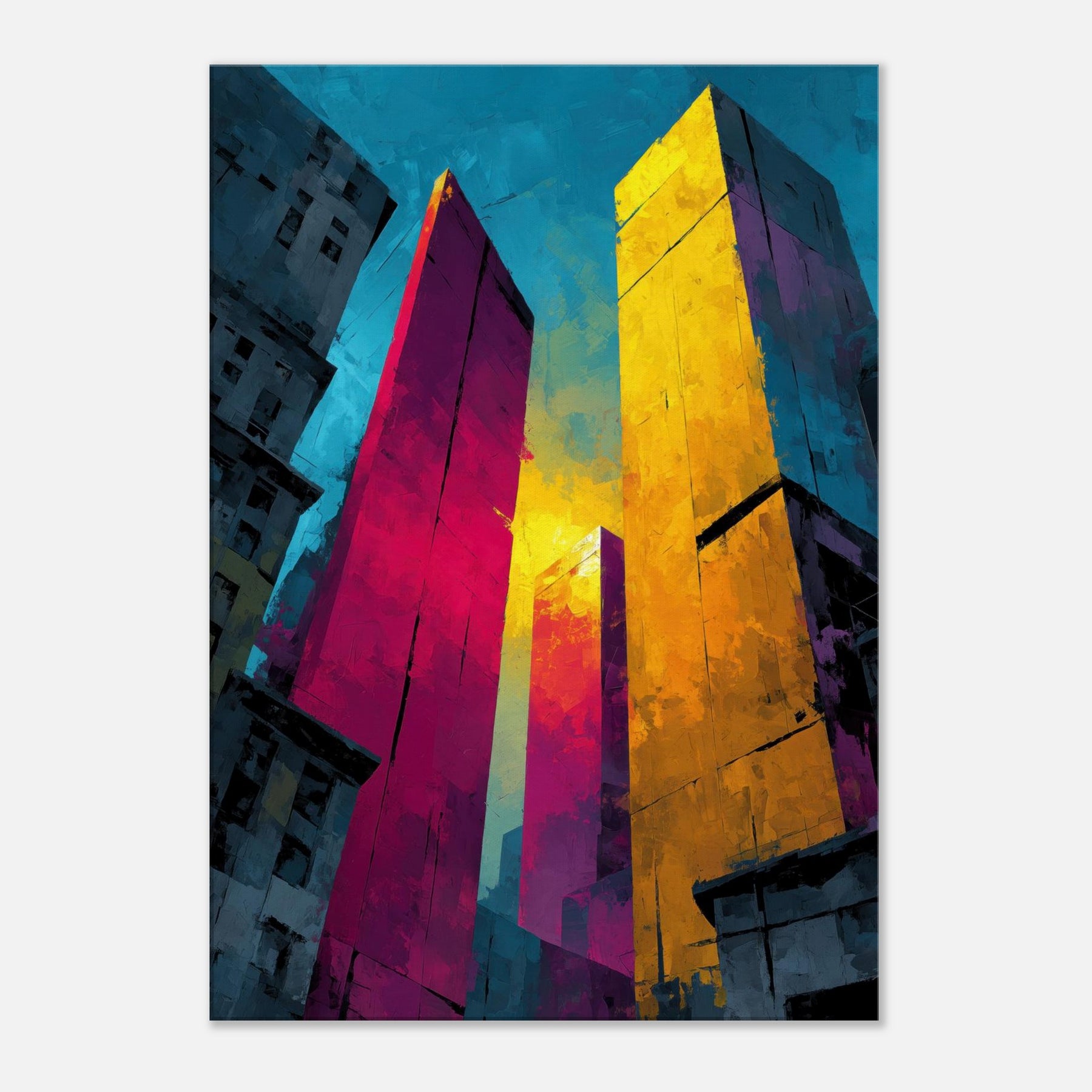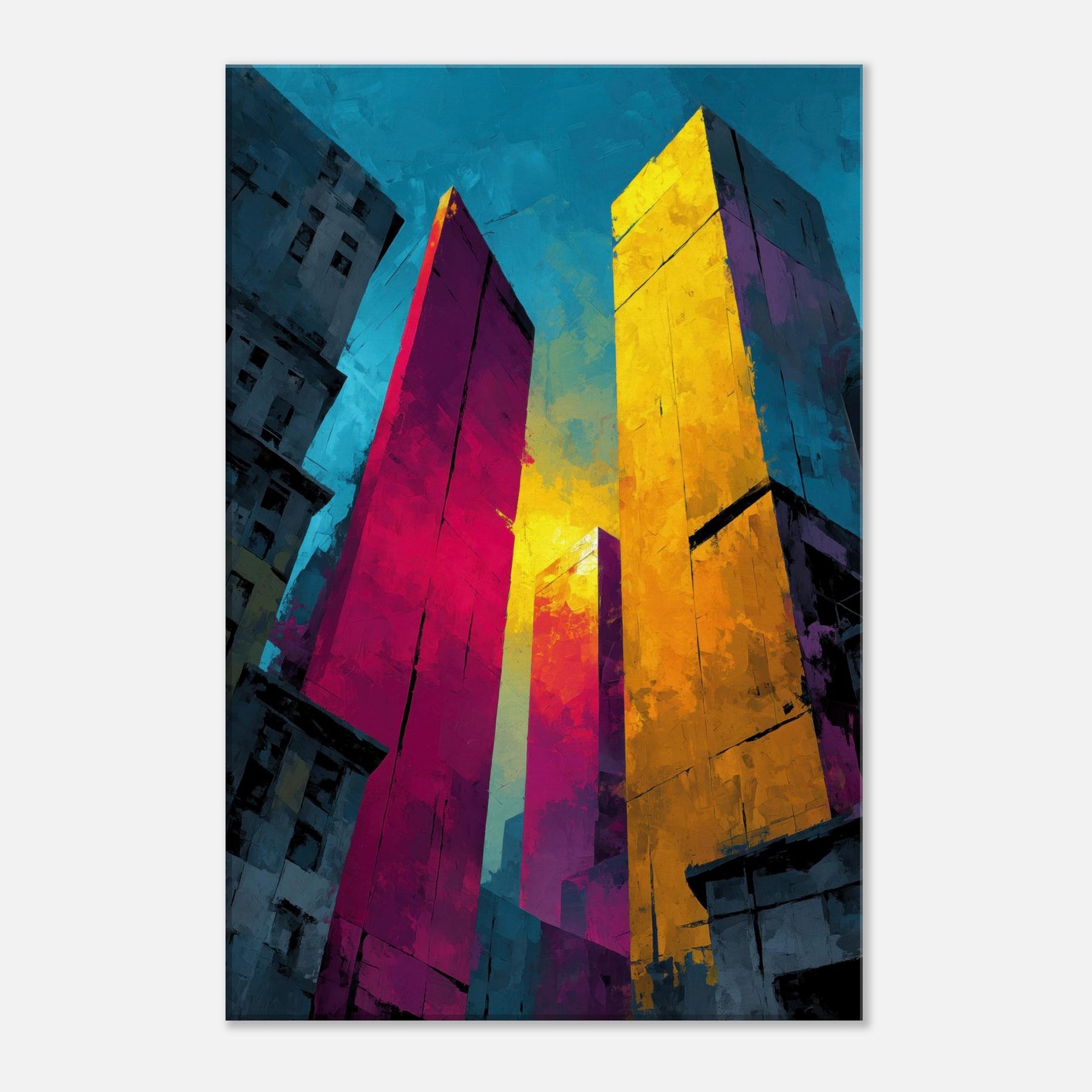 Step beneath towering silhouettes and let color carve a skyline in motion. This Amsterdam inspired piece dissolves the city's architecture into bold, luminous slabs of yellow, magenta, and teal, inviting the eye to wander and the breath to slow. The abstract cityscape hums with urban energy, yet remains intimate an atmospheric companion to a living room or study. Hang it where light shifts daily, and watch the space awaken with a cinematic glow that makes conversations glow and memories feel newly painted.
