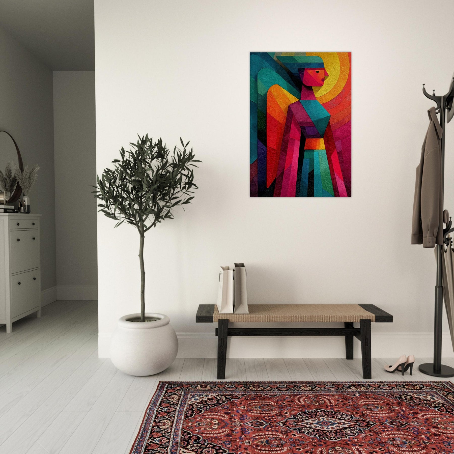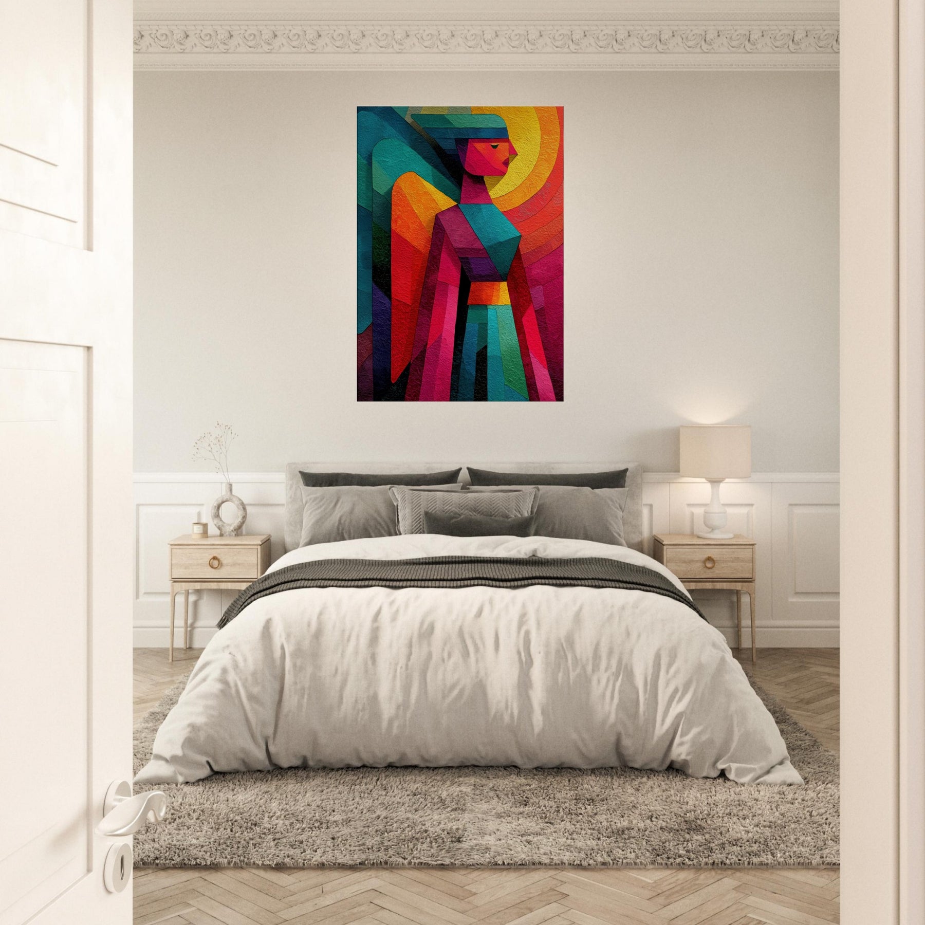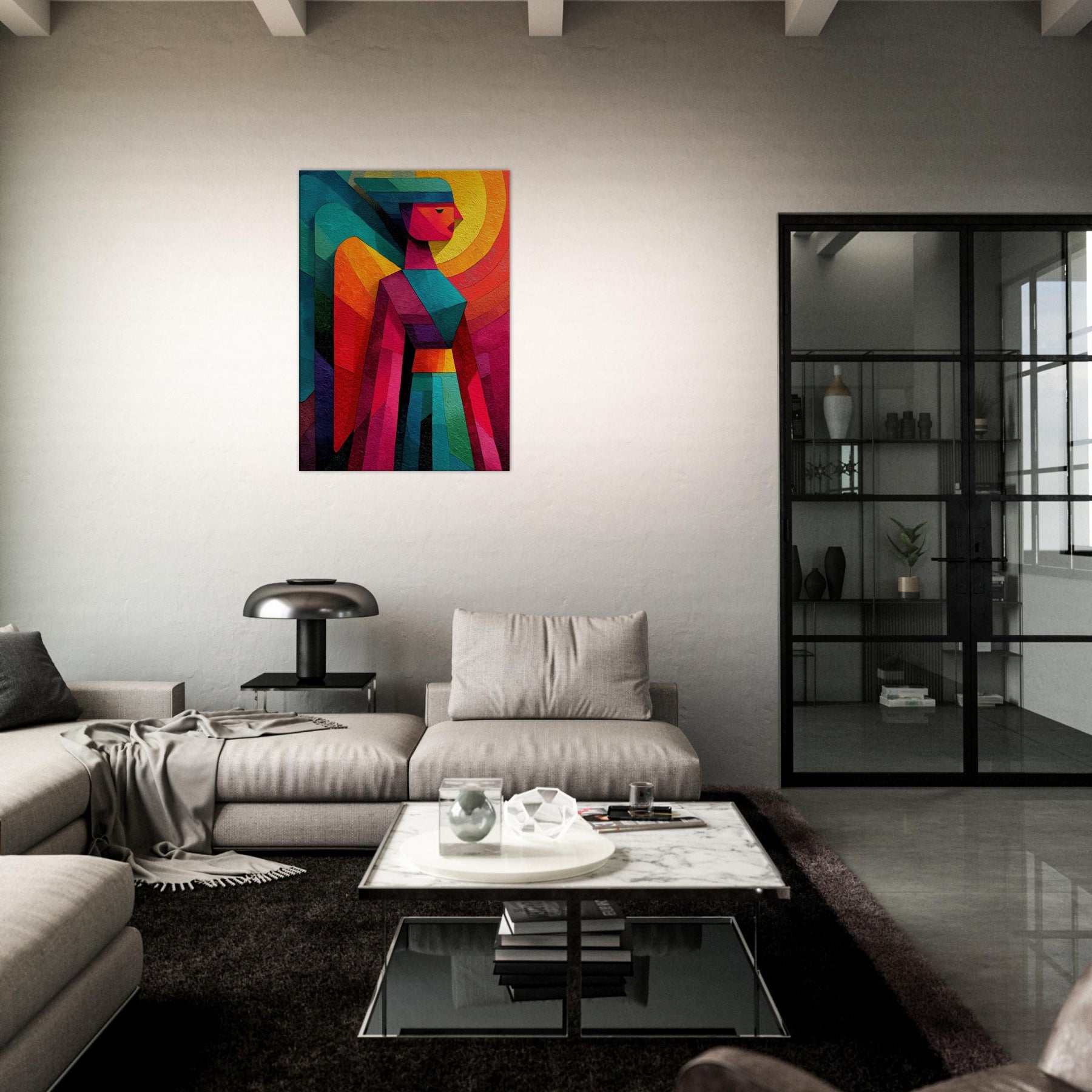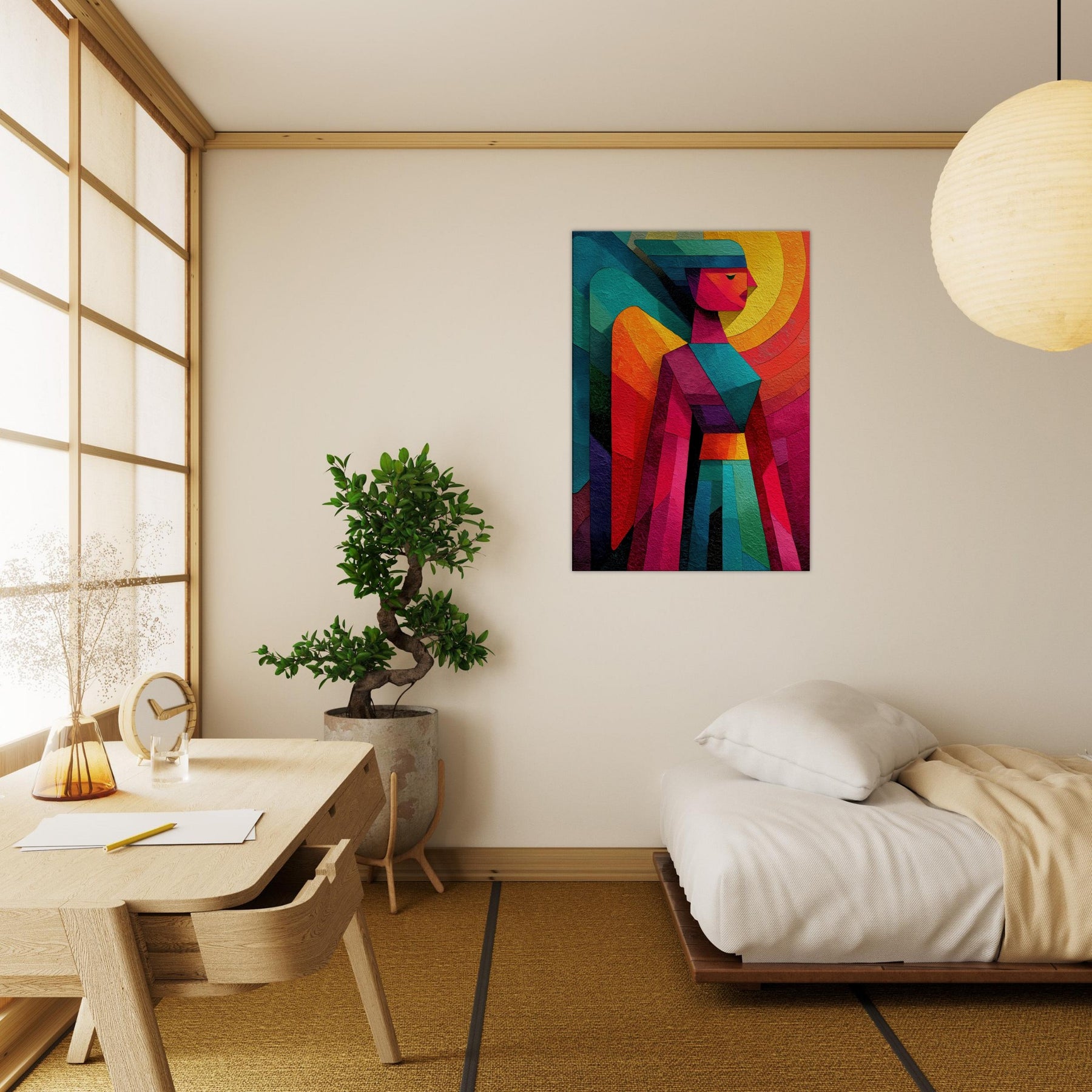 An enigmatic presence unfolds in prismatic shards that echo across the wall. This abstract composition centers on the Angel, whose form dissolves into radiant geometry and velvet shadows, inviting calm and wonder. Soft transitions of turquoise, magenta, and gold create a melody of light that enriches intimate spaces from a serene bedroom to a sunlit living room. With tactile texture implied by the painting’s geometric facets, the piece invites quiet reflection and a sense of celestial comfort, turning any wall into a sanctuary. The central subject is Angel/Archangel.