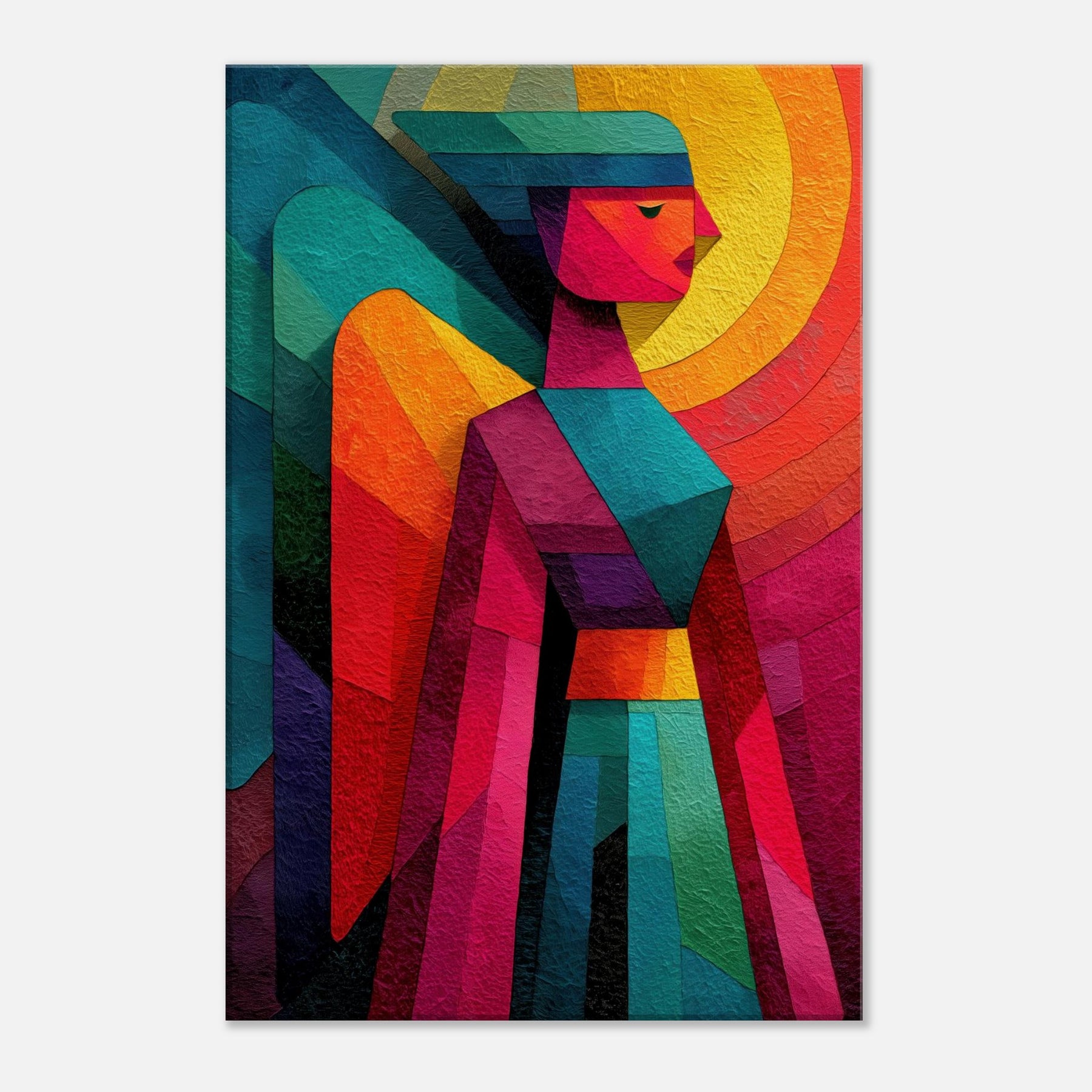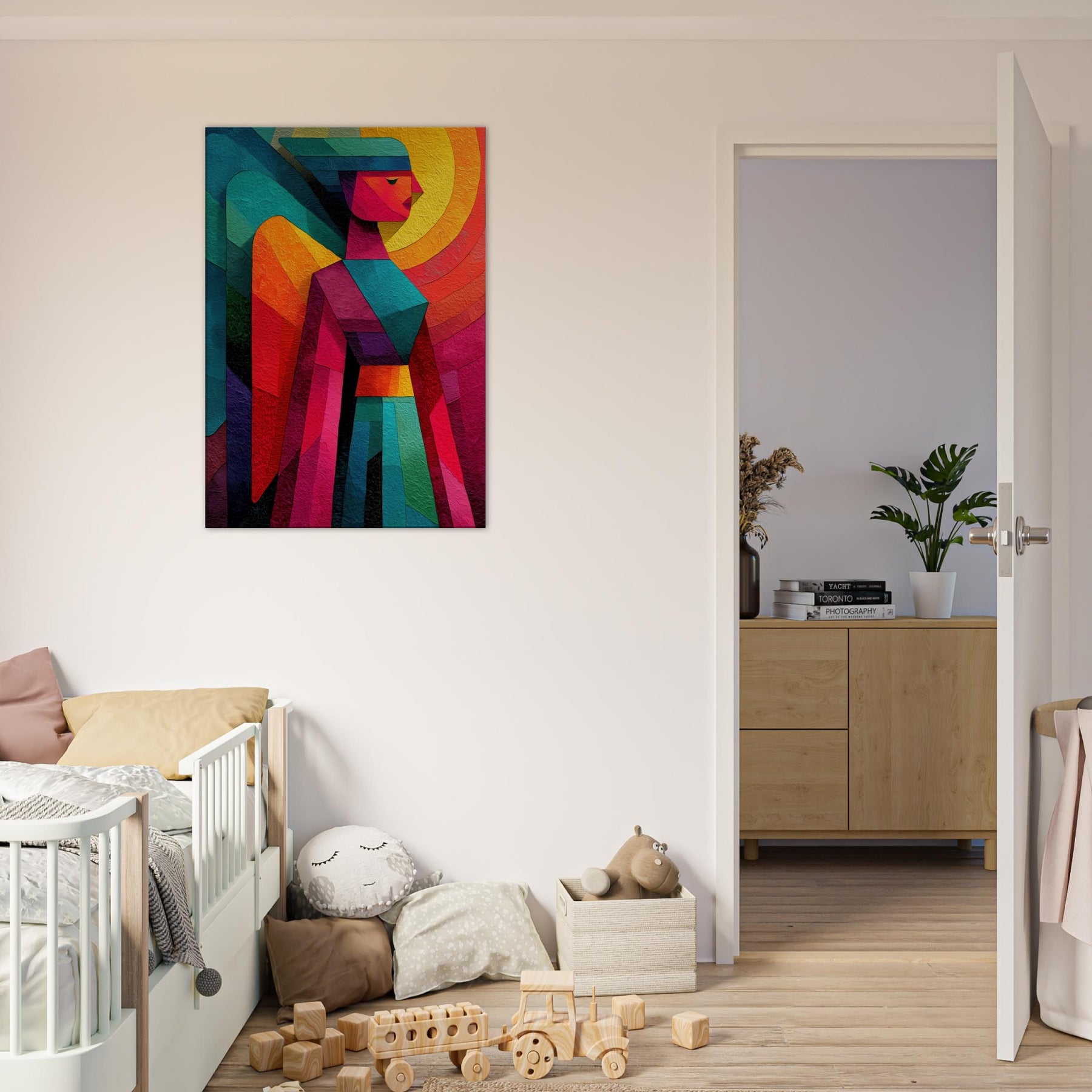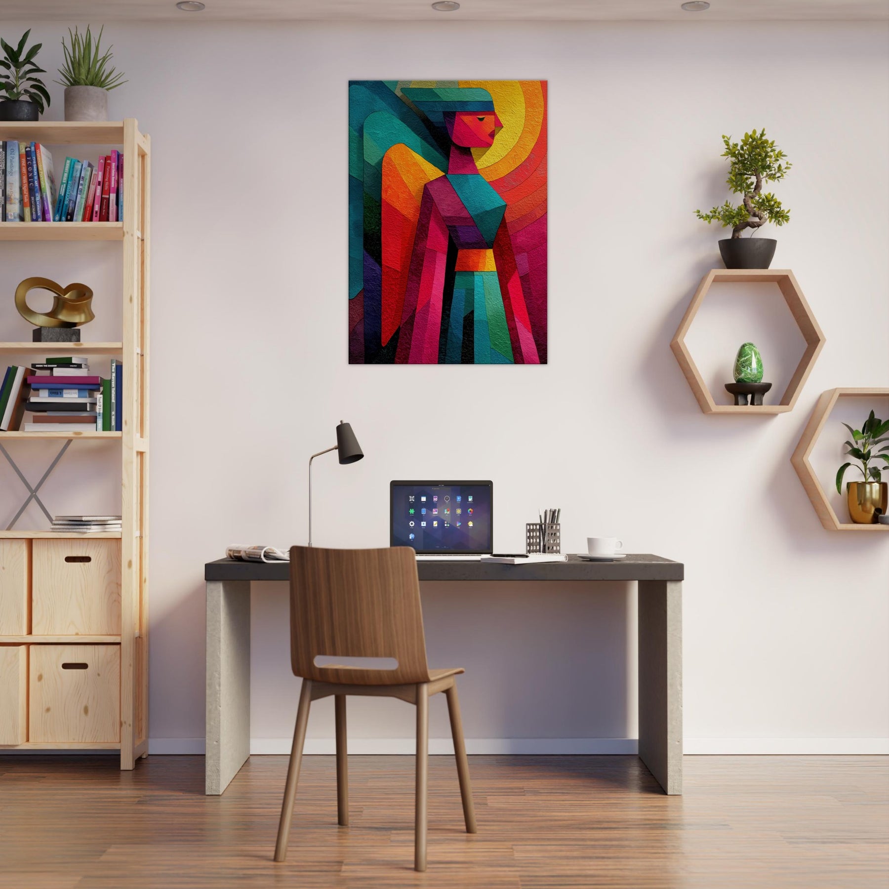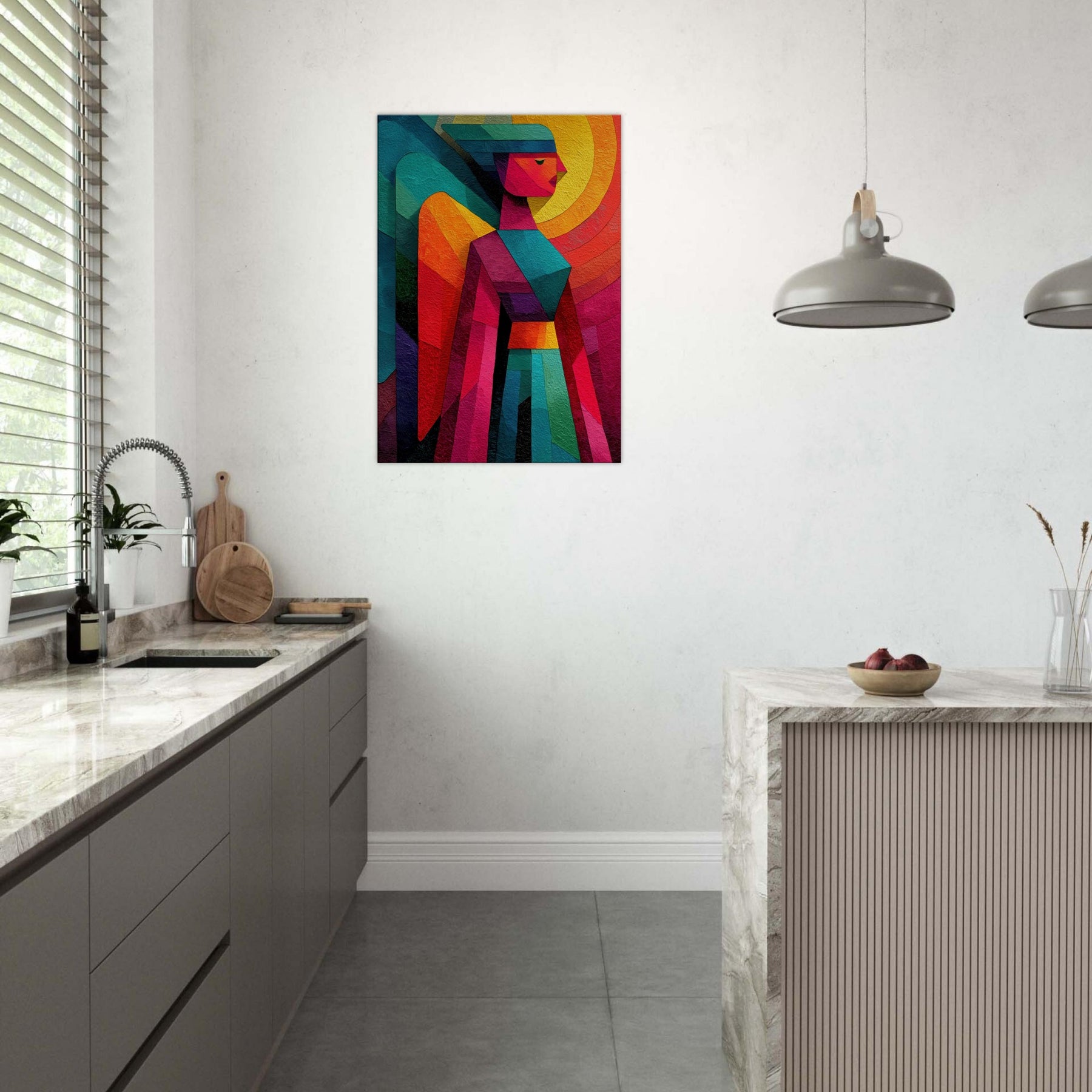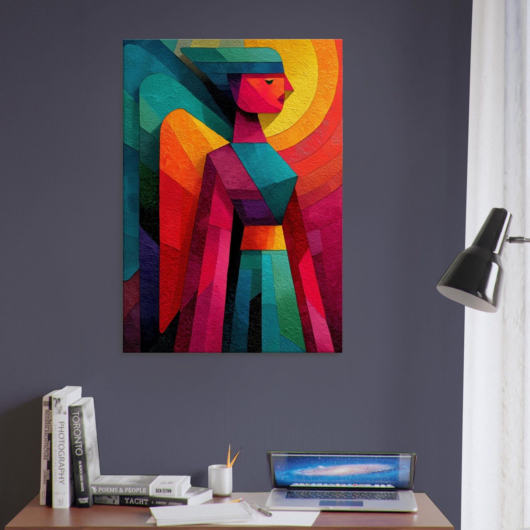 An enigmatic presence unfolds in prismatic shards that echo across the wall. This abstract composition centers on the Angel, whose form dissolves into radiant geometry and velvet shadows, inviting calm and wonder. Soft transitions of turquoise, magenta, and gold create a melody of light that enriches intimate spaces from a serene bedroom to a sunlit living room. With tactile texture implied by the painting’s geometric facets, the piece invites quiet reflection and a sense of celestial comfort, turning any wall into a sanctuary. The central subject is Angel/Archangel.