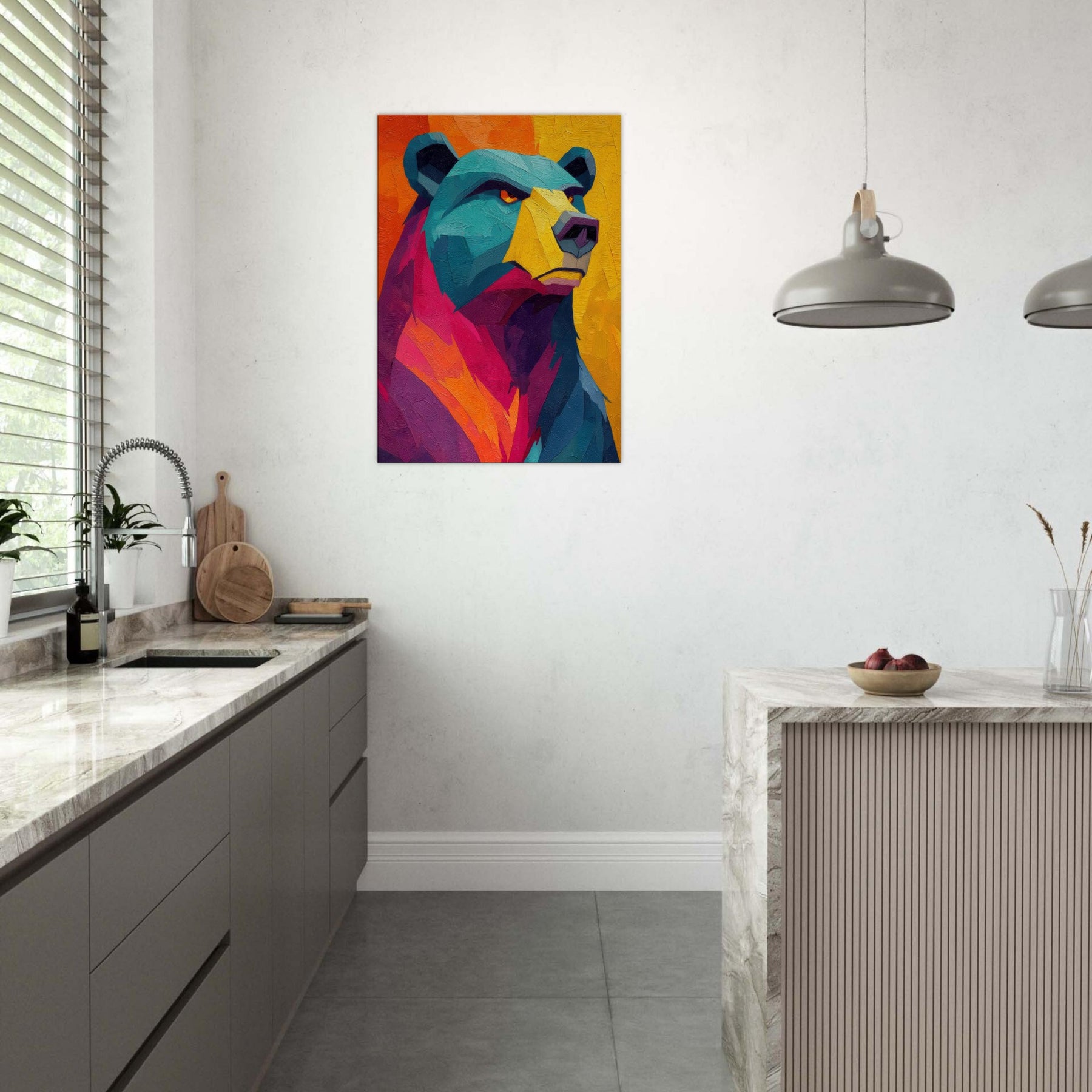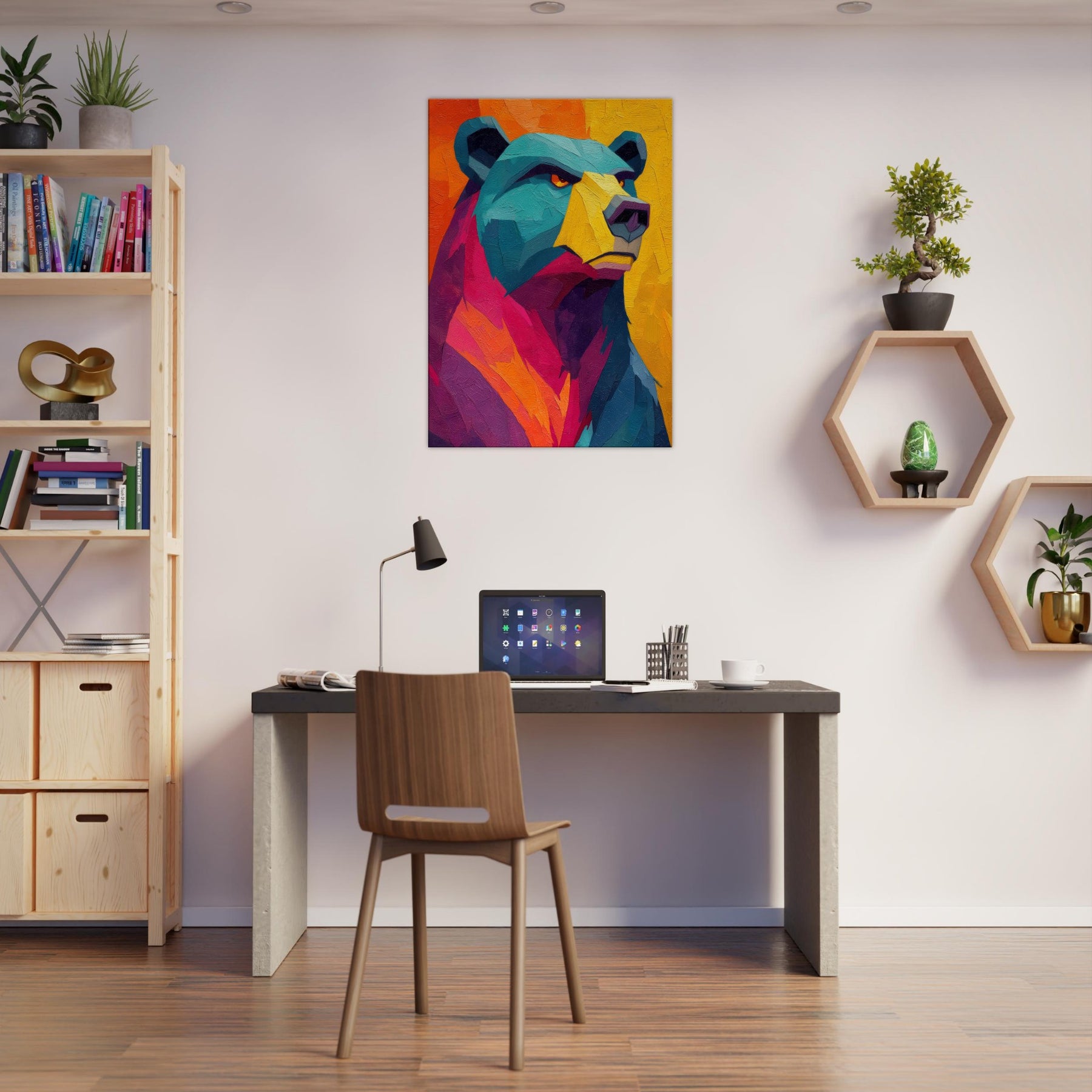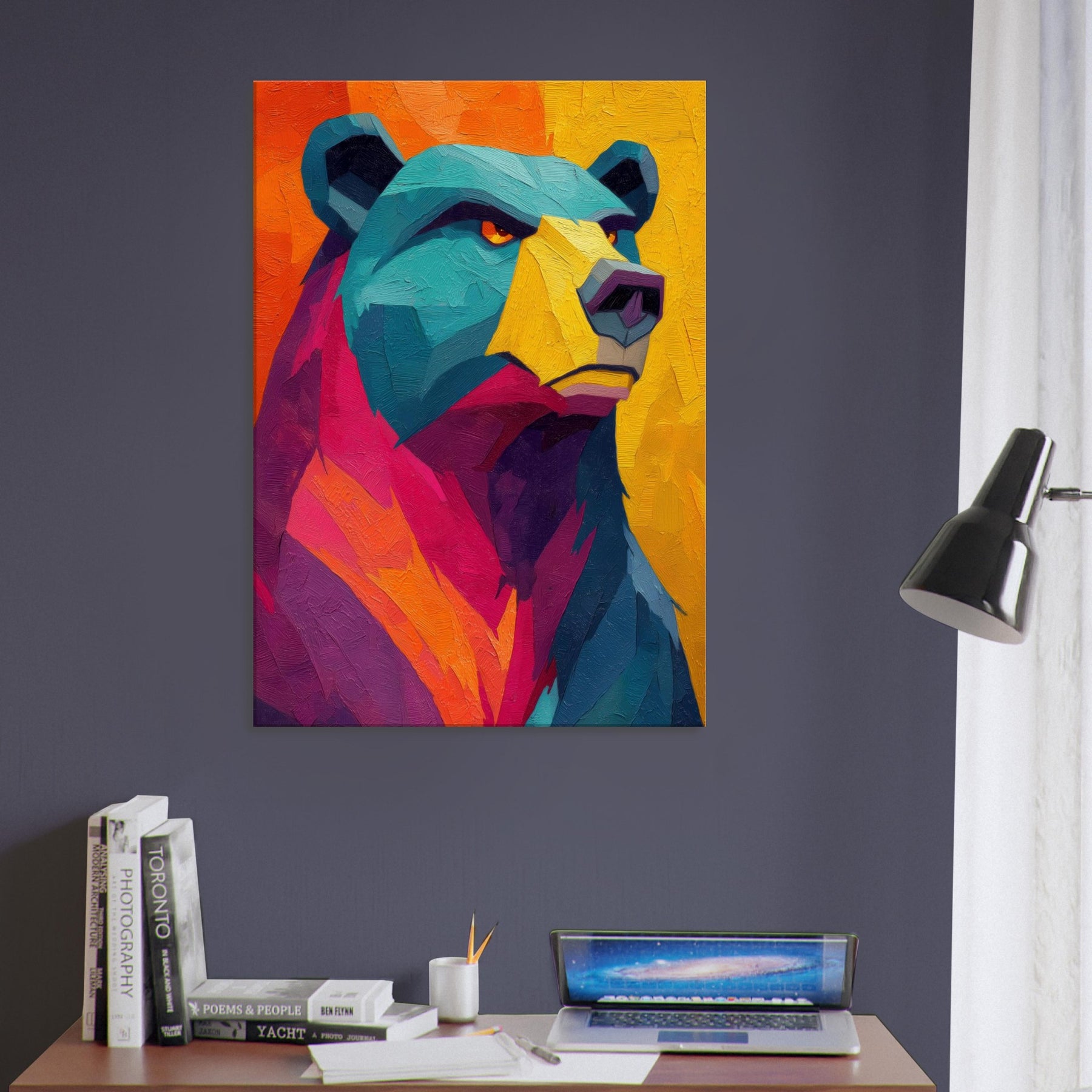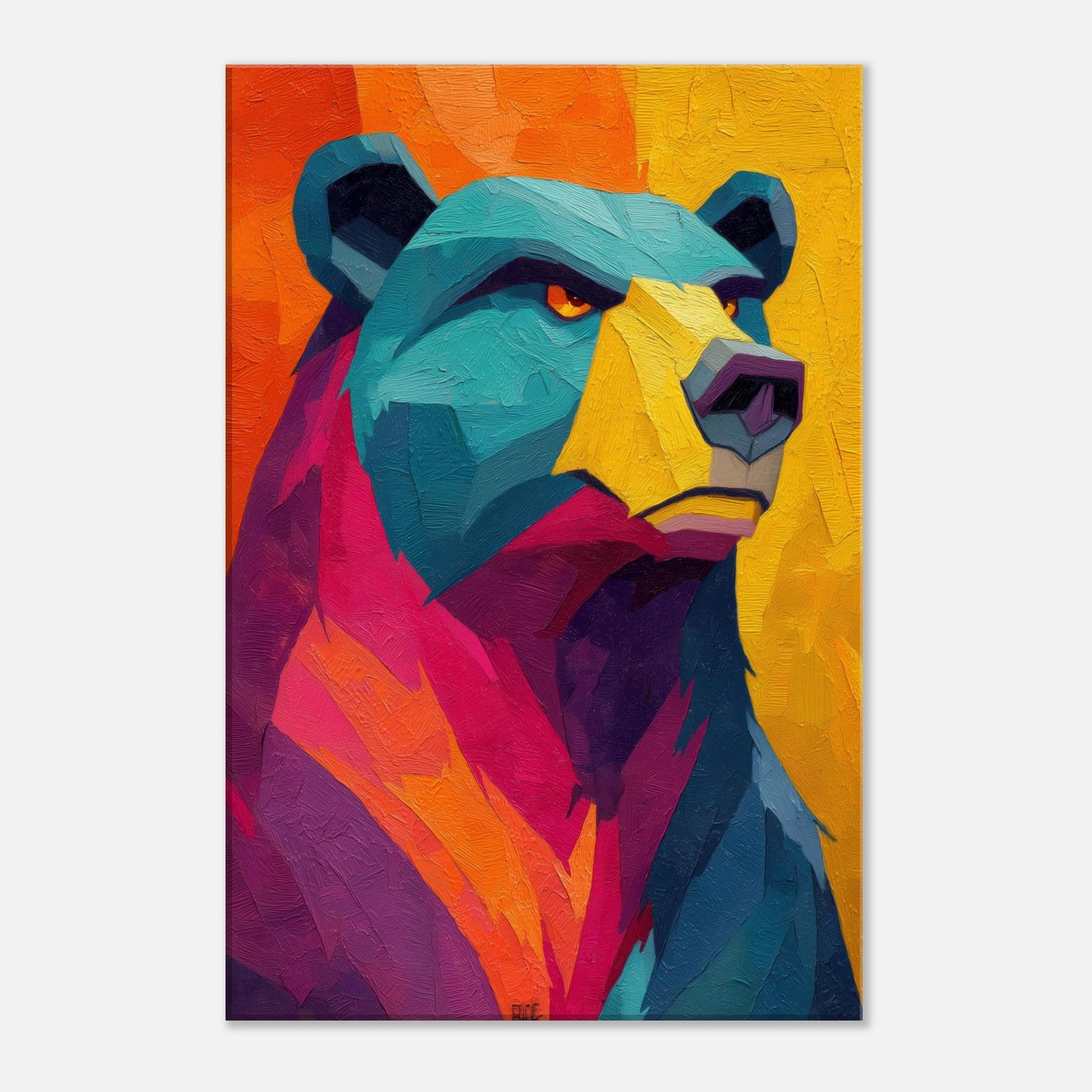 An electric bear strides through a sunset of color, where turquoise fur meets blazing orange and magenta. This abstract breathes warmth and motion, inviting the room to pulse with life. The texture feels tactile, as if you could reach into the paint and hear a soft rustle of wind through a forest at dusk. Hang this piece where you want conversation to unfold and the space to glow with mood and quiet power bear presence, reimagined in luminous, contemporary layers.