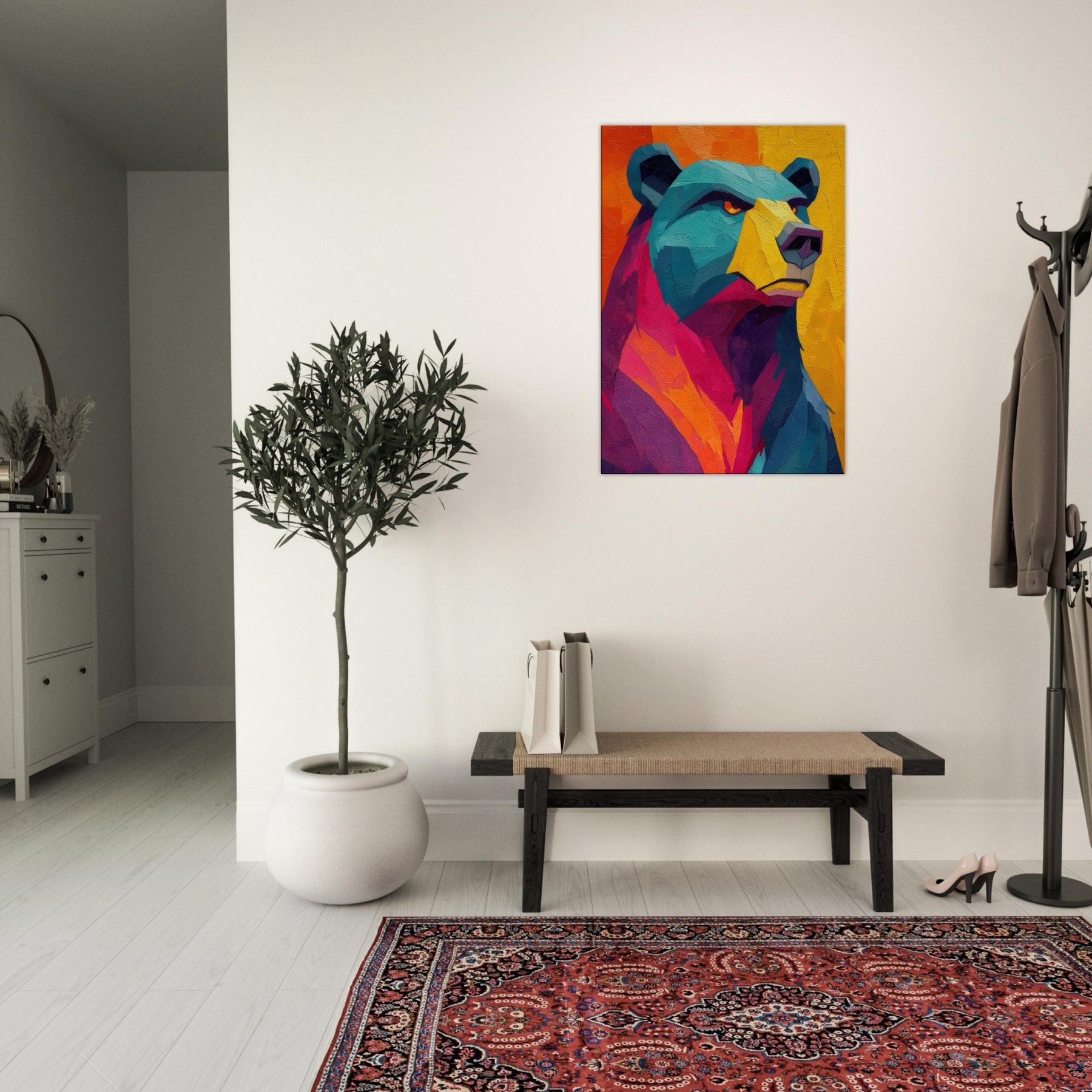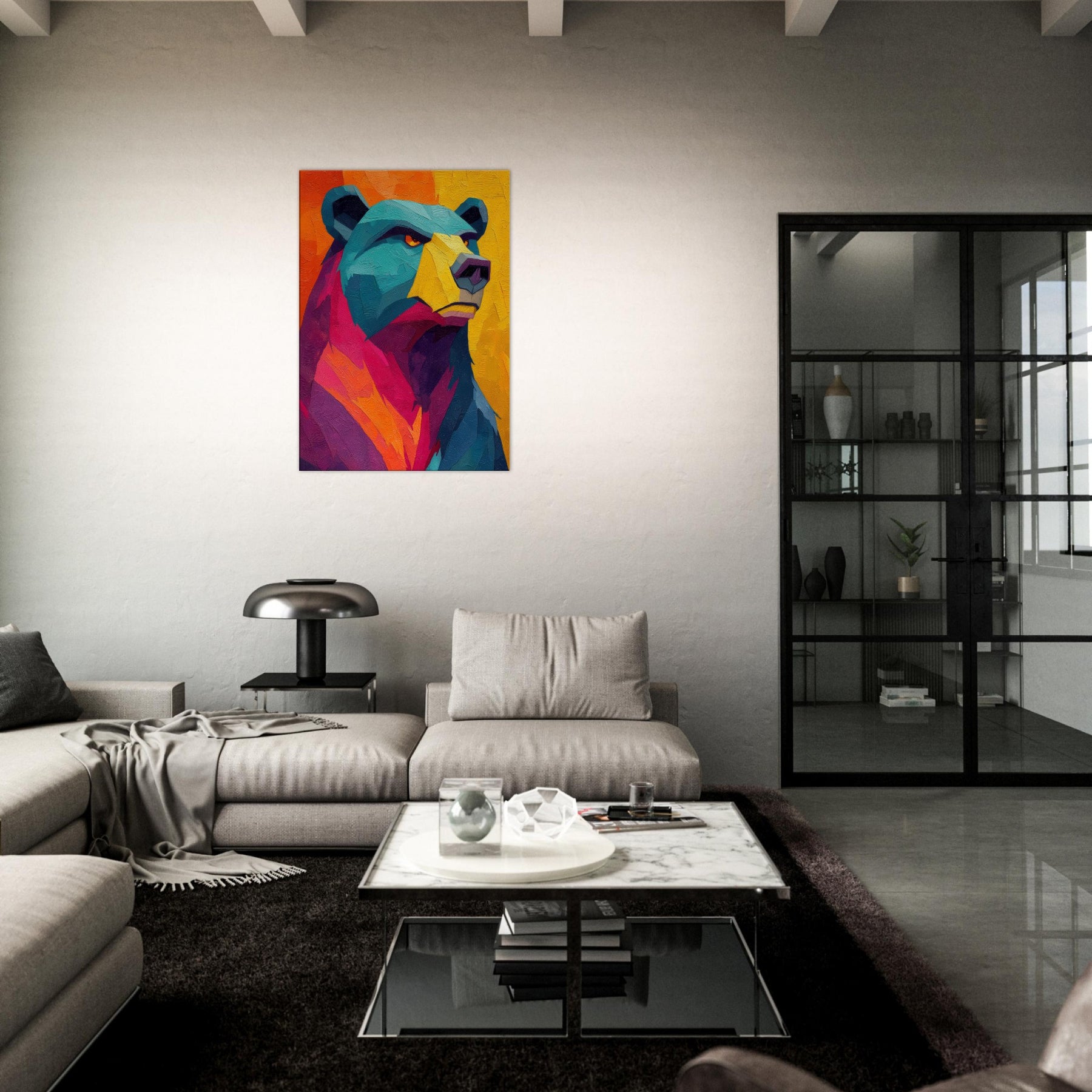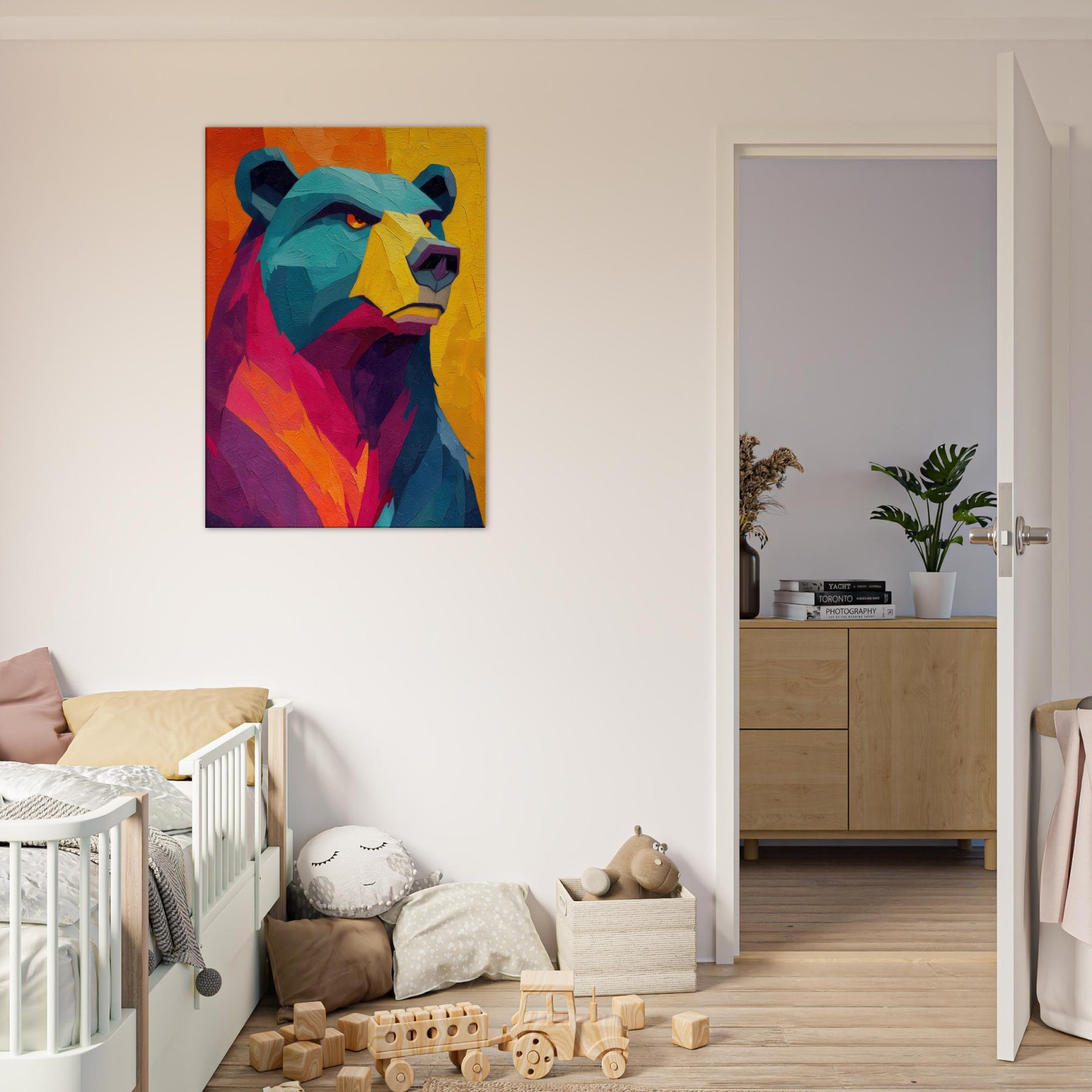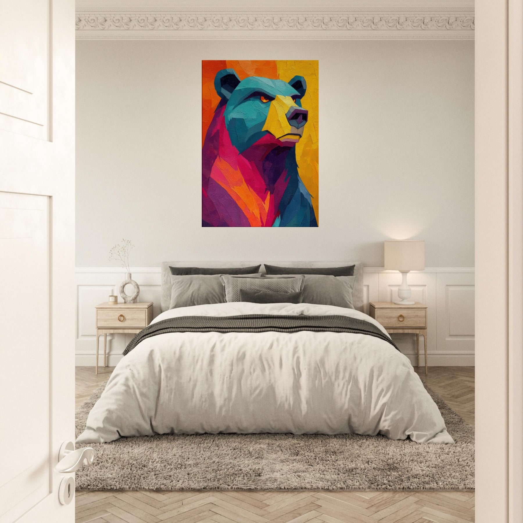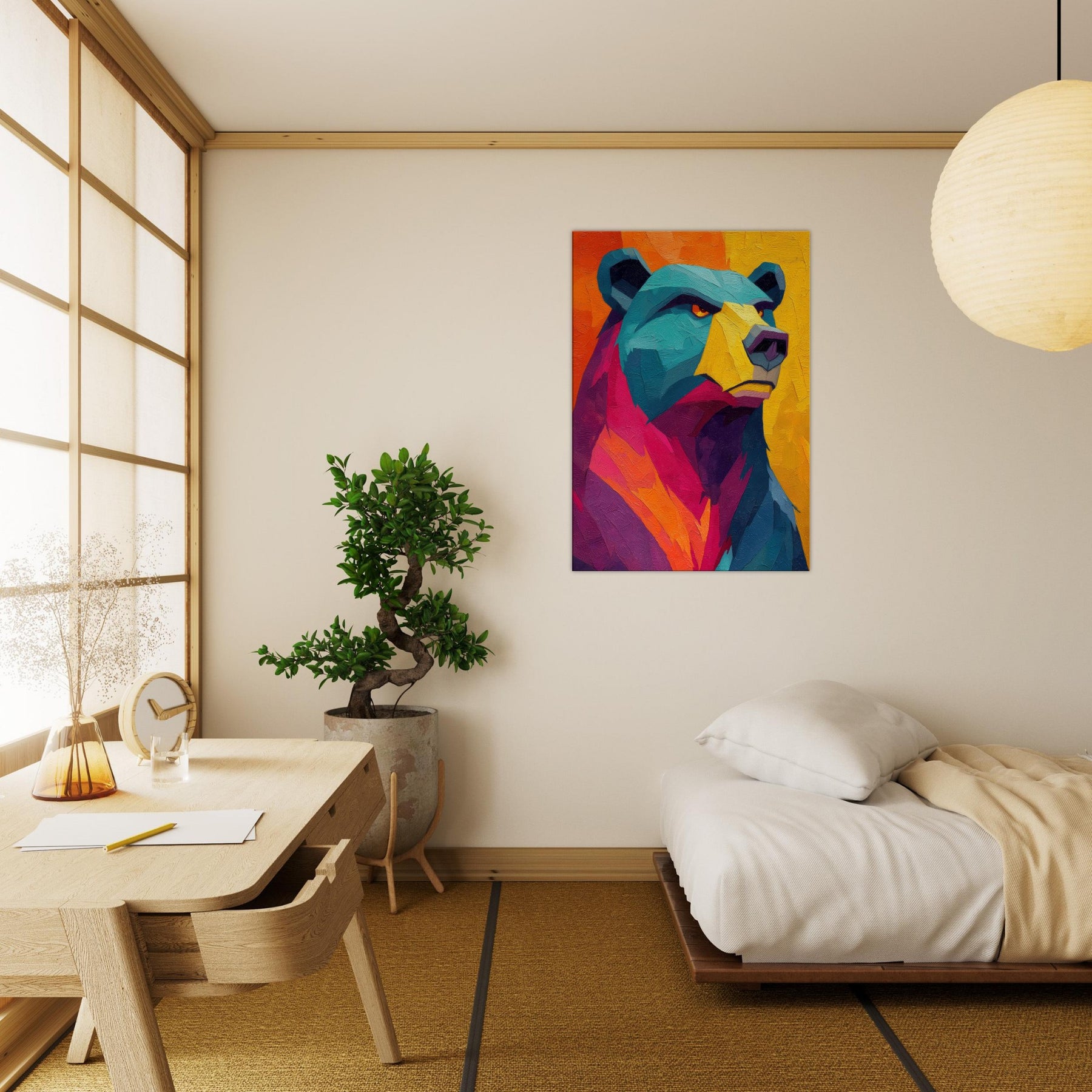 An electric bear strides through a sunset of color, where turquoise fur meets blazing orange and magenta. This abstract breathes warmth and motion, inviting the room to pulse with life. The texture feels tactile, as if you could reach into the paint and hear a soft rustle of wind through a forest at dusk. Hang this piece where you want conversation to unfold and the space to glow with mood and quiet power bear presence, reimagined in luminous, contemporary layers.