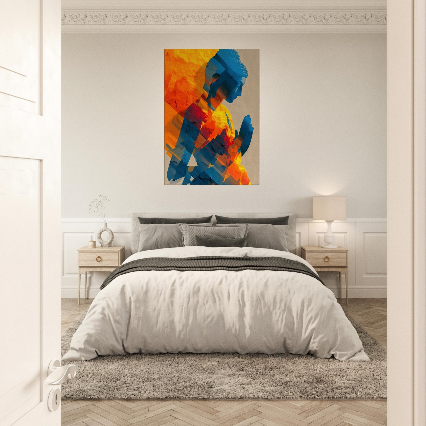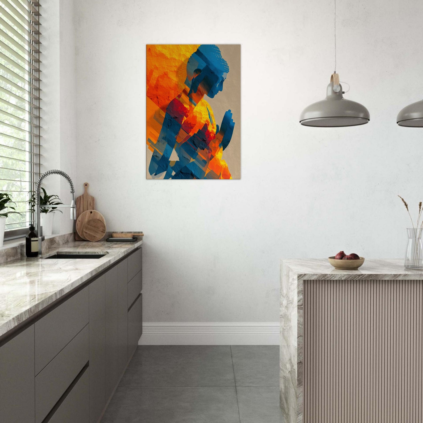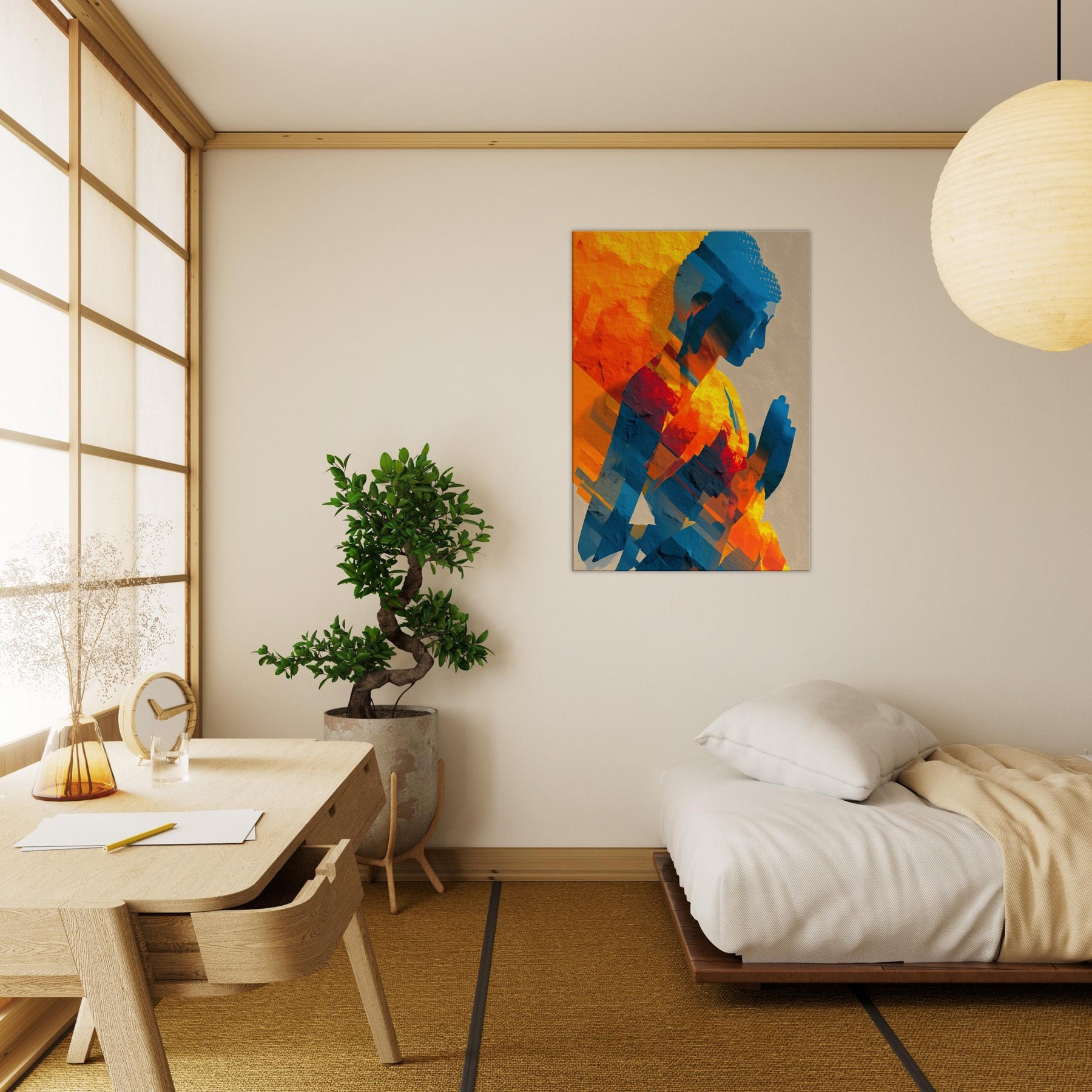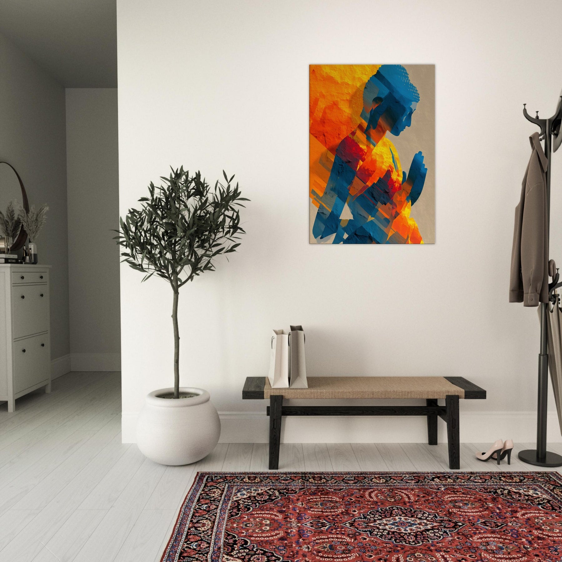 Meditative blues melt into radiant oranges, revealing a Bodhisattva unfurling into light. This abstract study moves with breath and shadow, inviting stillness and curiosity. In a living space, it wakes walls with a soft glow, guiding conversations and quiet evenings alike. The piece feels protective yet open, a sanctuary that balances reverence with contemporary energy. Its layered textures and translucent overlaps catch the eye from every angle, turning a room into a retreat where clarity and wonder mingle. The central subject is Bodhisattva (Abstract).