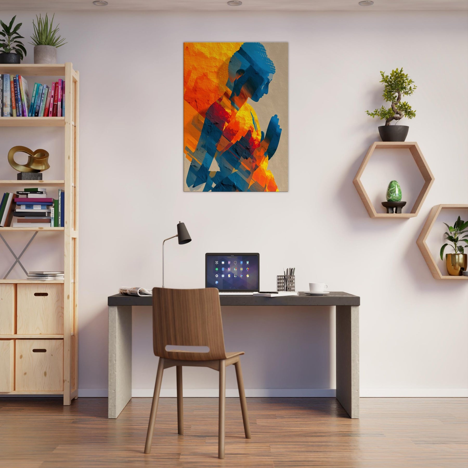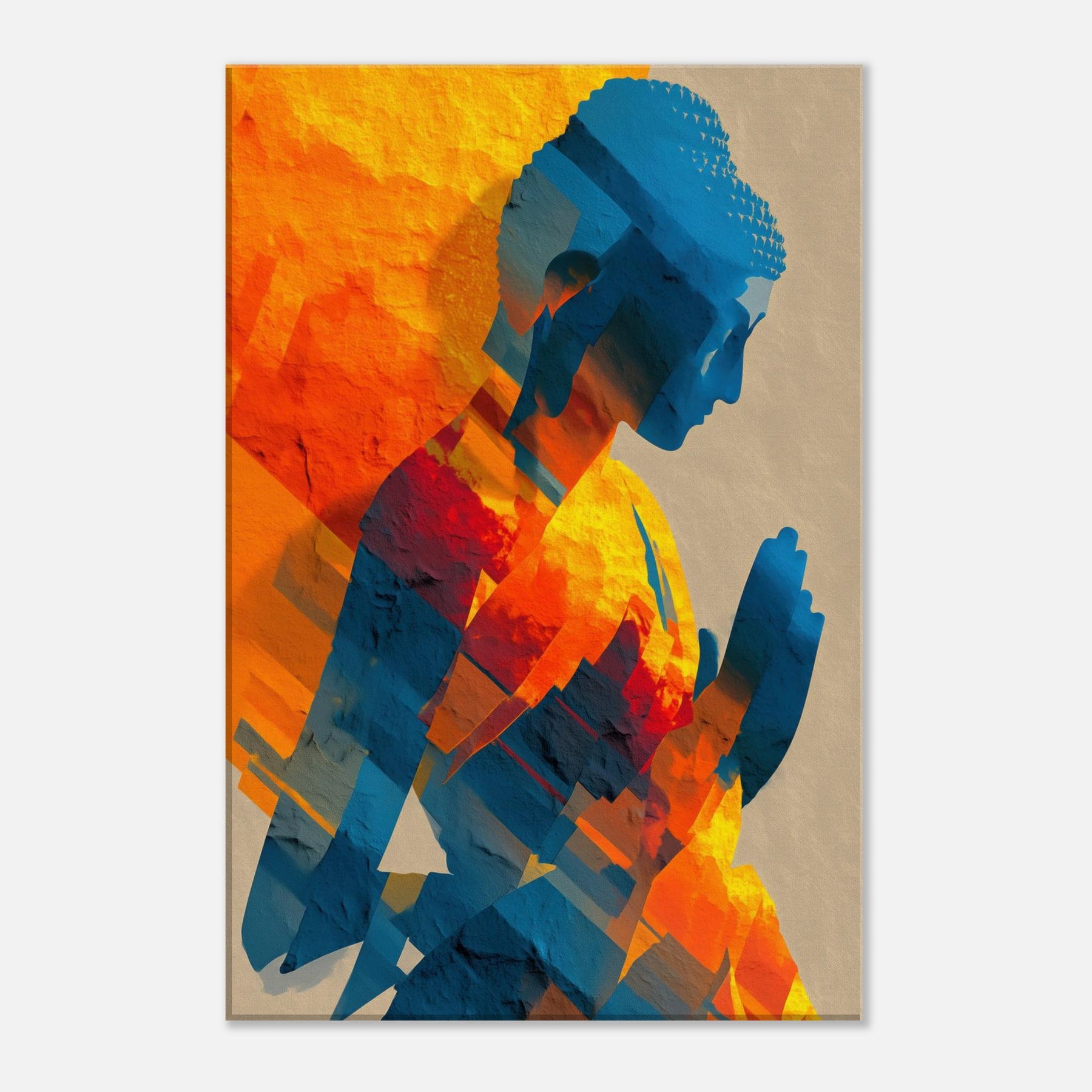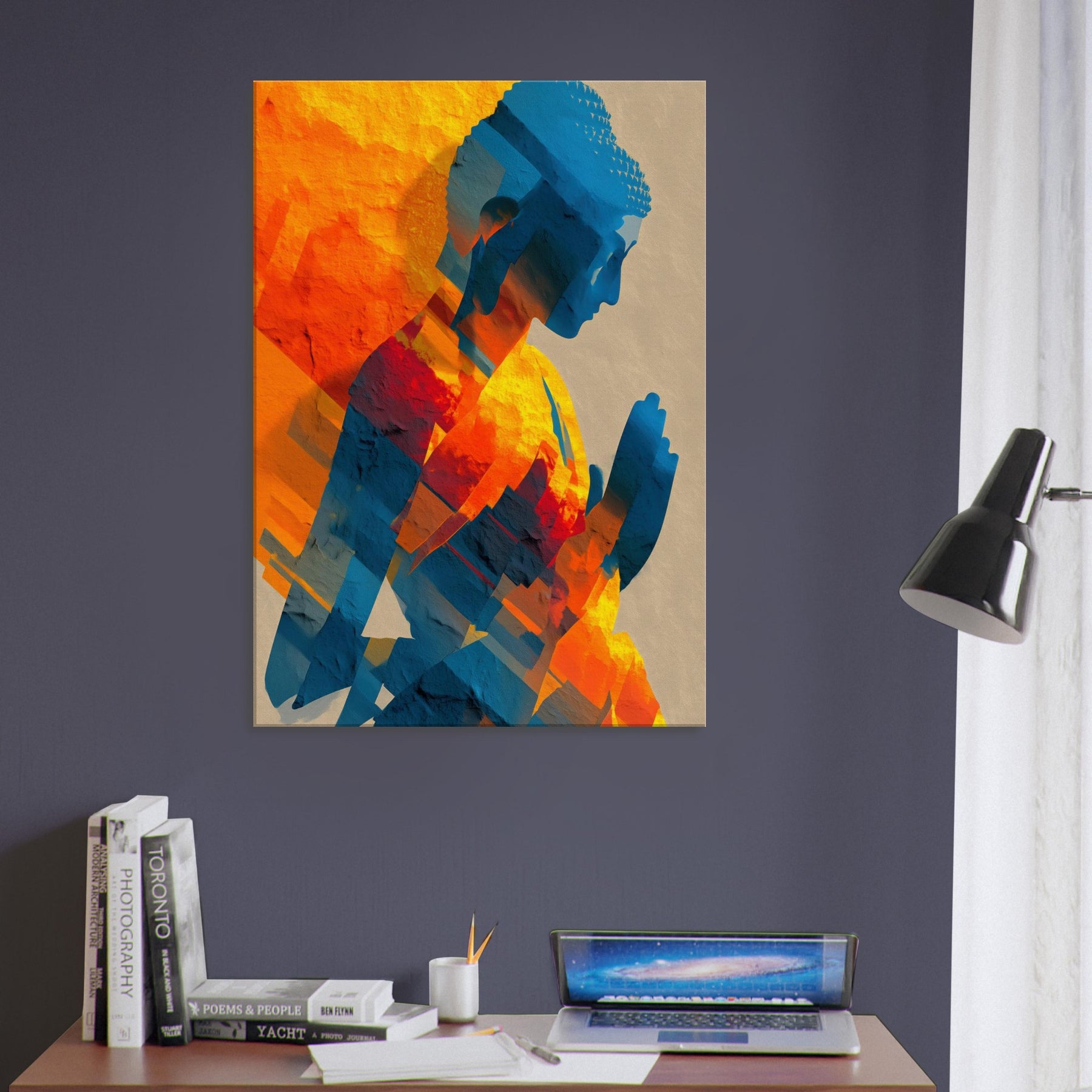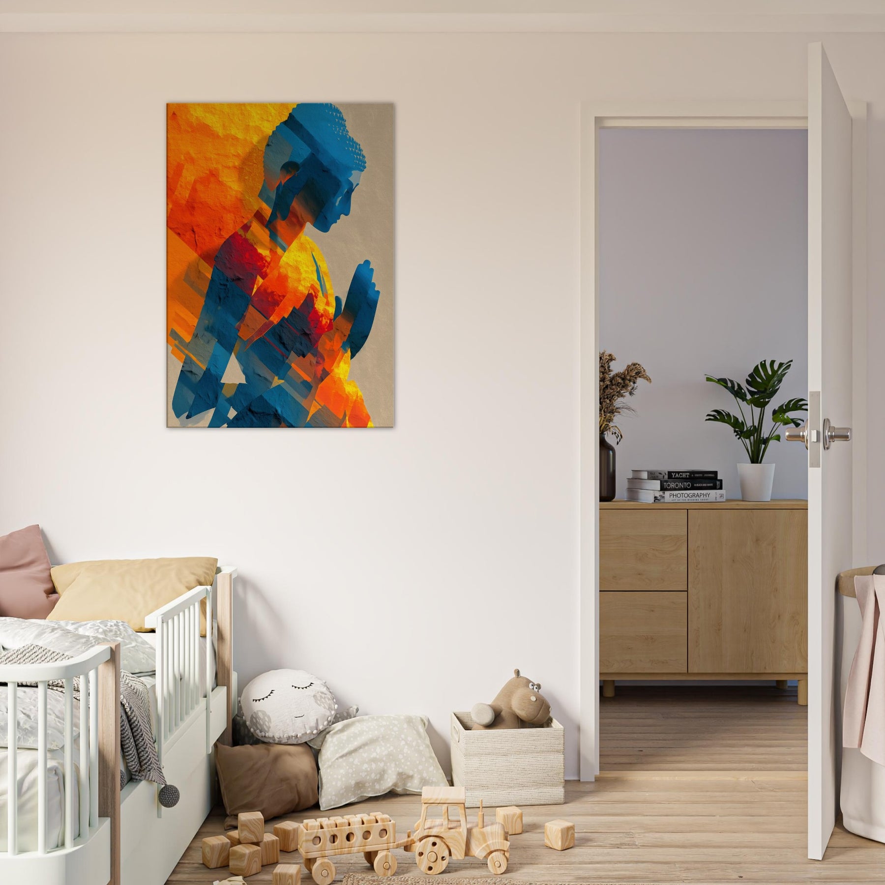 Meditative blues melt into radiant oranges, revealing a Bodhisattva unfurling into light. This abstract study moves with breath and shadow, inviting stillness and curiosity. In a living space, it wakes walls with a soft glow, guiding conversations and quiet evenings alike. The piece feels protective yet open, a sanctuary that balances reverence with contemporary energy. Its layered textures and translucent overlaps catch the eye from every angle, turning a room into a retreat where clarity and wonder mingle. The central subject is Bodhisattva (Abstract).