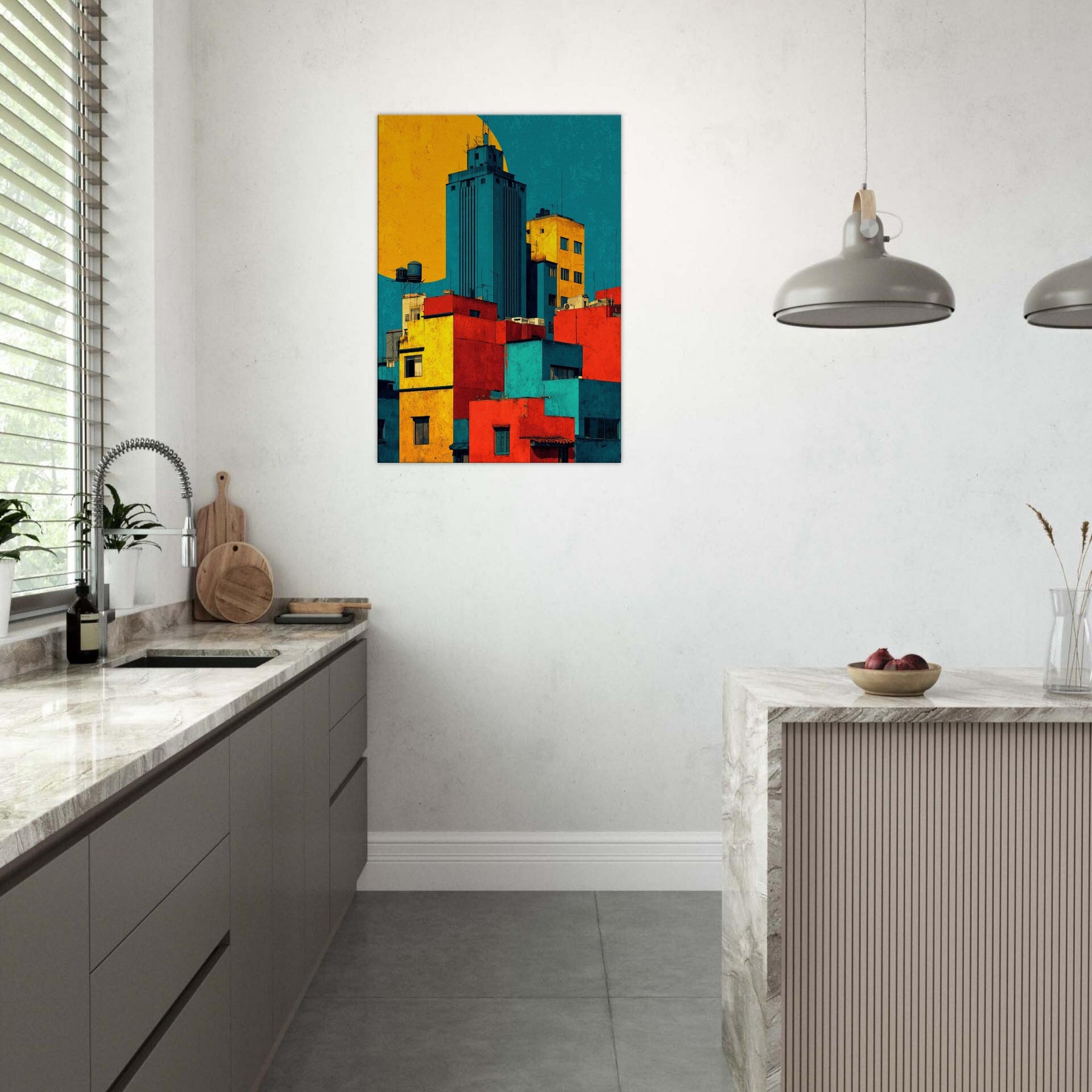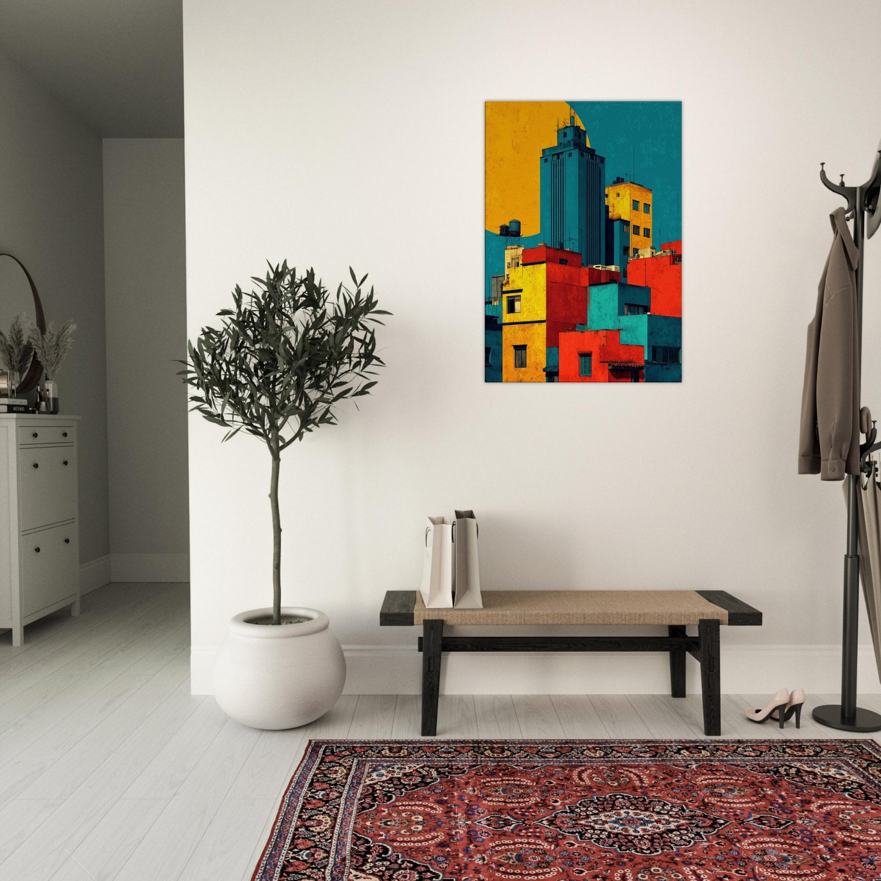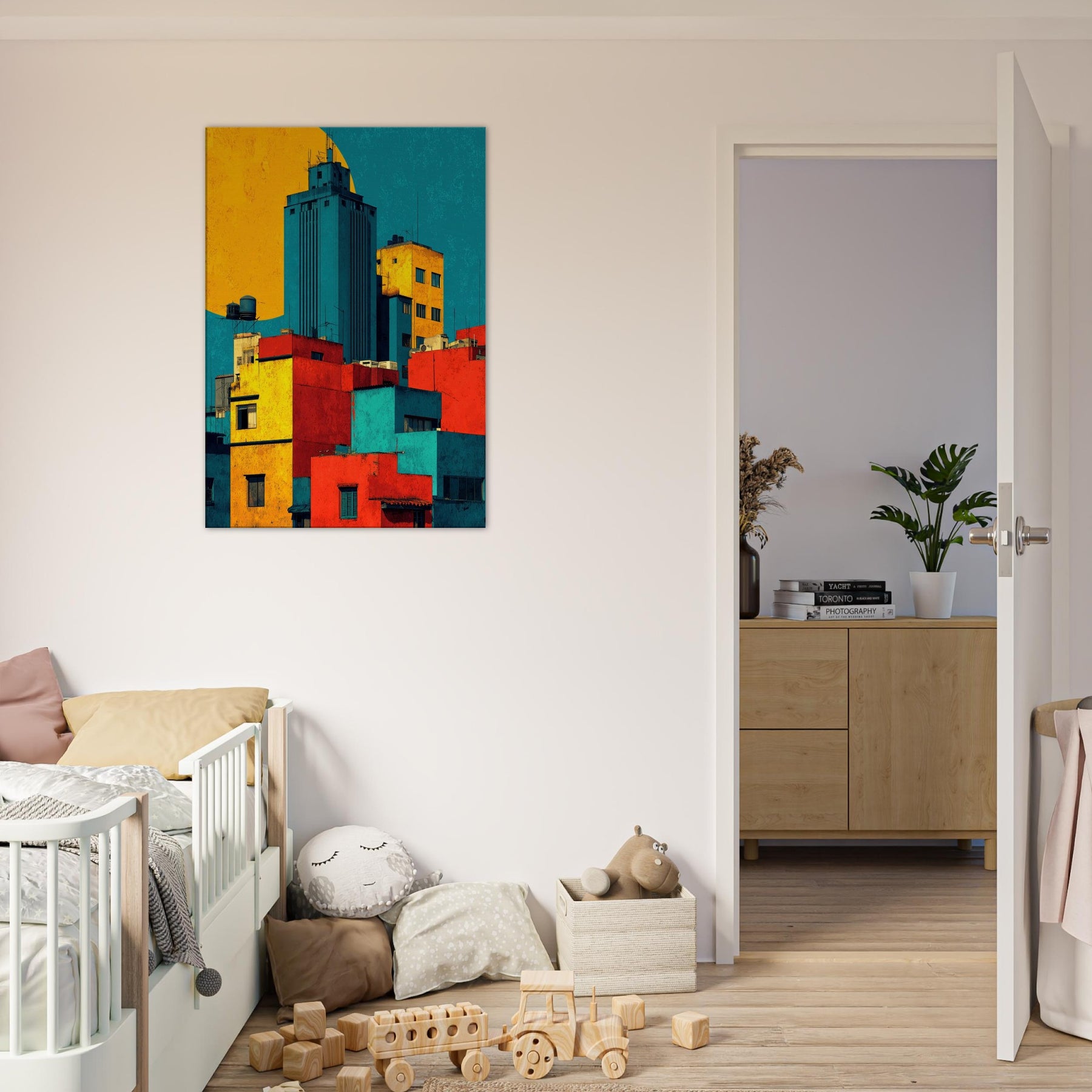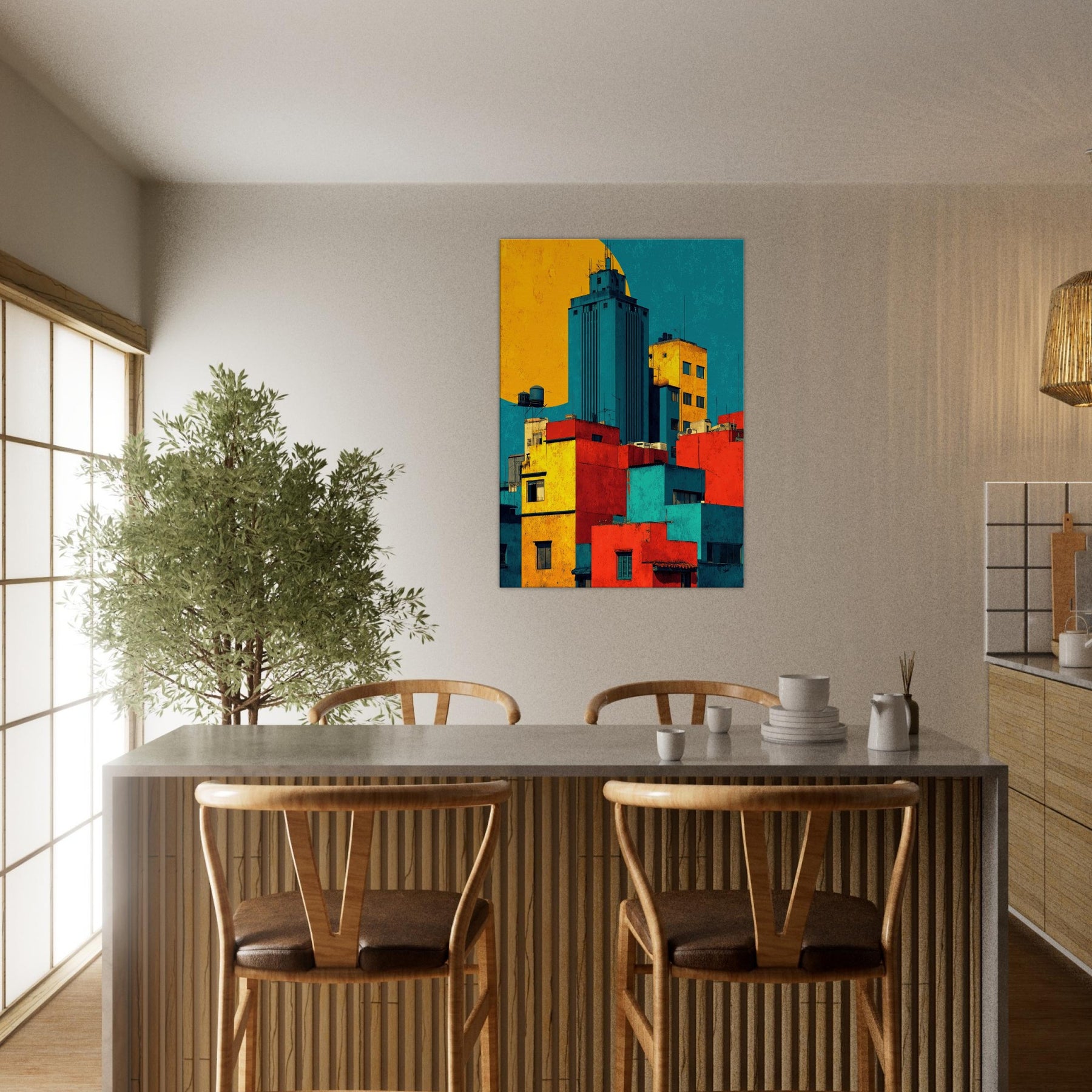 Like a sunlit mosaic, this abstract study of Mexico City rises in bold blocks and radiant shadows. The color field breathes: teal skies, warm ochre sun, and pops of red and yellow that echo street murals and sunlit rooftops. The composition invites a stroll through memory and city sound footsteps on tiled balconies, the hum of markets, the rush of taxis. In your living room, it becomes a window, a pulse, a warm invitation to wander without leaving home.