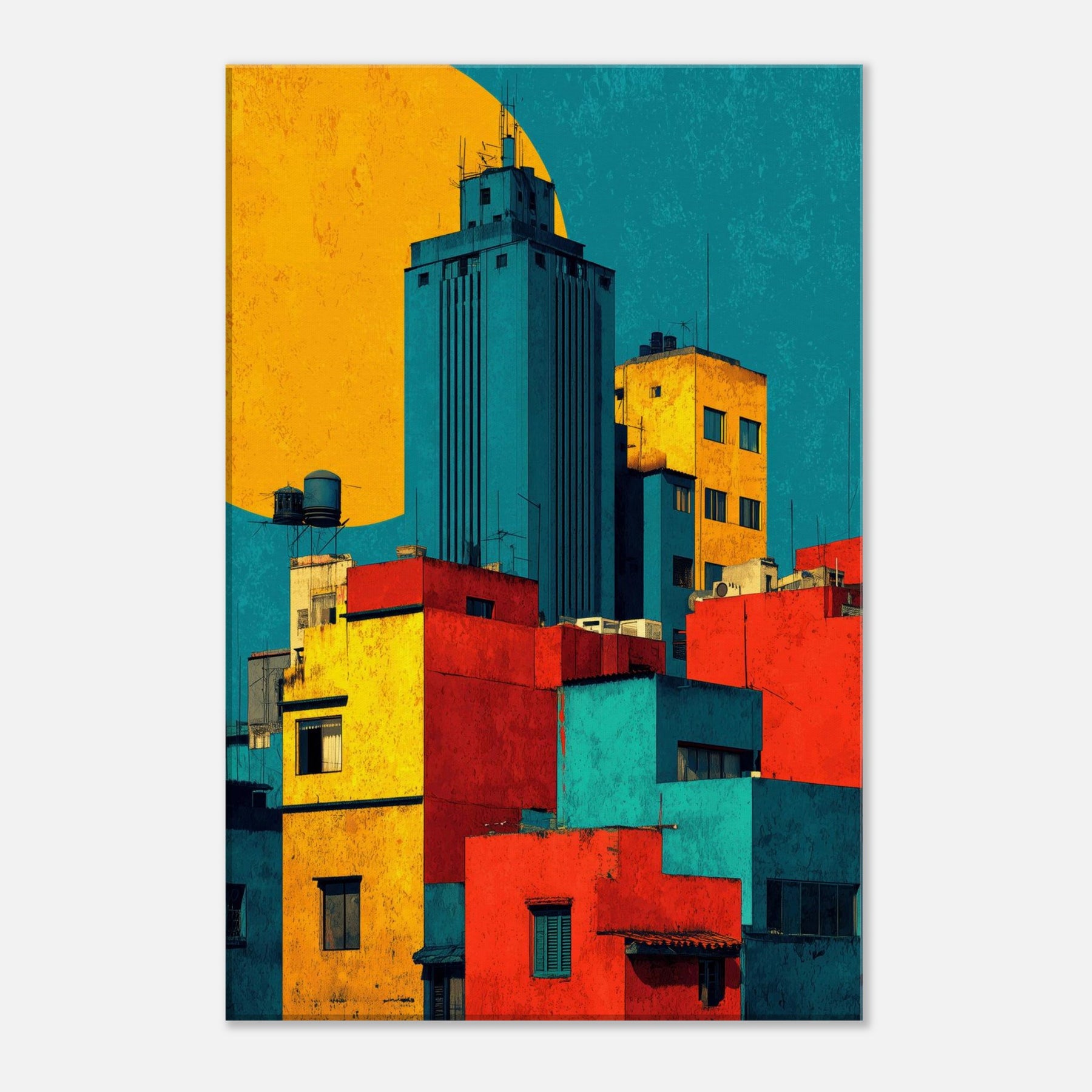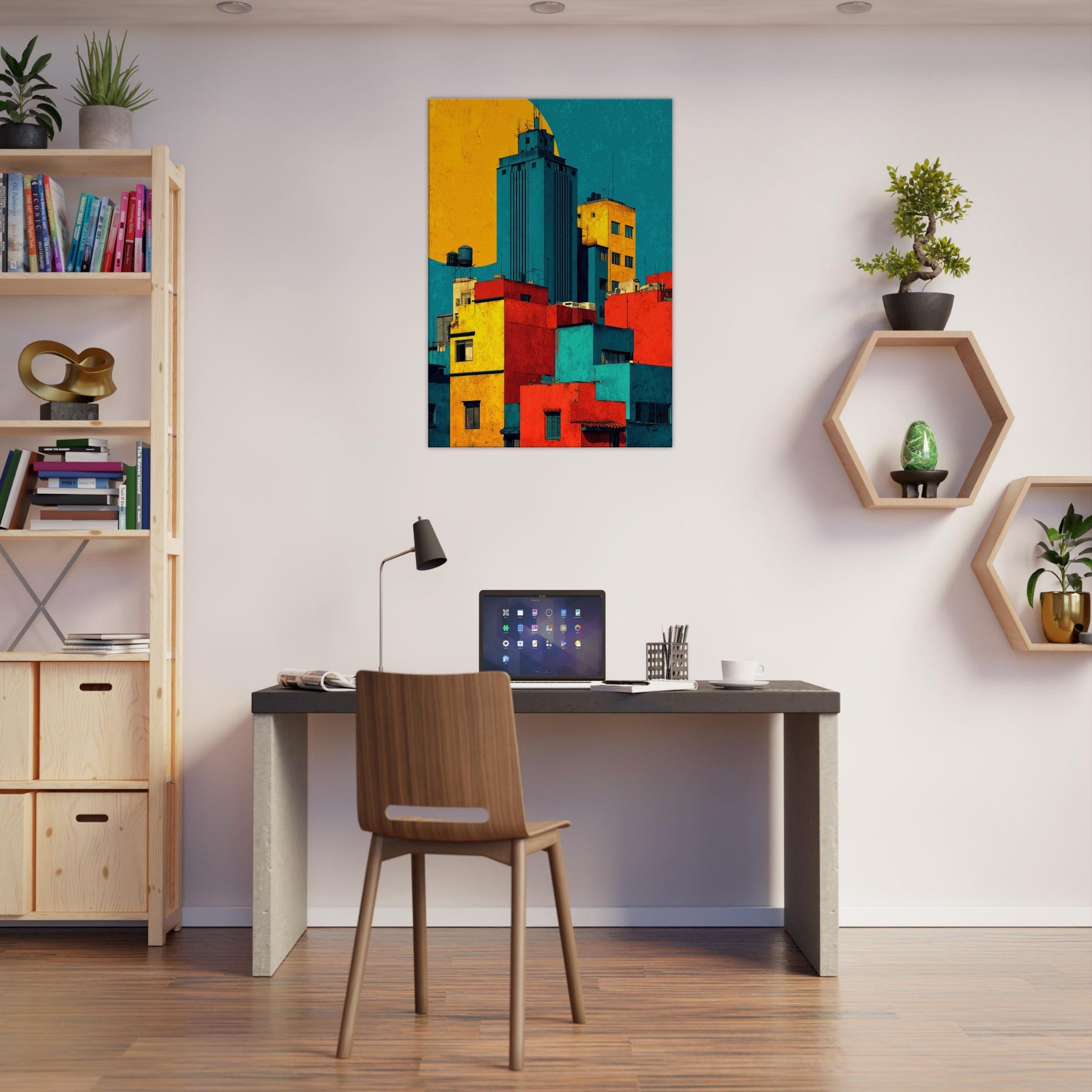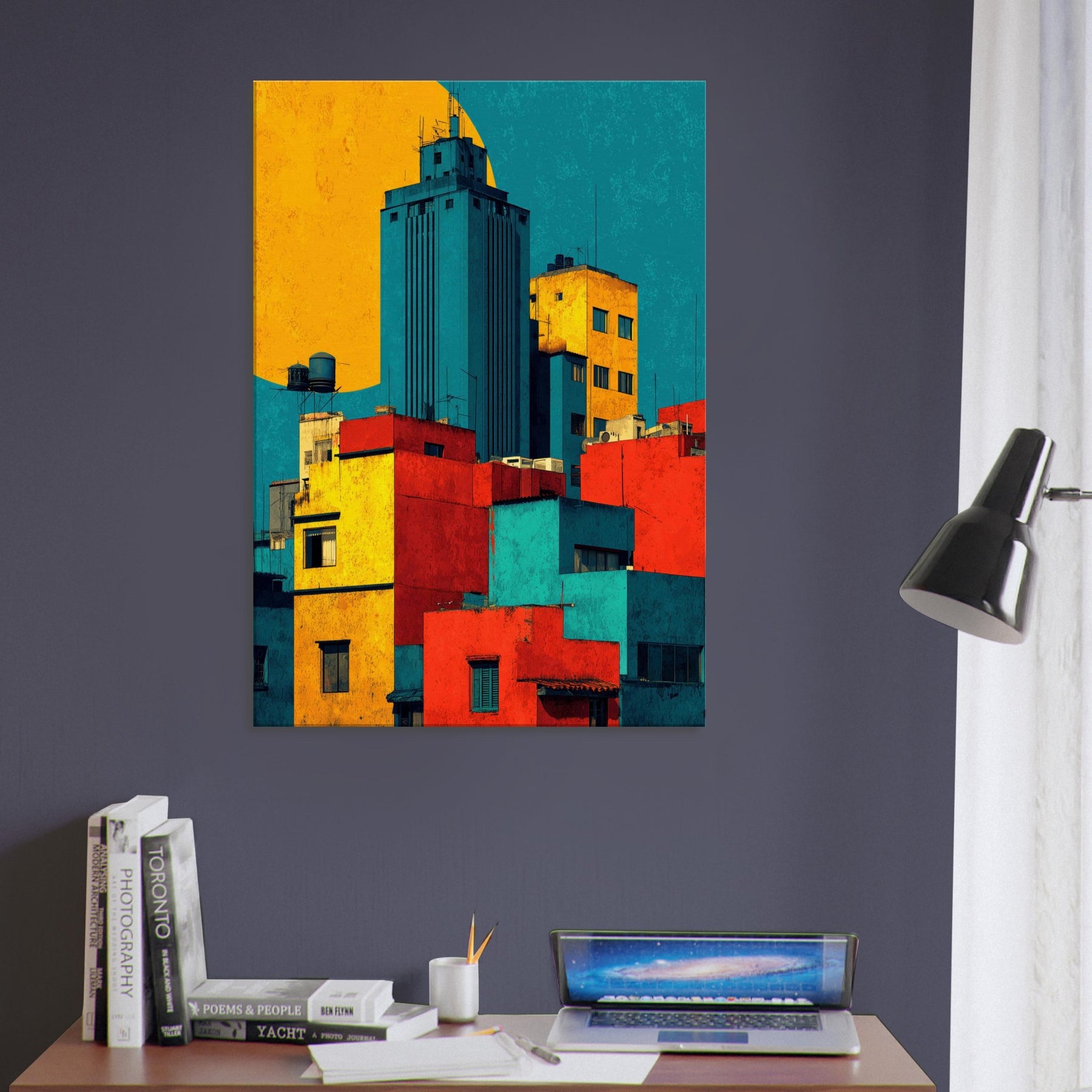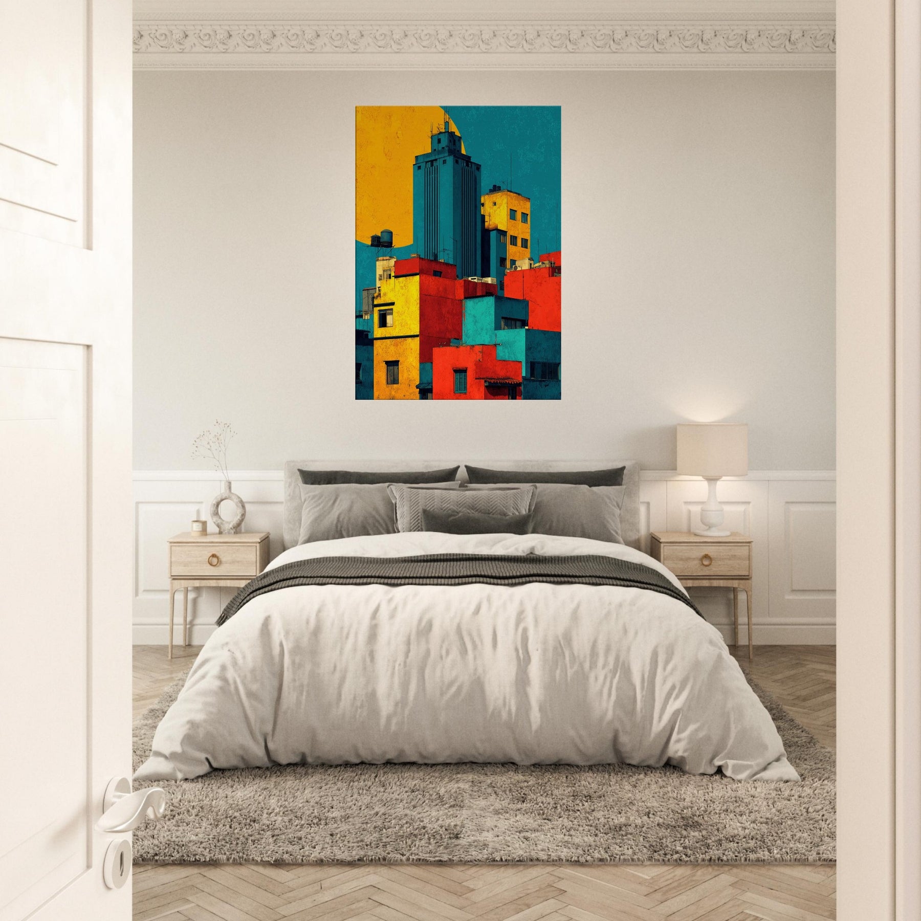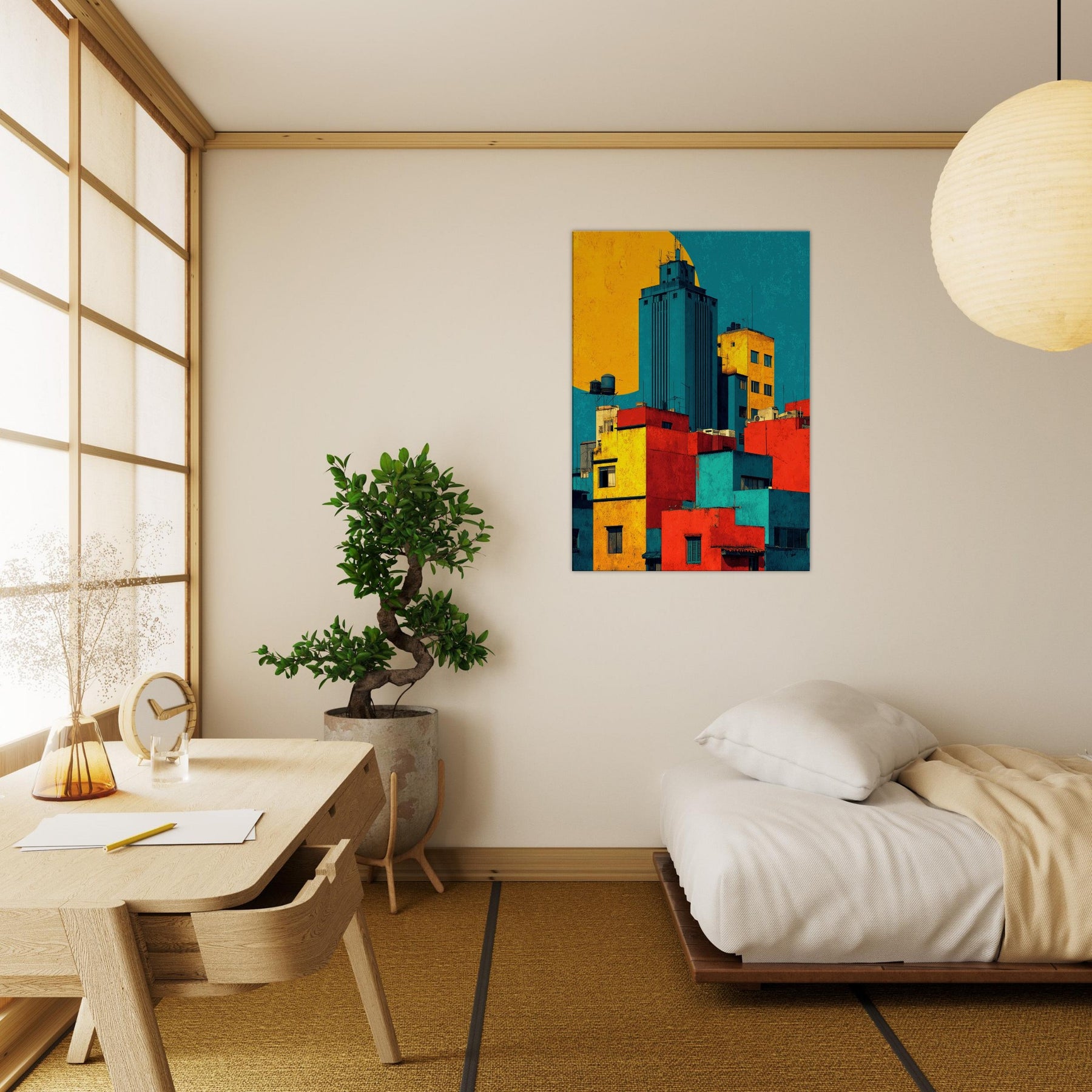 Like a sunlit mosaic, this abstract study of Mexico City rises in bold blocks and radiant shadows. The color field breathes: teal skies, warm ochre sun, and pops of red and yellow that echo street murals and sunlit rooftops. The composition invites a stroll through memory and city sound footsteps on tiled balconies, the hum of markets, the rush of taxis. In your living room, it becomes a window, a pulse, a warm invitation to wander without leaving home.