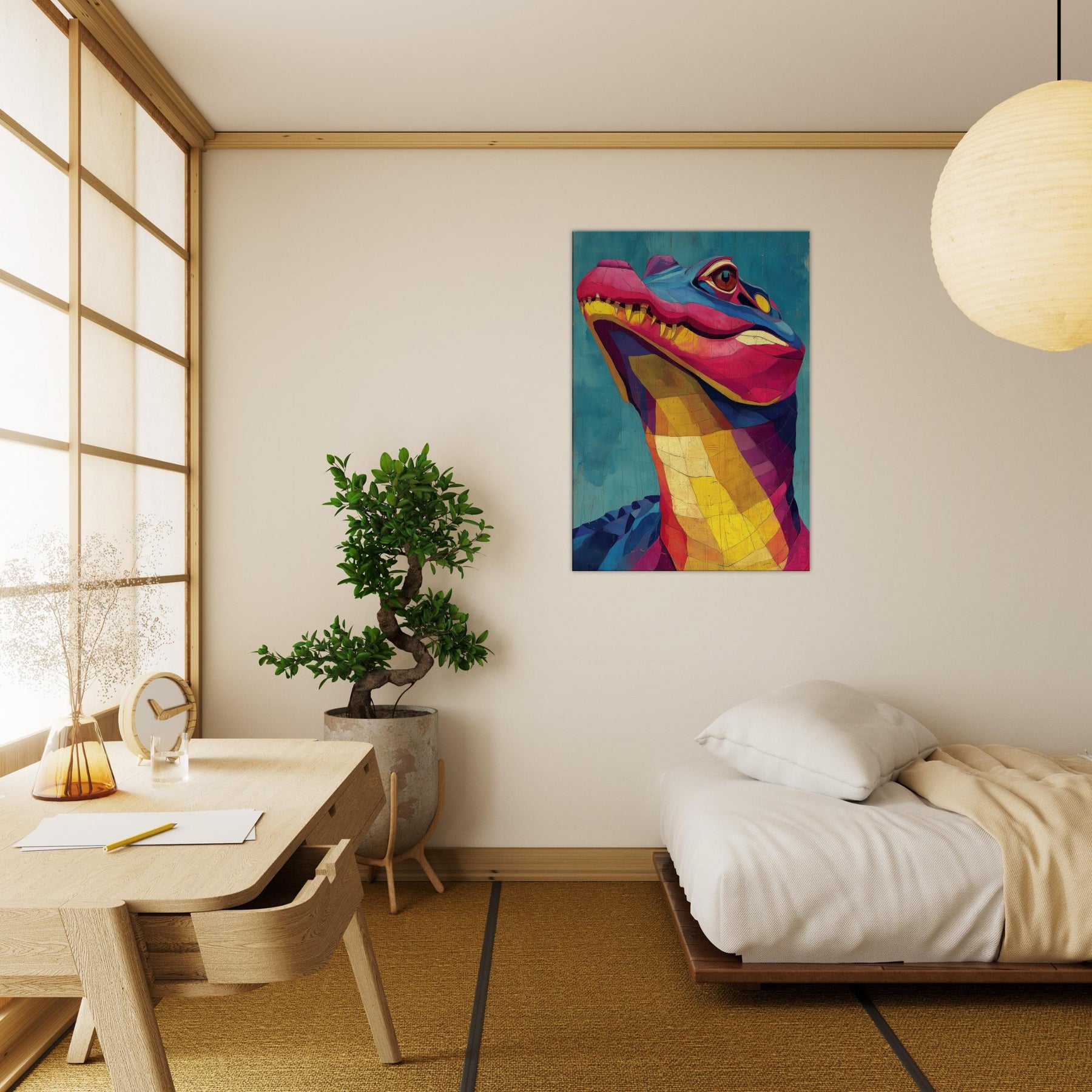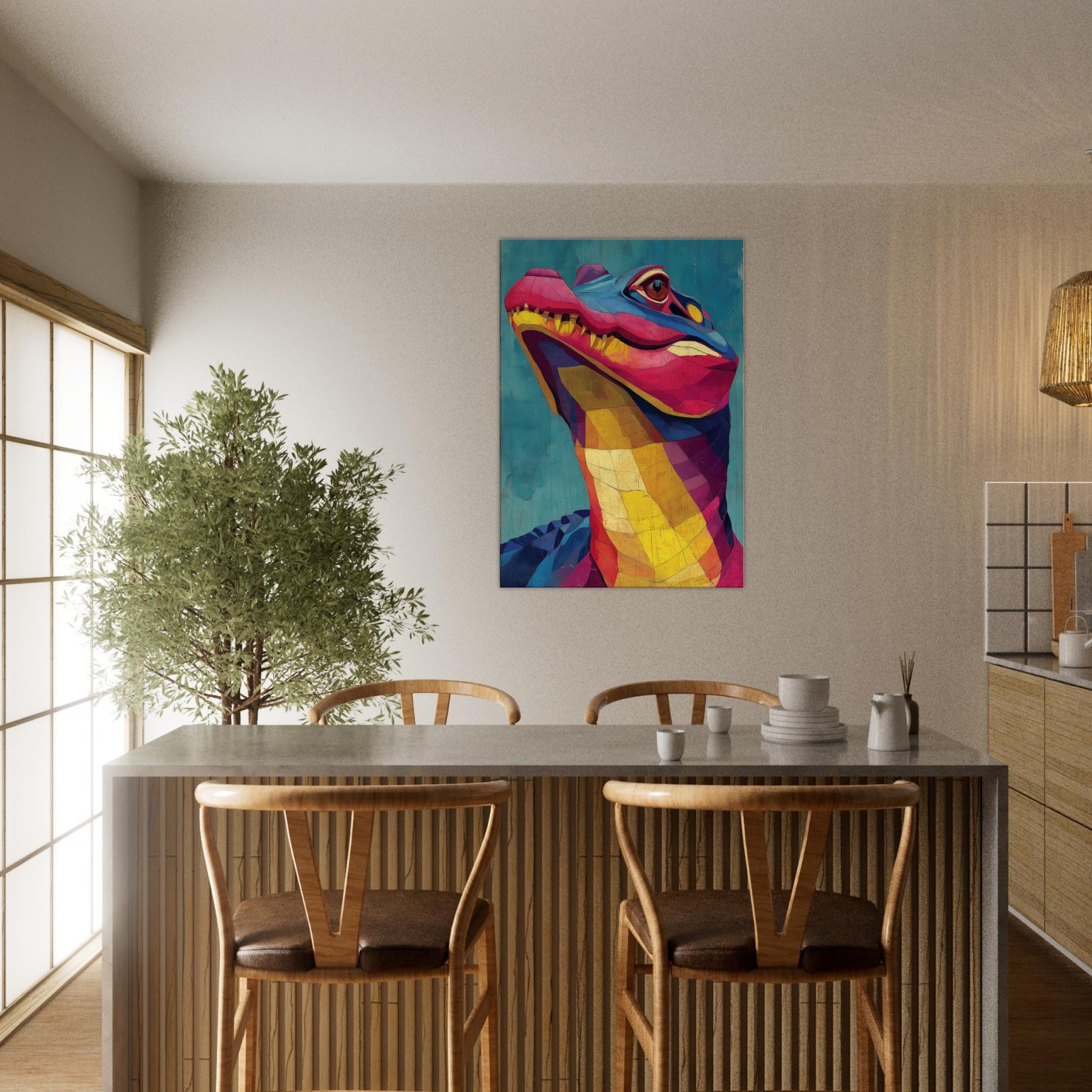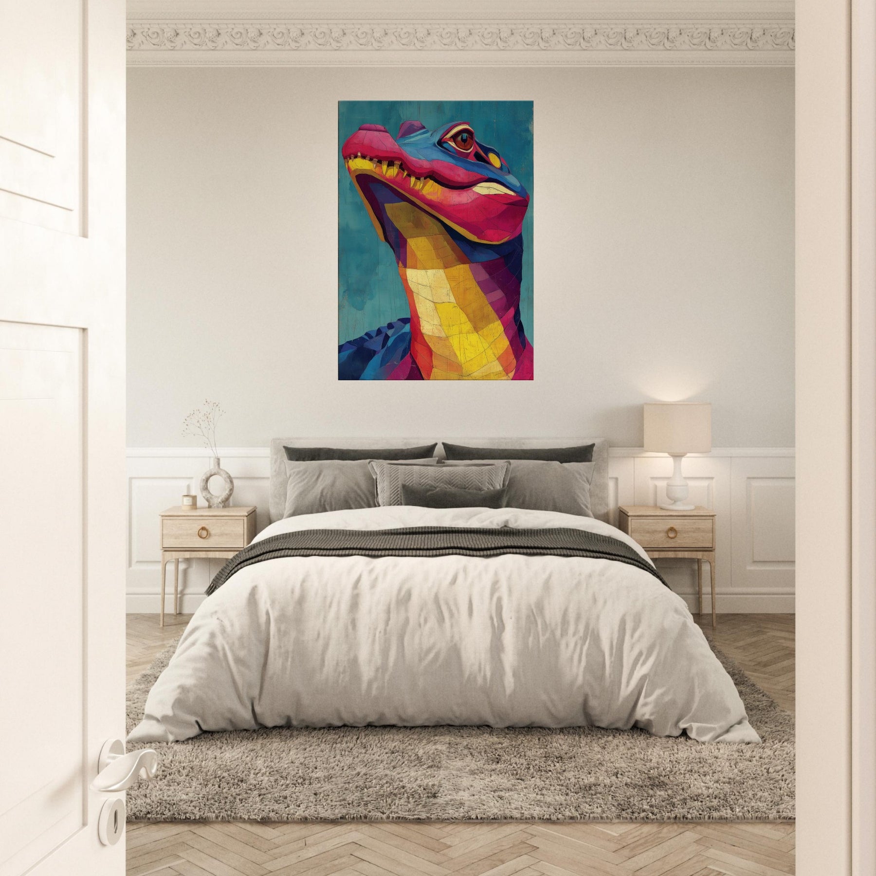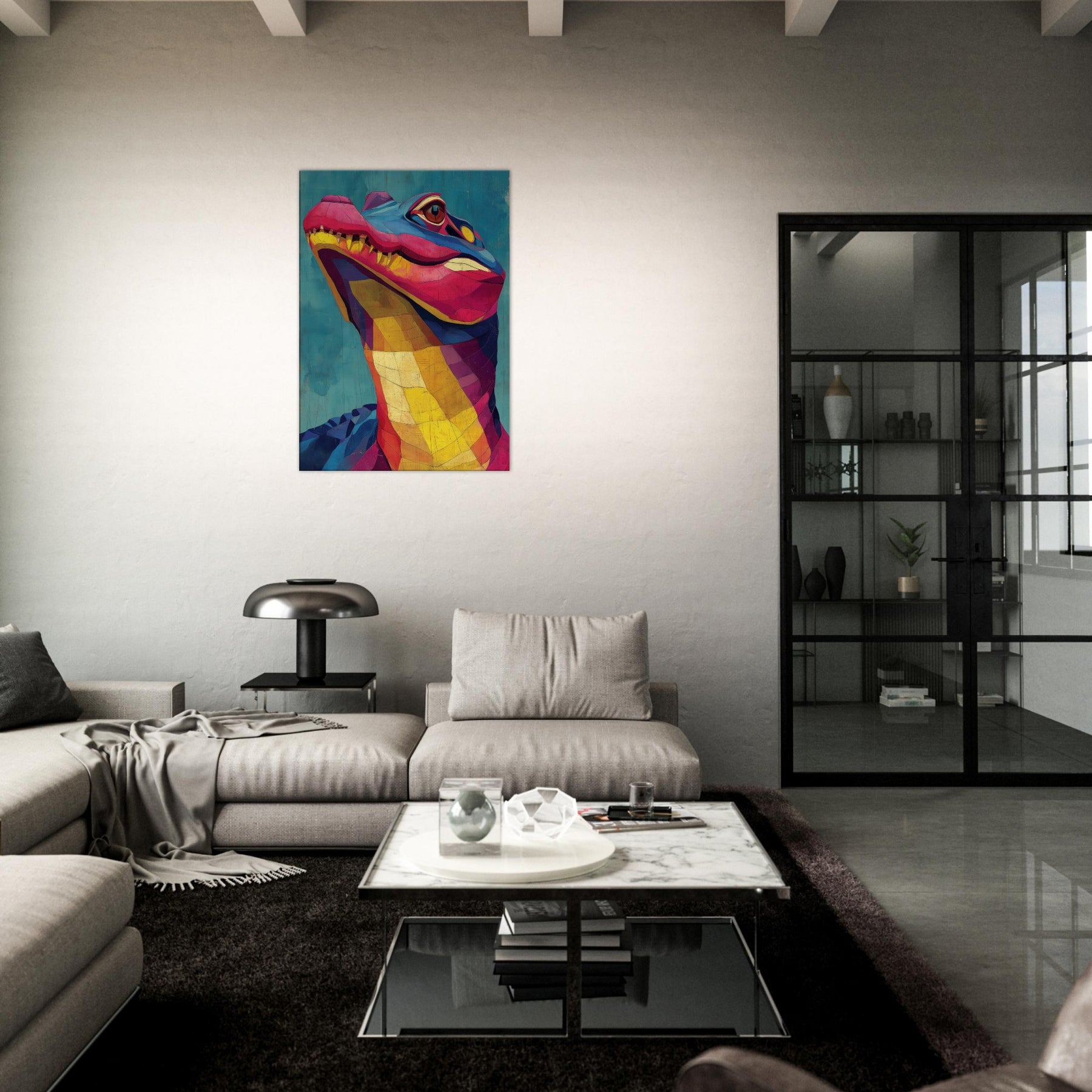 Step close and feel the heat of a wild color storm. This abstract crocodile image unfurls with luminous scales and liquid shapes, turning a primal moment into a modern celebration of light. Its electric pinks, blues, and yellows glow against a deep teal field, inviting reflection and wonder. Placed in a living room or hallway, the piece acts as a conversation spark and a serene focal point, elevating mood, texture, and space with daring elegance.