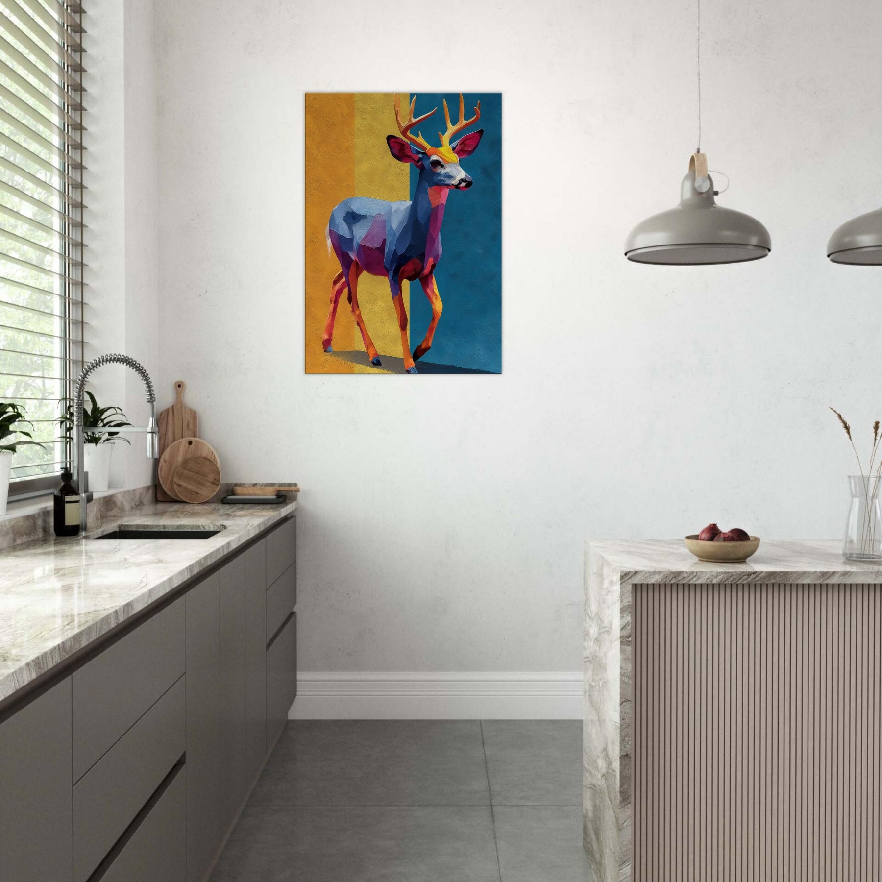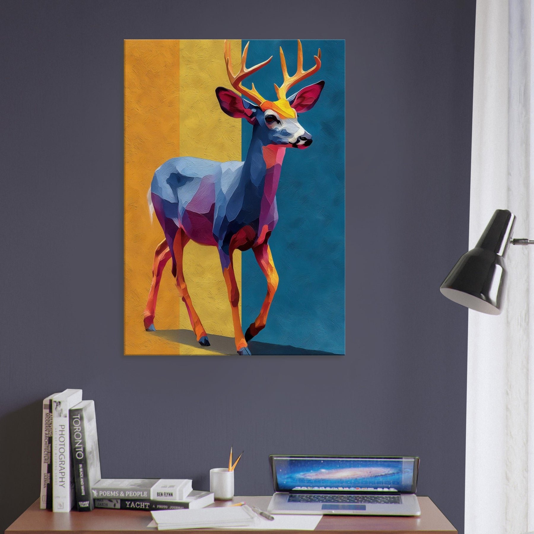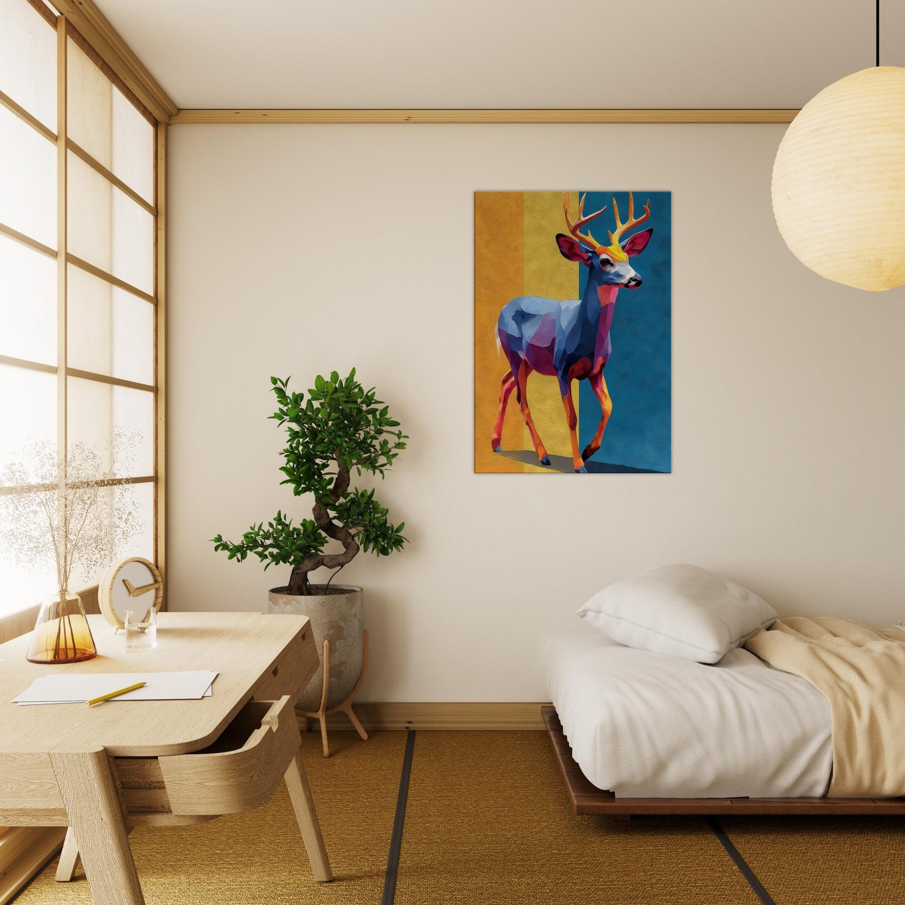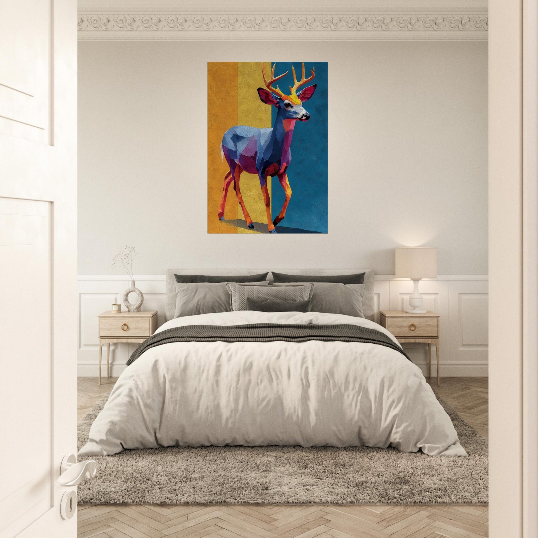 Bright blocks of color and fluid shapes render a Deer in motion, inviting light to play across walls. This abstract study of form and color creates a tranquil, cinematic mood golden yellows, cobalt blues, and rose hues mingle like a sunset over a quiet meadow. The Deer stands poised between memory and imagination, a graceful beacon in any room. Hang it where daylight greets the canvas, and watch the space soften, as if the forest has stepped inside.