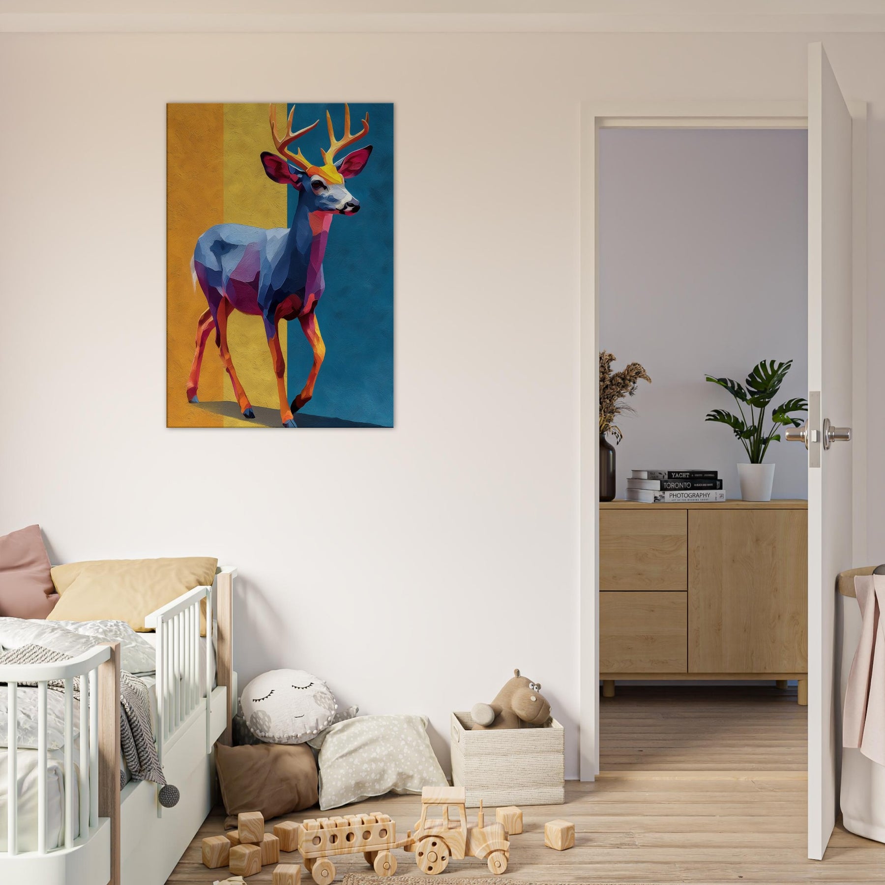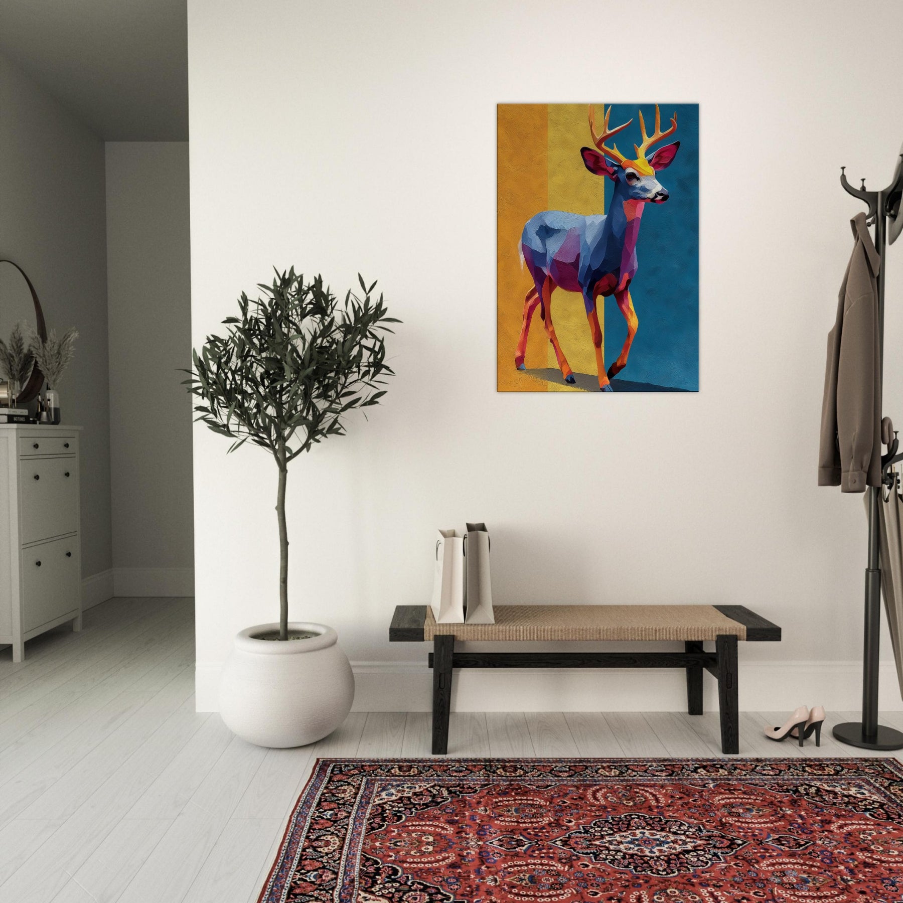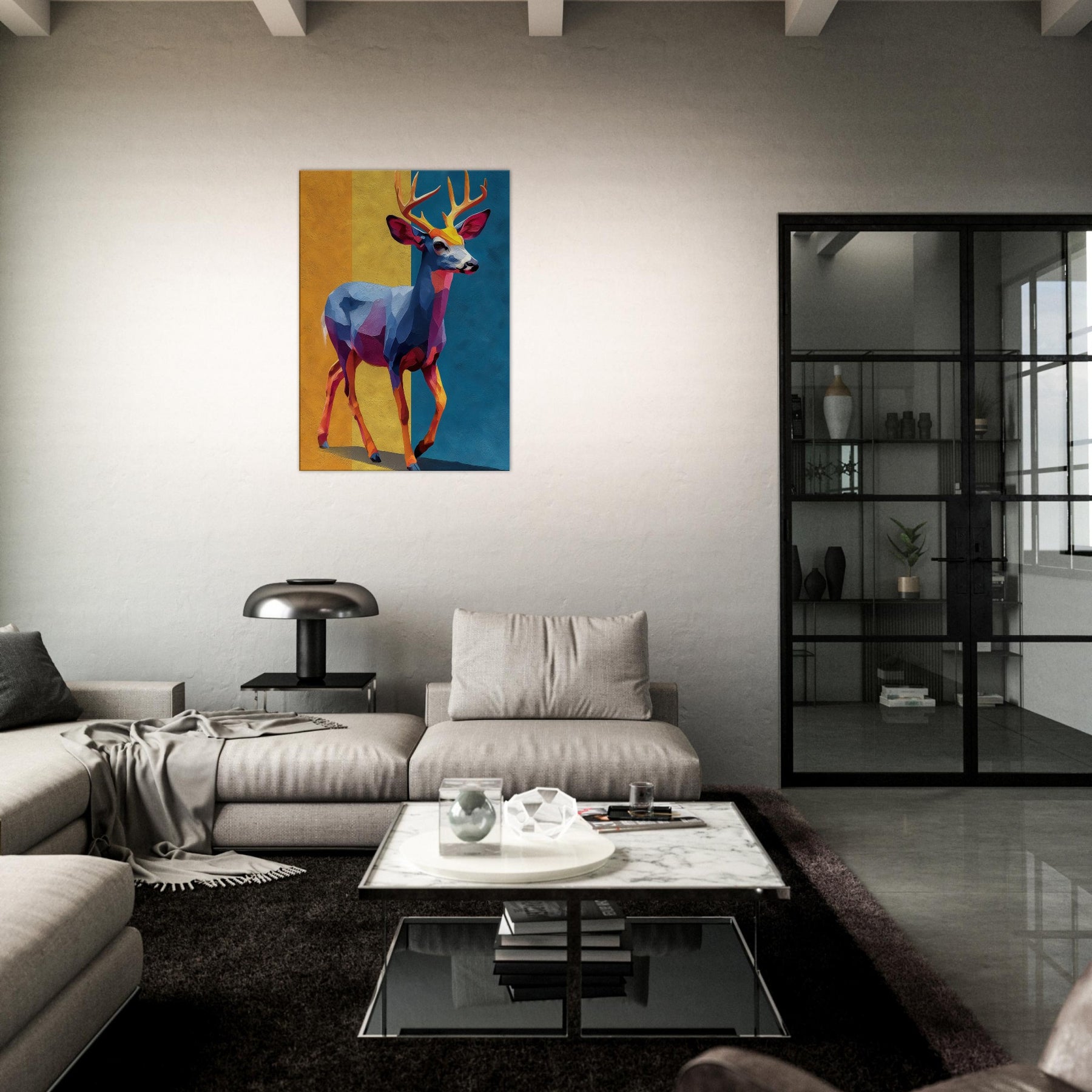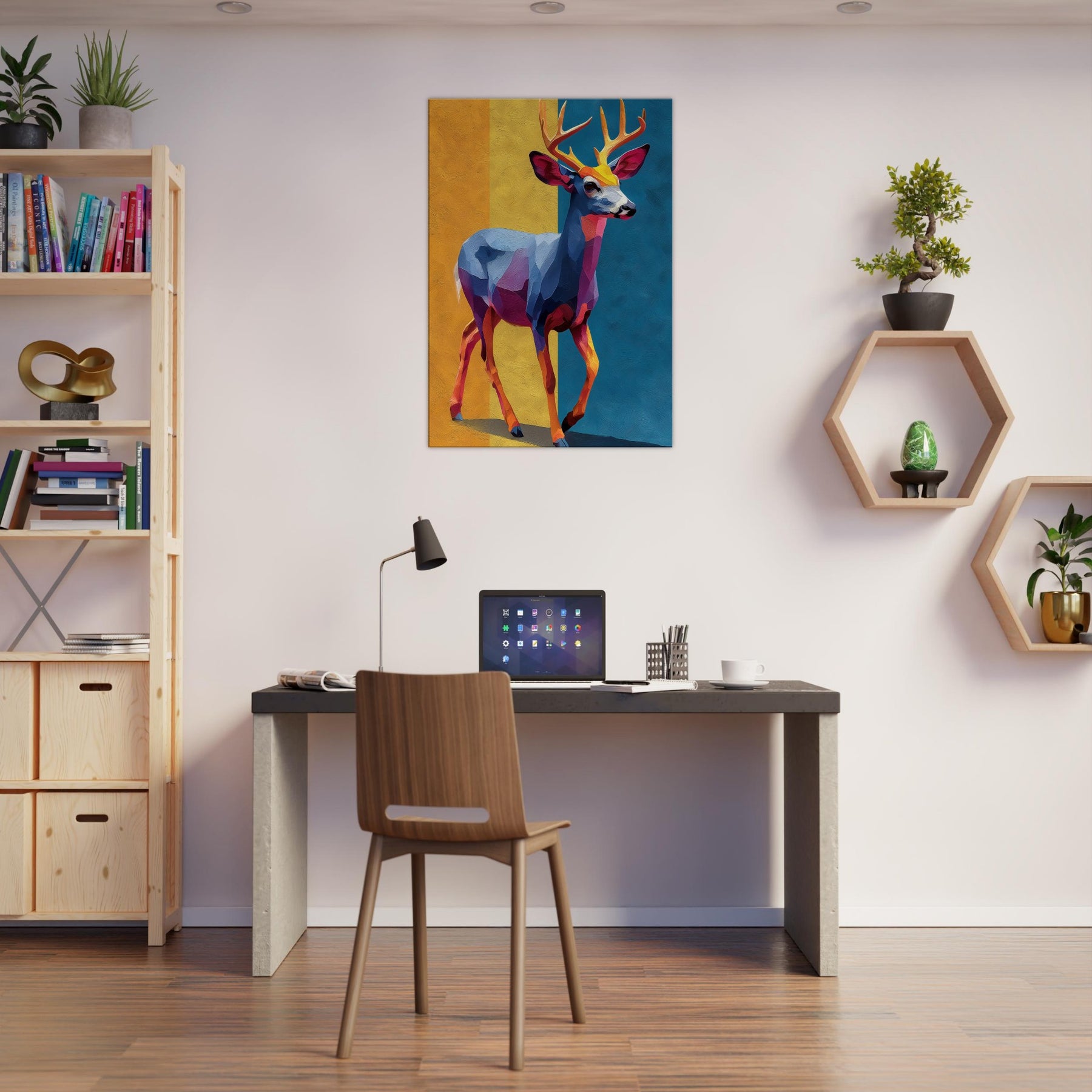 Bright blocks of color and fluid shapes render a Deer in motion, inviting light to play across walls. This abstract study of form and color creates a tranquil, cinematic mood golden yellows, cobalt blues, and rose hues mingle like a sunset over a quiet meadow. The Deer stands poised between memory and imagination, a graceful beacon in any room. Hang it where daylight greets the canvas, and watch the space soften, as if the forest has stepped inside.