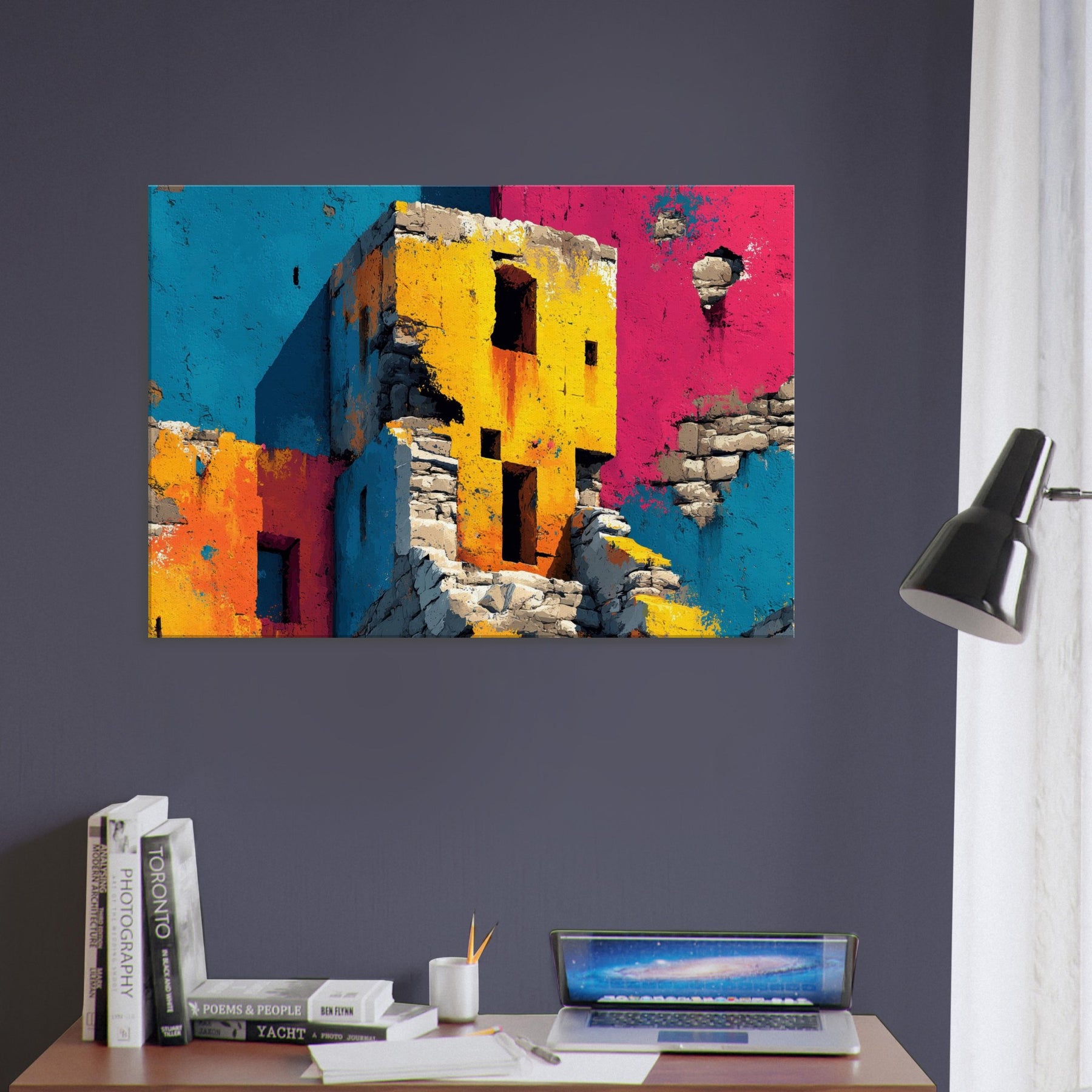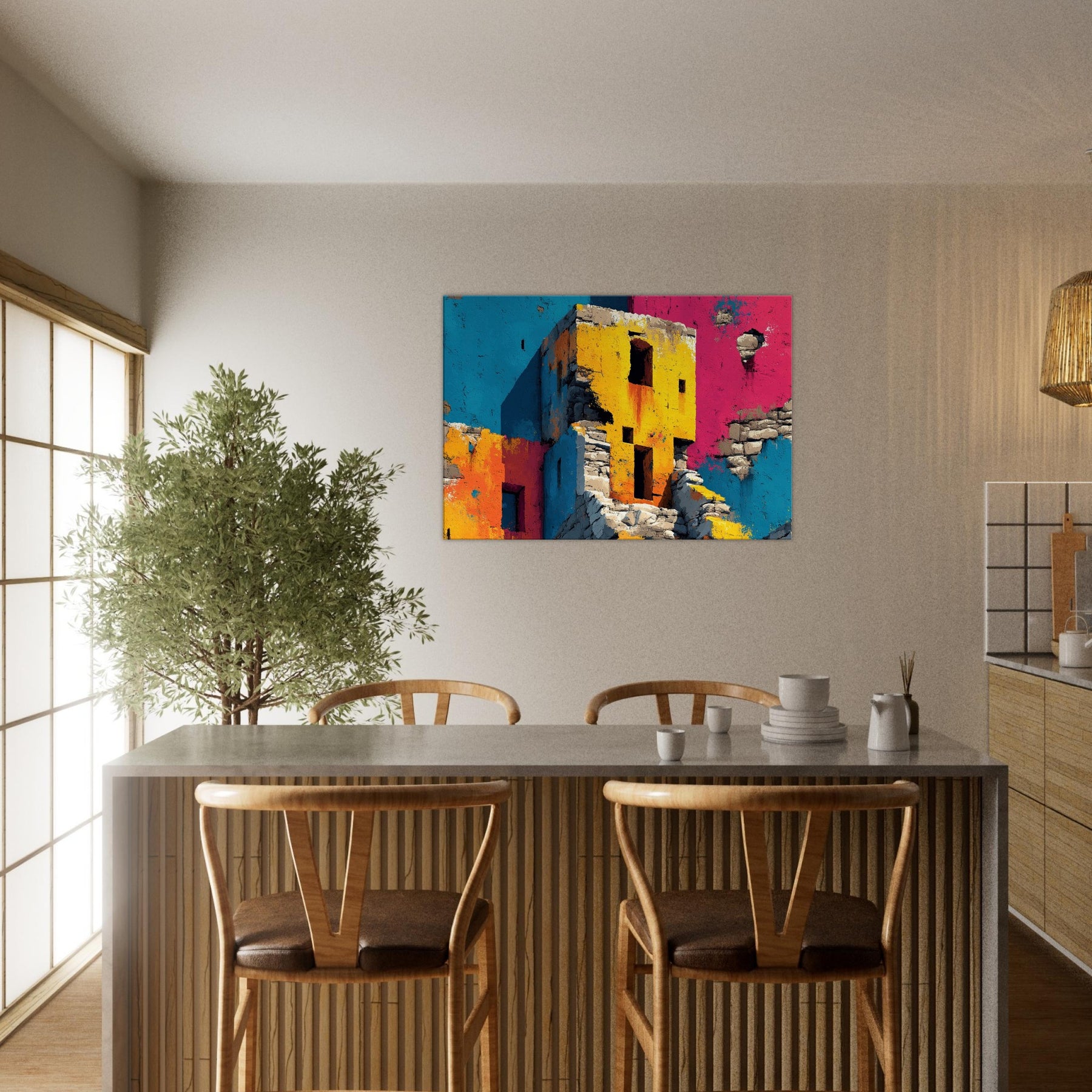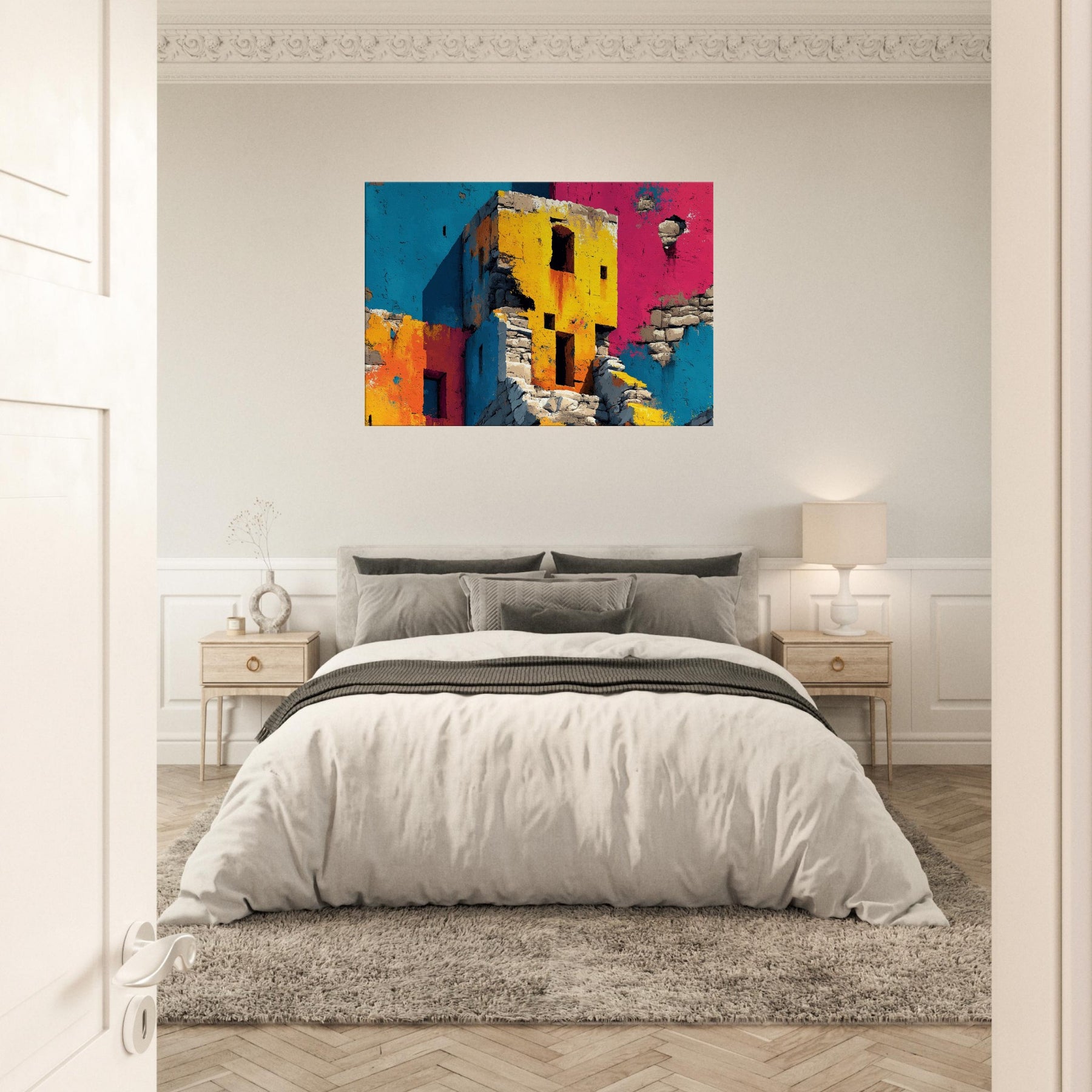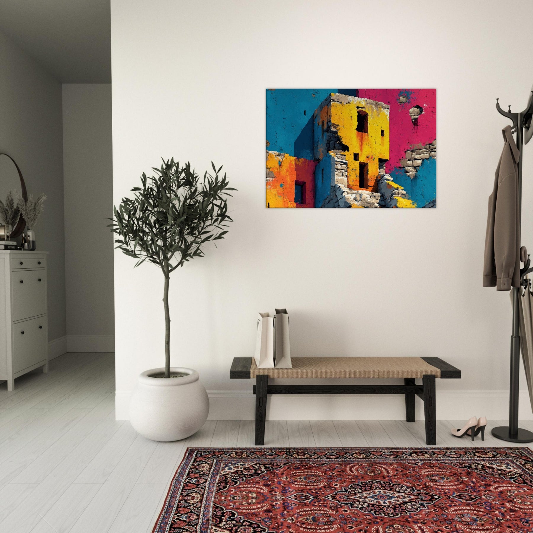 Fortress of color rises from the wall in a riot of hues azure, sunlit yellow, and saturated pink. This abstract composition evokes a fortified cityscape, where crumbling stone meets luminous paint and light streams through imagined arches. The fortress becomes a mood, inviting contemplation and curiosity, while tactile textures and layered blocks echo the rhythmic hum of urban life. Hang it to enrich a living space with warmth, drama, and a sense of architectural wonder.