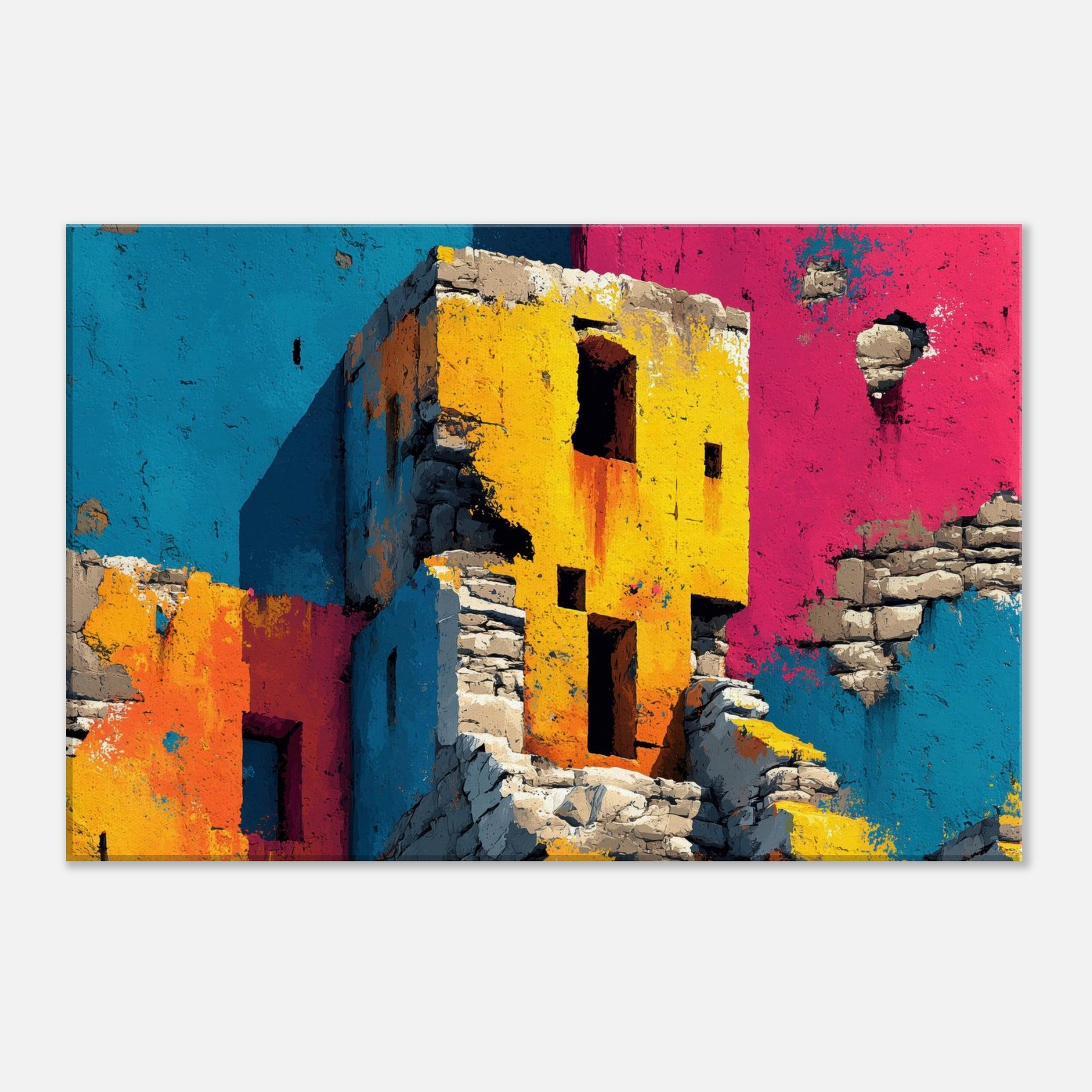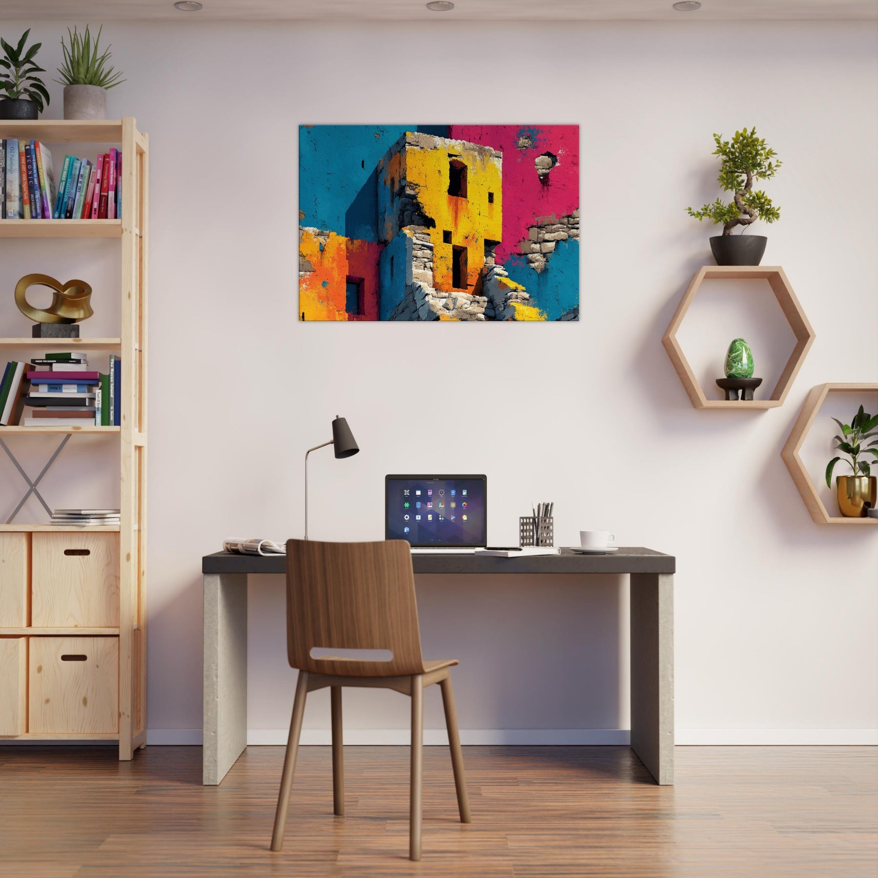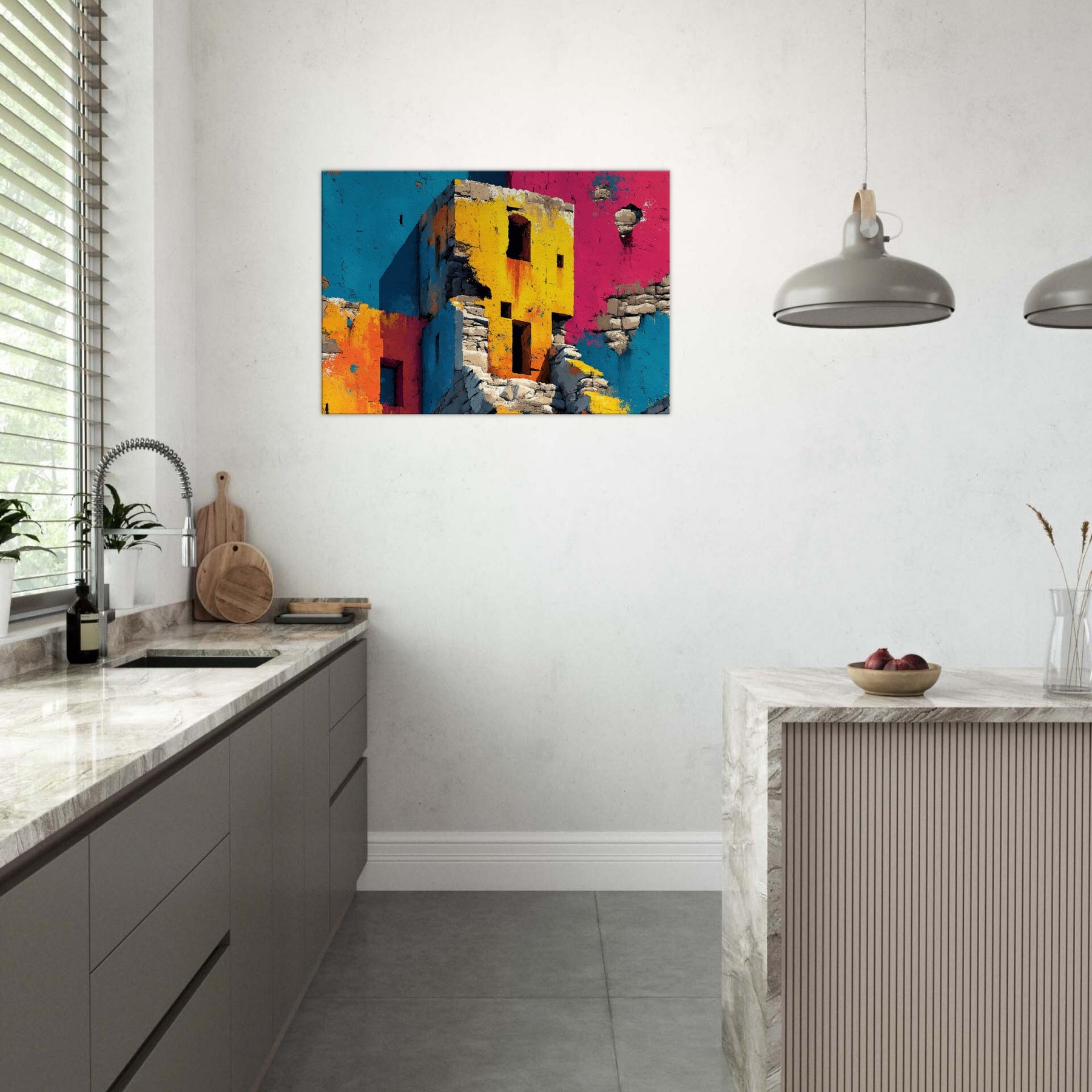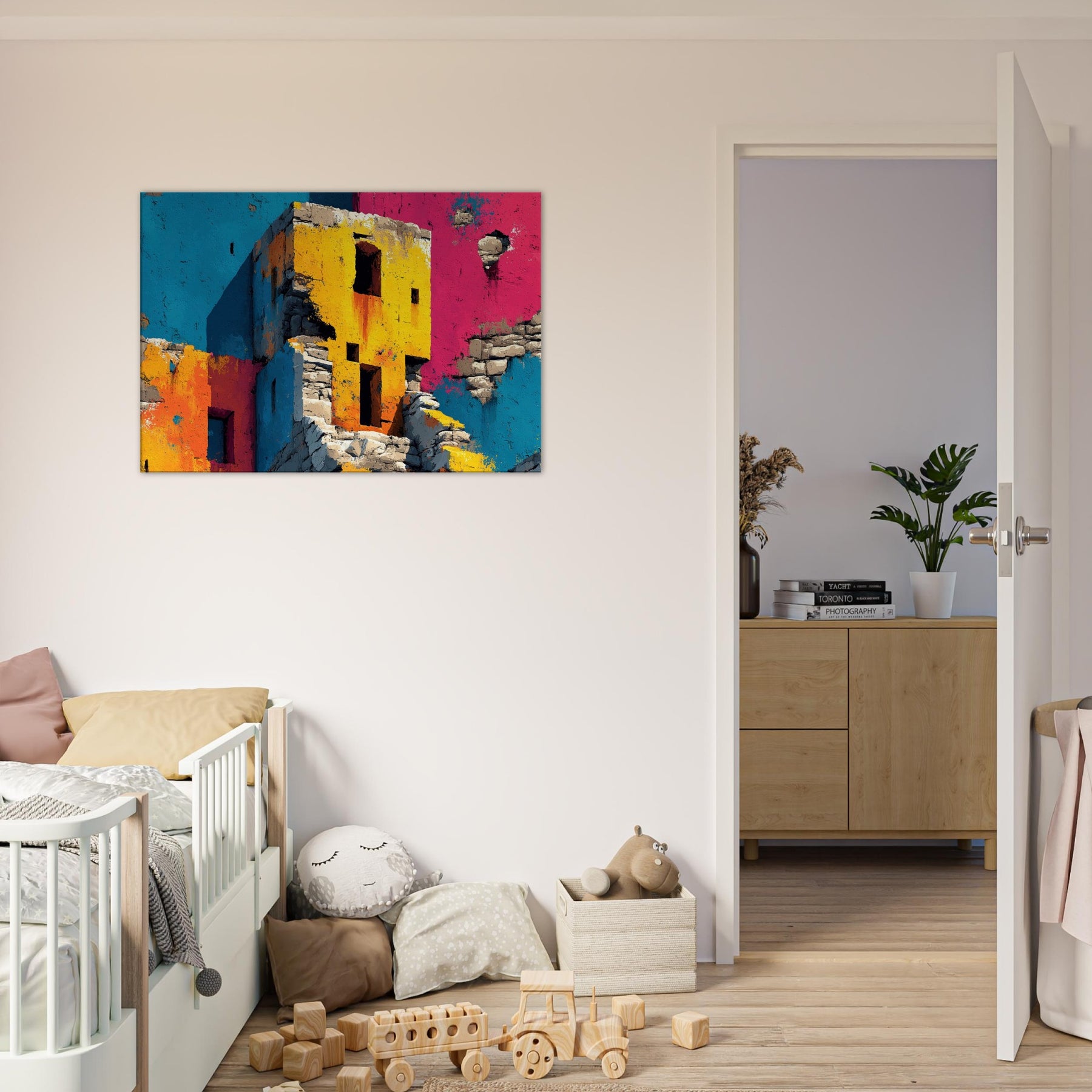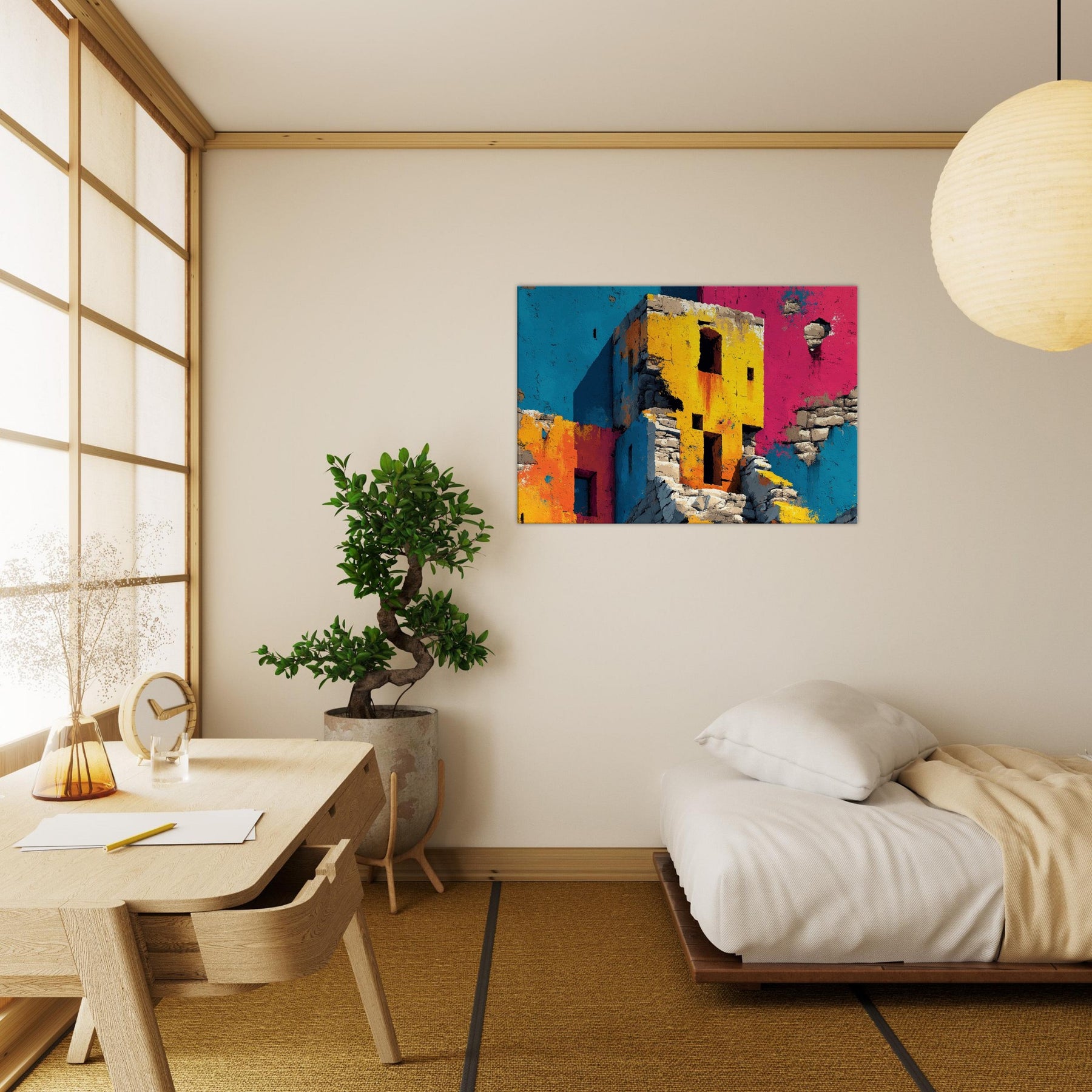 Fortress of color rises from the wall in a riot of hues azure, sunlit yellow, and saturated pink. This abstract composition evokes a fortified cityscape, where crumbling stone meets luminous paint and light streams through imagined arches. The fortress becomes a mood, inviting contemplation and curiosity, while tactile textures and layered blocks echo the rhythmic hum of urban life. Hang it to enrich a living space with warmth, drama, and a sense of architectural wonder.
