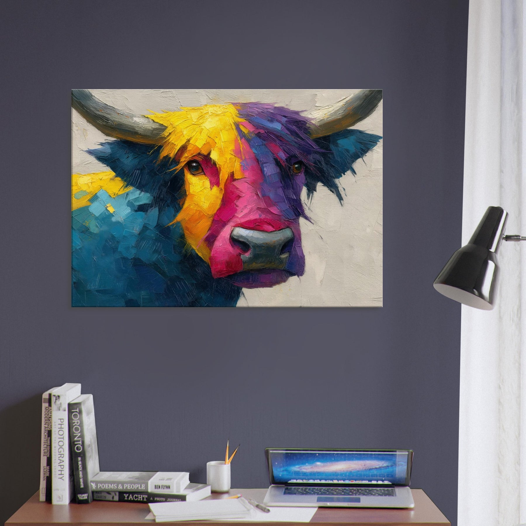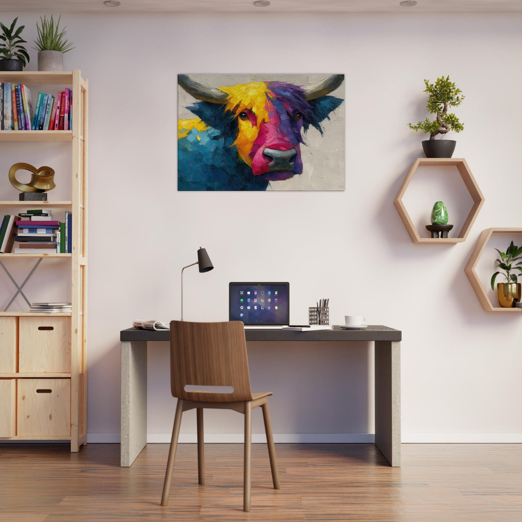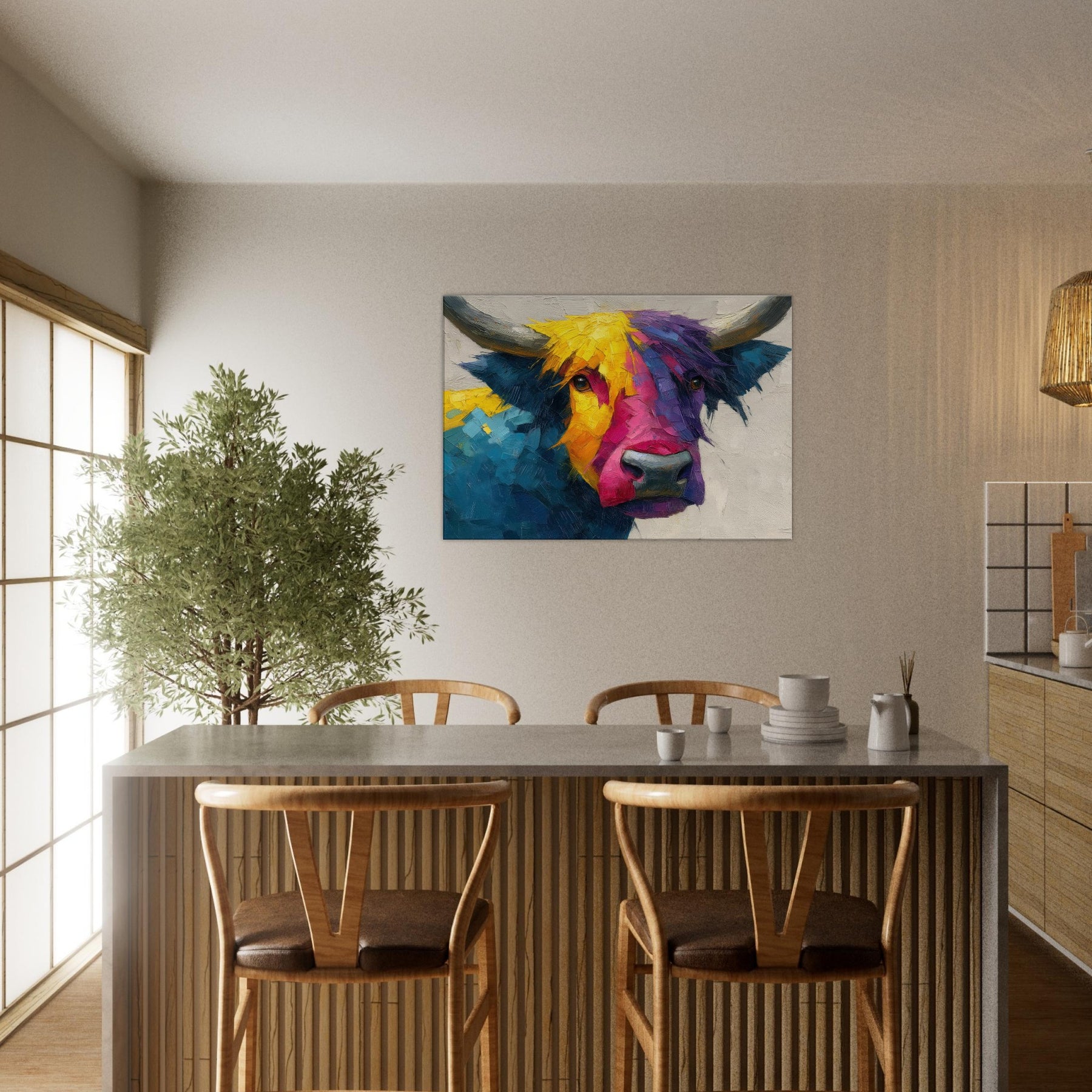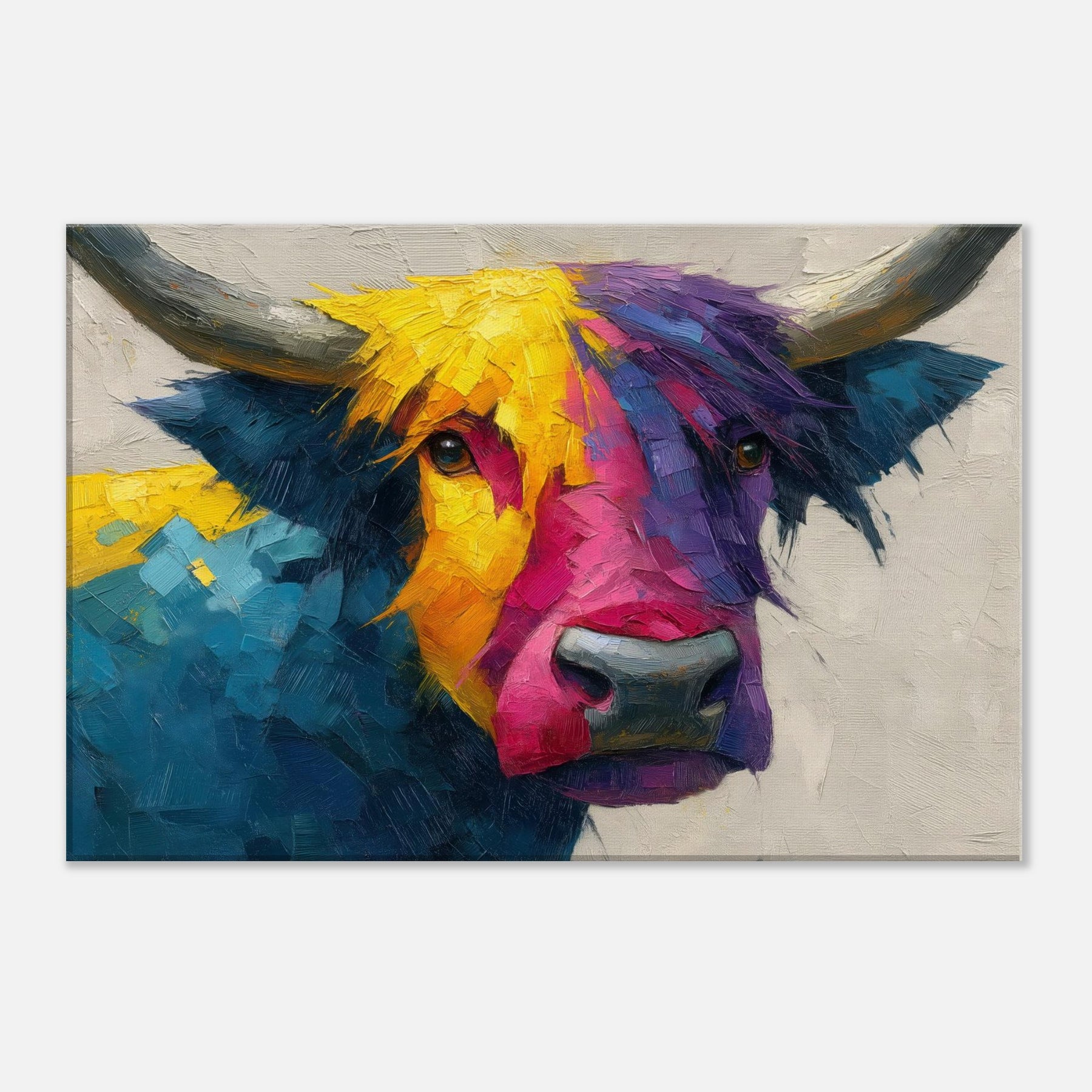 Within this bold Highland Cow unfolds a living poem of color and motion. The abstract brushwork fractures the animal into luminous facets, inviting the eye to wander along sunlit yellows, electric pinks, and deep ultramarine blues. The result is a warm, sweeping presence that feels both playful and serene, making any room glow with atmosphere. Hang it above a sofa or in a dining nook to frame conversations with texture, character, and a gentle rural spirit.