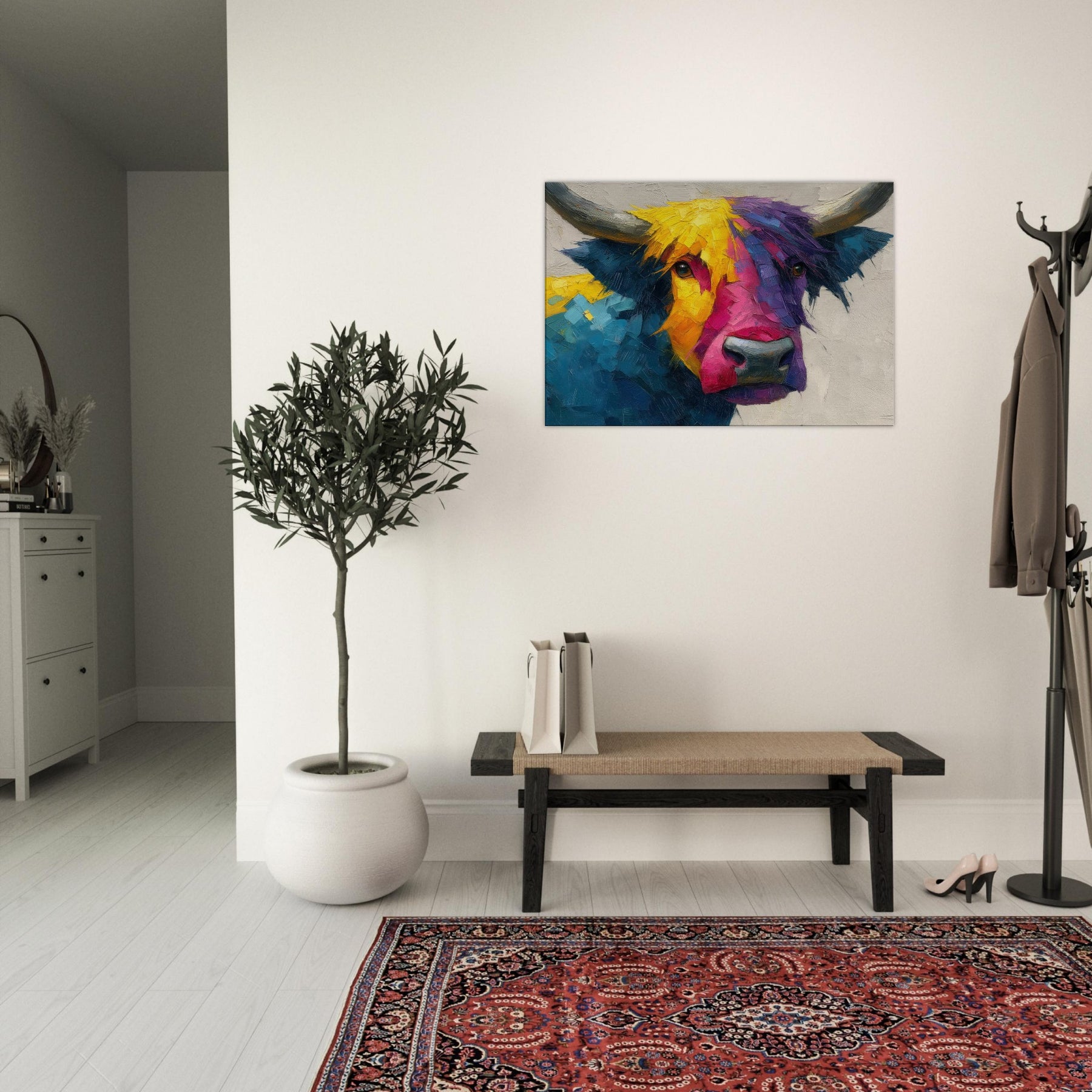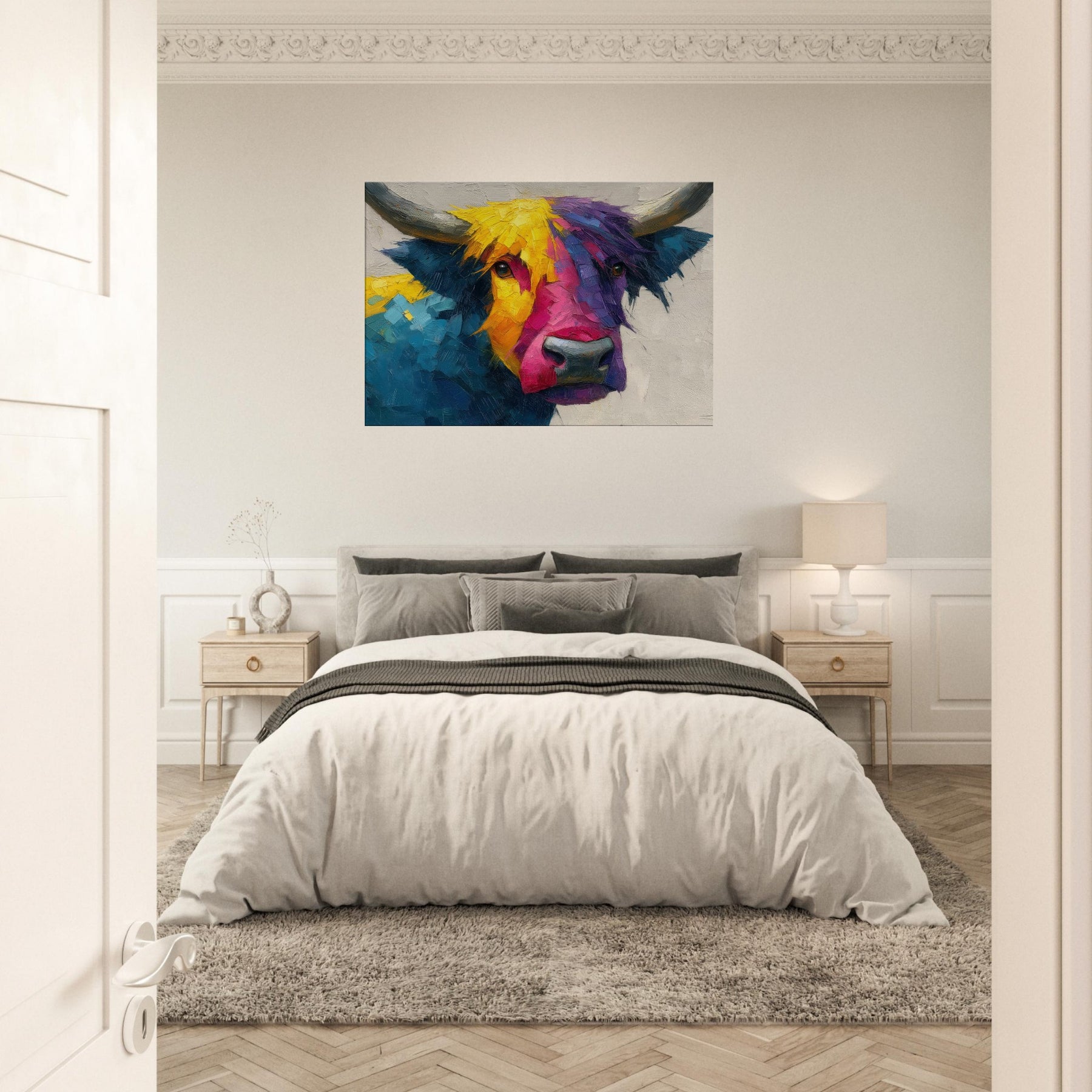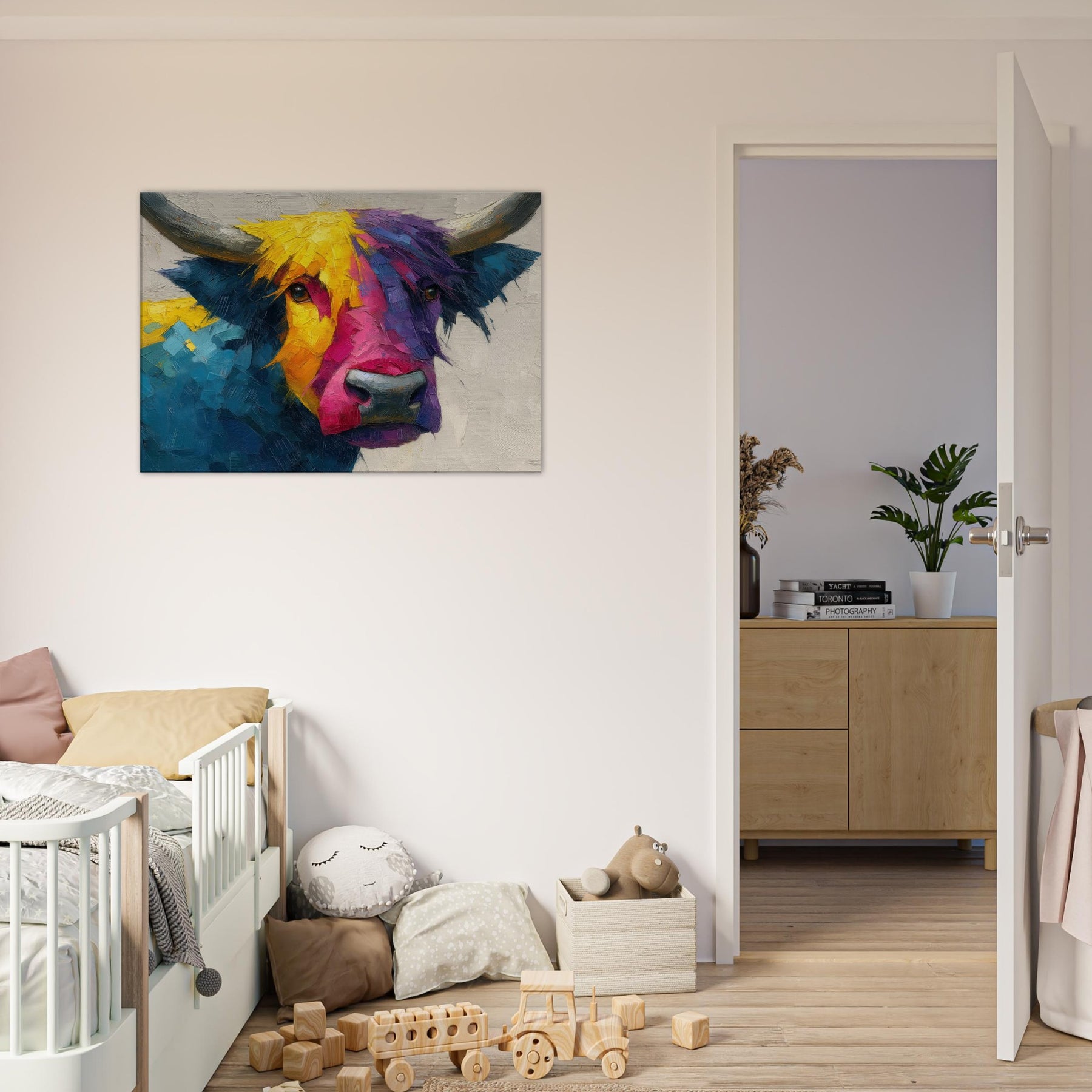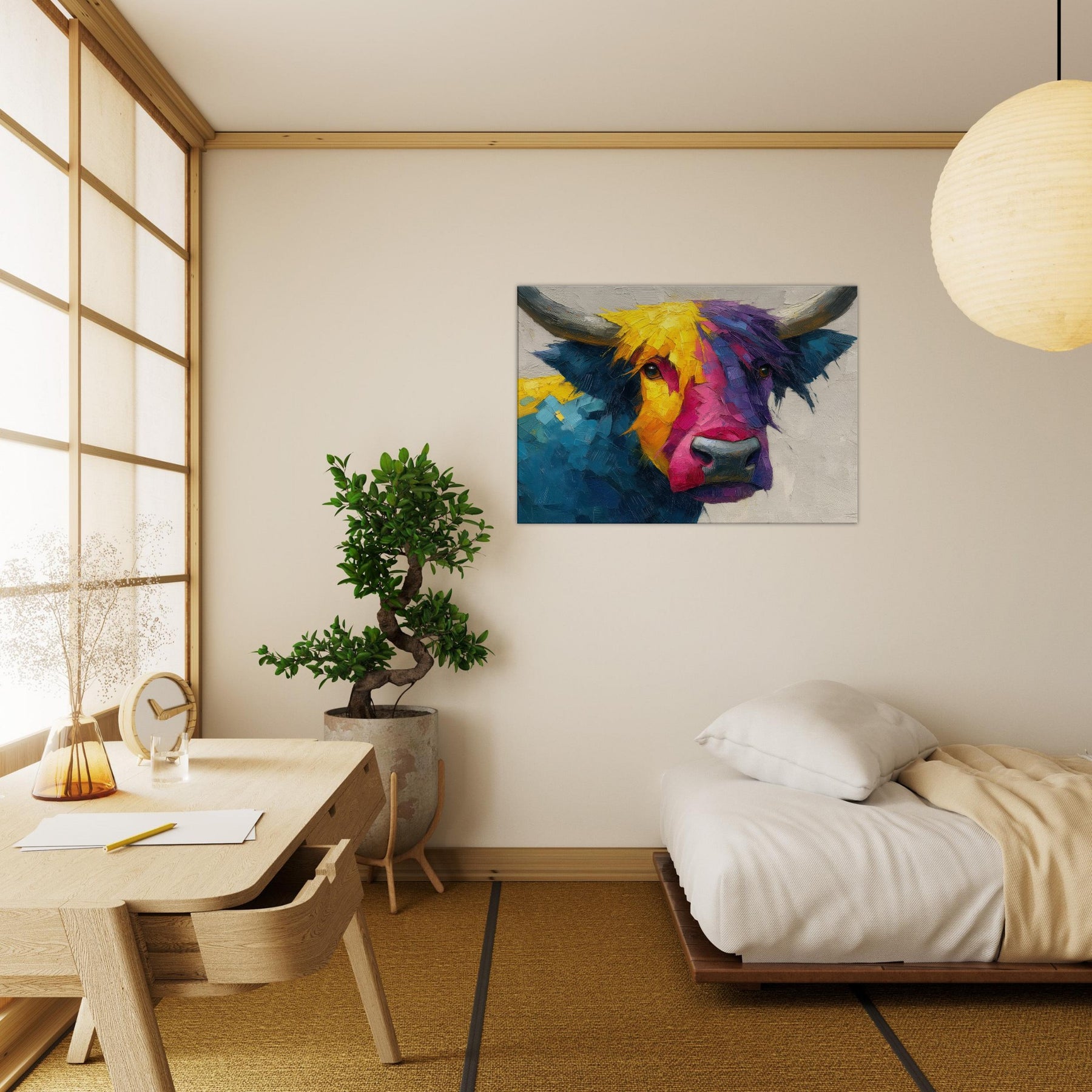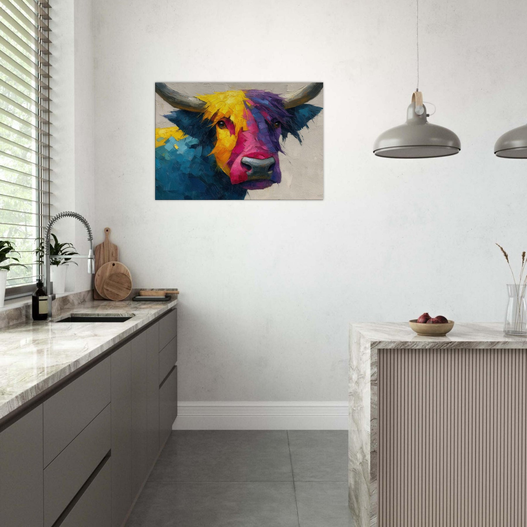 Within this bold Highland Cow unfolds a living poem of color and motion. The abstract brushwork fractures the animal into luminous facets, inviting the eye to wander along sunlit yellows, electric pinks, and deep ultramarine blues. The result is a warm, sweeping presence that feels both playful and serene, making any room glow with atmosphere. Hang it above a sofa or in a dining nook to frame conversations with texture, character, and a gentle rural spirit.
