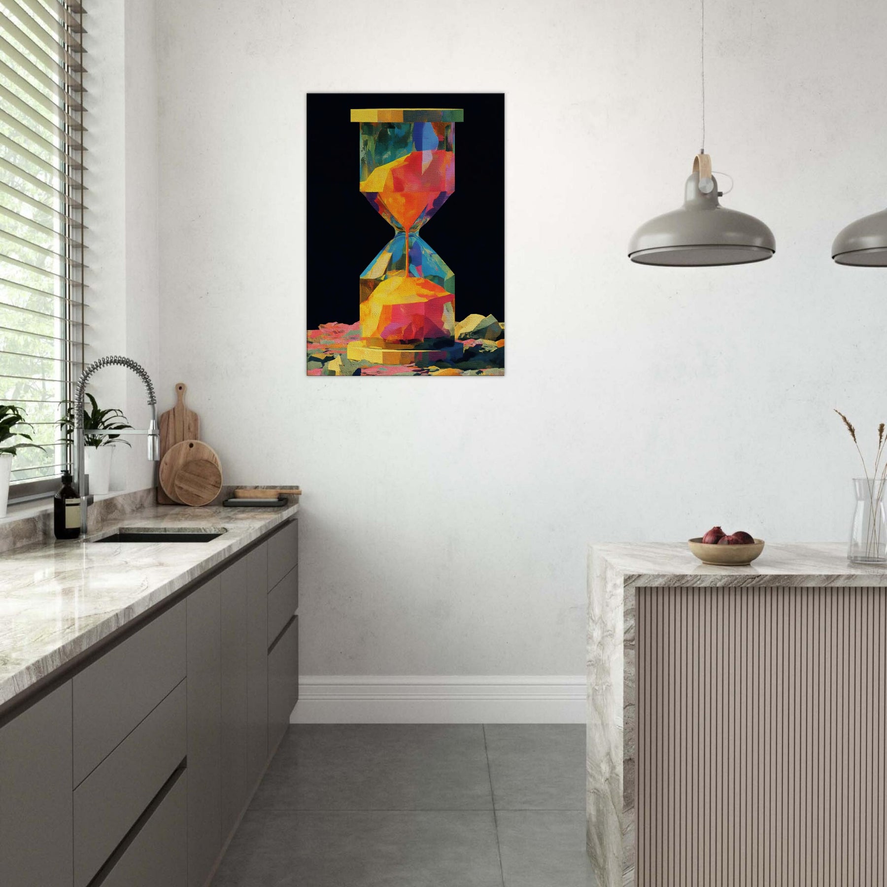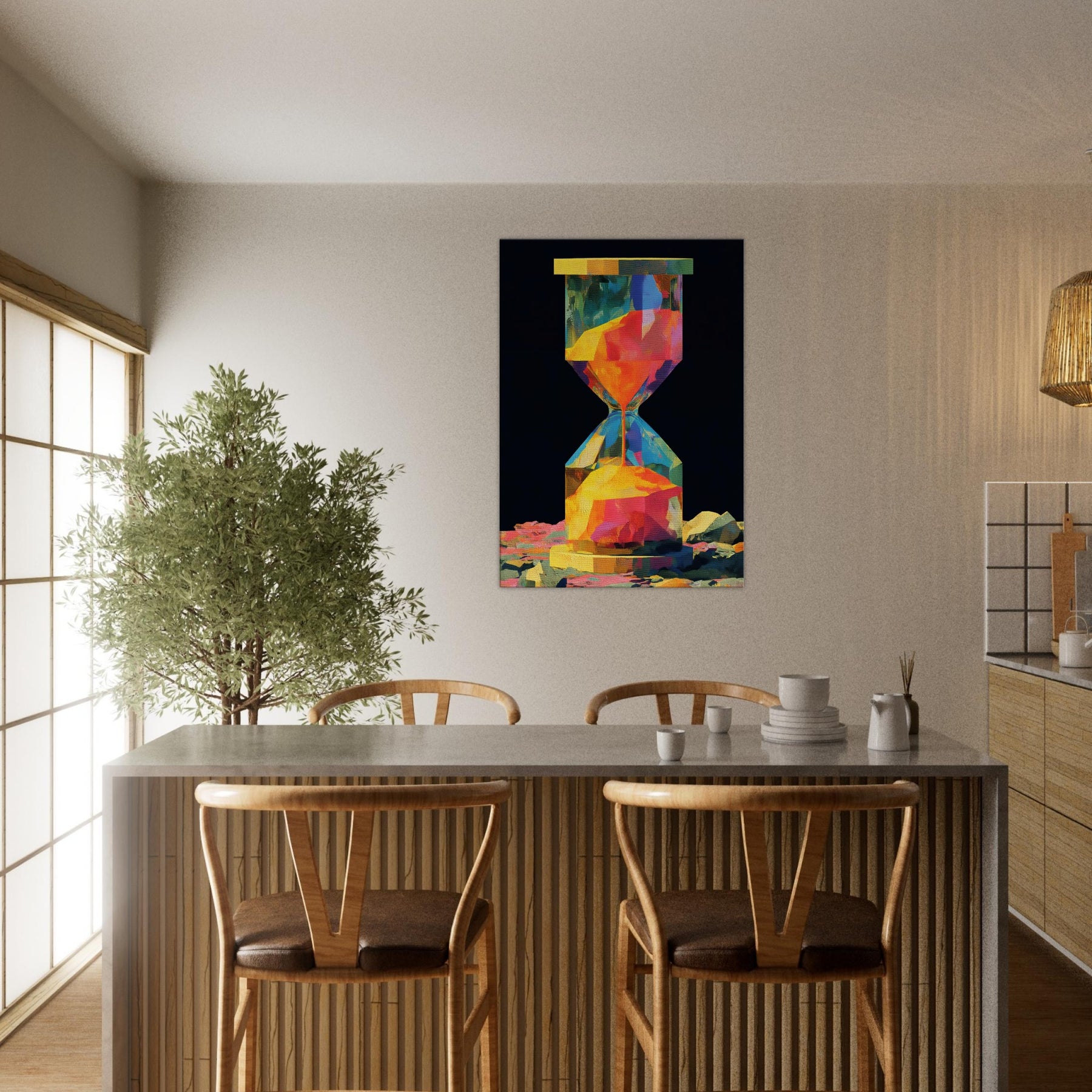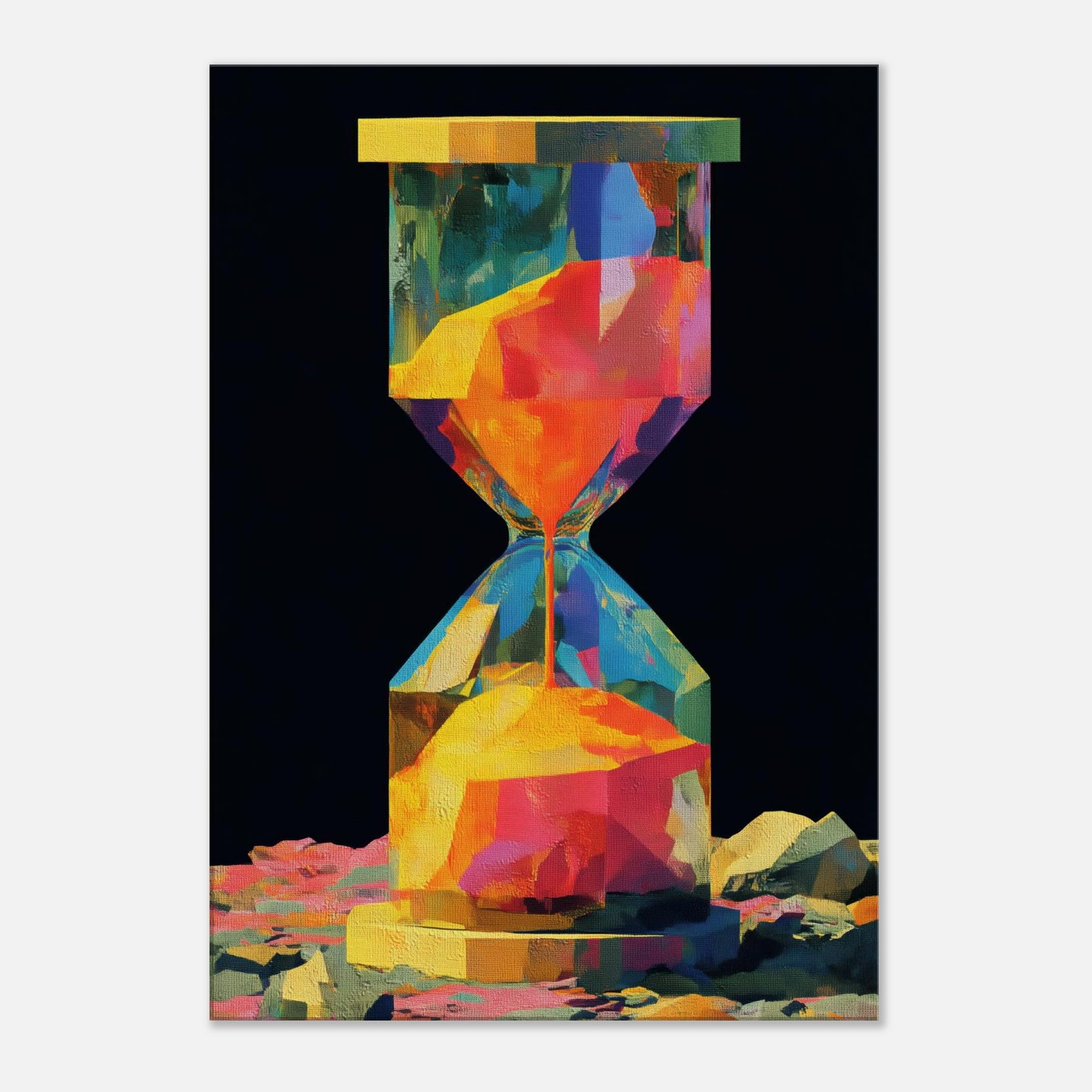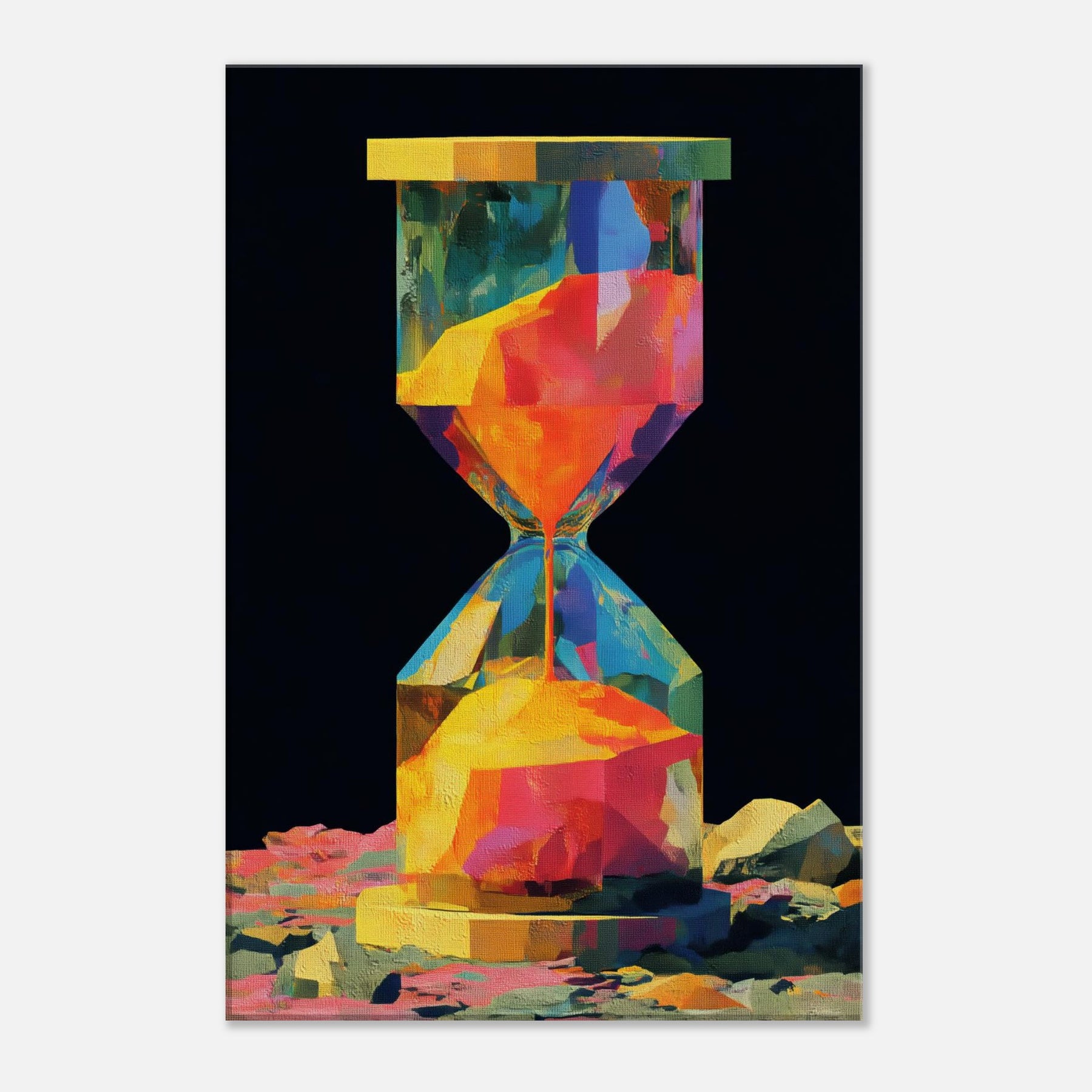An abstract hourglass rendered in a comet of color, this piece invites you to slow down and breathe. The hourglass becomes a doorway between moments, its facets catching light and echoing hues from sunrise to dusk. In a quiet corner, it hums with warmth, guiding the eye across bold geometries and soft transitions. The atmosphere feels alive, luminous, and intimate perfect for a living room or study that craves color without noise, texture without clutter, and a memory that glows.