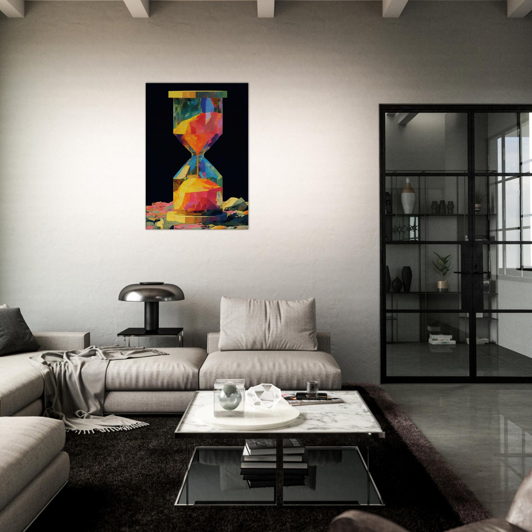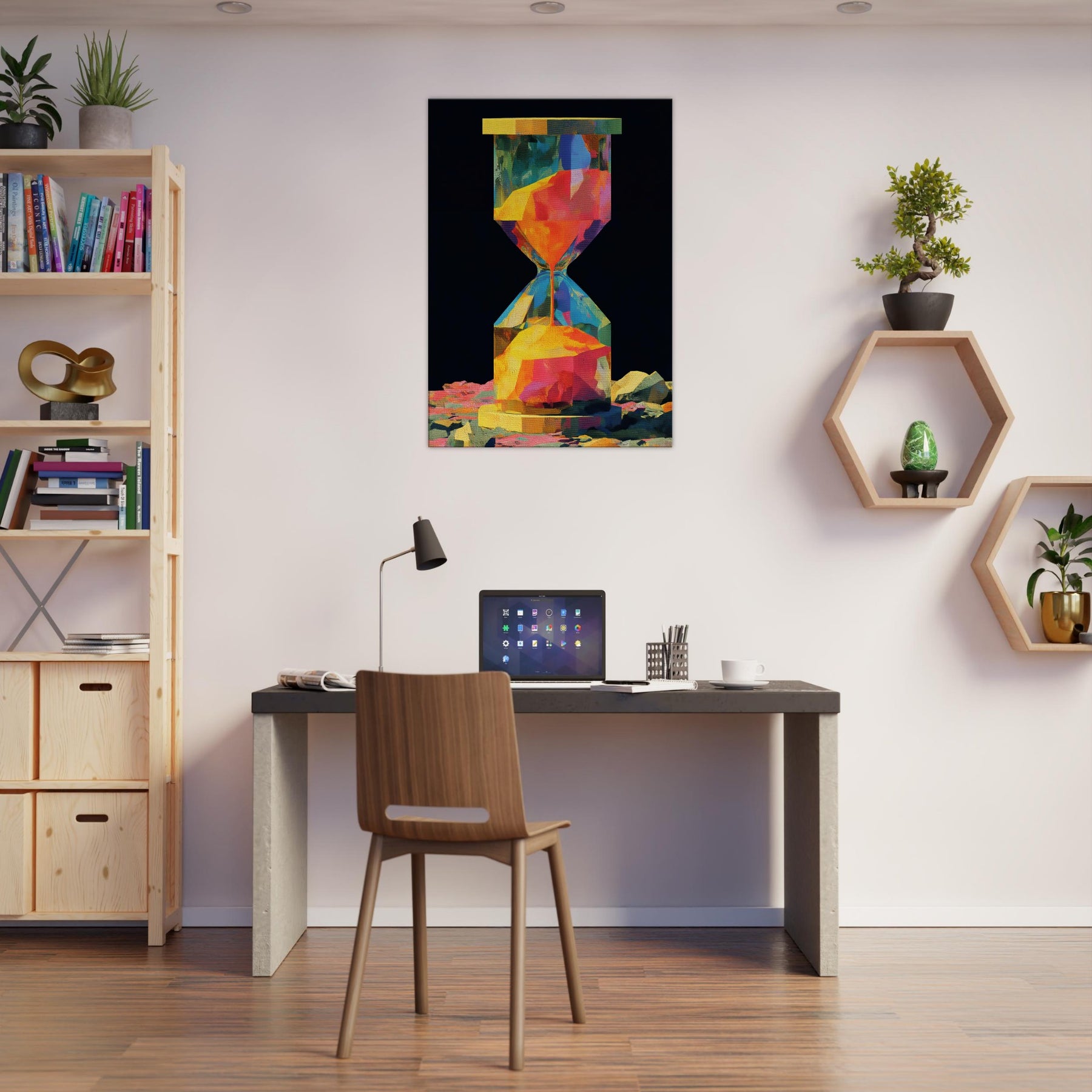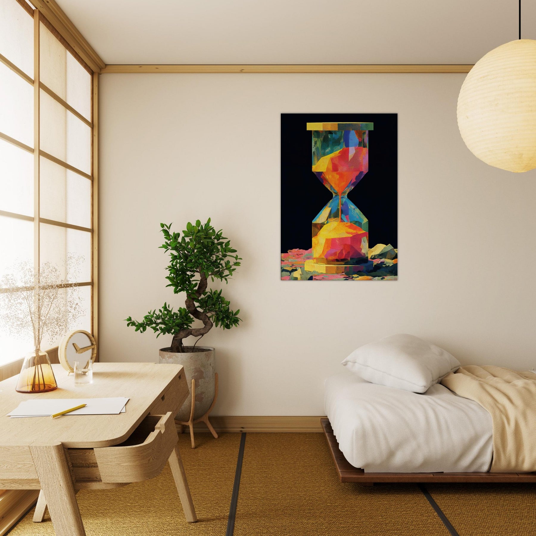 An abstract hourglass rendered in a comet of color, this piece invites you to slow down and breathe. The hourglass becomes a doorway between moments, its facets catching light and echoing hues from sunrise to dusk. In a quiet corner, it hums with warmth, guiding the eye across bold geometries and soft transitions. The atmosphere feels alive, luminous, and intimate perfect for a living room or study that craves color without noise, texture without clutter, and a memory that glows.