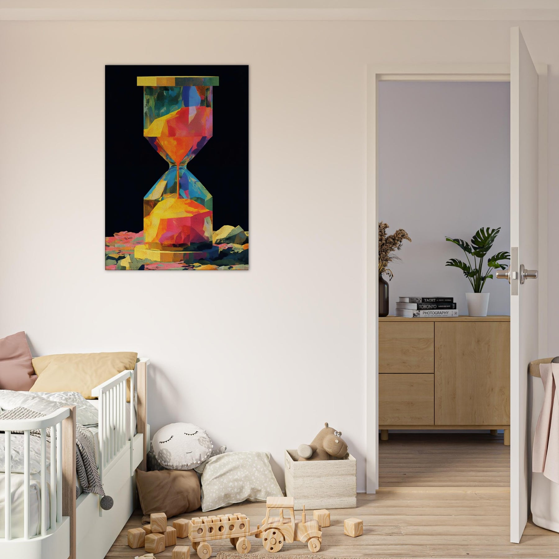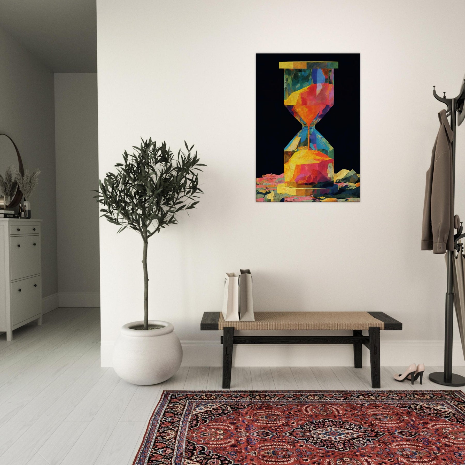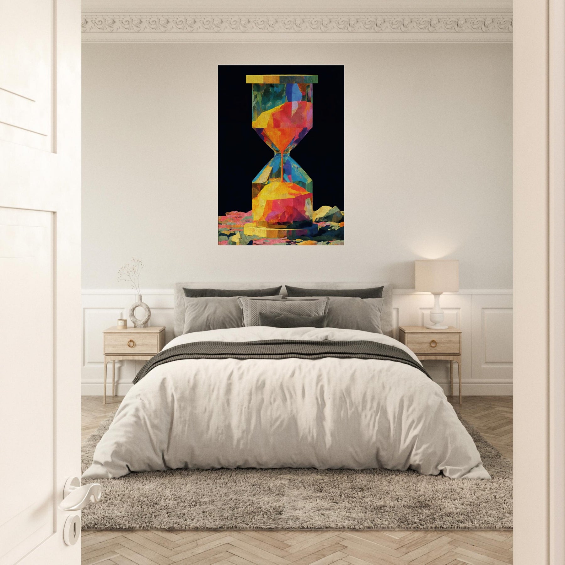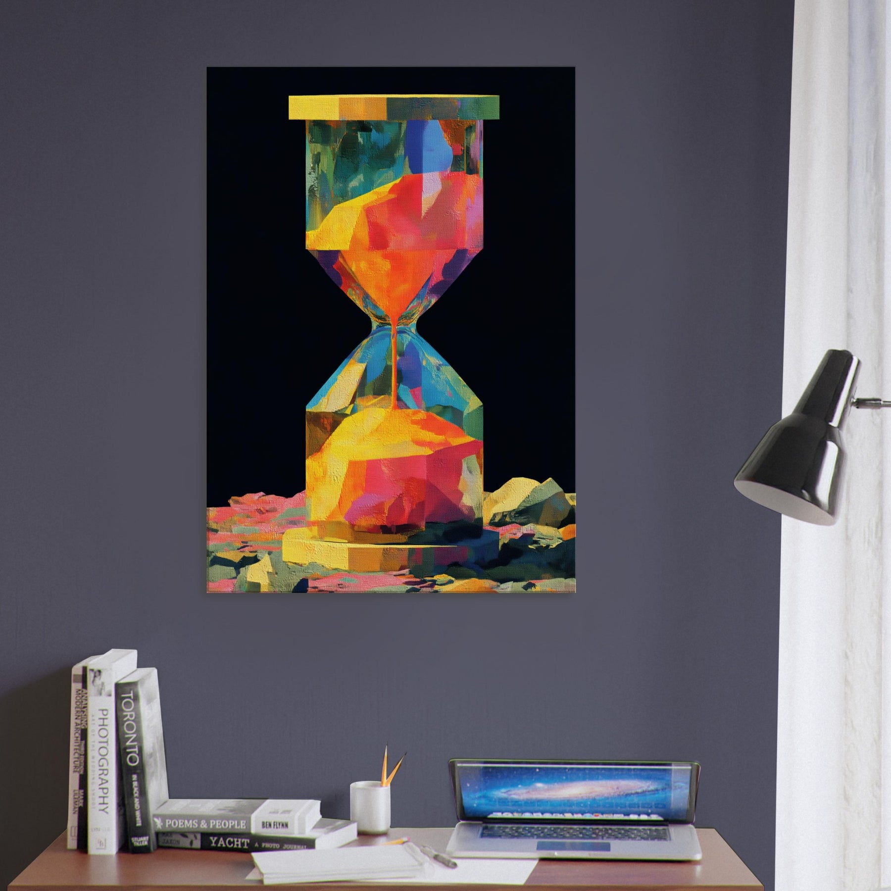 An abstract hourglass rendered in a comet of color, this piece invites you to slow down and breathe. The hourglass becomes a doorway between moments, its facets catching light and echoing hues from sunrise to dusk. In a quiet corner, it hums with warmth, guiding the eye across bold geometries and soft transitions. The atmosphere feels alive, luminous, and intimate perfect for a living room or study that craves color without noise, texture without clutter, and a memory that glows.