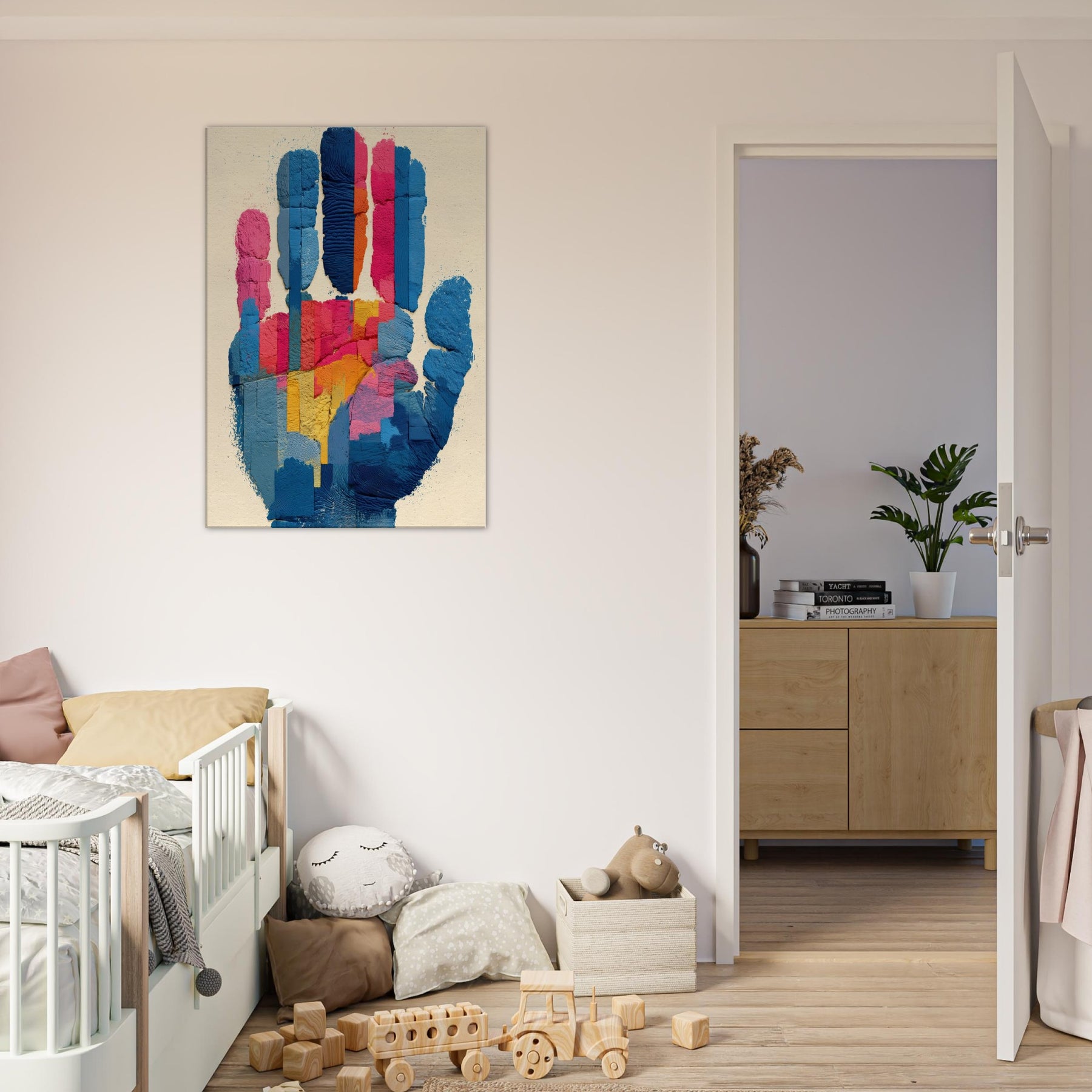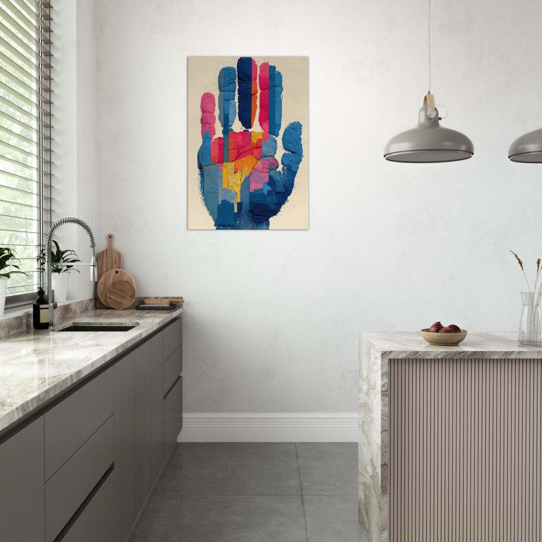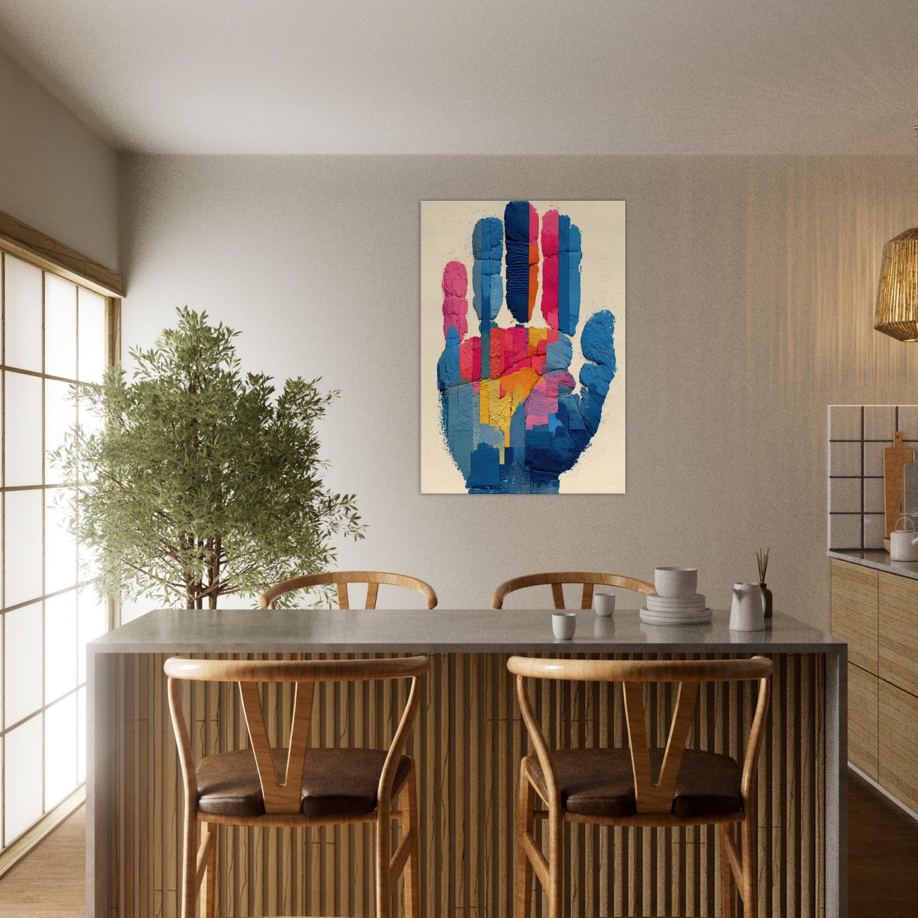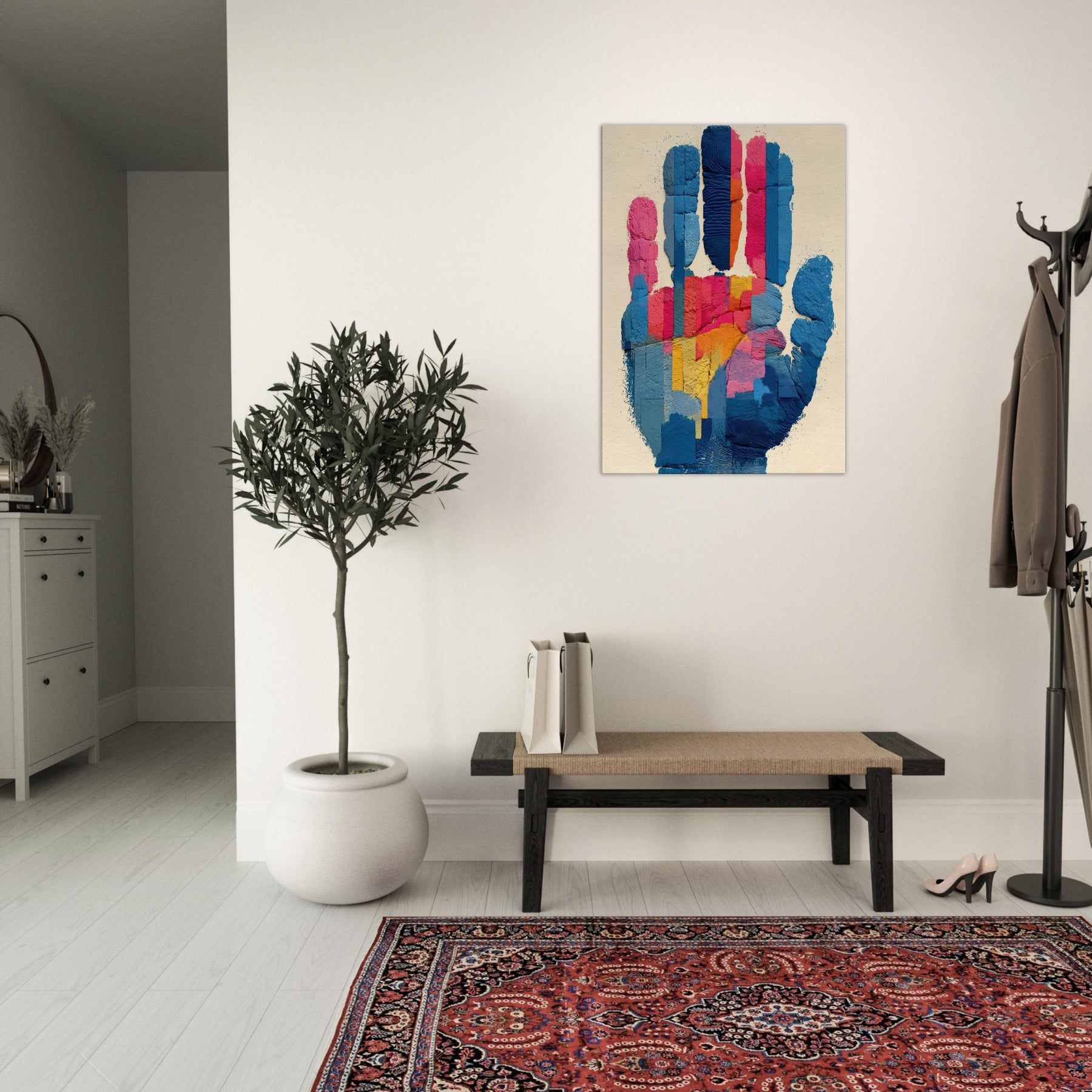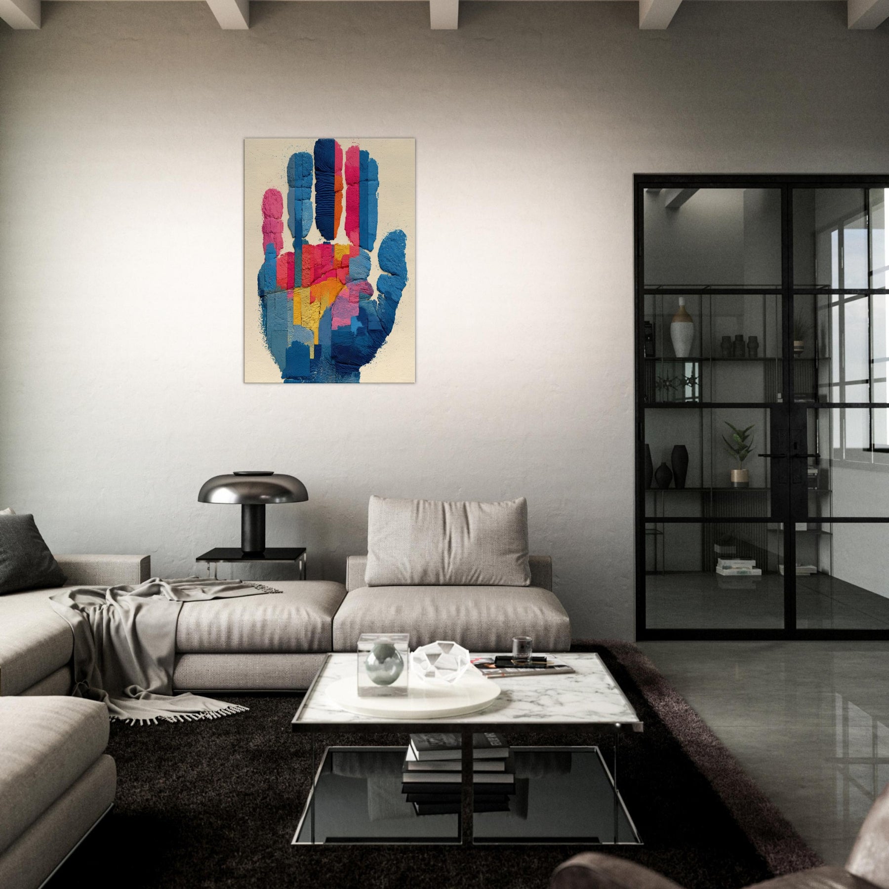 Step close and feel the rhythm of color in this Palmistry Hand. An abstract embrace of palm lines rendered as a living spectrum blue ripples, pink whispers, and sunlit amber threading through the palm’s silhouette. The piece invites quiet reflection, turning a wall into a room of ceremony and curiosity. Its tactile brushwork seems to pulse with intention, casting a warm glow that softens a living space and sparks contemplative conversation. A mystical accent that anchors a modern, soulful home.