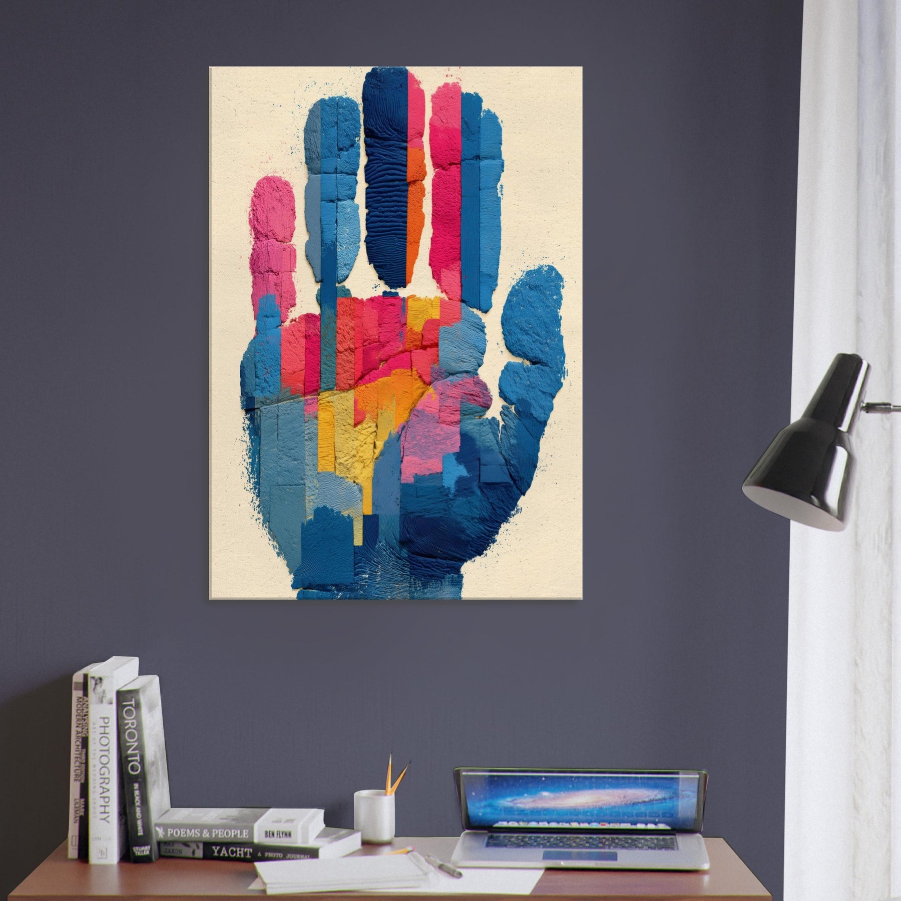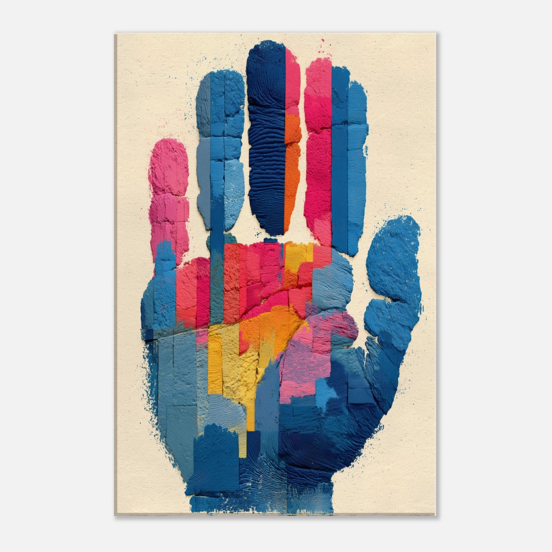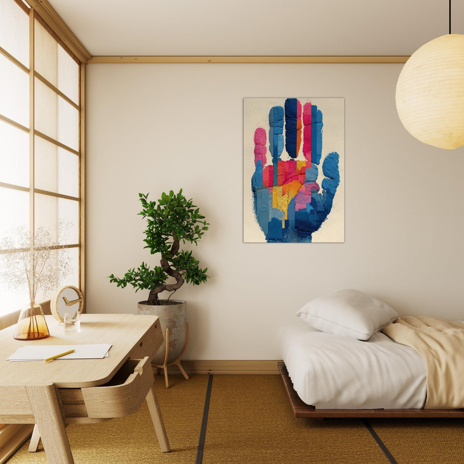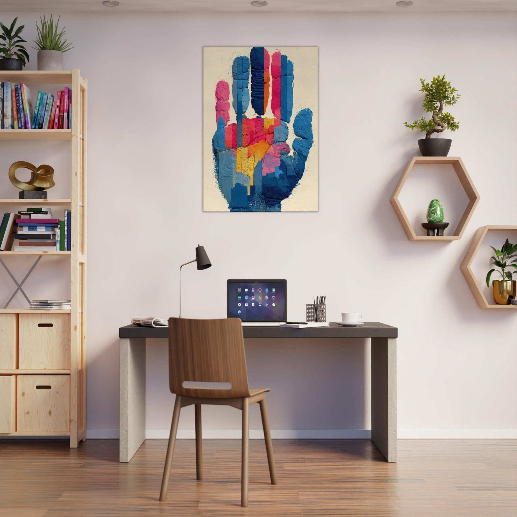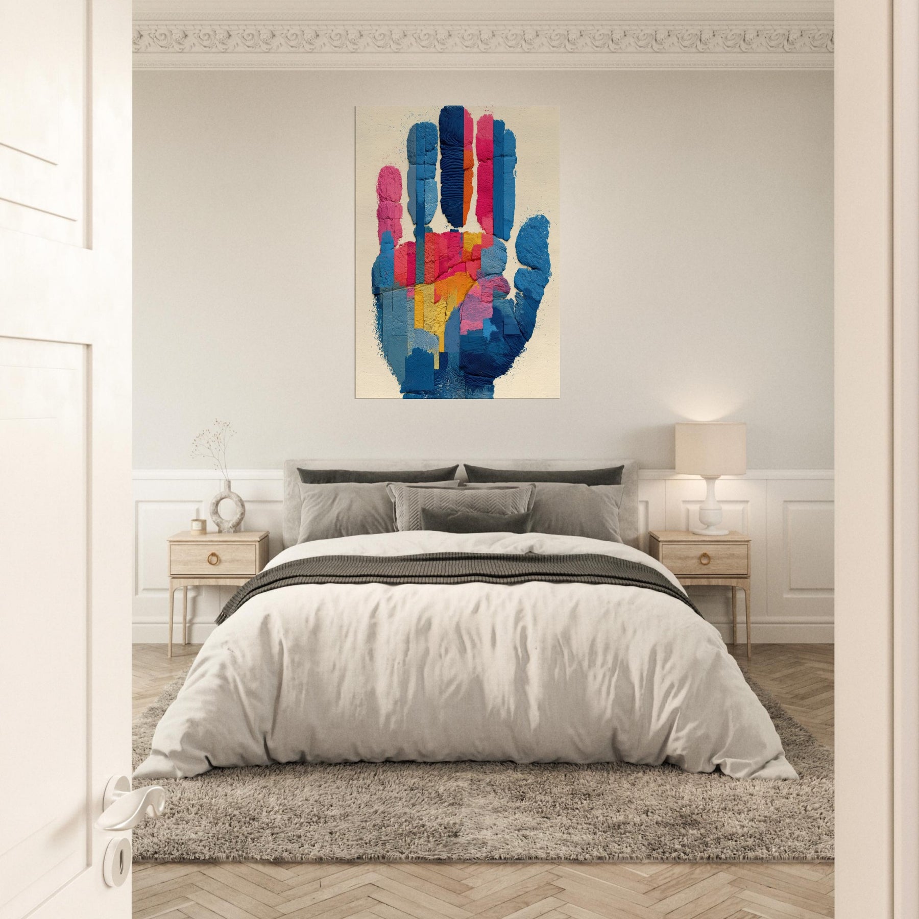 Step close and feel the rhythm of color in this Palmistry Hand. An abstract embrace of palm lines rendered as a living spectrum blue ripples, pink whispers, and sunlit amber threading through the palm’s silhouette. The piece invites quiet reflection, turning a wall into a room of ceremony and curiosity. Its tactile brushwork seems to pulse with intention, casting a warm glow that softens a living space and sparks contemplative conversation. A mystical accent that anchors a modern, soulful home.