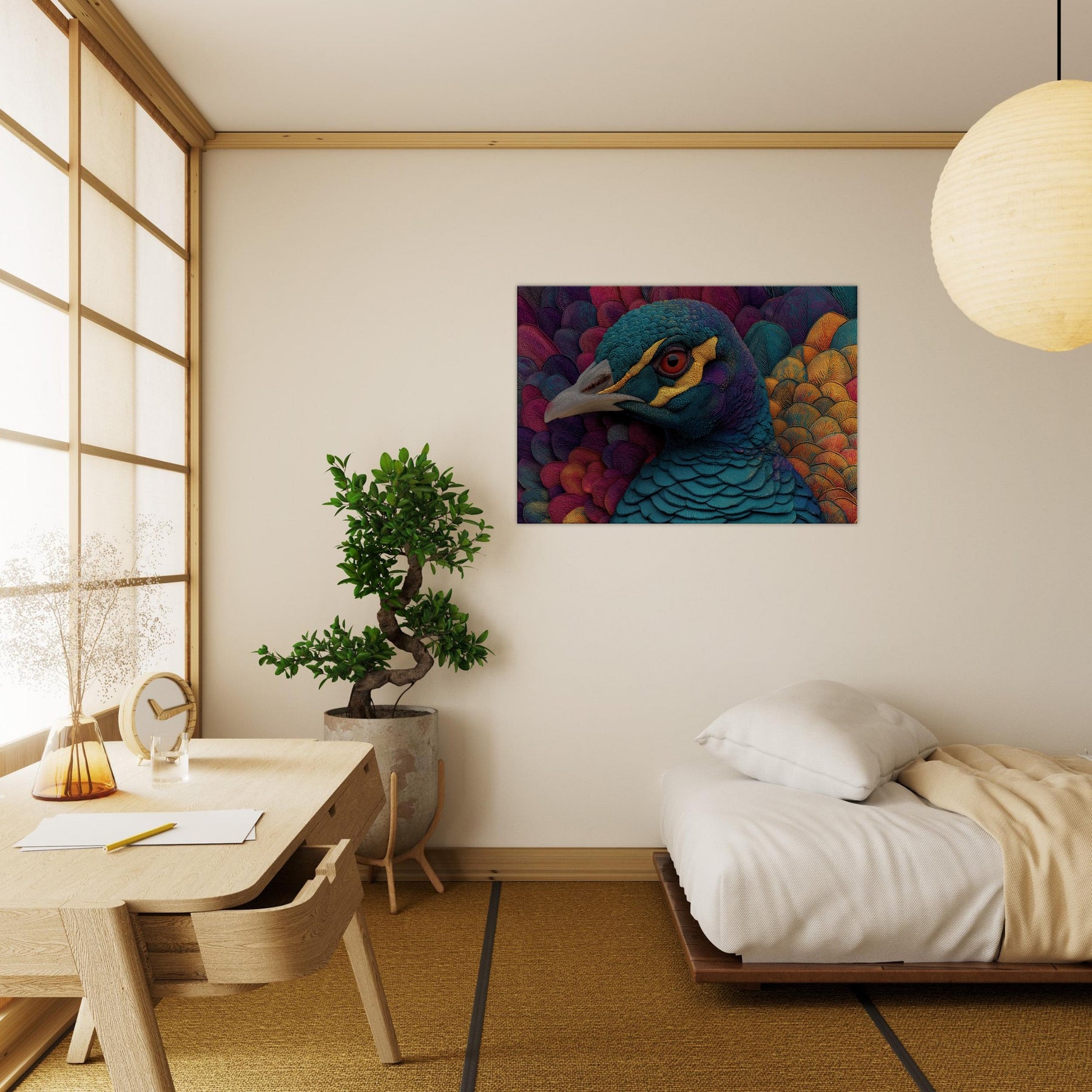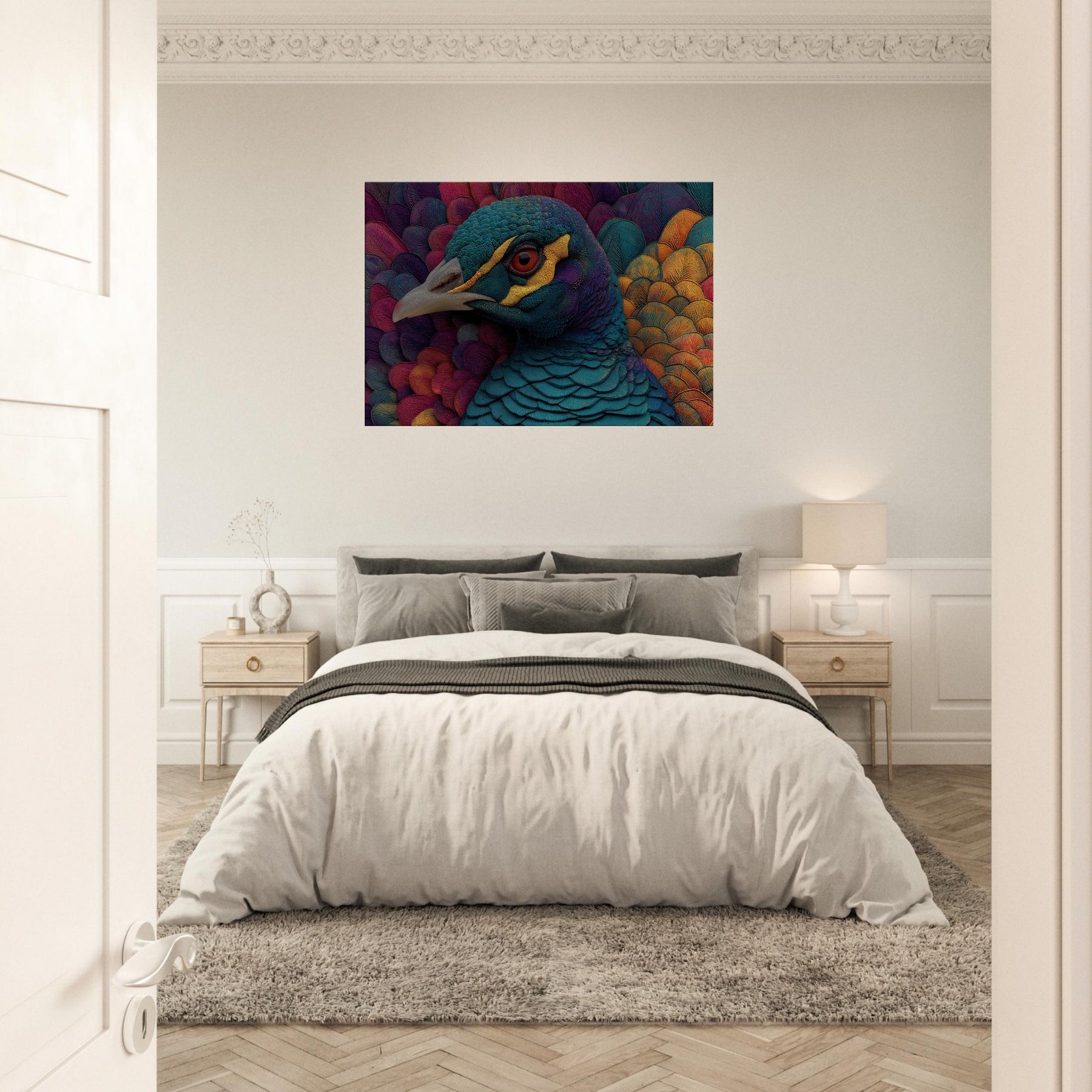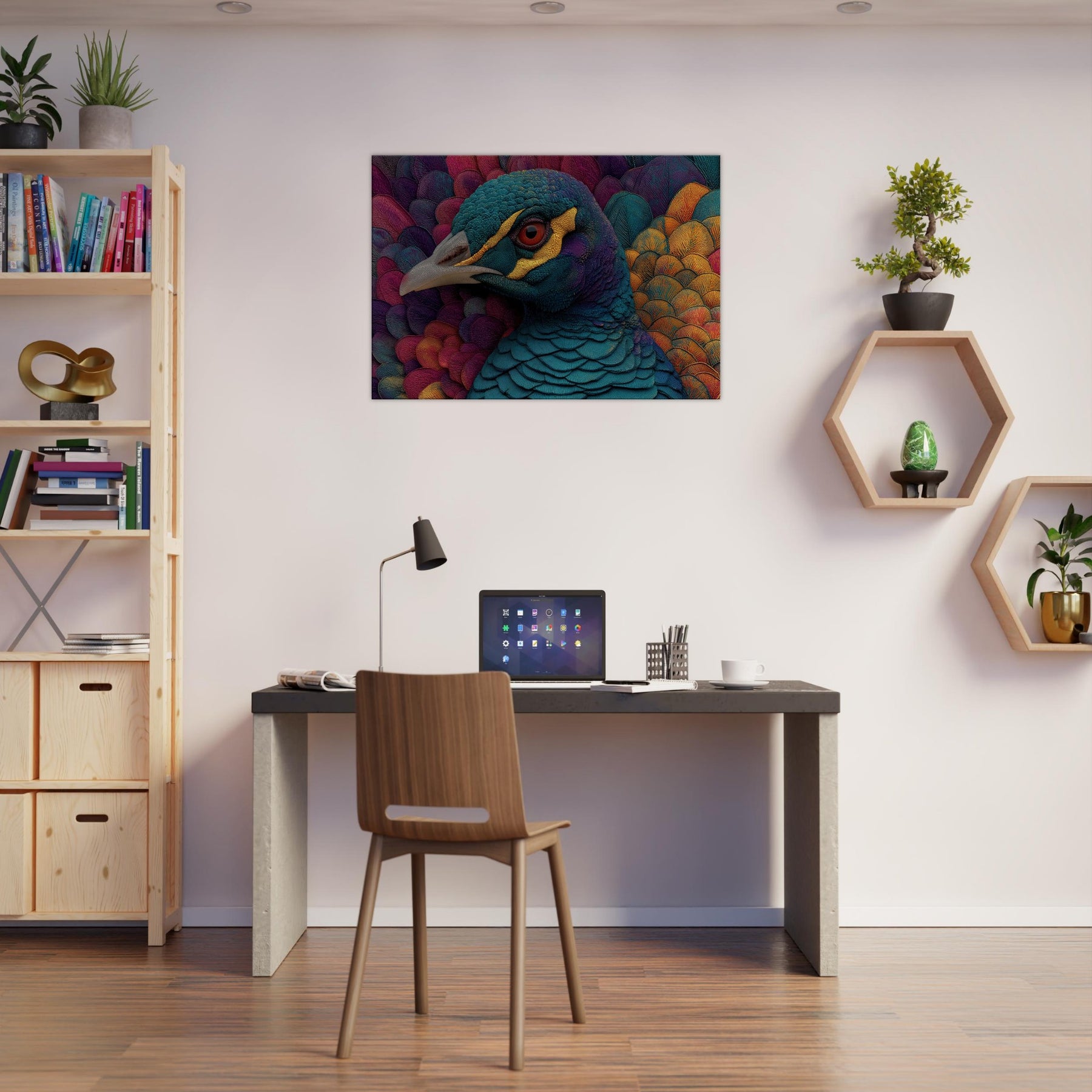 Let this luminous Peacock drift through your space, a dreamlike infusion of color and texture. The composition blooms with teal, turquoise, gold, and violet as if each feather holds a tiny sunrise. The atmosphere is serene yet electric, inviting slow, admiring glances and a sense of movement even when still. Perfect for a living room or study, it elevates walls into a gallery of warmth, refinement, and imaginative depth.