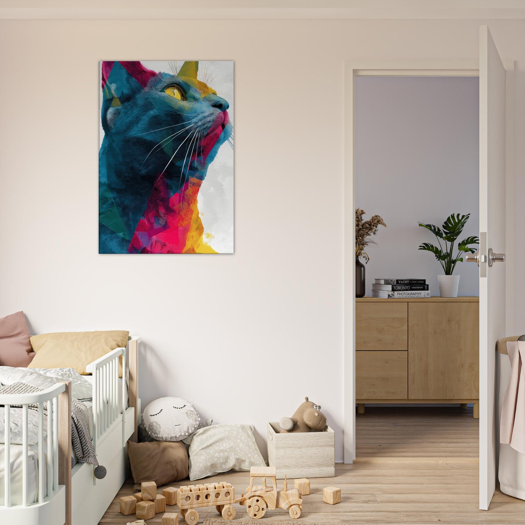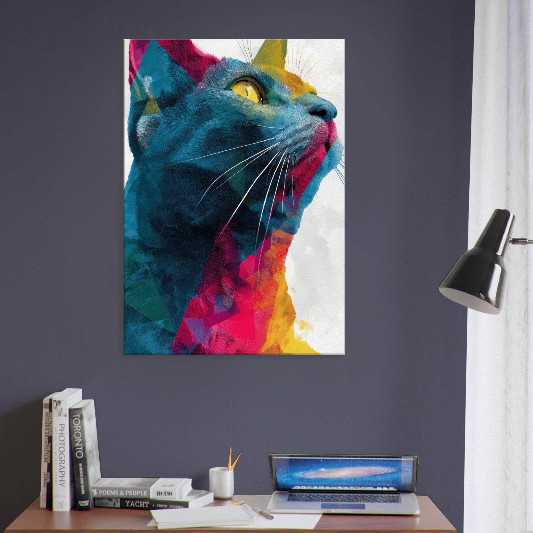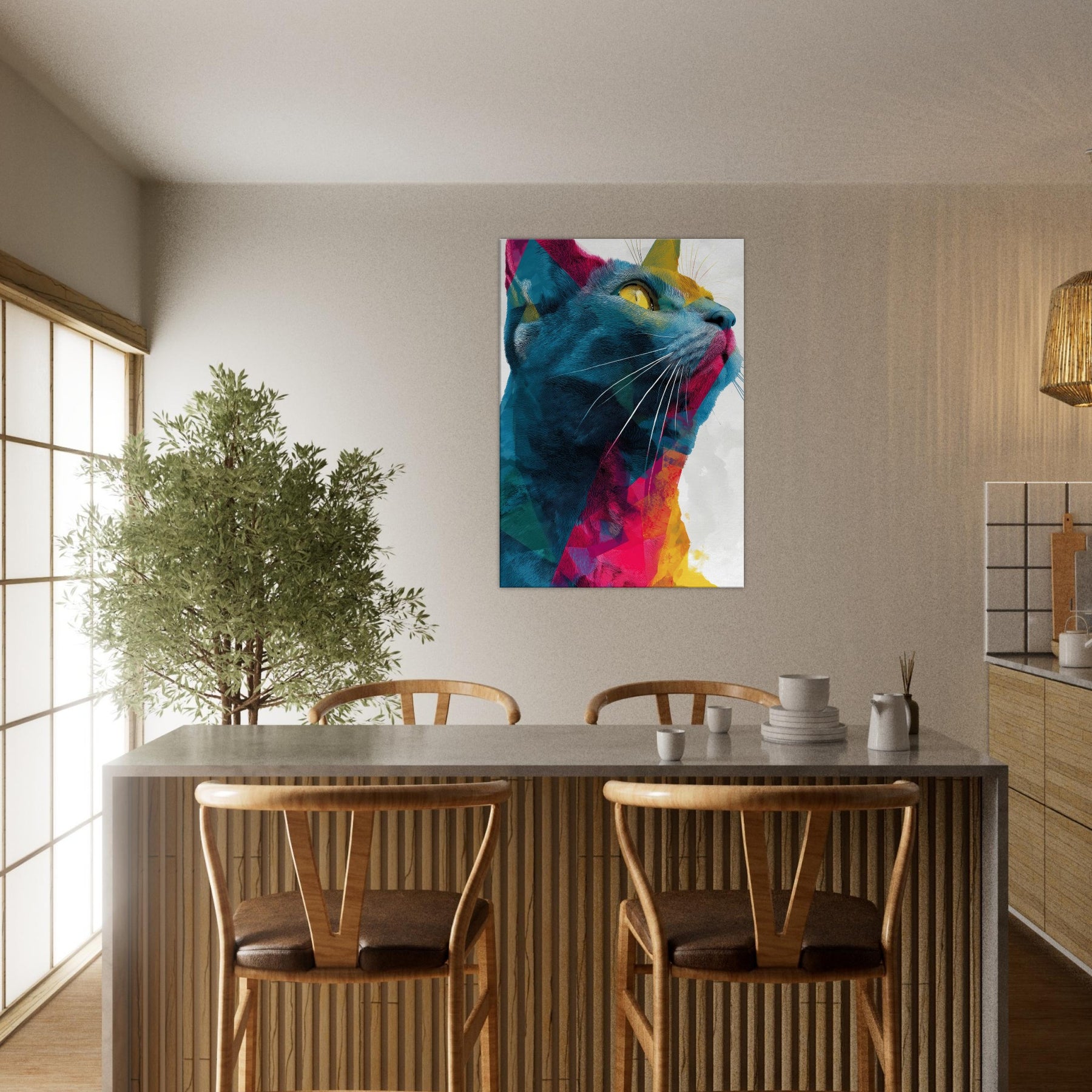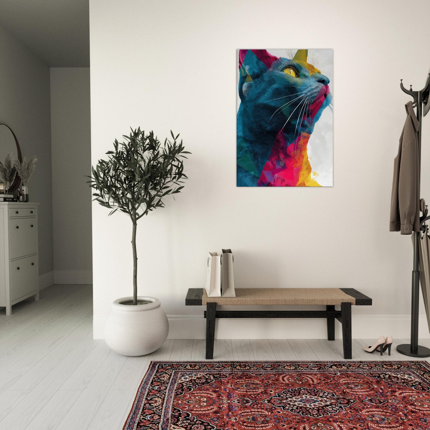 Let the Cat guide your space into a lush, imaginative where color and form mingle in glimmering shards. This abstract composition bathes walls in electric blues, sunlit yellows, and rogue magentas, inviting the eye to wander the sleek contours and playful whiskers. The atmosphere feels buoyant and modern, yet intimate, as if a living presence watches over the room. Hang it above a console or sofa to create a focal point that breathes energy, curiosity, and refined, contemporary charm.