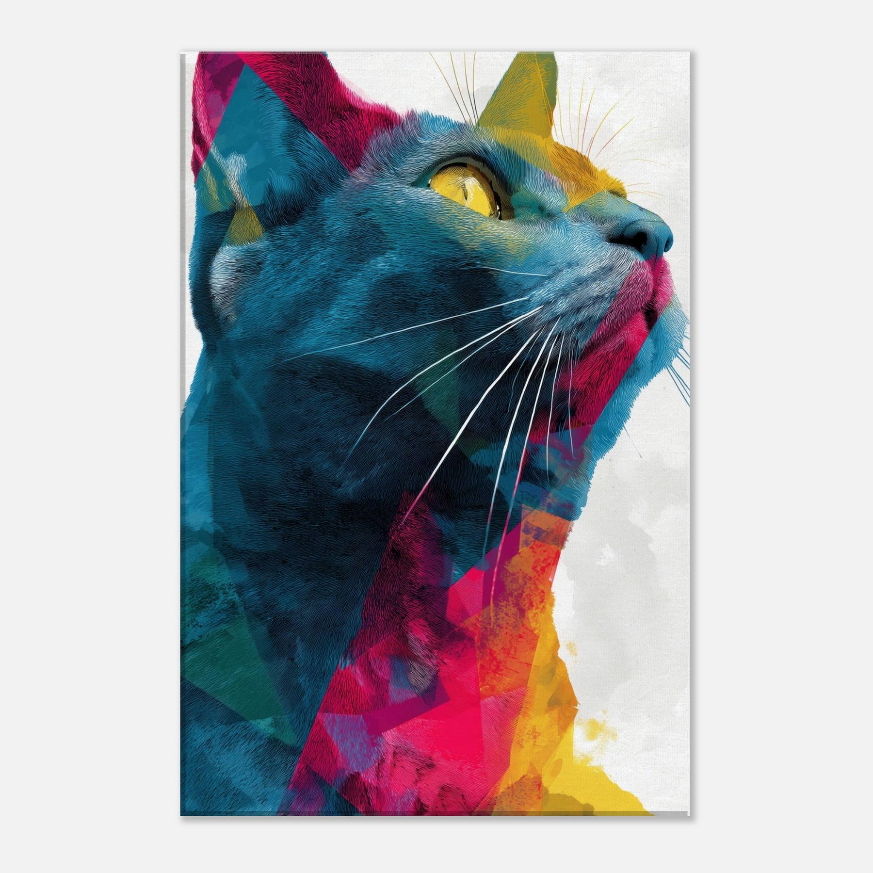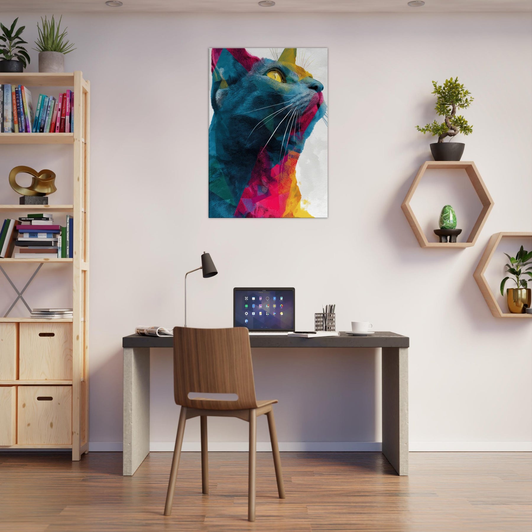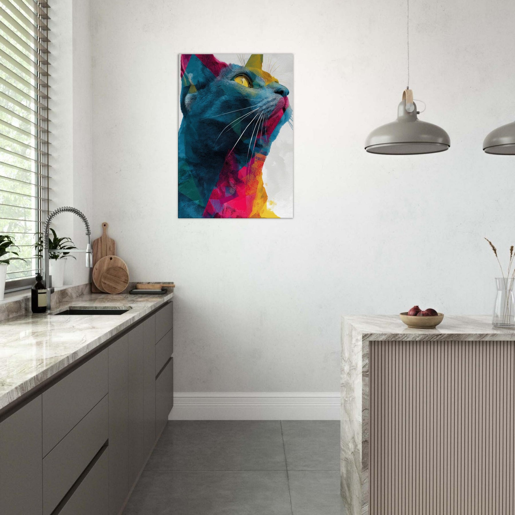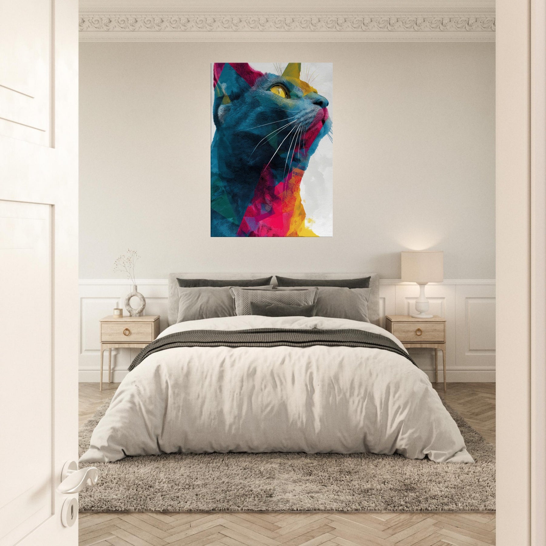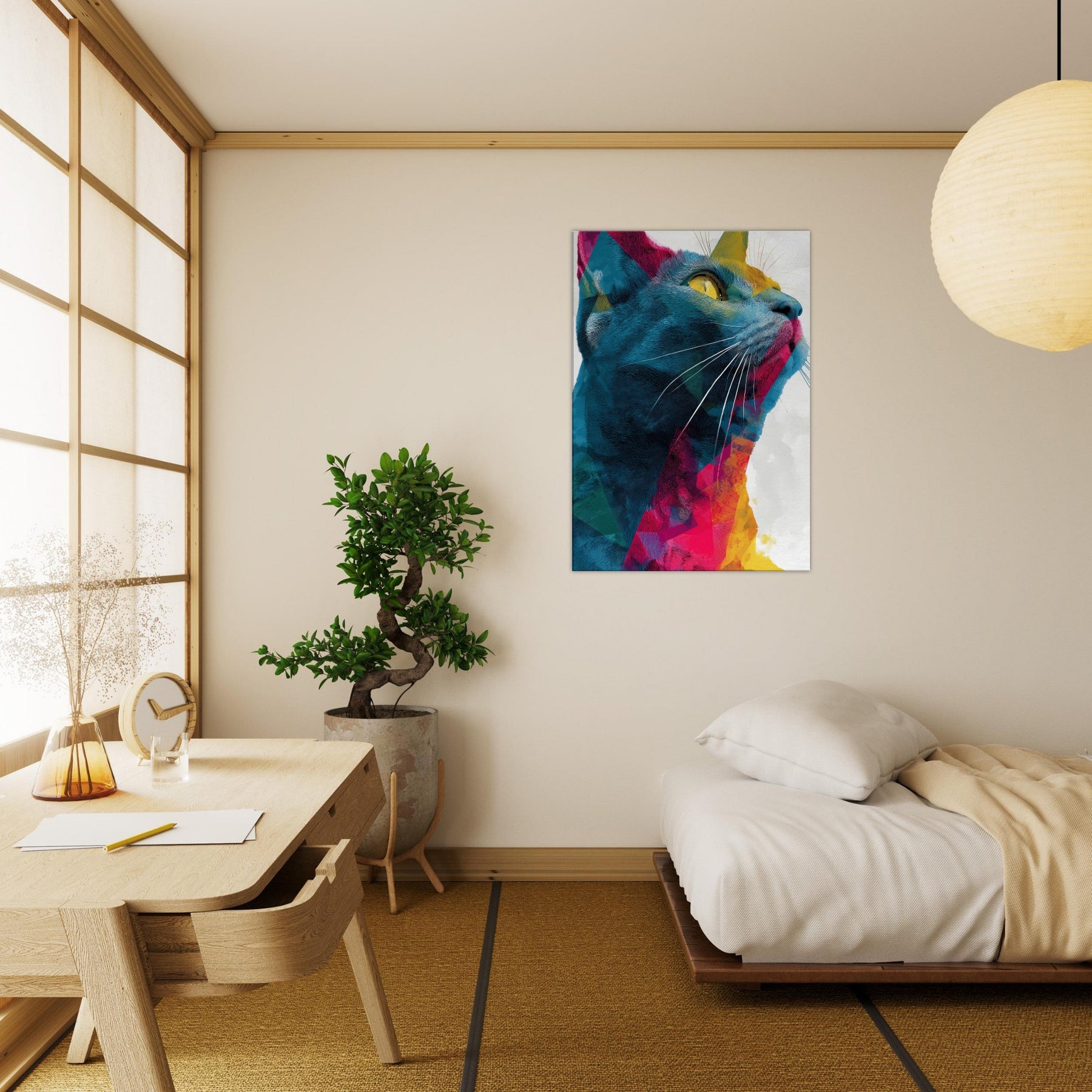 Let the Cat guide your space into a lush, imaginative where color and form mingle in glimmering shards. This abstract composition bathes walls in electric blues, sunlit yellows, and rogue magentas, inviting the eye to wander the sleek contours and playful whiskers. The atmosphere feels buoyant and modern, yet intimate, as if a living presence watches over the room. Hang it above a console or sofa to create a focal point that breathes energy, curiosity, and refined, contemporary charm.