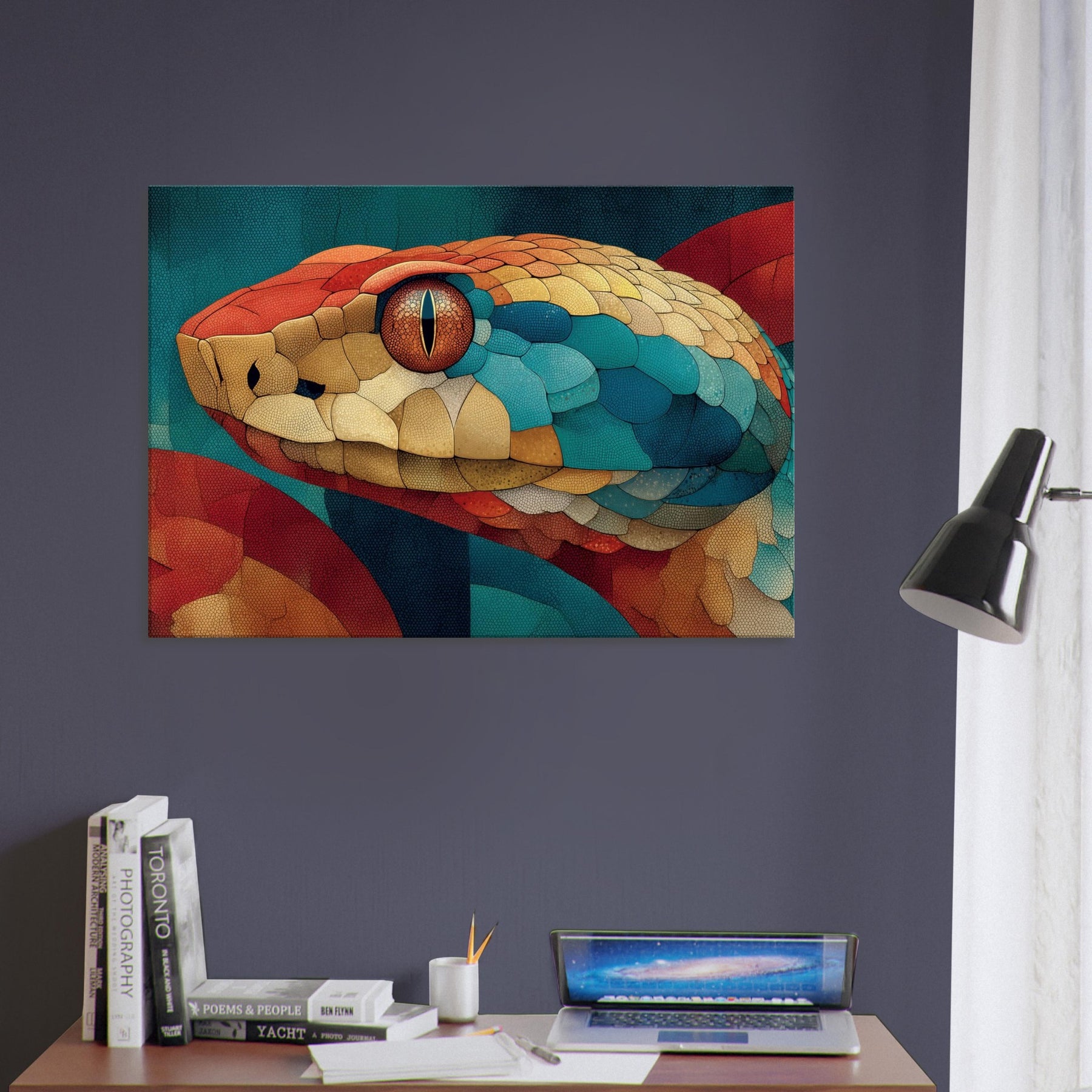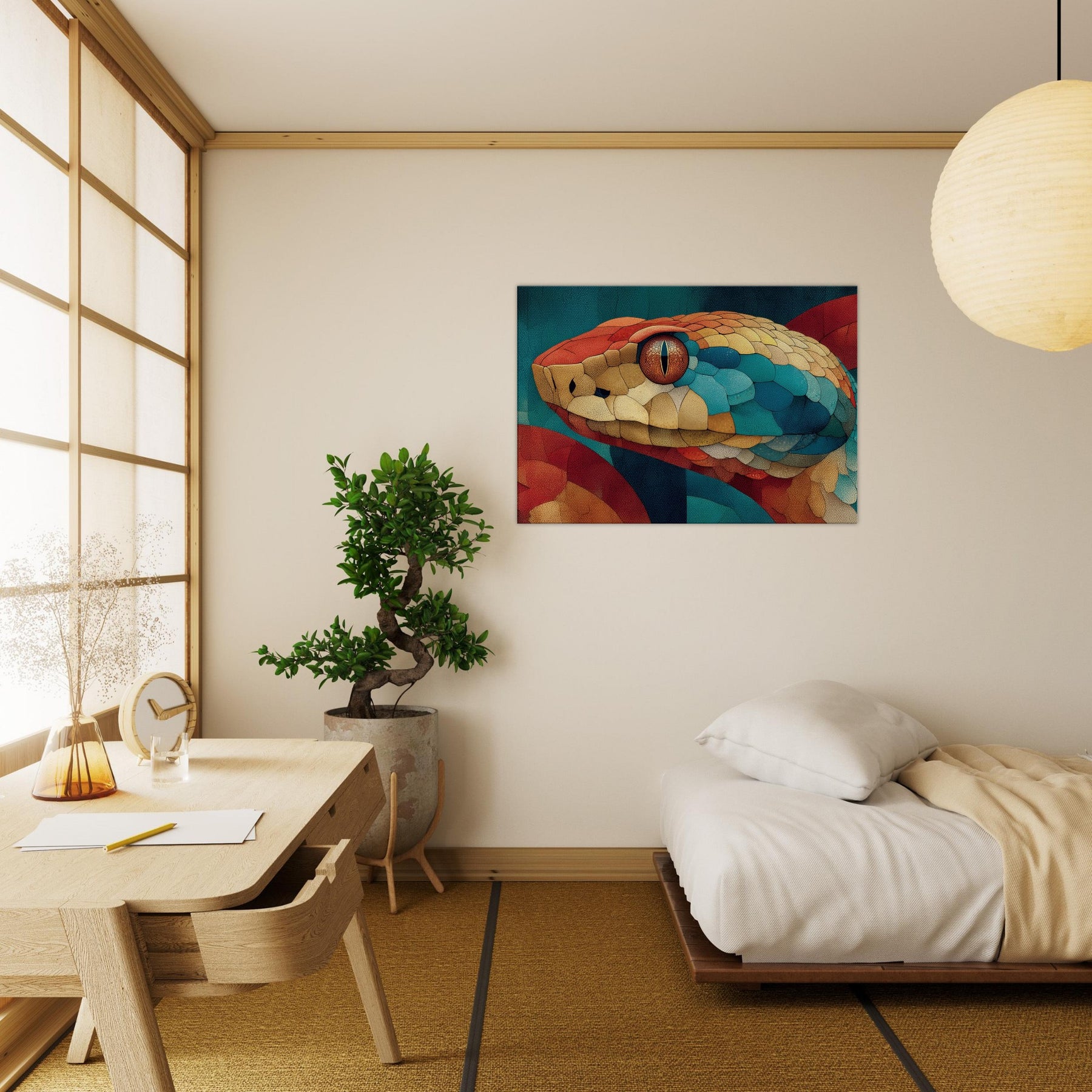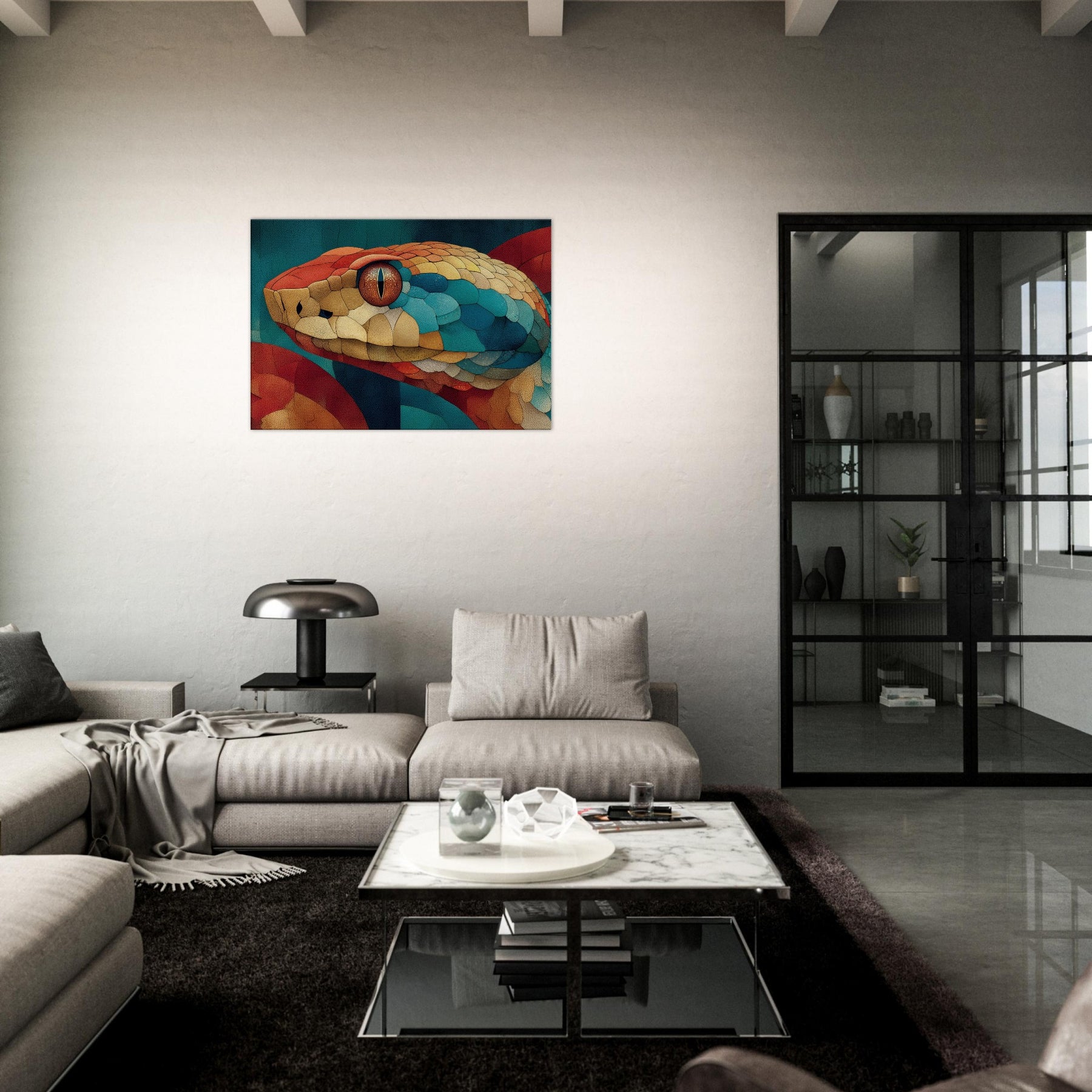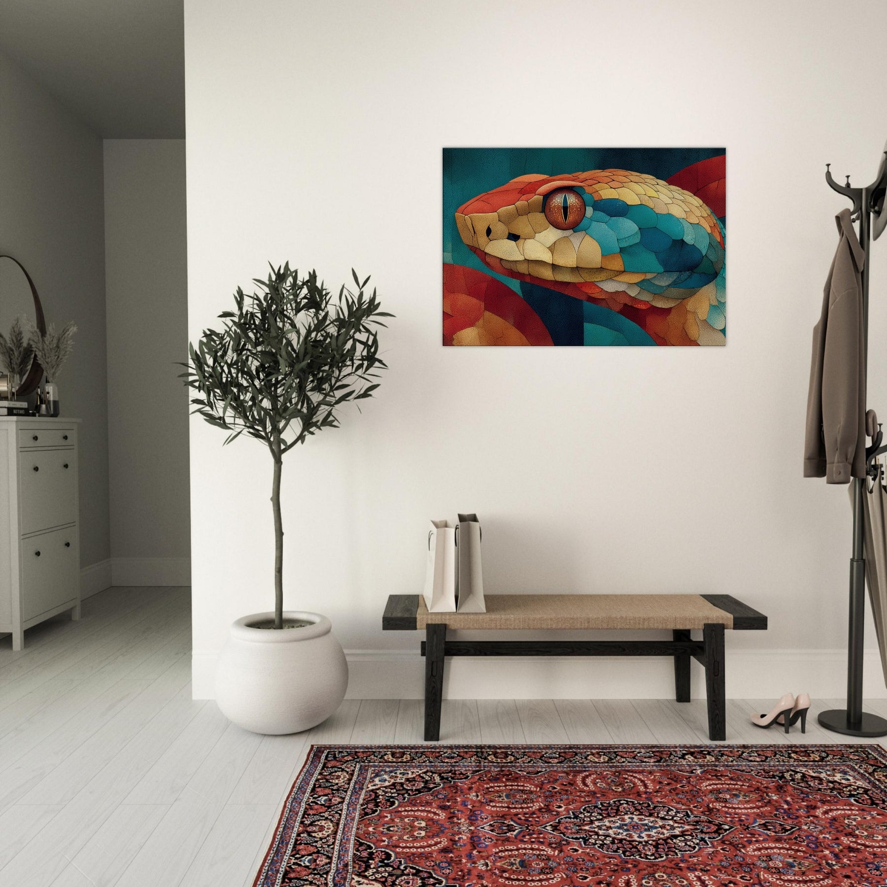 An odyssey of color and form, this abstract mosaic turns a wall into motion and mood. The Snake coils with luminous teal, coral, gold, and lapis textures, inviting quiet contemplation from every angle. Light dances across its faceted scales, washing the room in warmth and subtle contrast. It adds a sensual, kinetic energy to living spaces, pairing well with minimalist furnishings or bold textures alike. A refined focal point that elevates atmosphere without shouting, it invites pause and wonder.