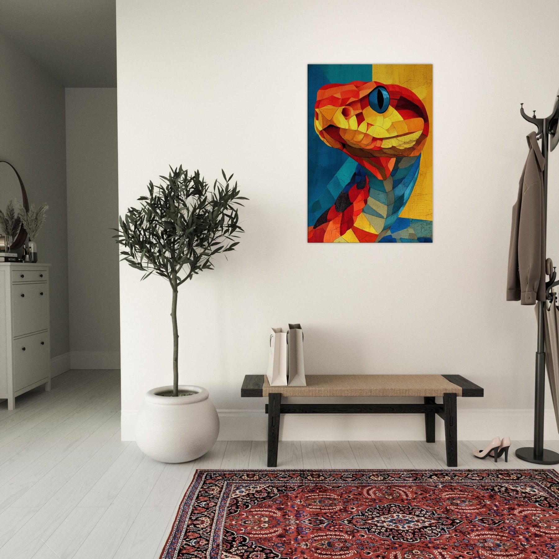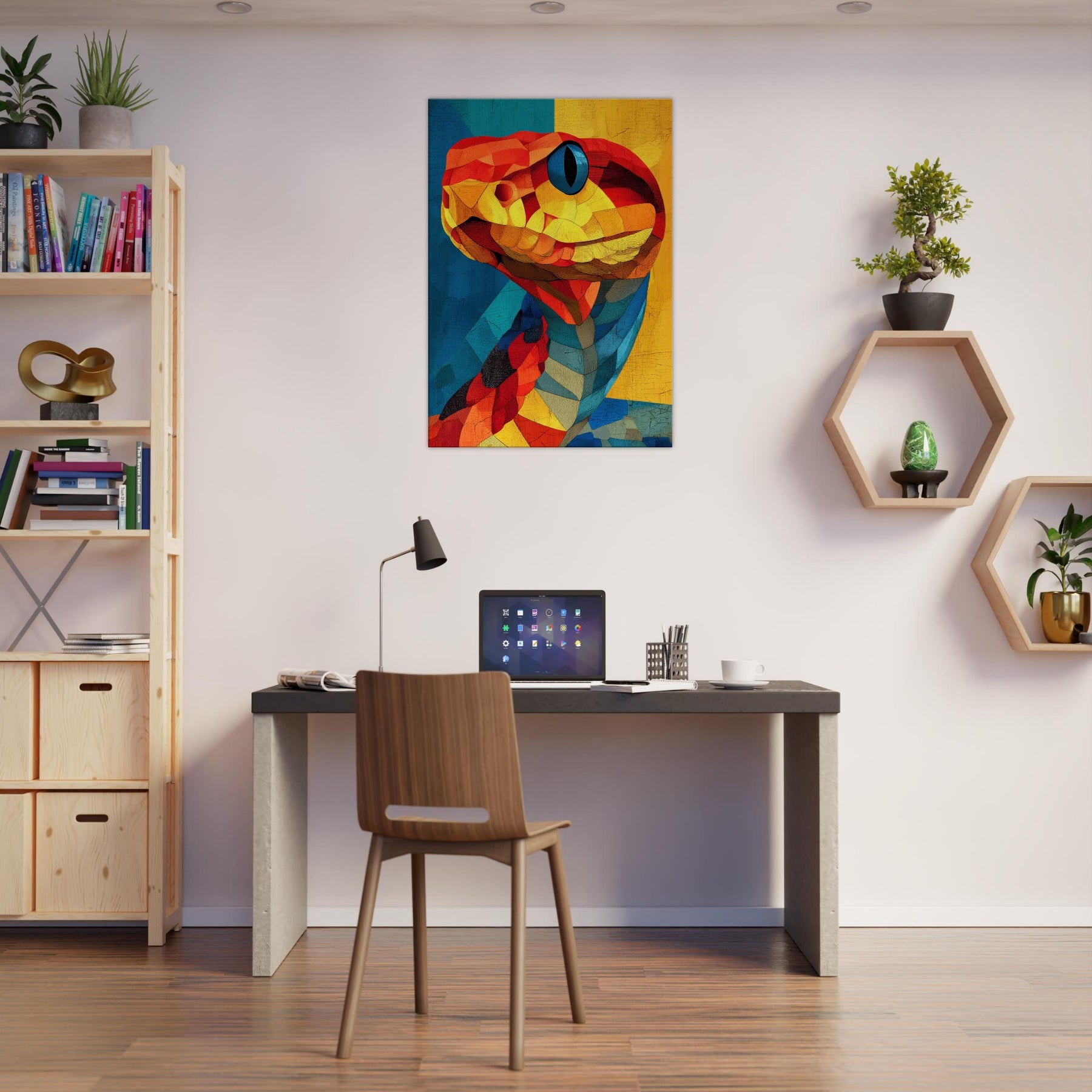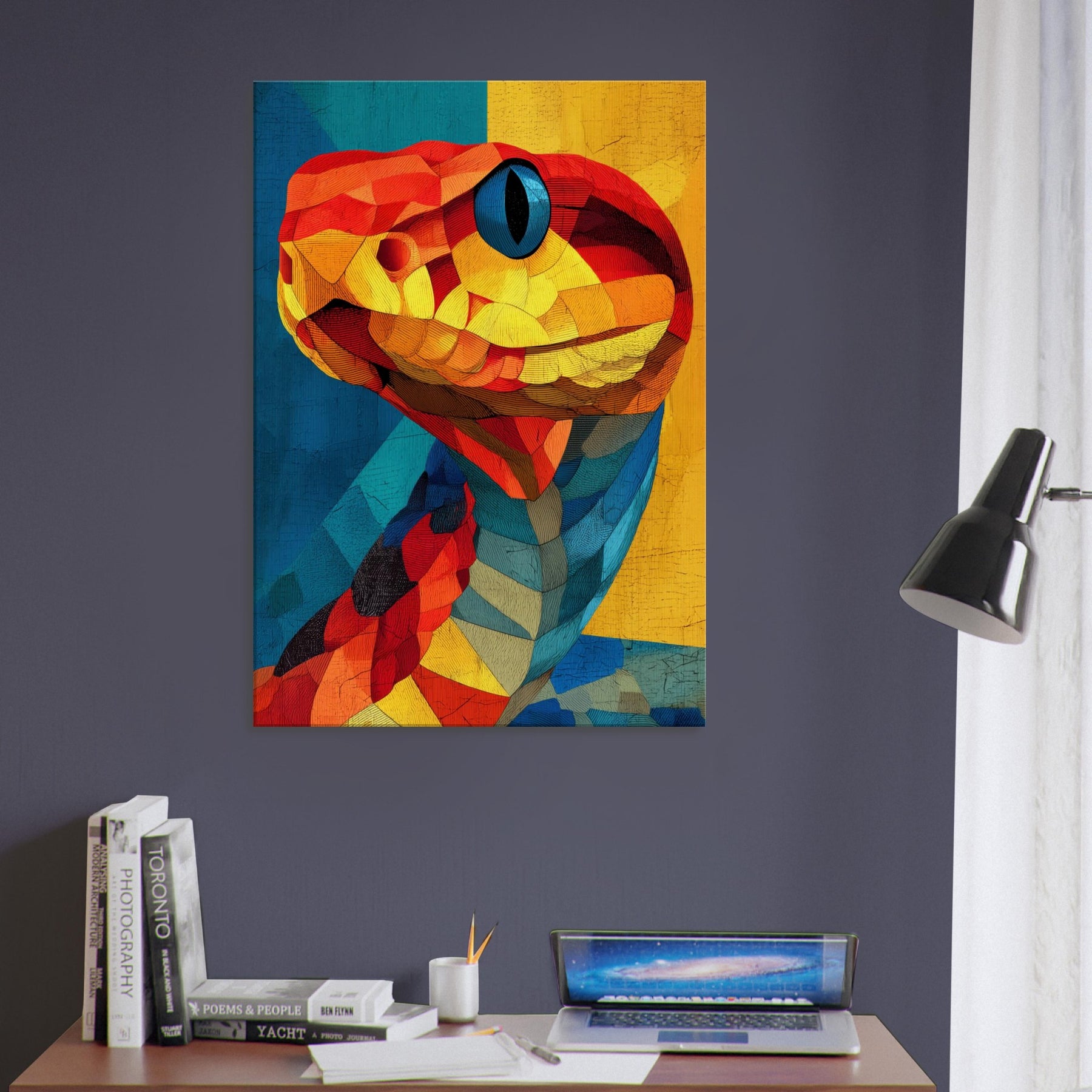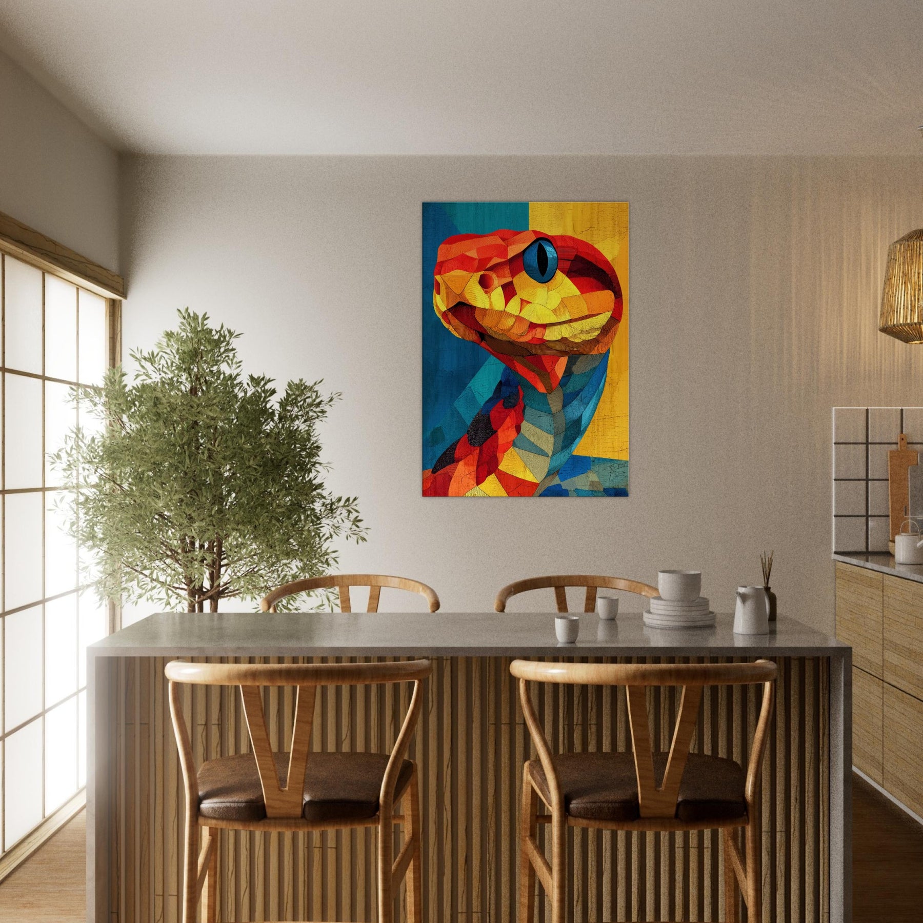 An electric study of motion and color, this painting centers a Snake in an intricate mosaic of warm and electric tones. The composition pulses with energy as each shard like facet catches light, guiding the eye along serpentine curves. It elevates a living room or study with a sense of glamour and dynamism, inviting conversation and slow reflection. The Snake becomes a guardian of warmth and curiosity, turning ordinary walls into a vivid, breathing where color and form meet.