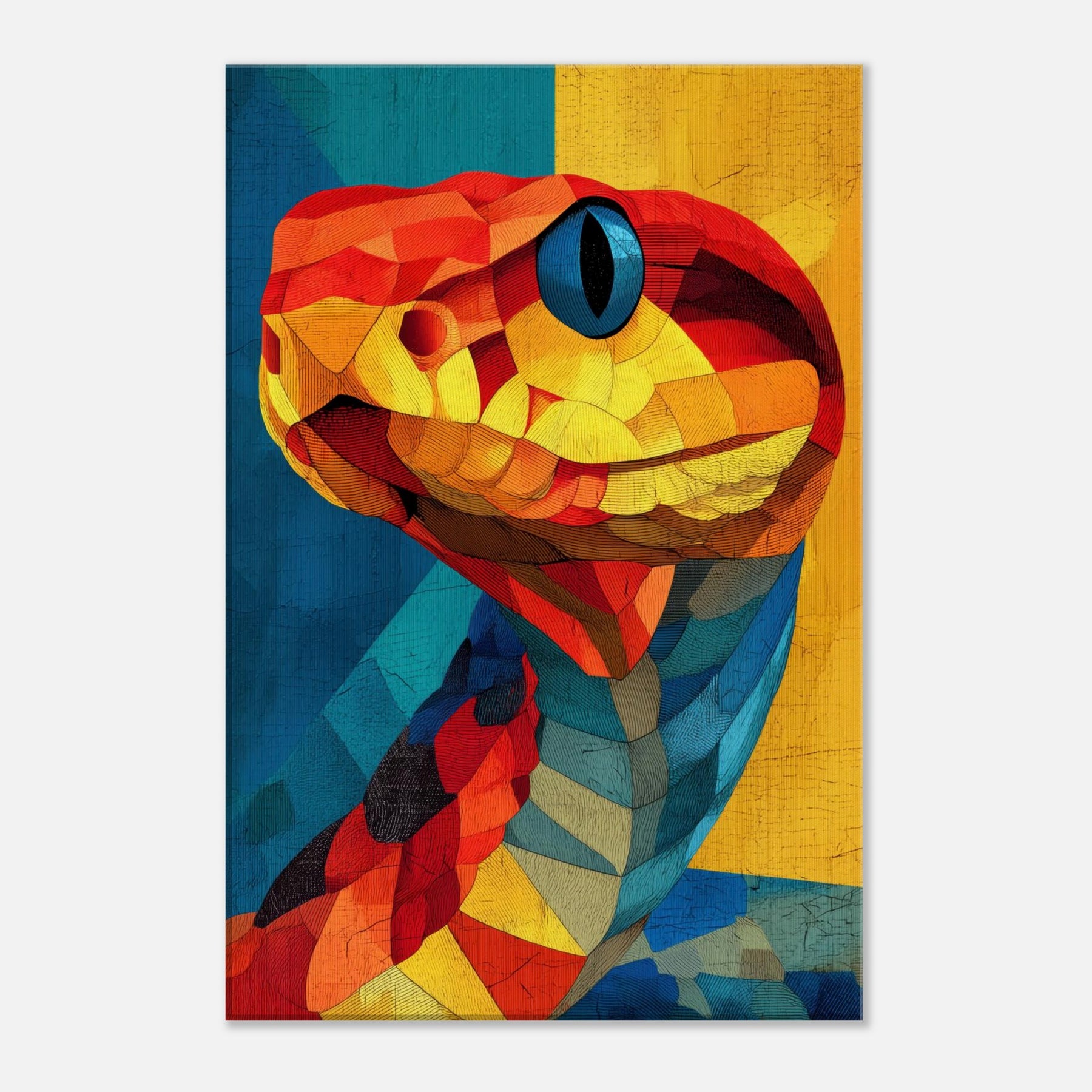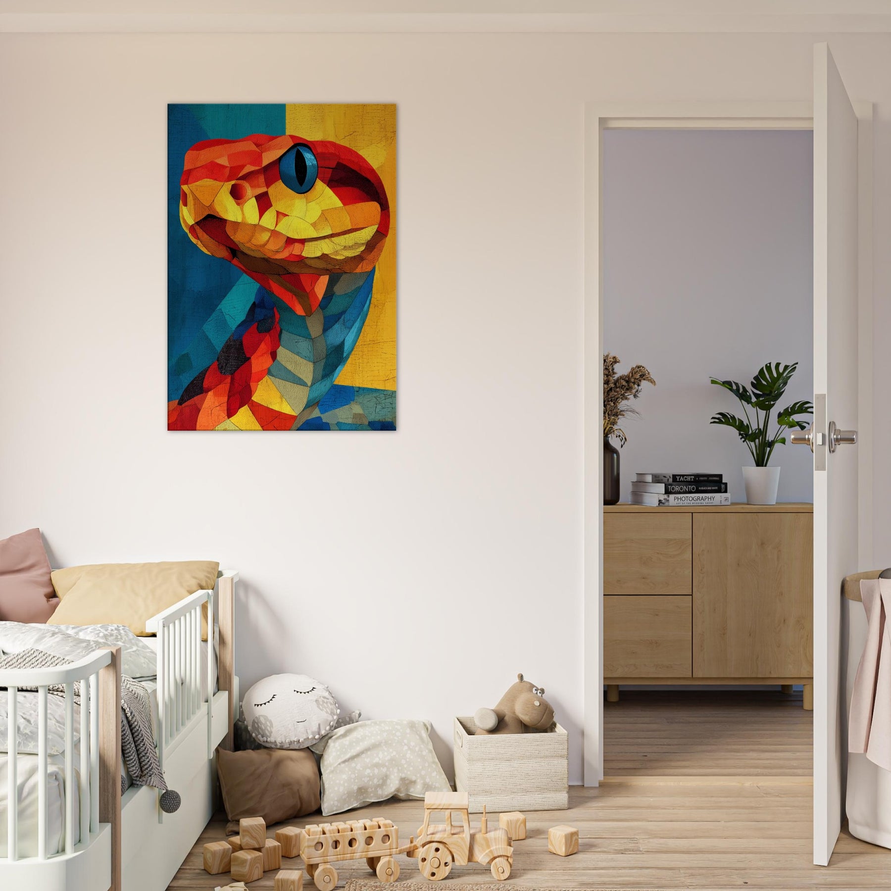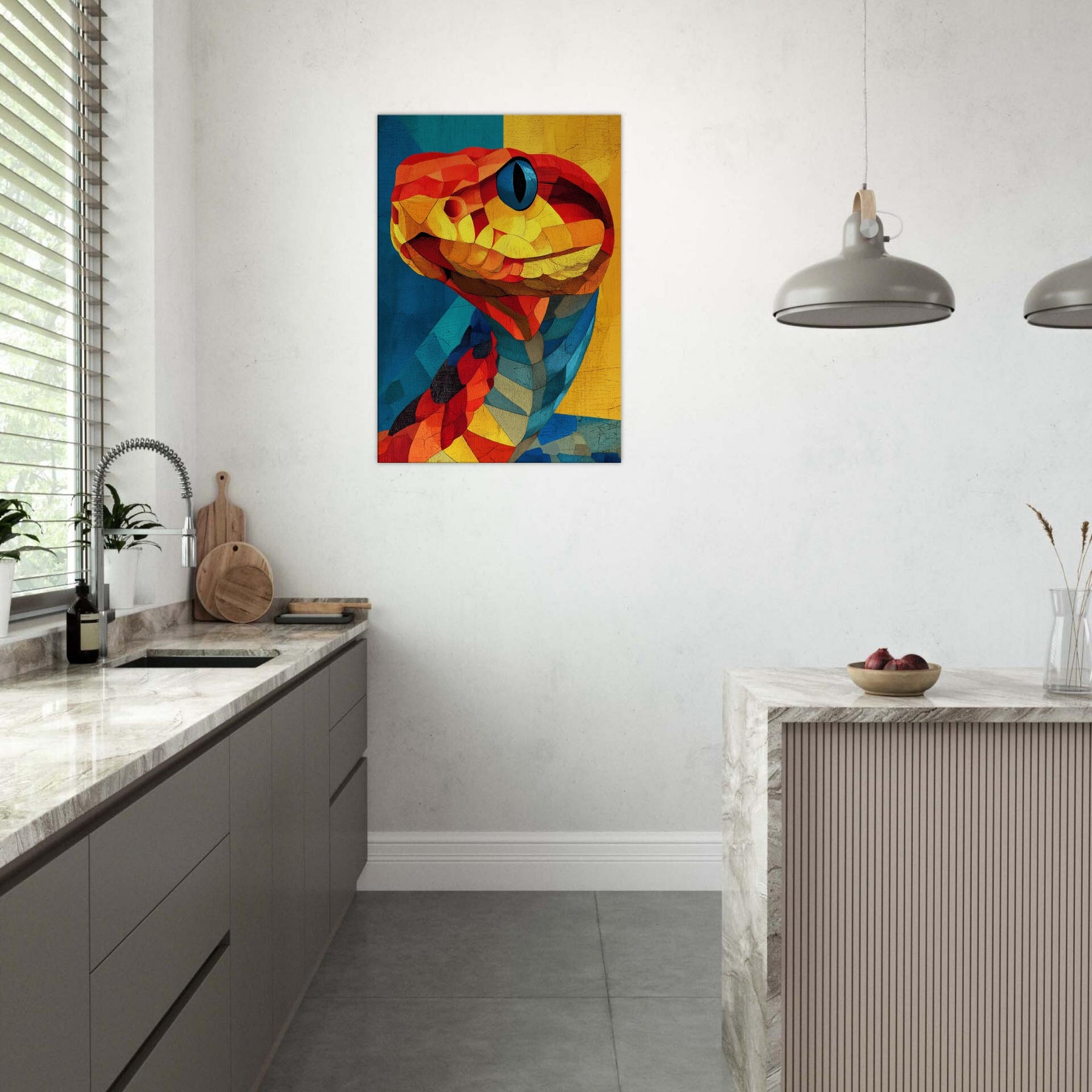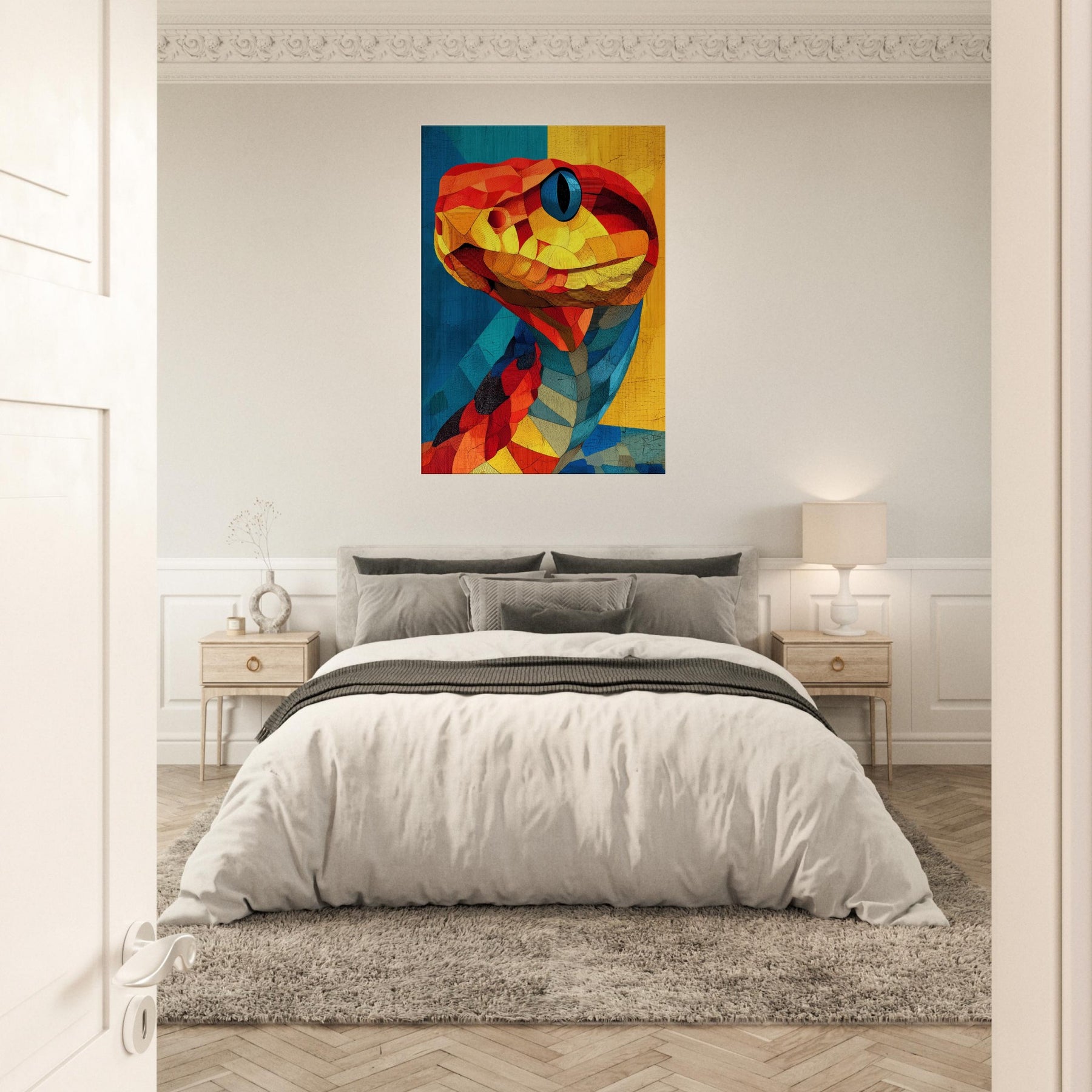An electric study of motion and color, this painting centers a Snake in an intricate mosaic of warm and electric tones. The composition pulses with energy as each shard like facet catches light, guiding the eye along serpentine curves. It elevates a living room or study with a sense of glamour and dynamism, inviting conversation and slow reflection. The Snake becomes a guardian of warmth and curiosity, turning ordinary walls into a vivid, breathing where color and form meet.