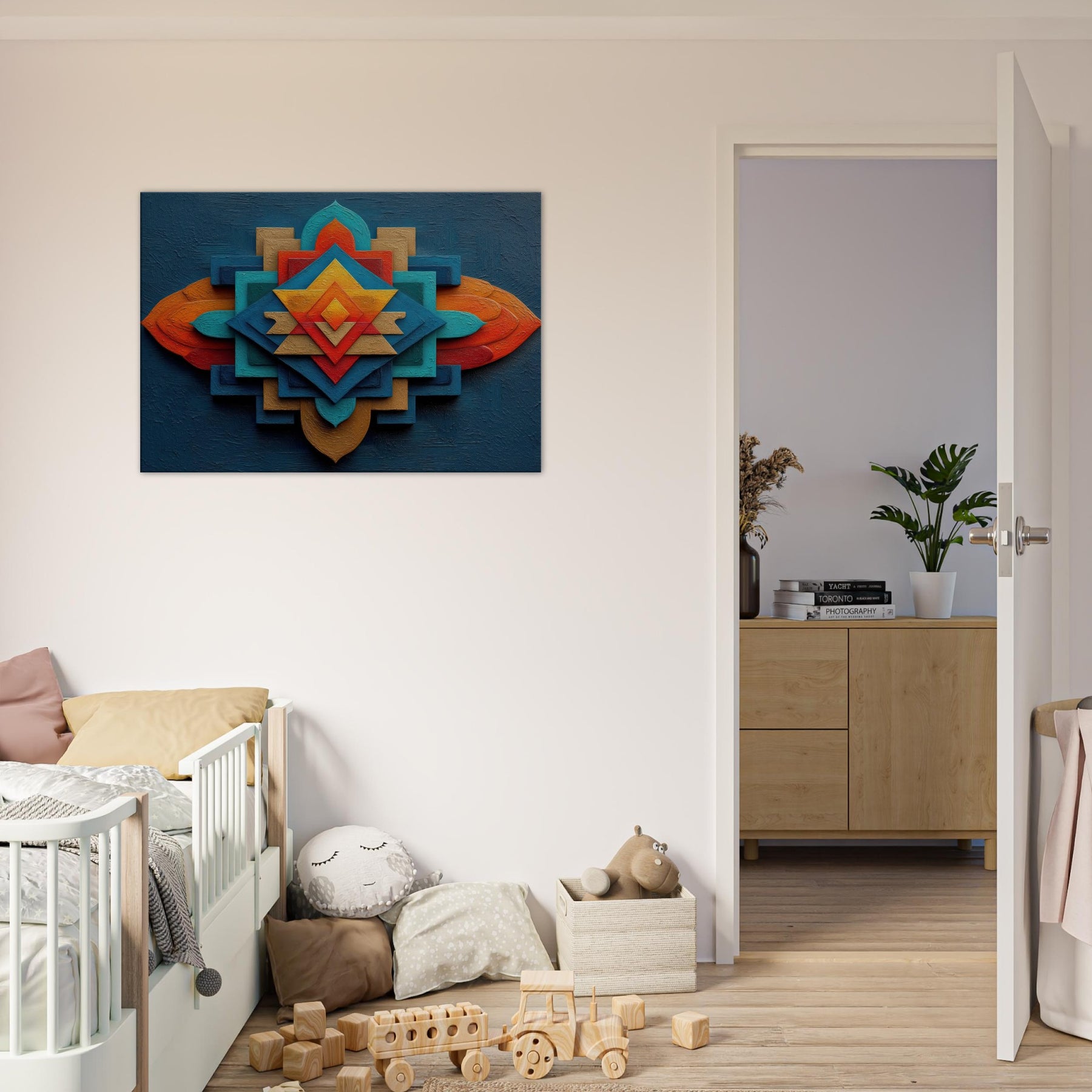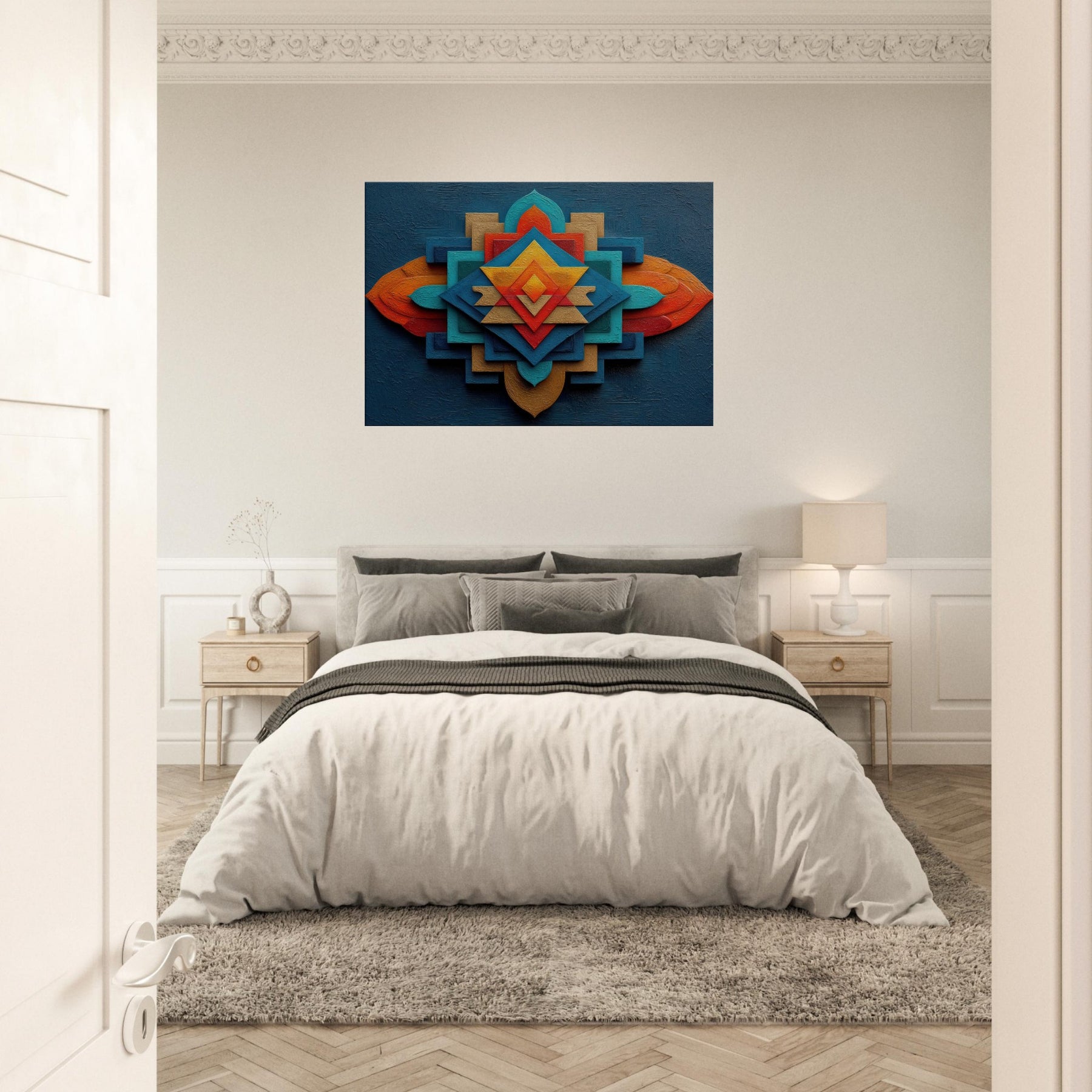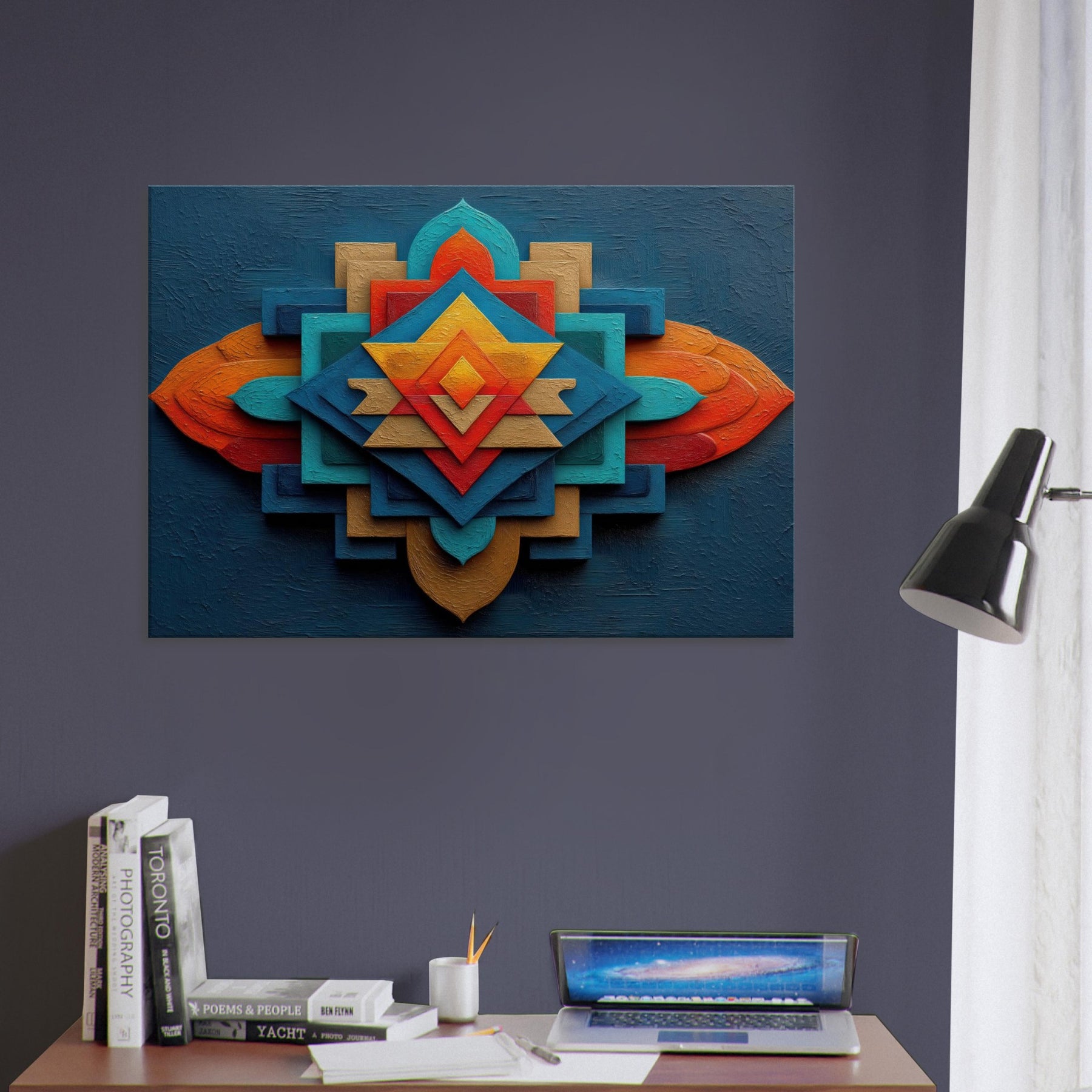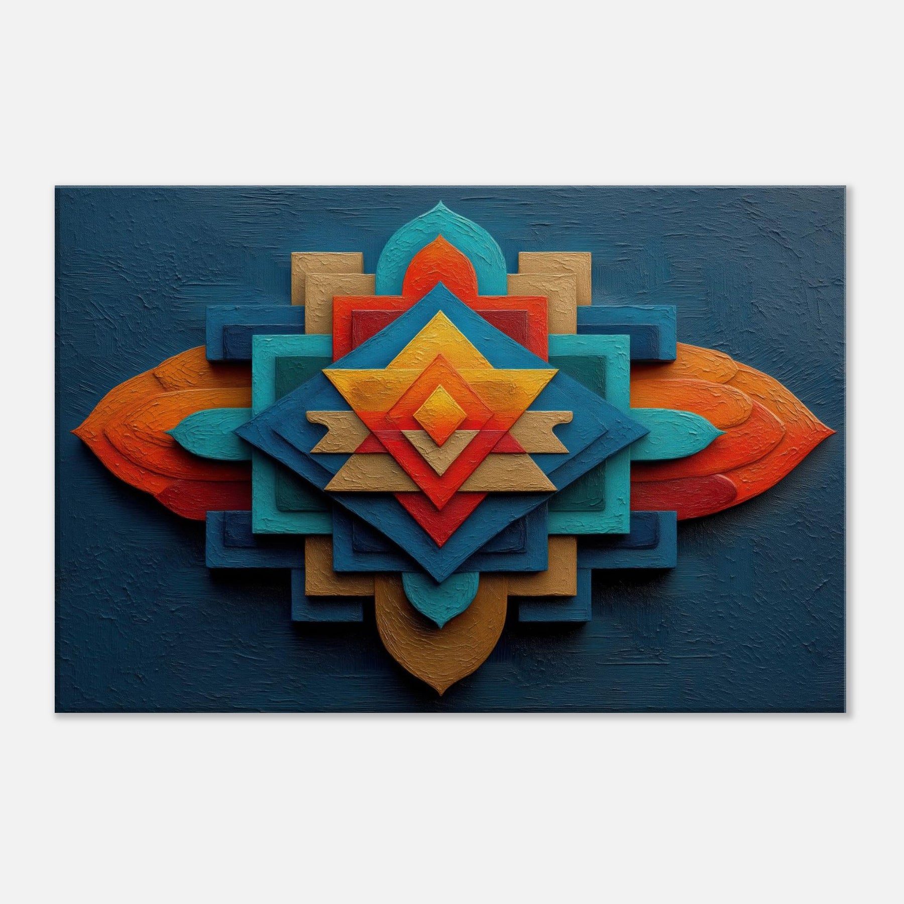An abstract meditation in color and geometry, the Sri Yantra unfolds as a radiant mandala. Layers of intersecting planes fuse light and shadow, giving the wall a breathing, contemplative energy. The textured depth invites touch and slows the pace, turning a living room into a sanctuary of calm and curiosity. Hang this piece where drama and quiet meet a luminous guide for daily rituals, conversations, and moments of stillness that elevate the space.