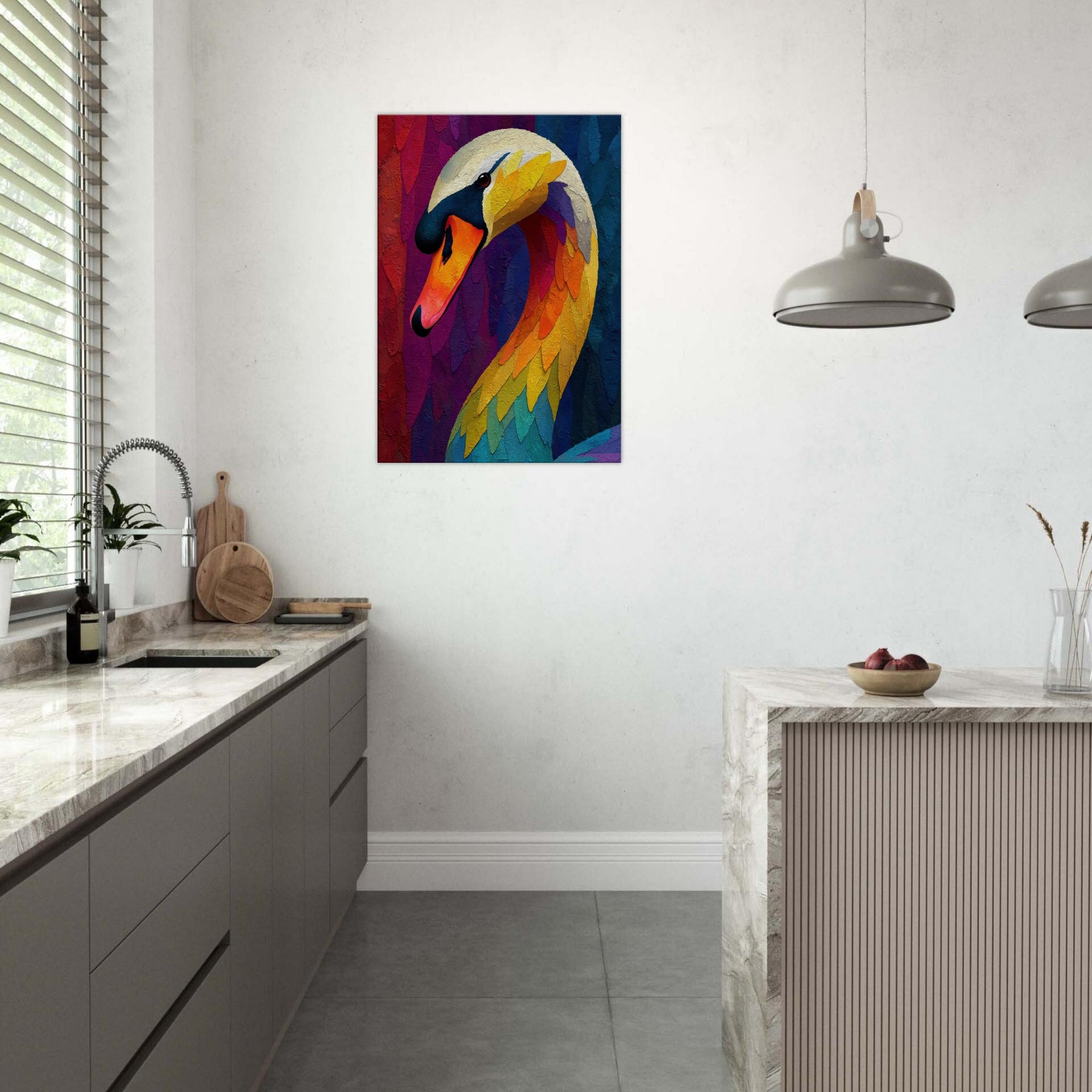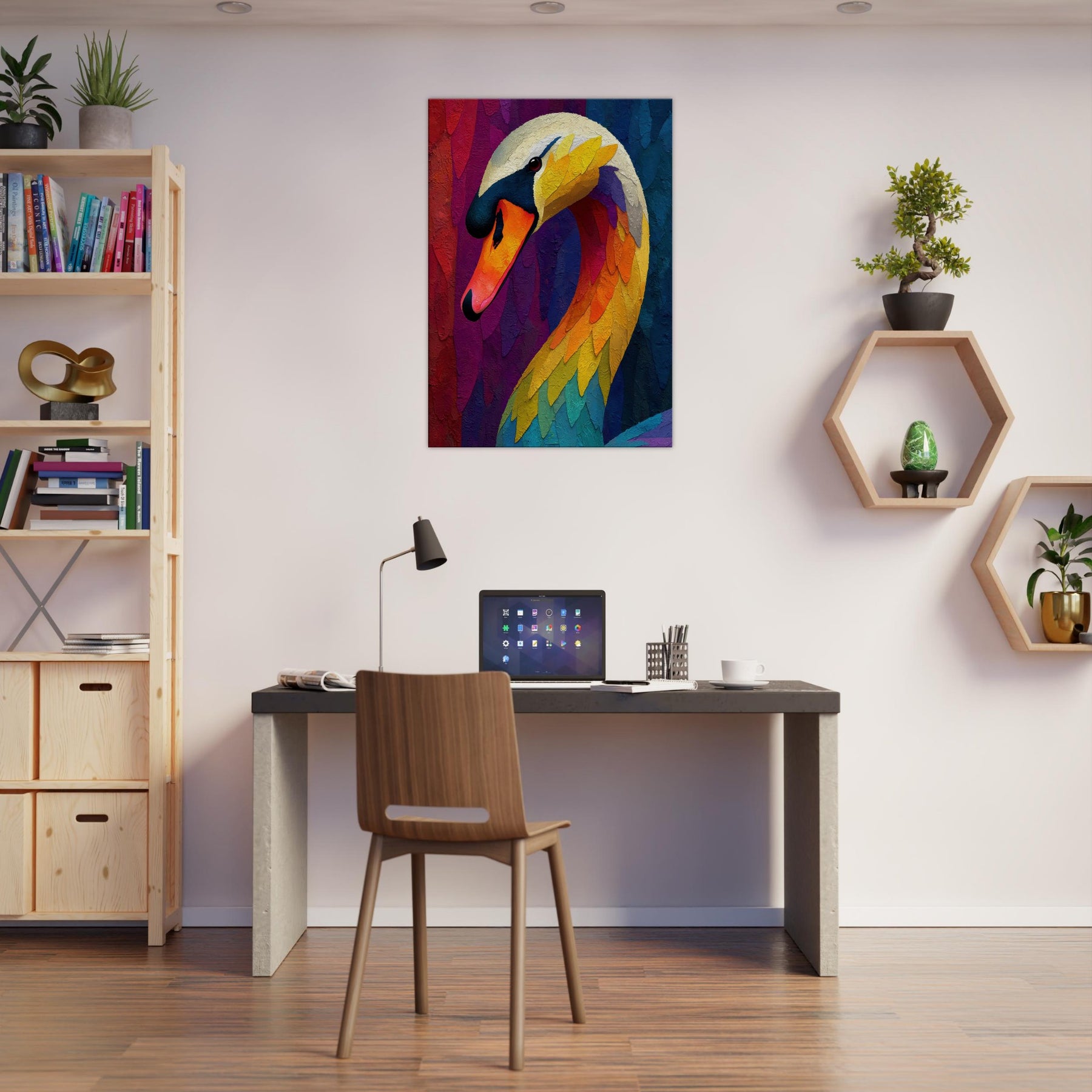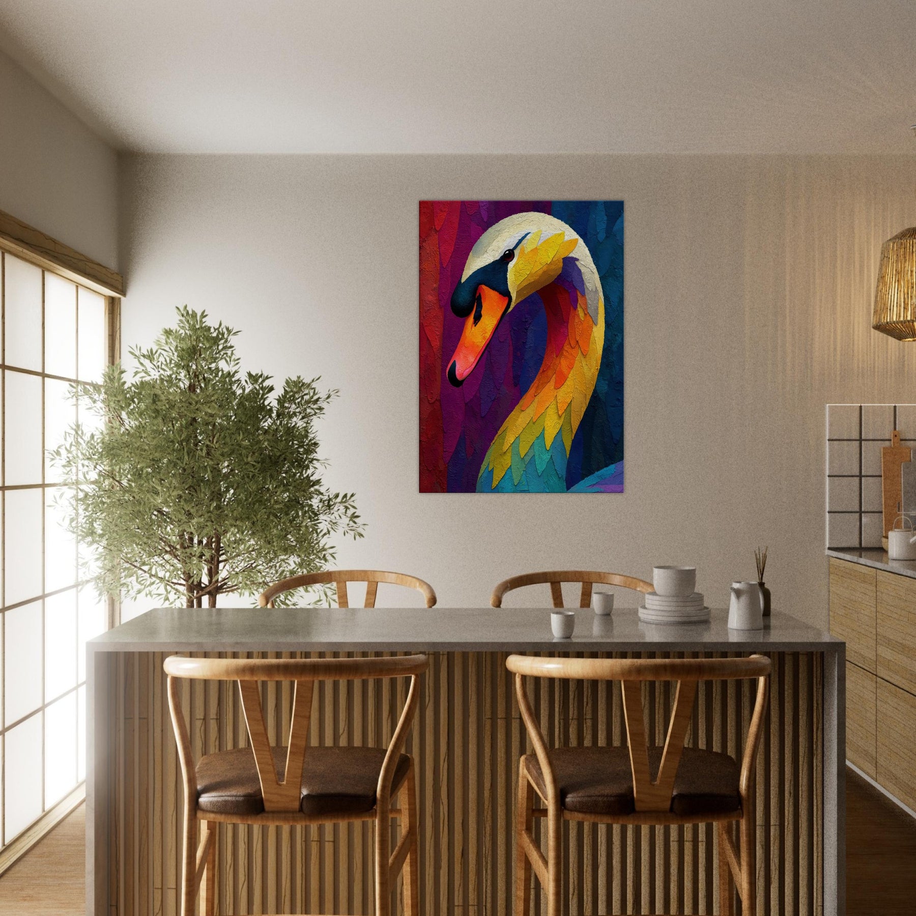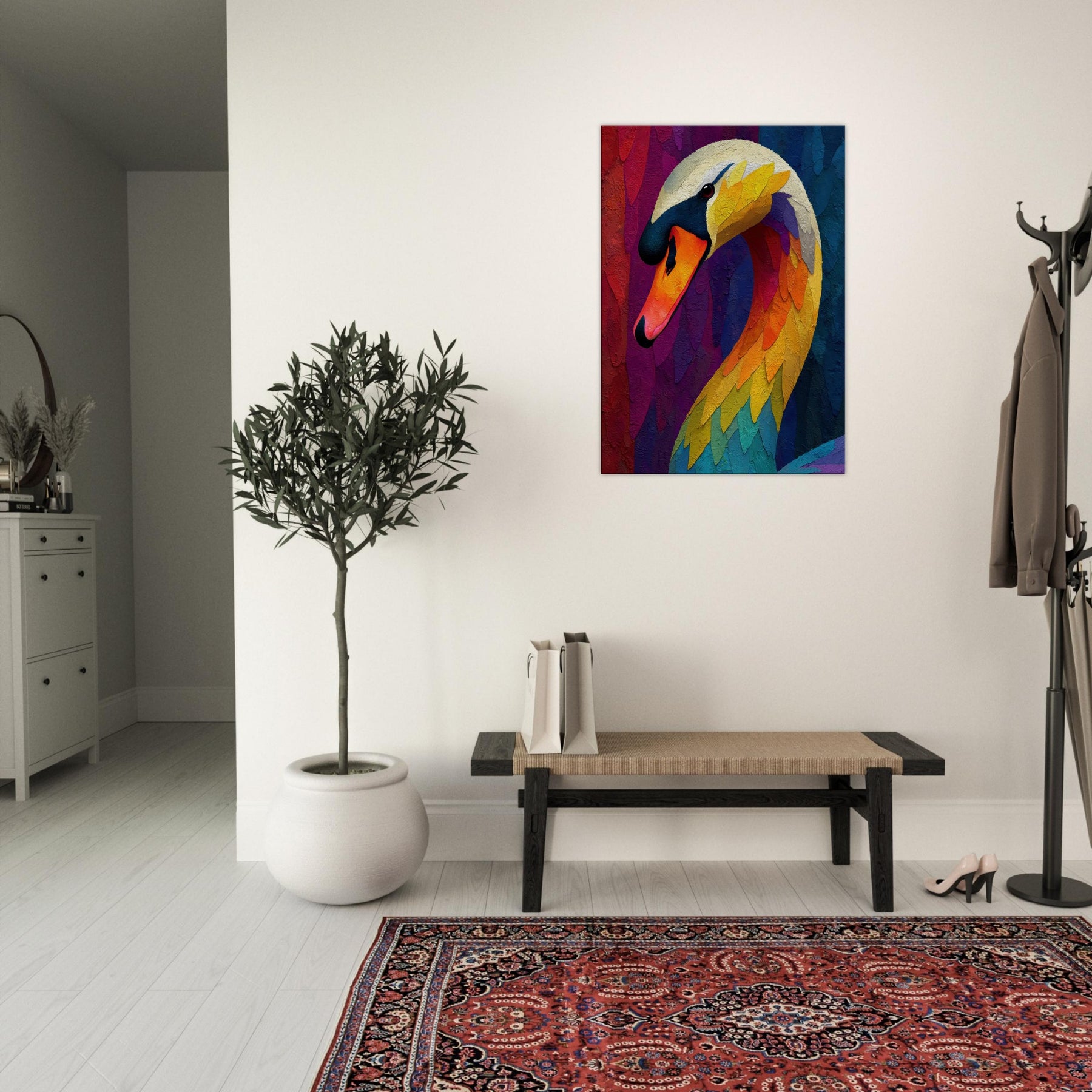 Let this Swan drift into your living space as a radiant meditation. The mosaic textures catch light and shadow in a symphony of sunset tones, from coral to emerald to electric blue, inviting warmth and curiosity. This abstract inspired piece breathes movement into still air, a graceful presence that balances calm and energy. Hang it where morning sun softens the room, and watch the Swan become a daily memory of grace and color, transforming any wall into a sanctuary.