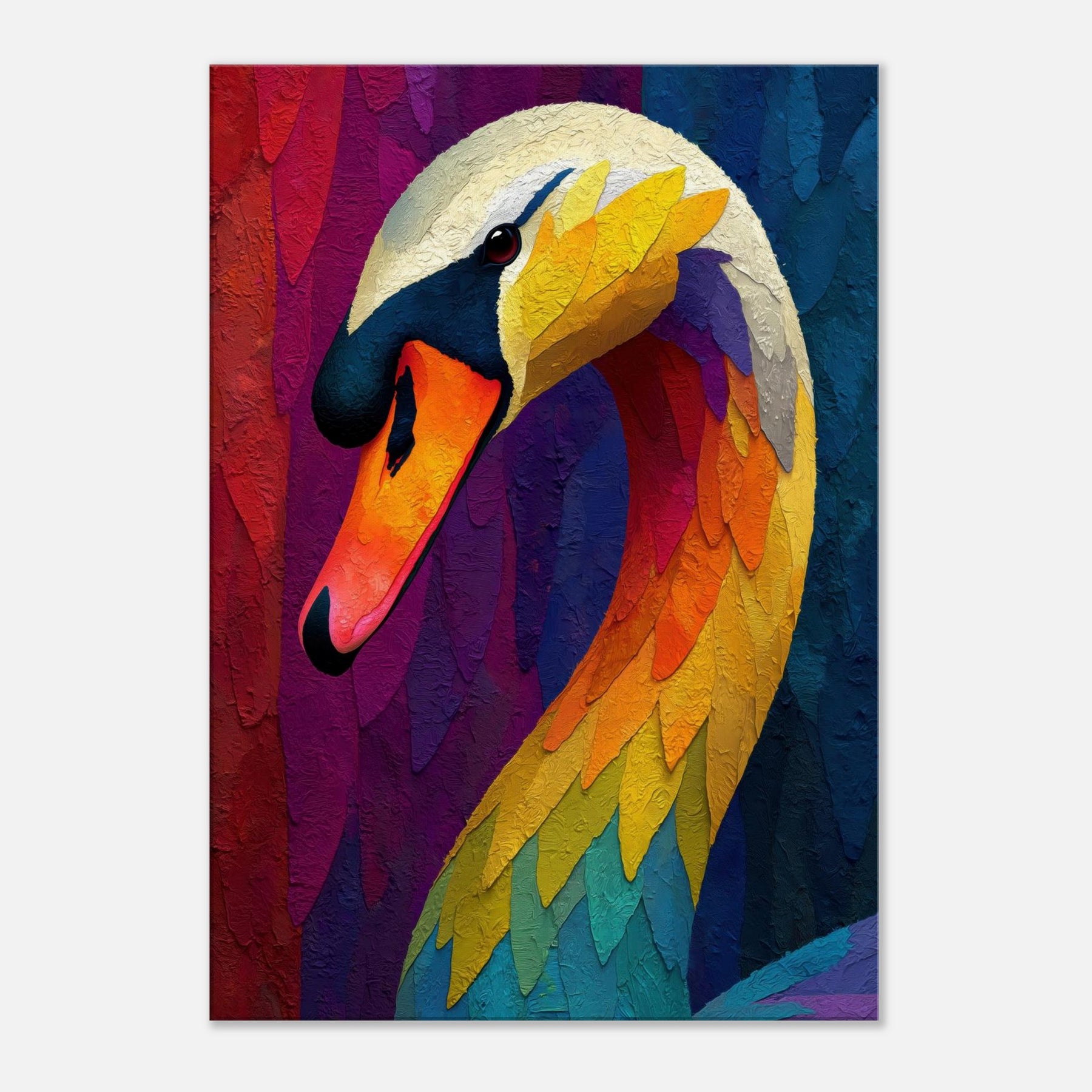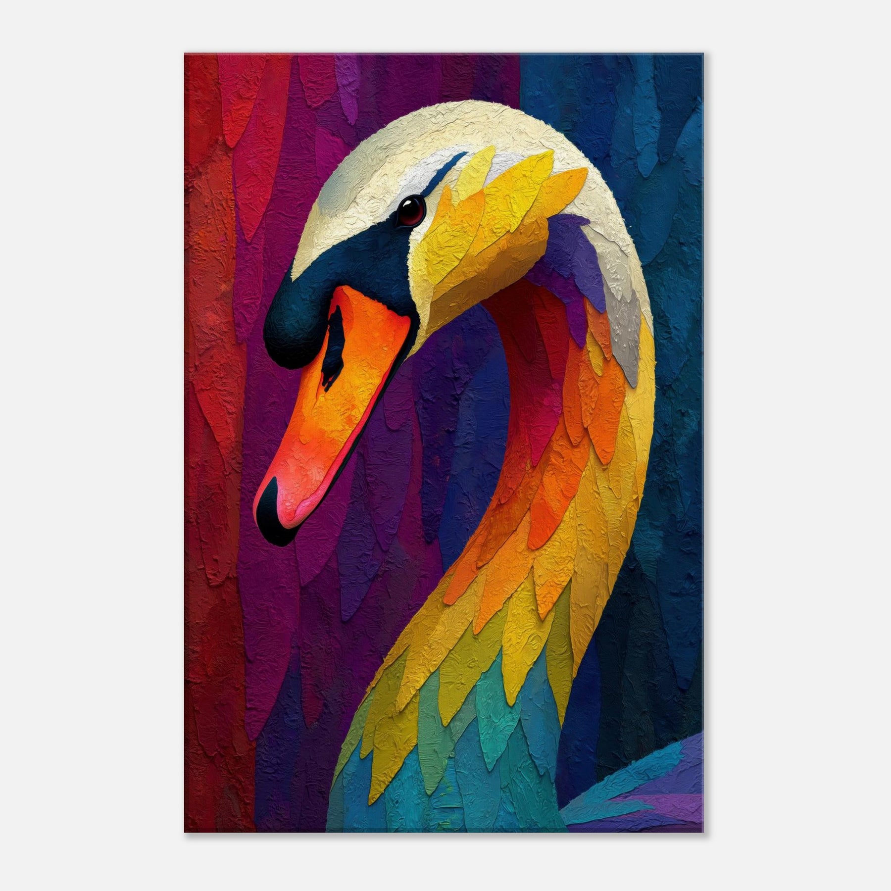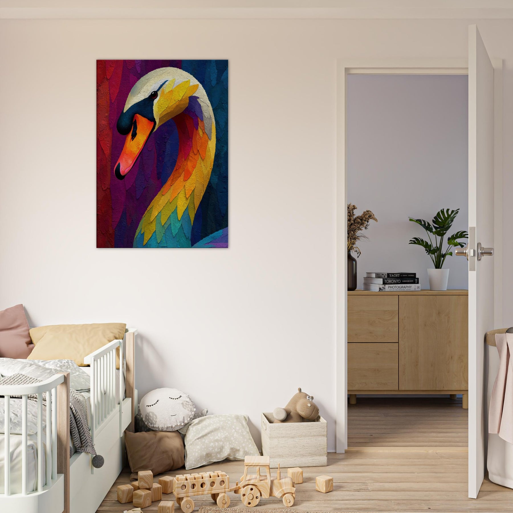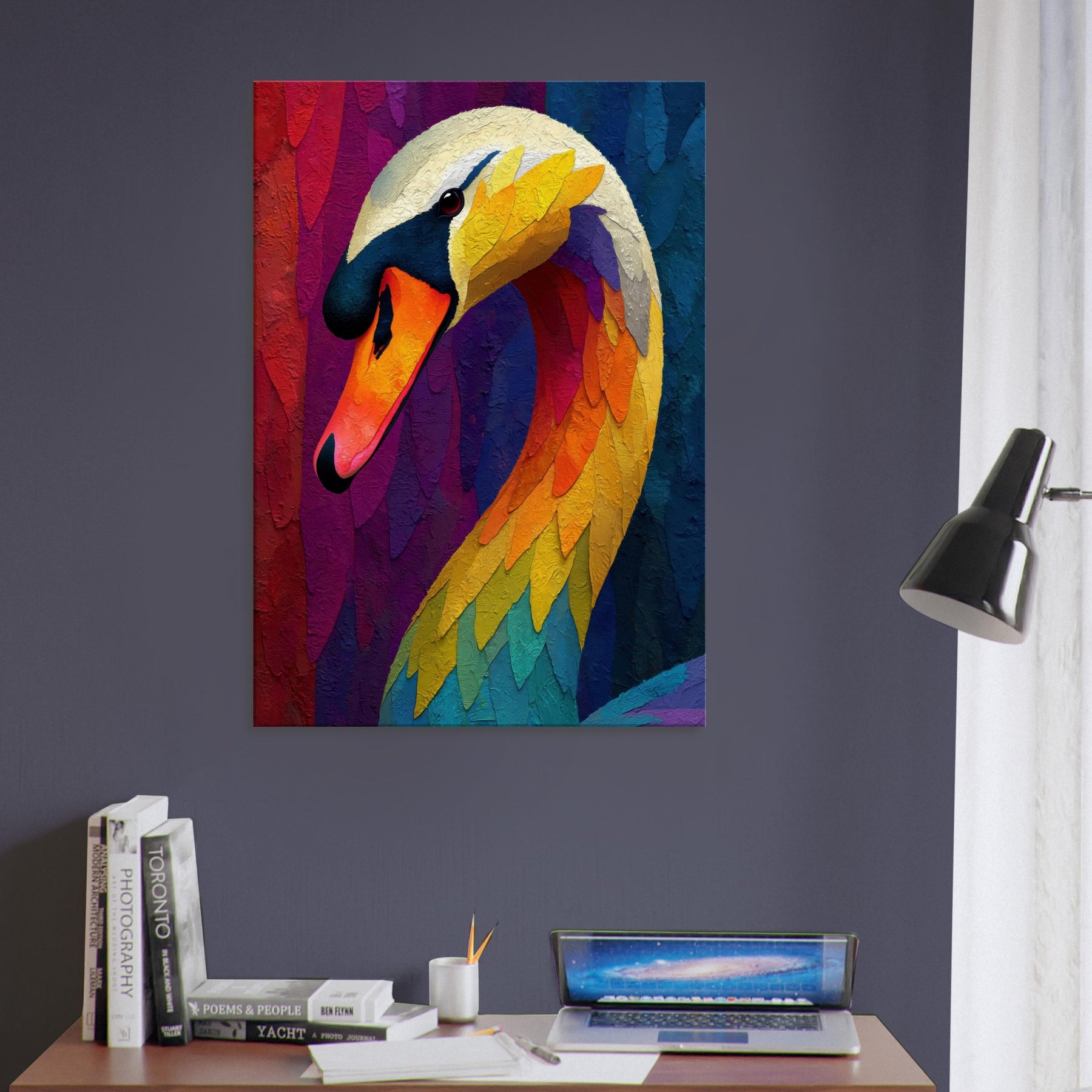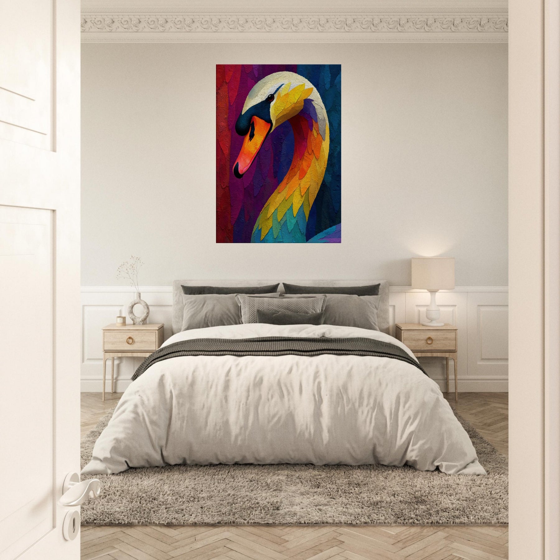 Let this Swan drift into your living space as a radiant meditation. The mosaic textures catch light and shadow in a symphony of sunset tones, from coral to emerald to electric blue, inviting warmth and curiosity. This abstract inspired piece breathes movement into still air, a graceful presence that balances calm and energy. Hang it where morning sun softens the room, and watch the Swan become a daily memory of grace and color, transforming any wall into a sanctuary.