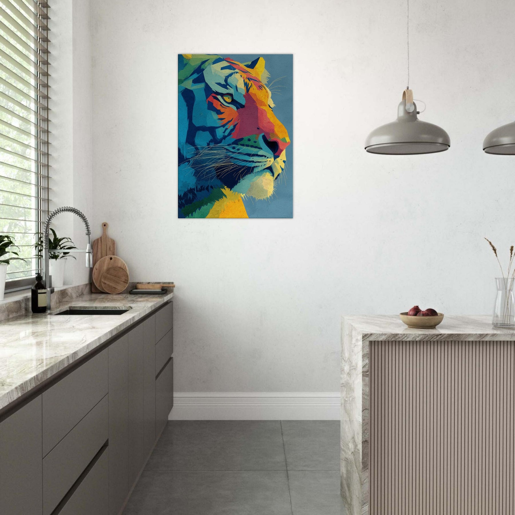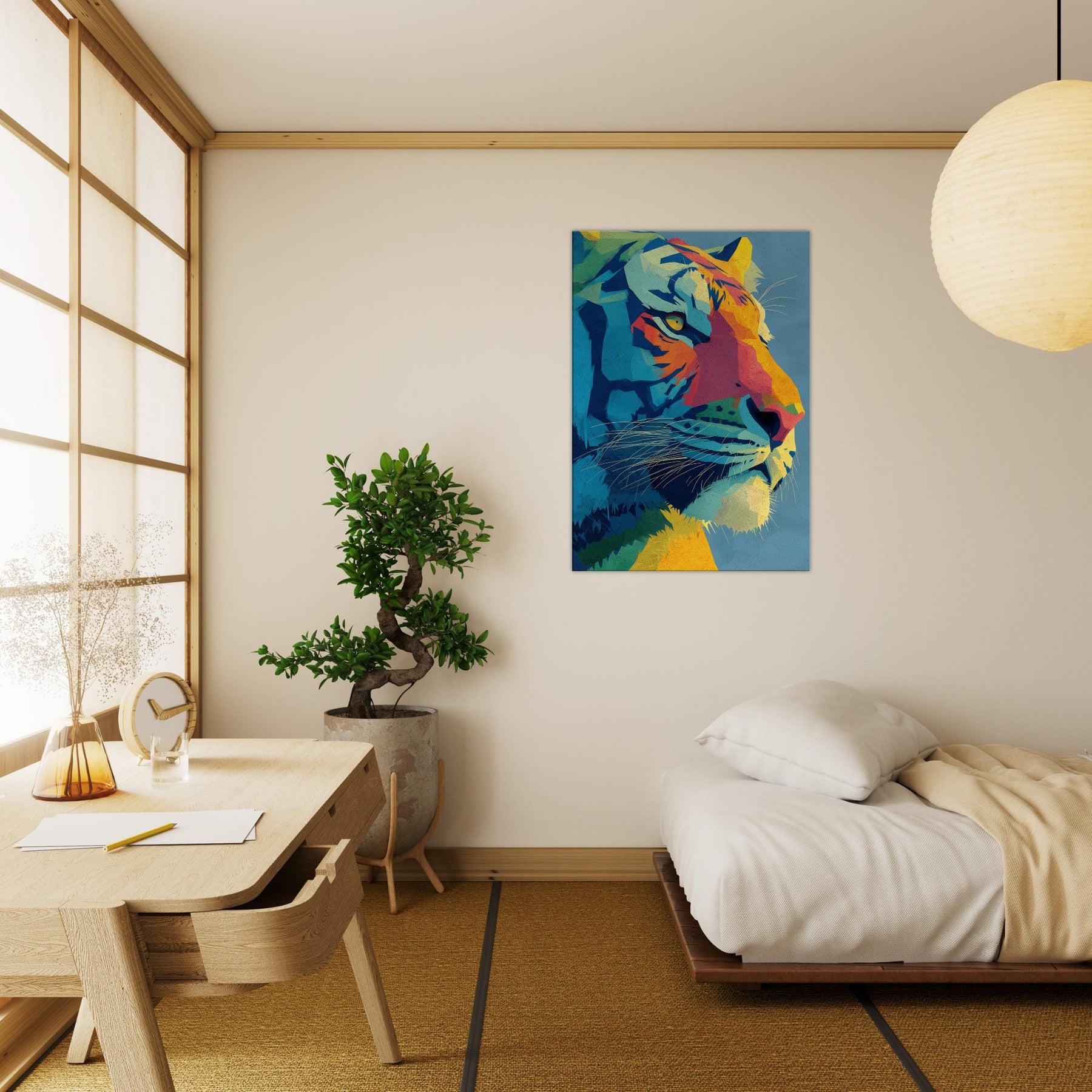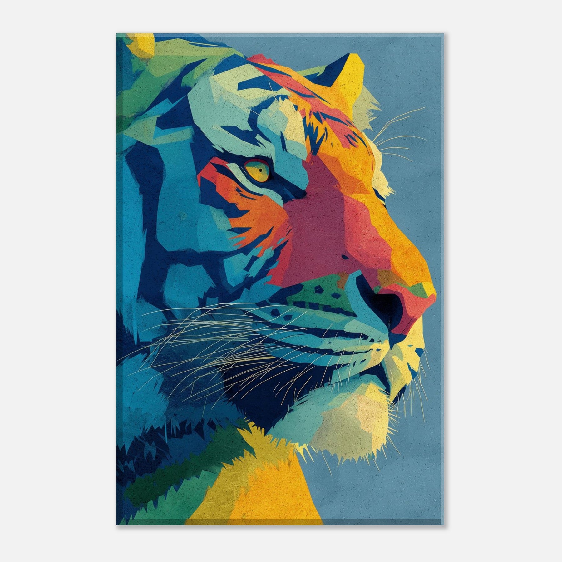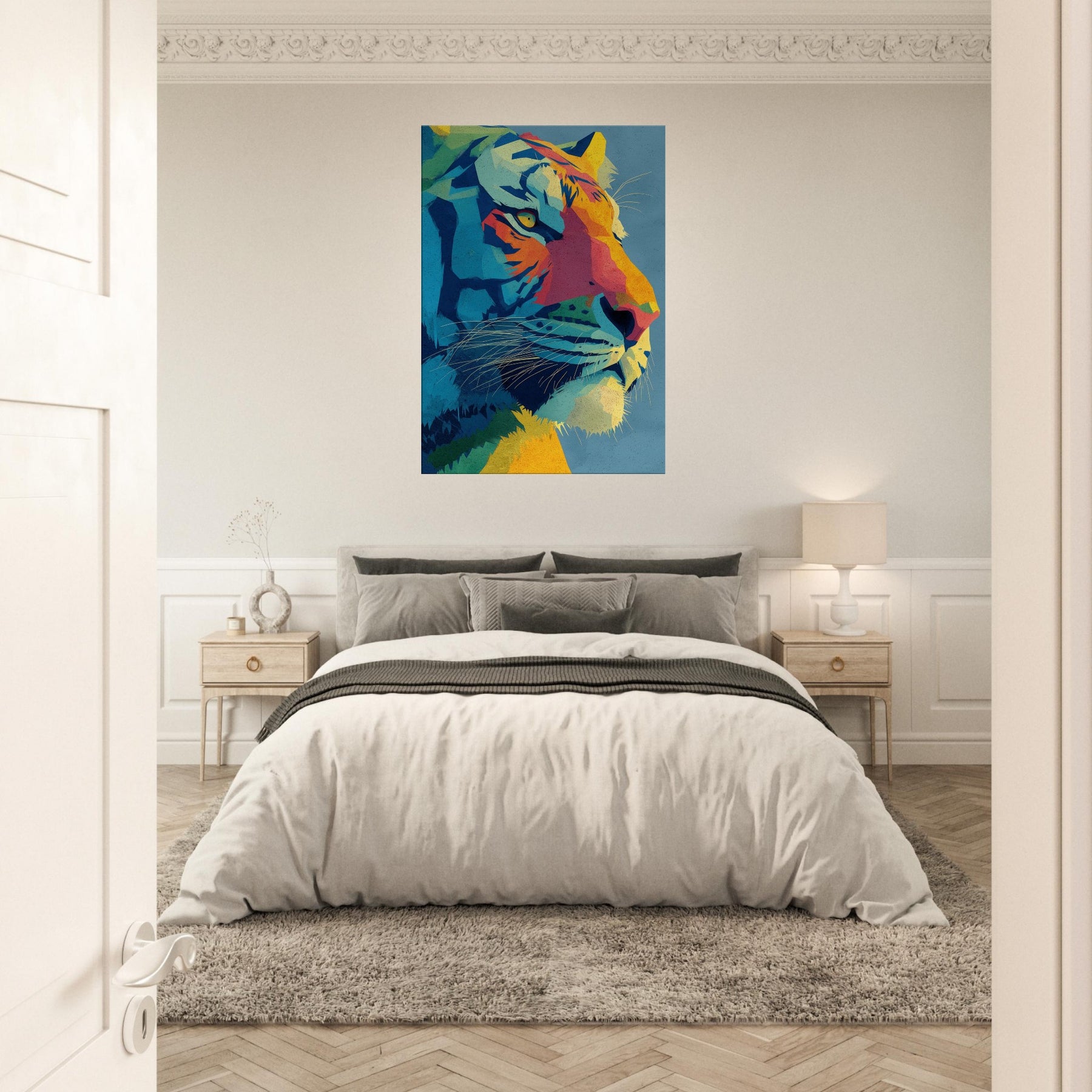 Let the Tiger's face rise from a mosaic of bold planes and luminous hues, inviting warmth and movement into your space. This abstract dissolves form into color amber, teal, cobalt, and coral weaving a nocturnal sunrise. The result is not just a palette but a mood: calm confidence, exotic energy, and a whisper of wild elegance. Hang it in a living room or study to spark conversation, inspire focus, and make every wall feel alive with light and presence.
