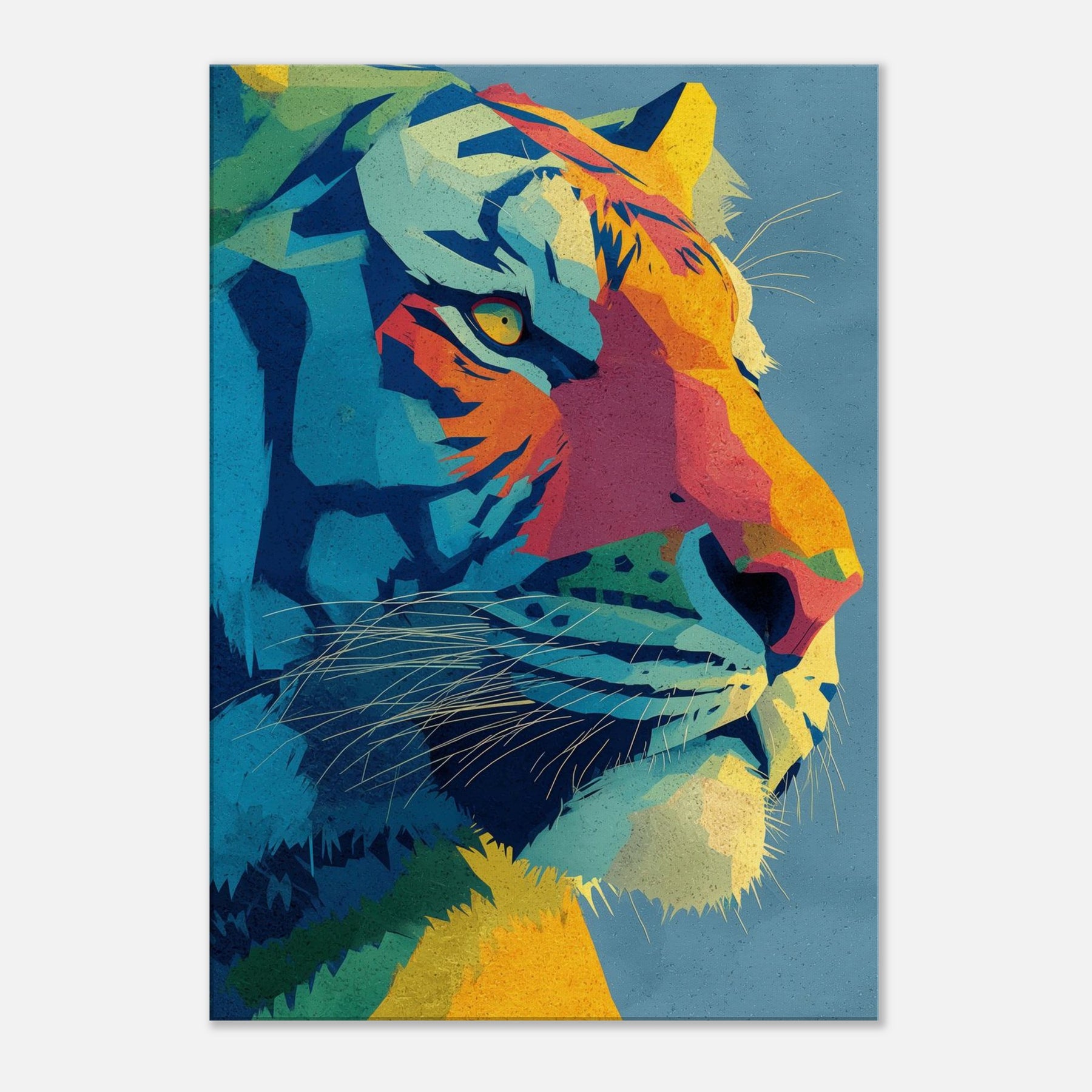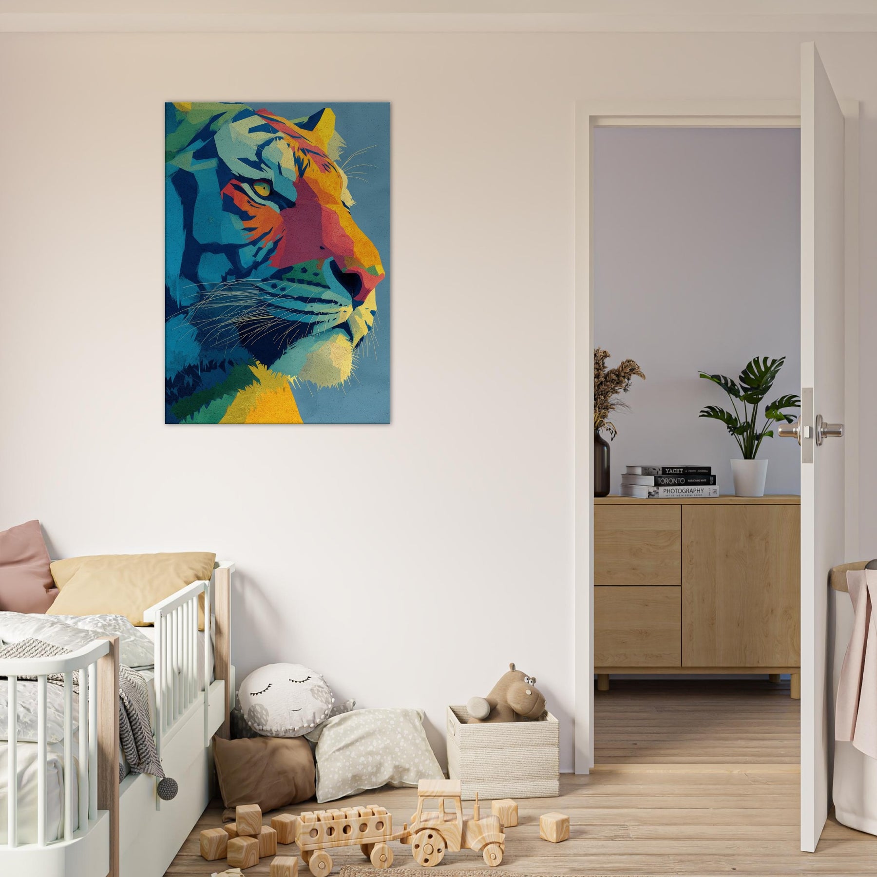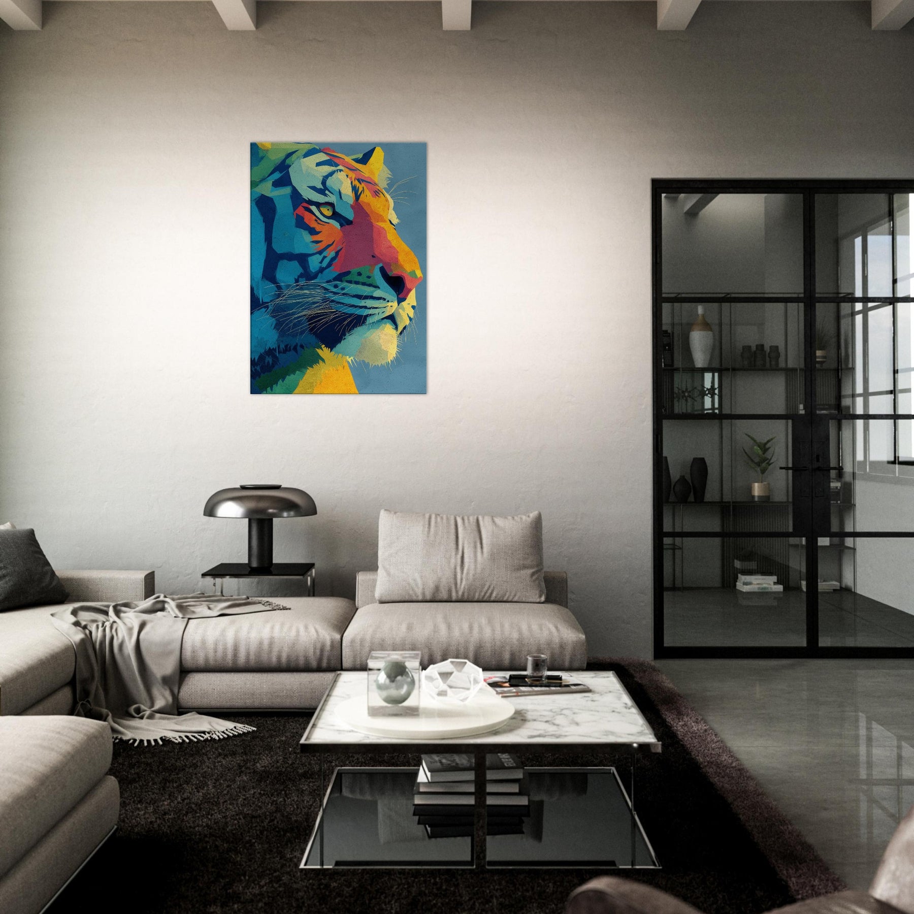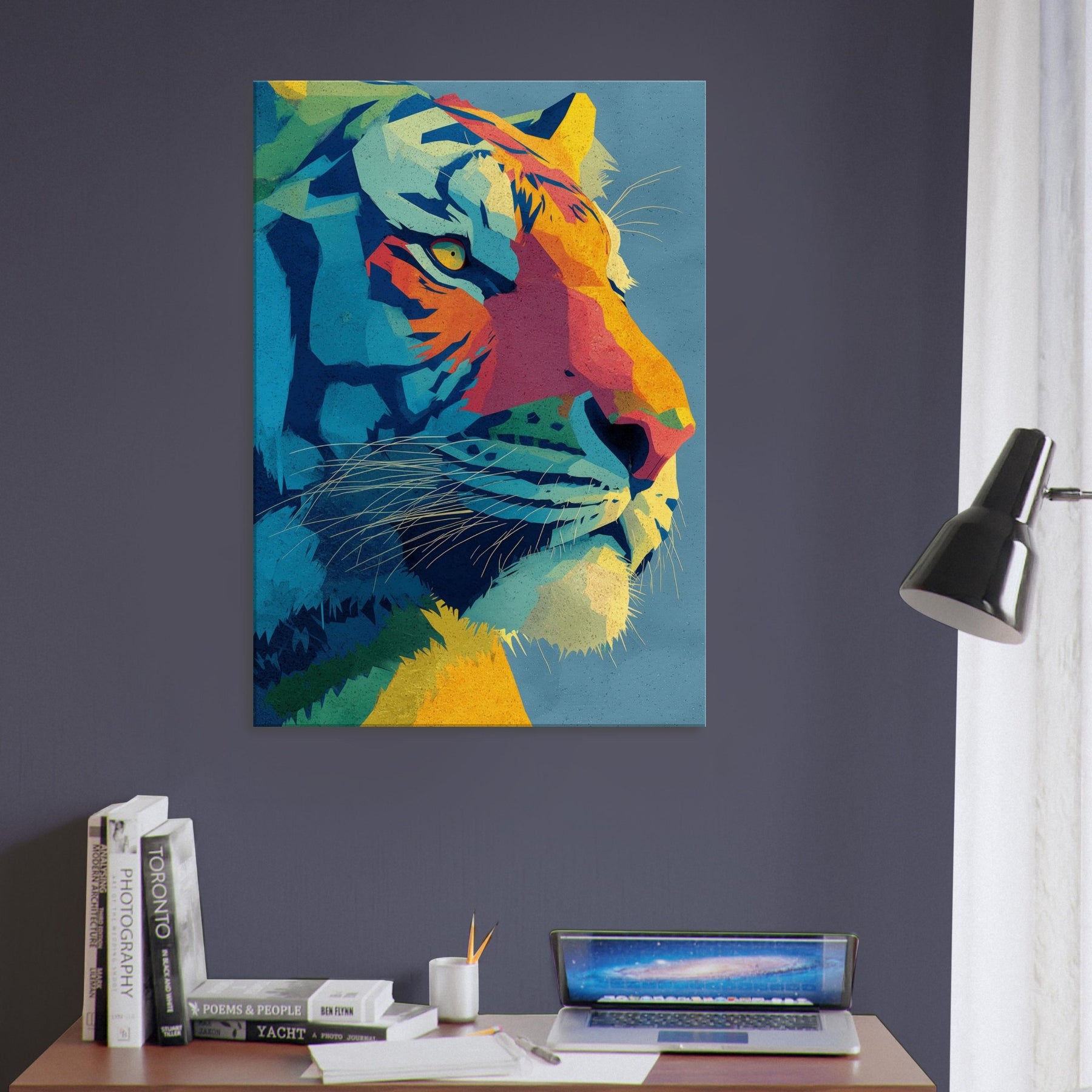 Let the Tiger's face rise from a mosaic of bold planes and luminous hues, inviting warmth and movement into your space. This abstract dissolves form into color amber, teal, cobalt, and coral weaving a nocturnal sunrise. The result is not just a palette but a mood: calm confidence, exotic energy, and a whisper of wild elegance. Hang it in a living room or study to spark conversation, inspire focus, and make every wall feel alive with light and presence.