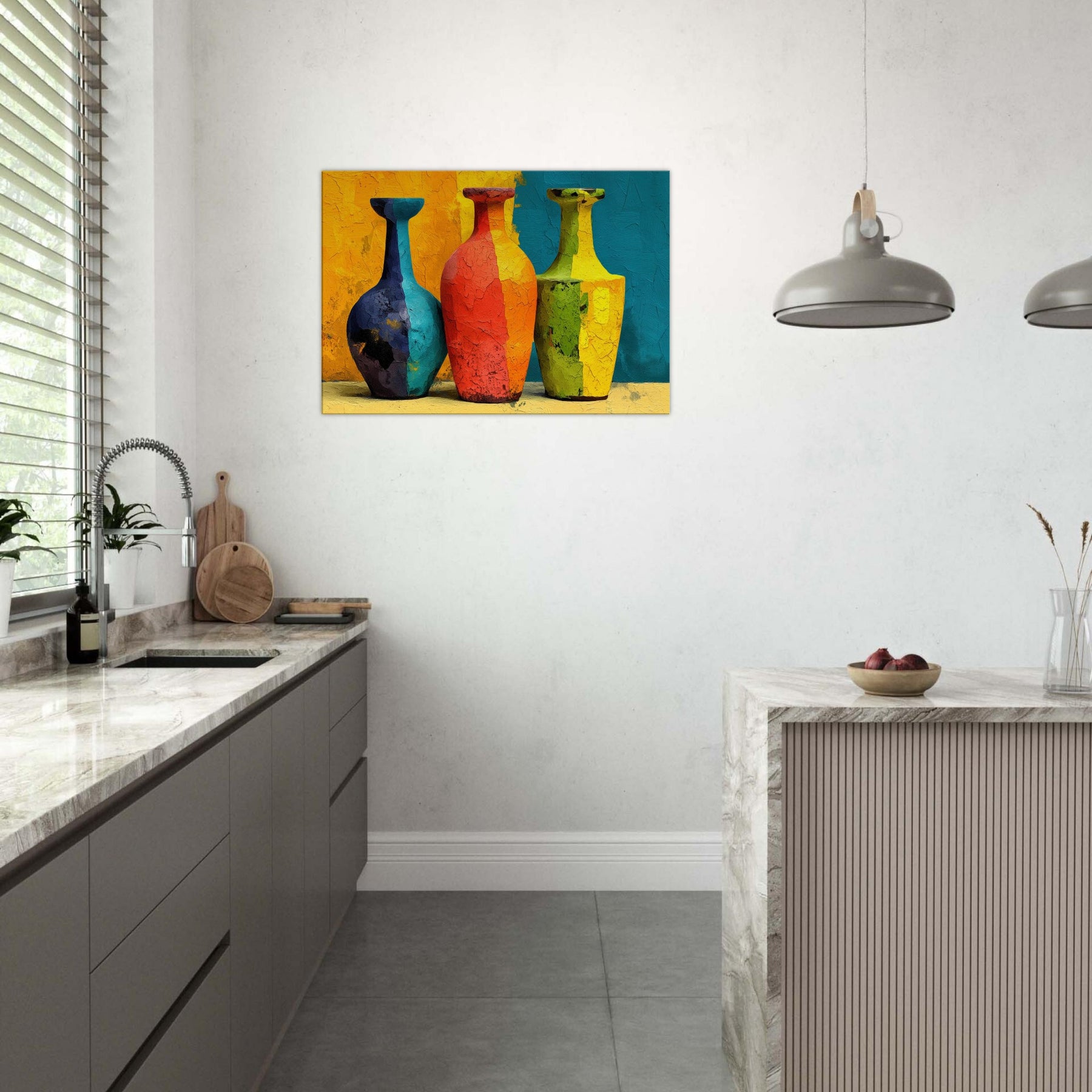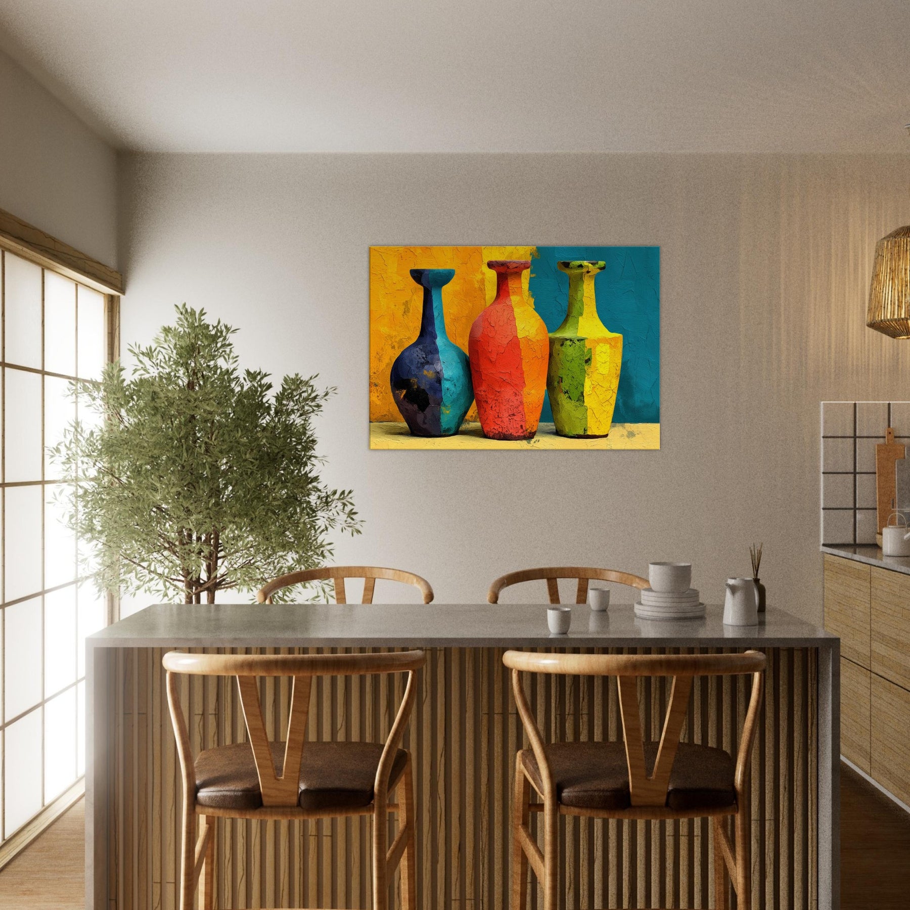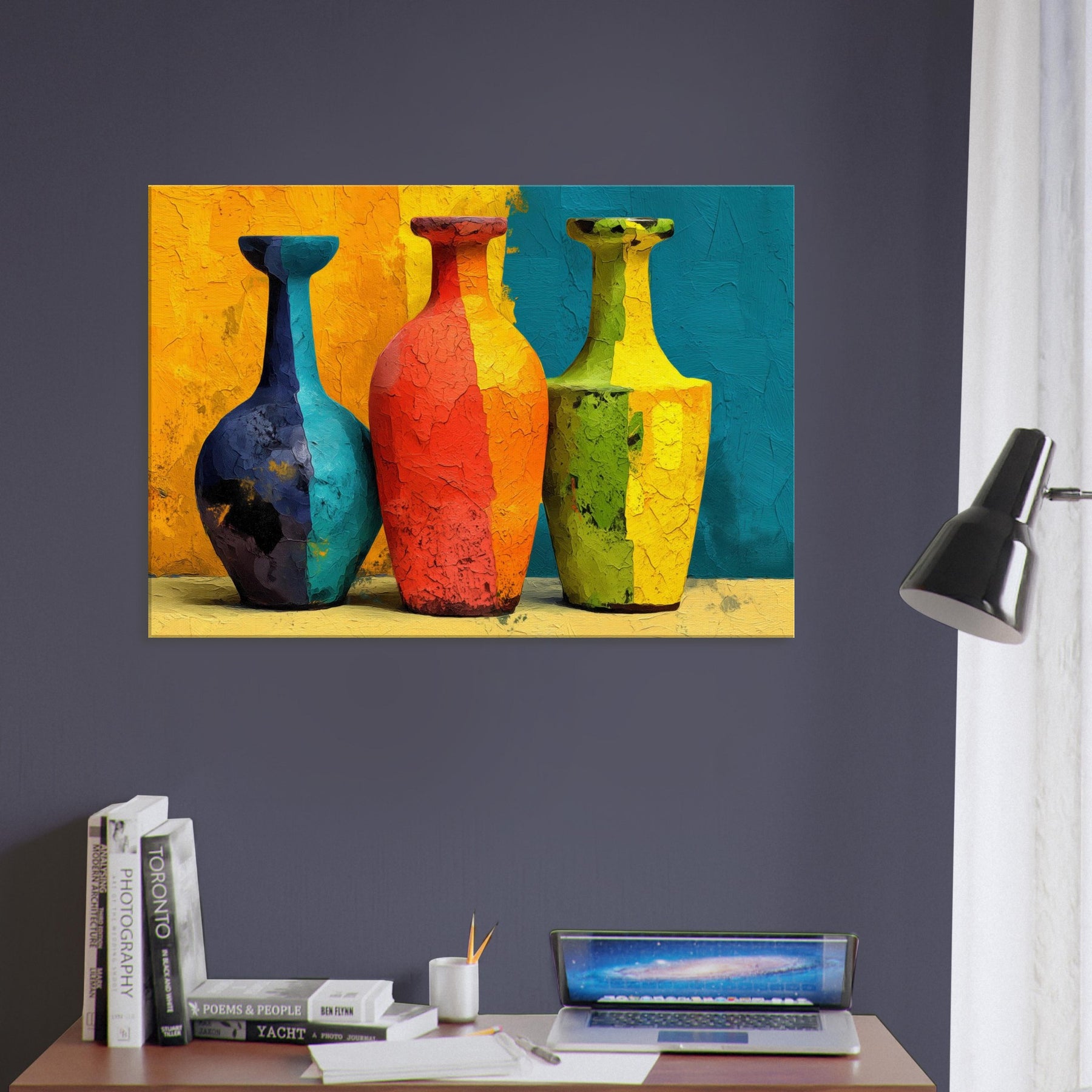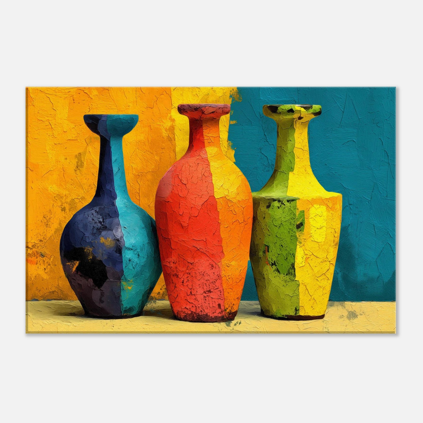 Vase Trio gathers three silhouettes in saturated hues, casting a playful glow across a textured surface. This abstract arrangement invites the eye to wander from cobalt to coral, lime to amber, as if each vessel holds a whispered mood of the room. The painting's layered cracks catch light, creating tactile echoes that warm everyday moments. Hung in a living room or dining nook, the Vase Trio transforms walls into a gallery of color and calm, a sensory focal point for gathering, conversation, and quiet reflection.