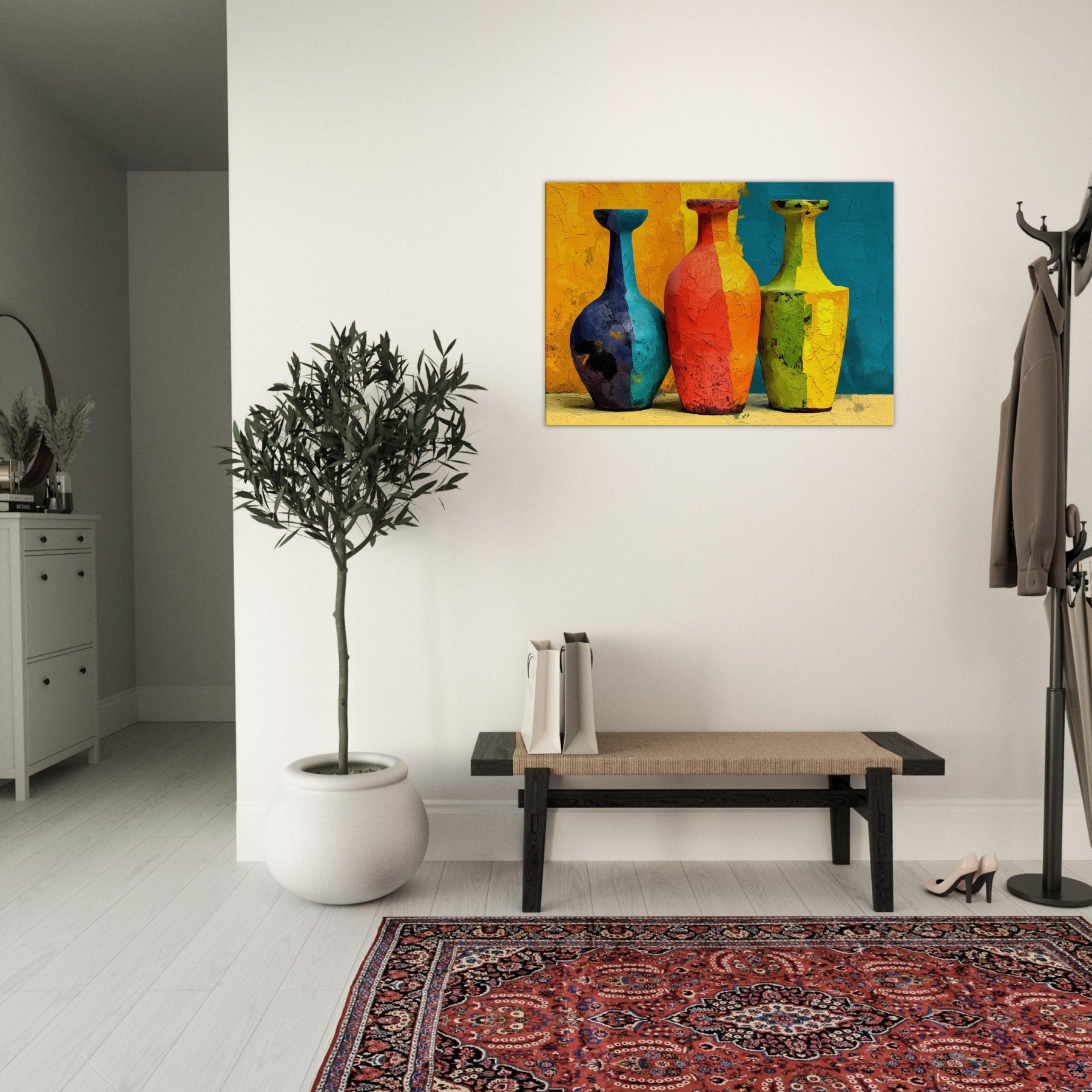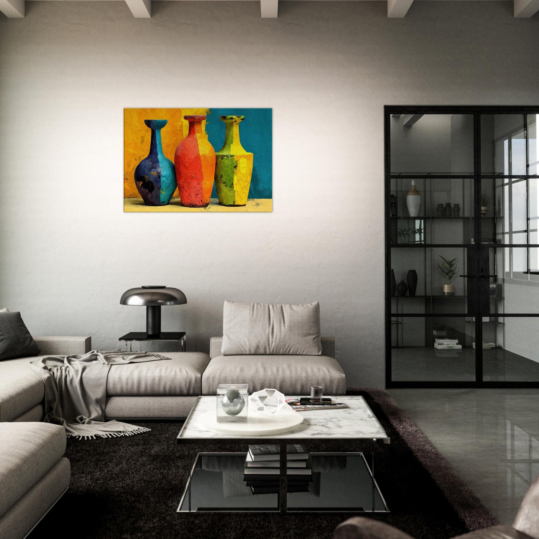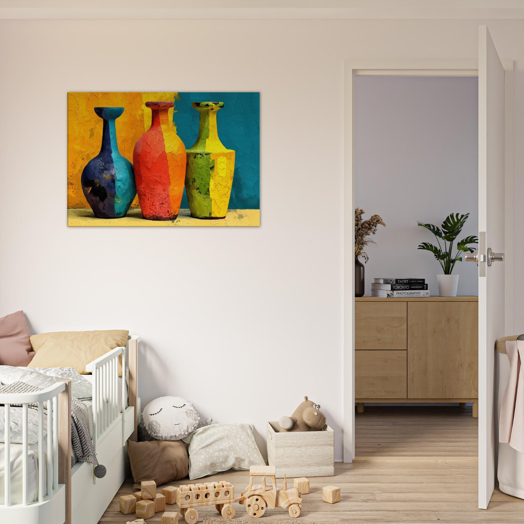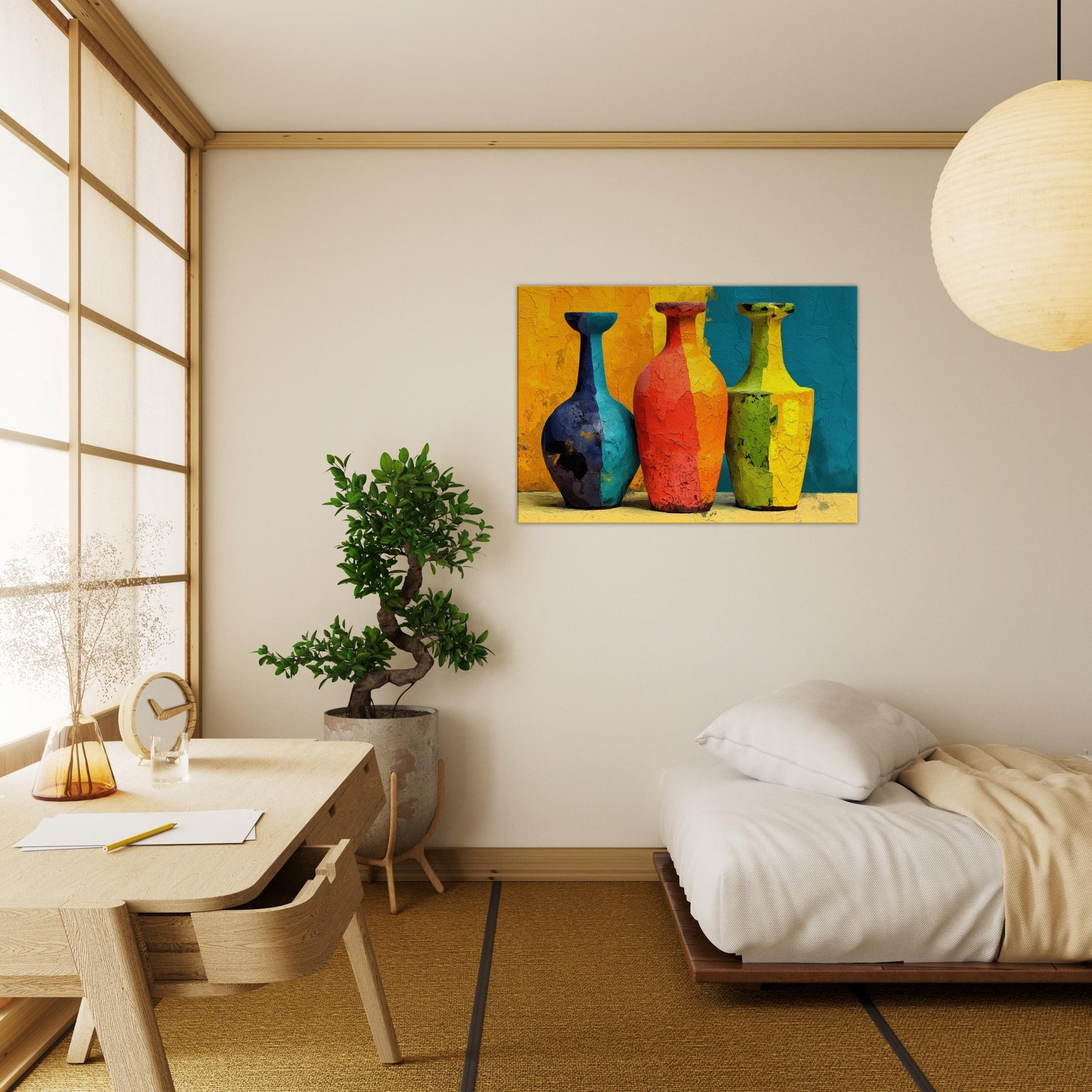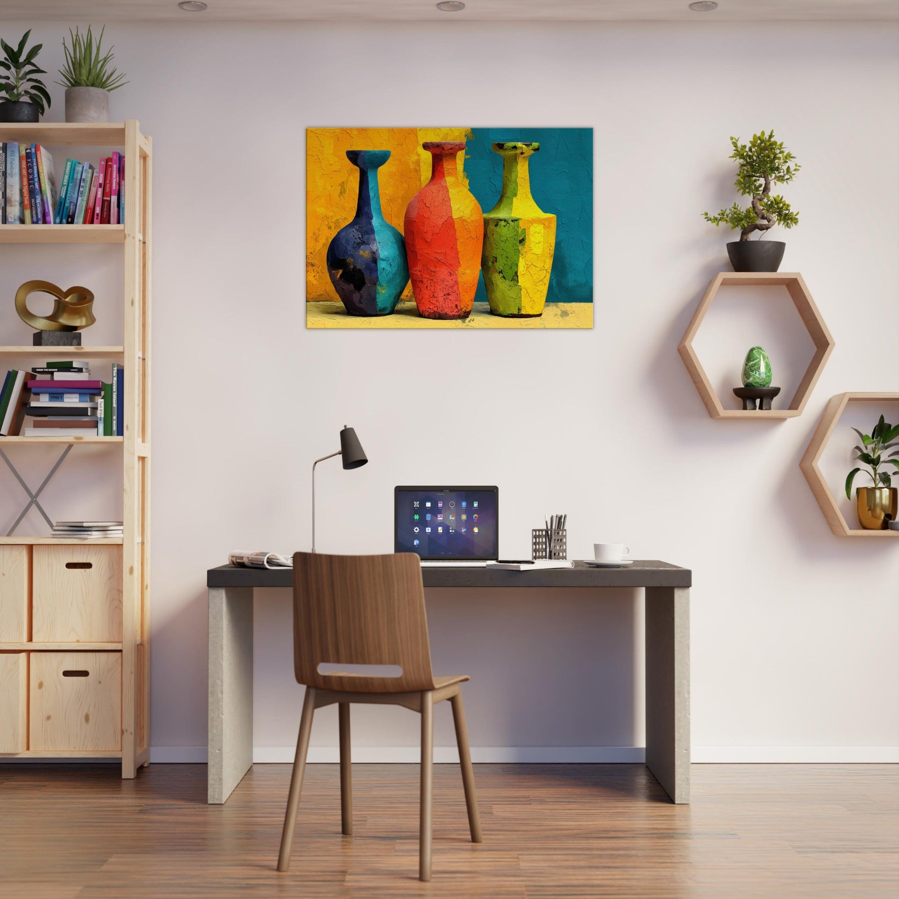 Vase Trio gathers three silhouettes in saturated hues, casting a playful glow across a textured surface. This abstract arrangement invites the eye to wander from cobalt to coral, lime to amber, as if each vessel holds a whispered mood of the room. The painting's layered cracks catch light, creating tactile echoes that warm everyday moments. Hung in a living room or dining nook, the Vase Trio transforms walls into a gallery of color and calm, a sensory focal point for gathering, conversation, and quiet reflection.