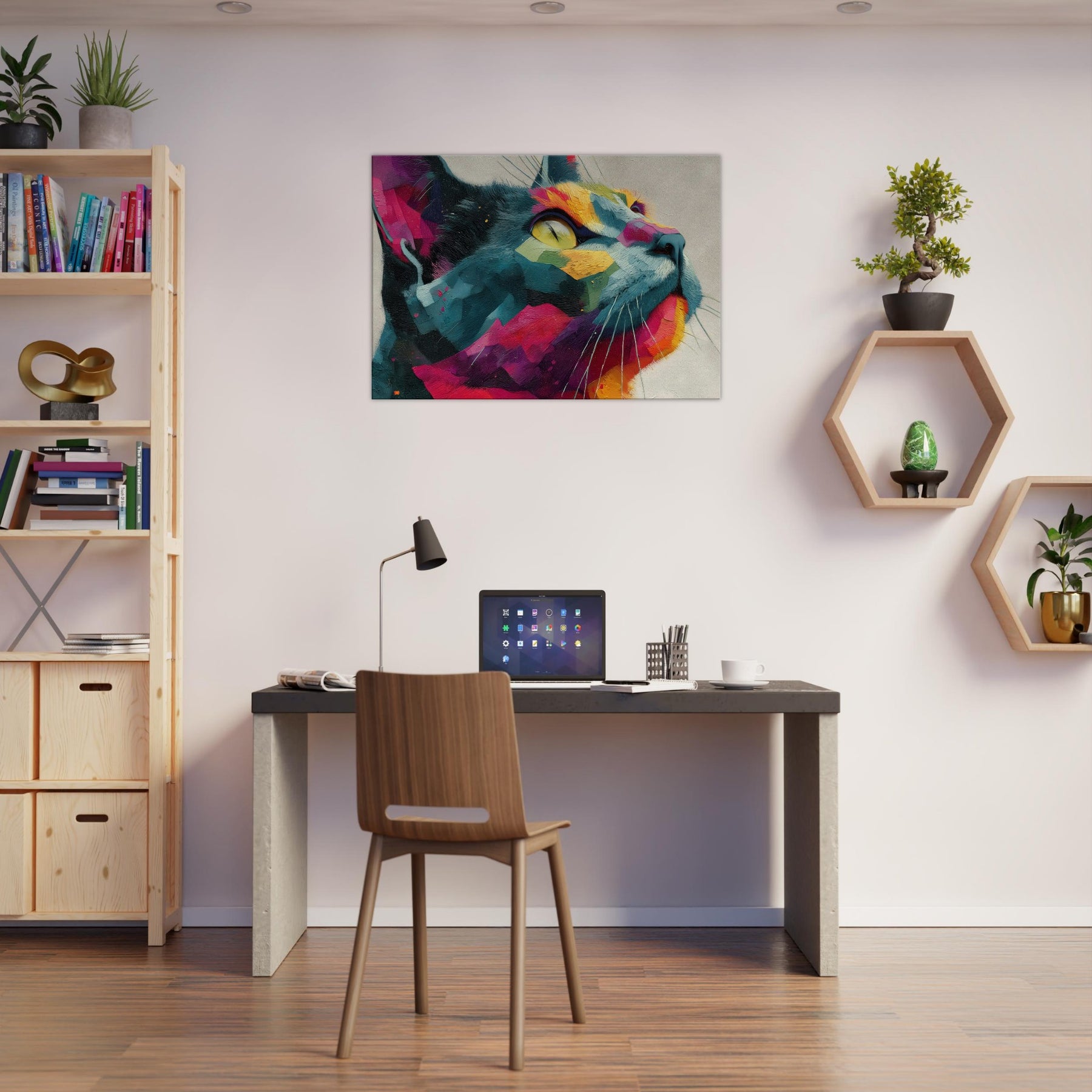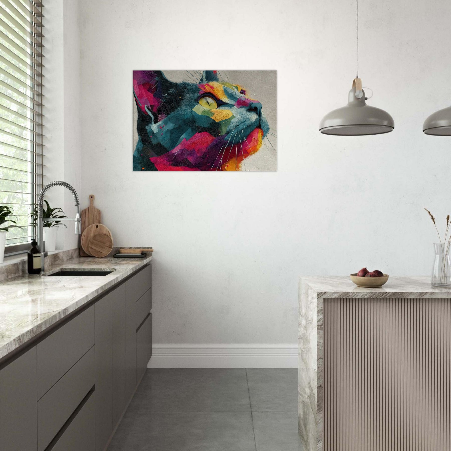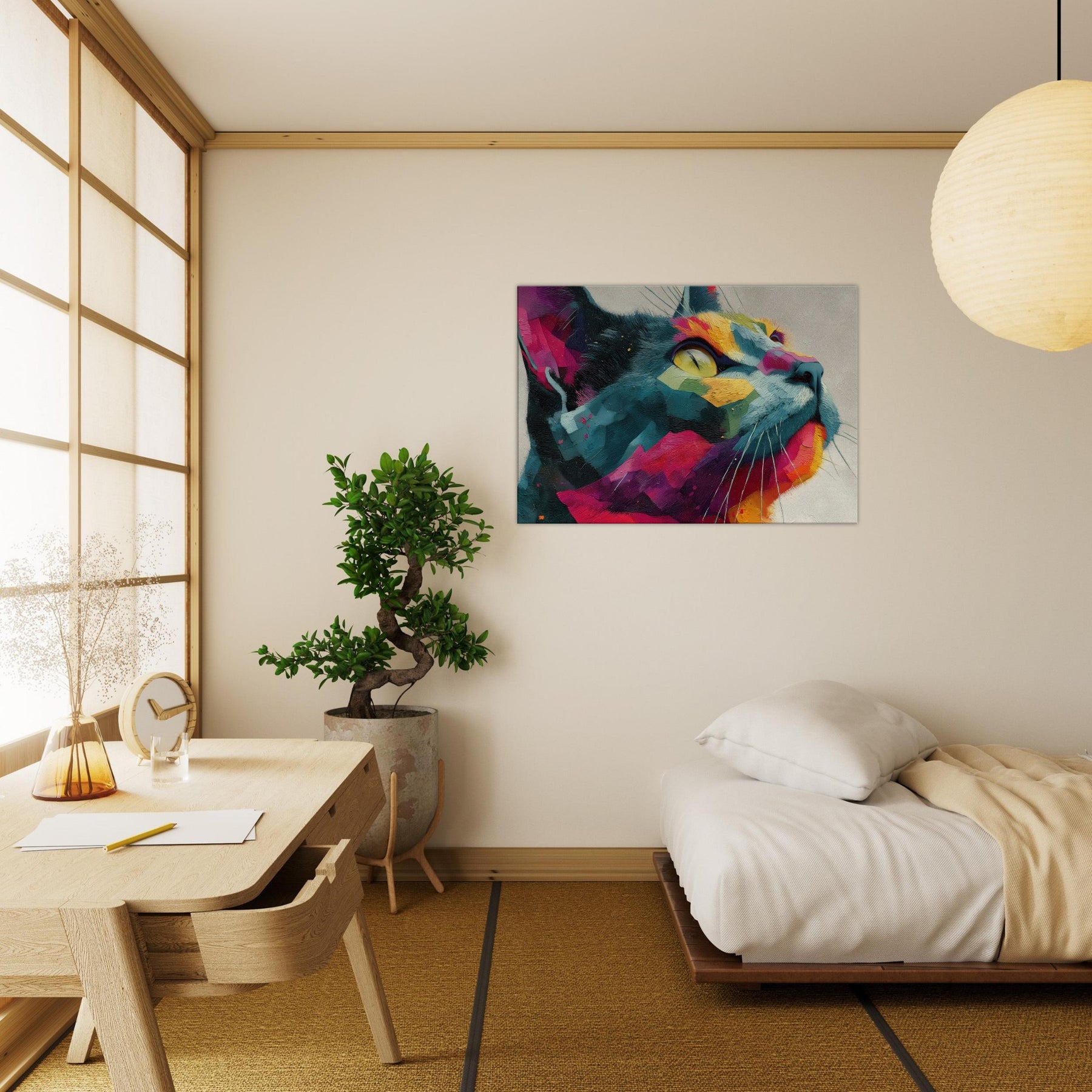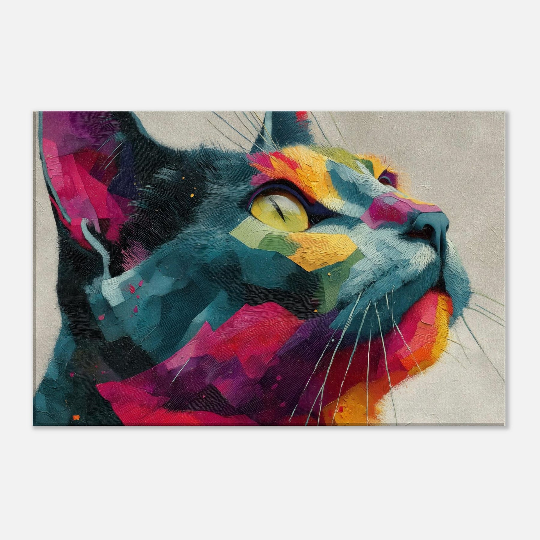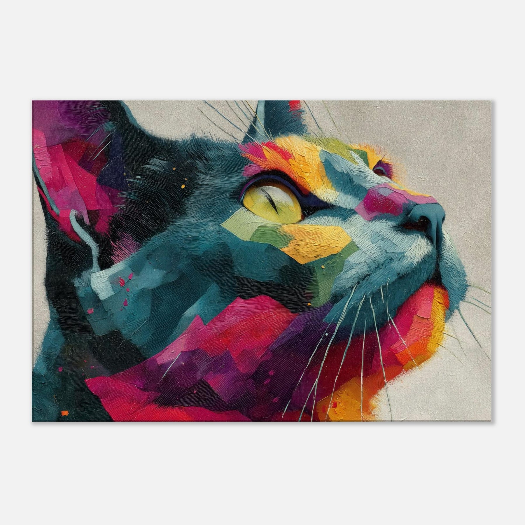 Cat inspired abstract unfolds as a sunlit dream, where bold color blocks meet tactile brushwork. The Cat subject emerges from a mosaic of vivid fragments, its gaze lifted toward a luminous horizon as if listening to the room’s quiet rhythm. This piece radiates warmth, movement, and a playful sophistication, turning any wall into a living window. Perfect for a modern living room or serene study, it invites calm wonder and everyday delight.