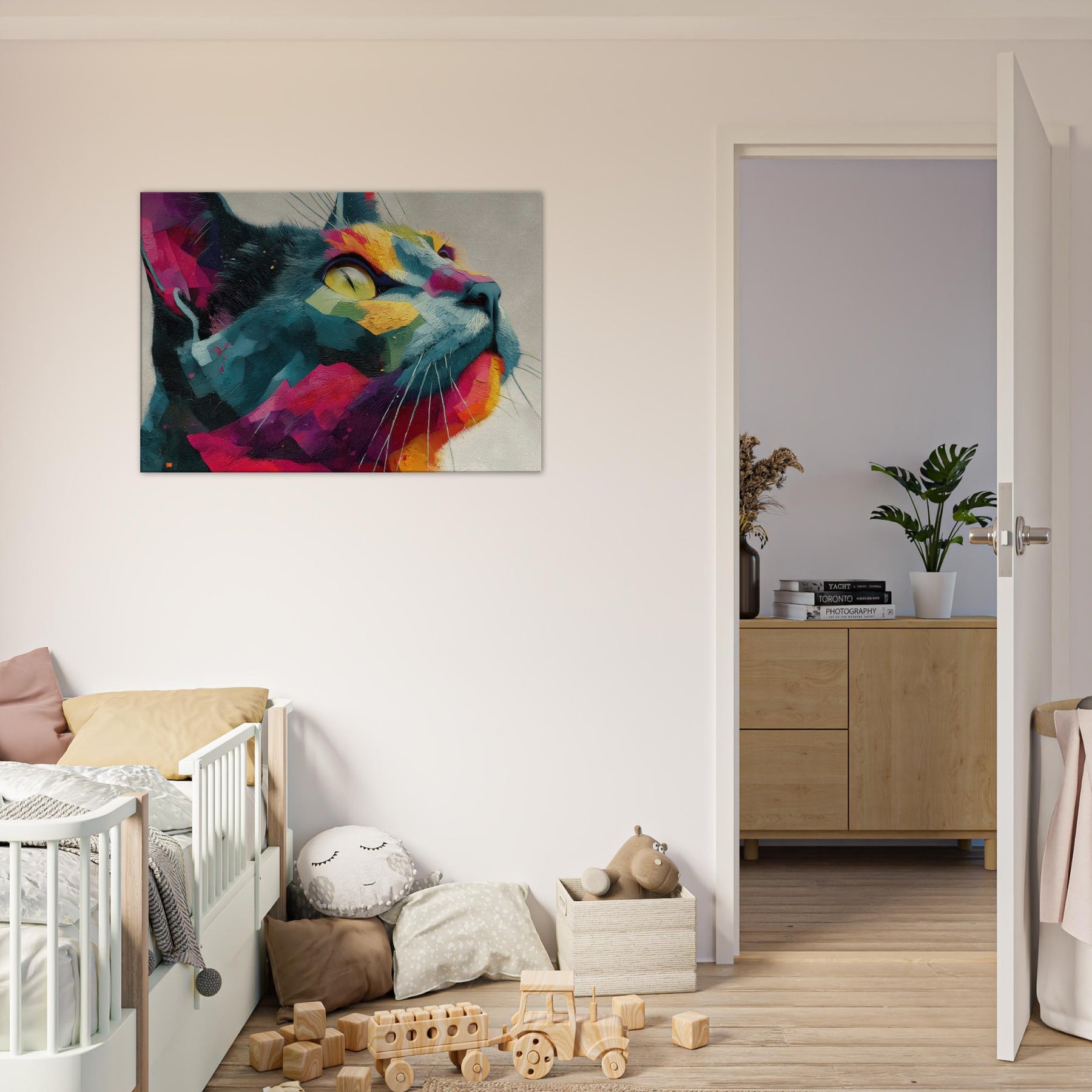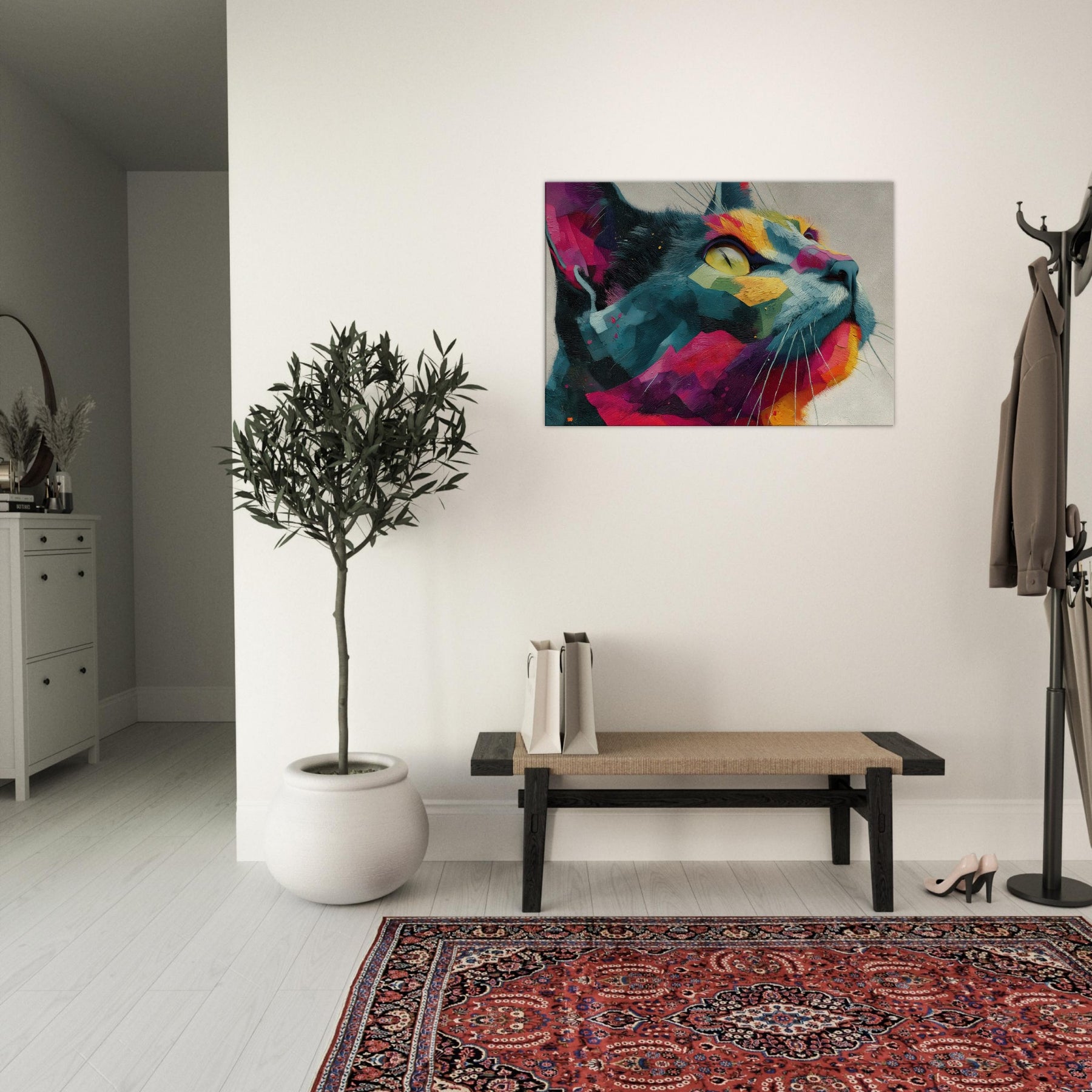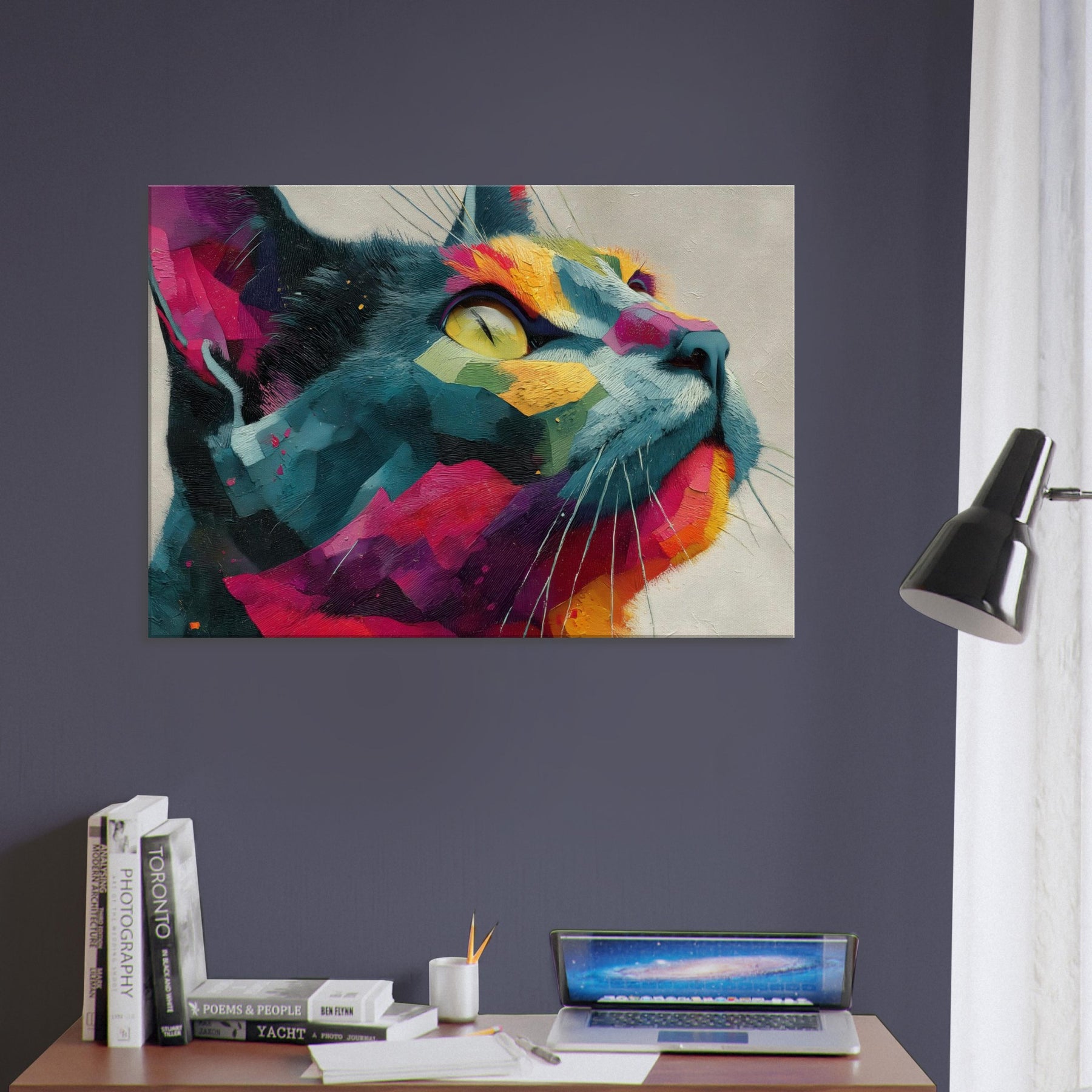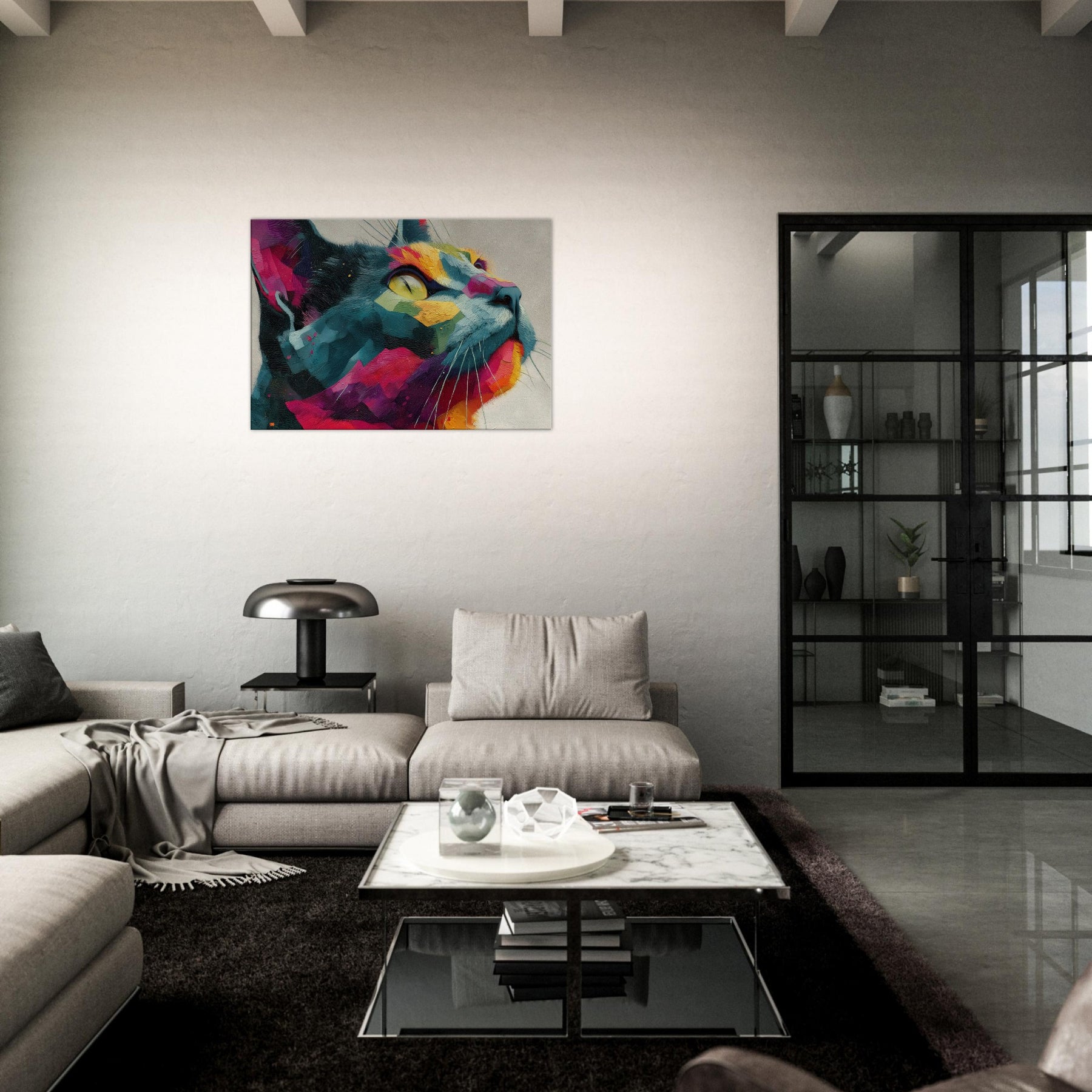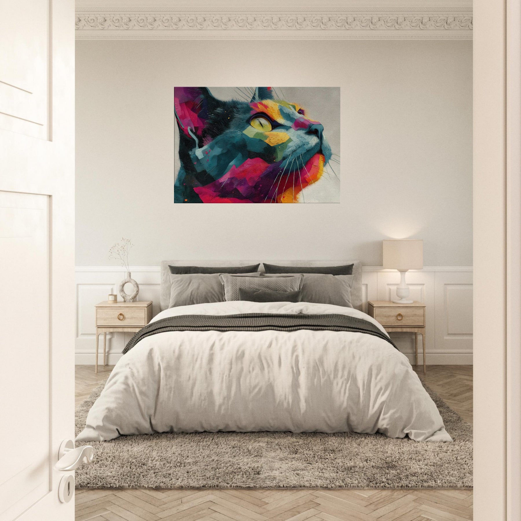 Cat inspired abstract unfolds as a sunlit dream, where bold color blocks meet tactile brushwork. The Cat subject emerges from a mosaic of vivid fragments, its gaze lifted toward a luminous horizon as if listening to the room’s quiet rhythm. This piece radiates warmth, movement, and a playful sophistication, turning any wall into a living window. Perfect for a modern living room or serene study, it invites calm wonder and everyday delight.