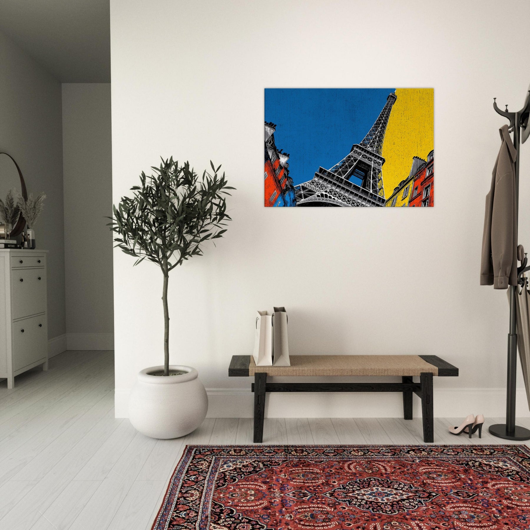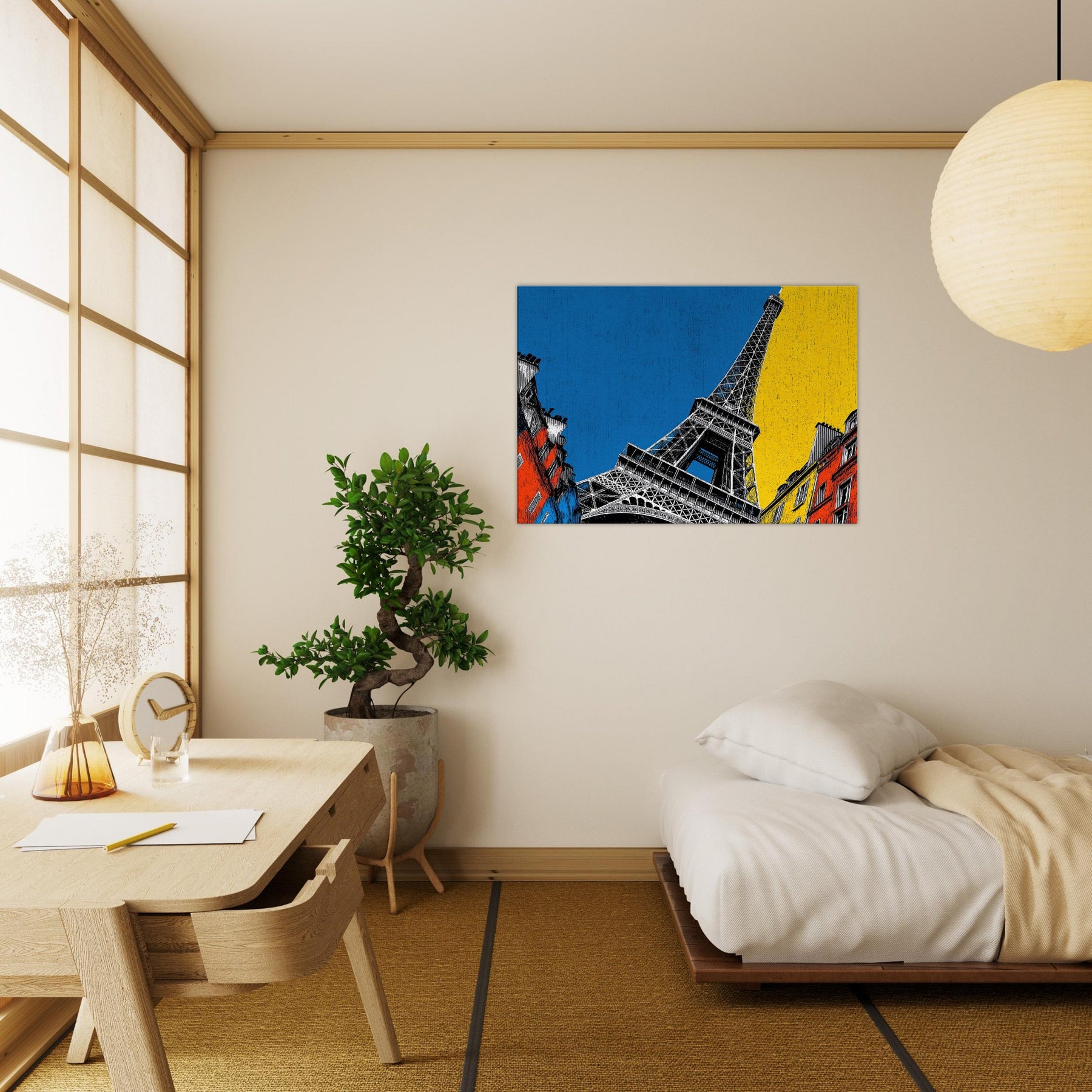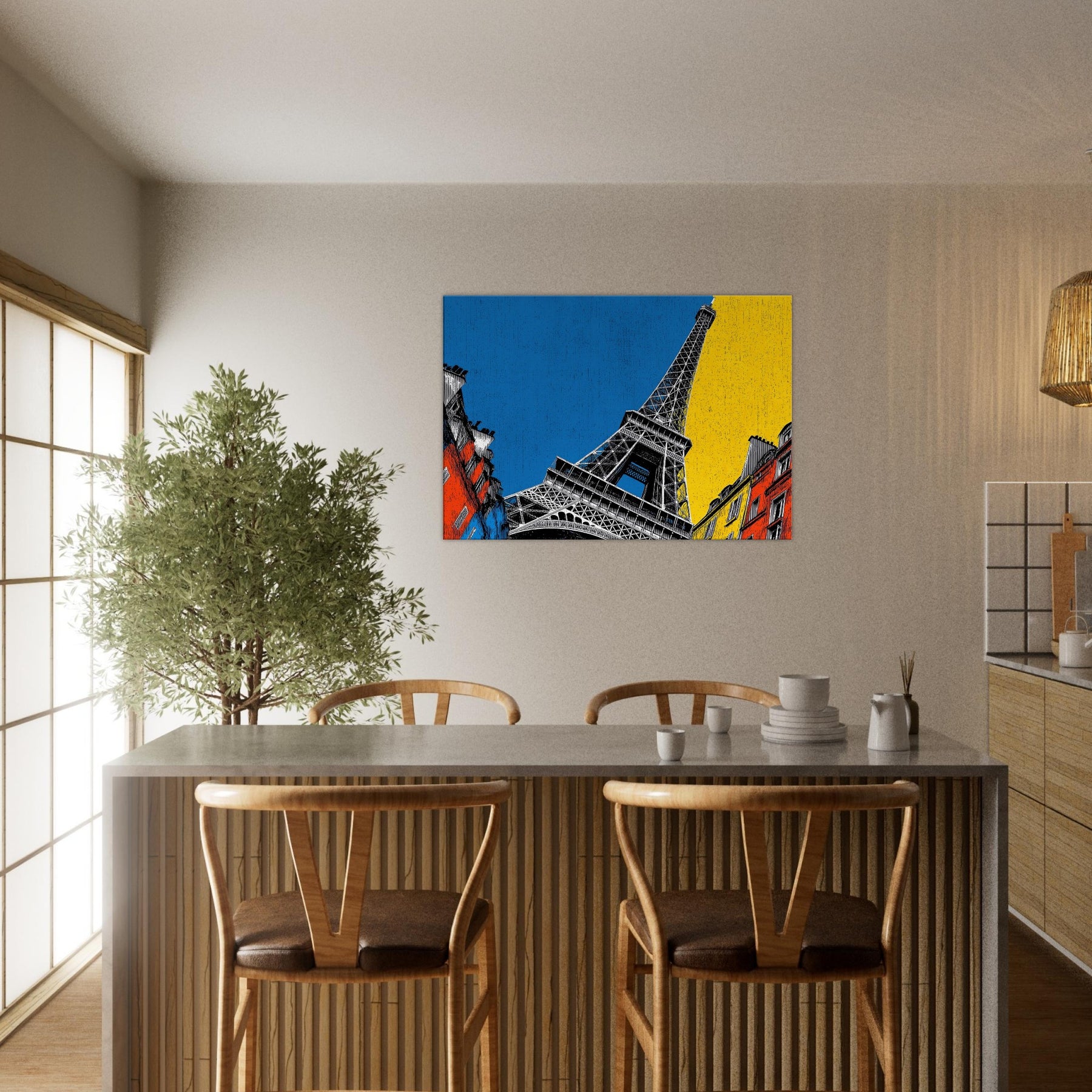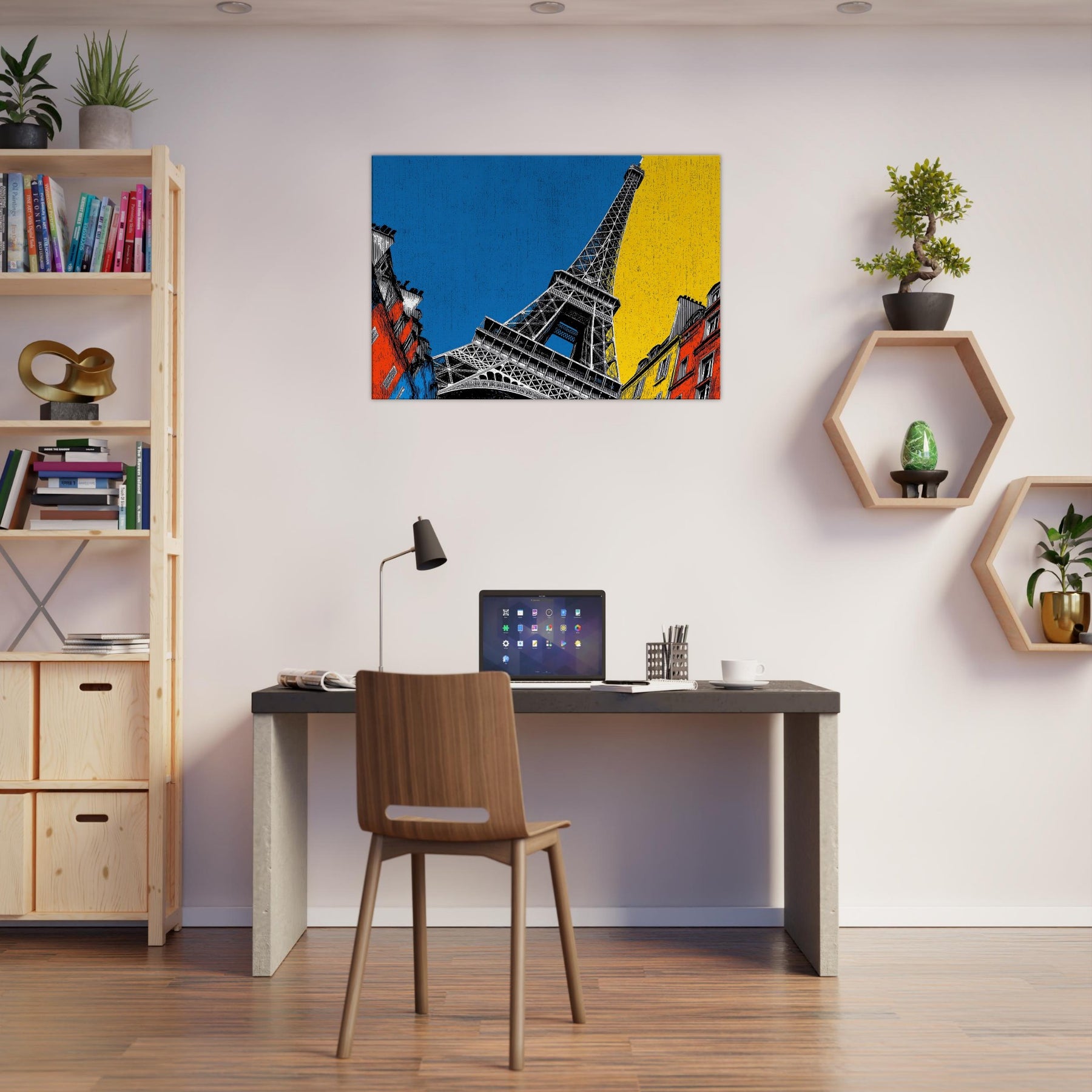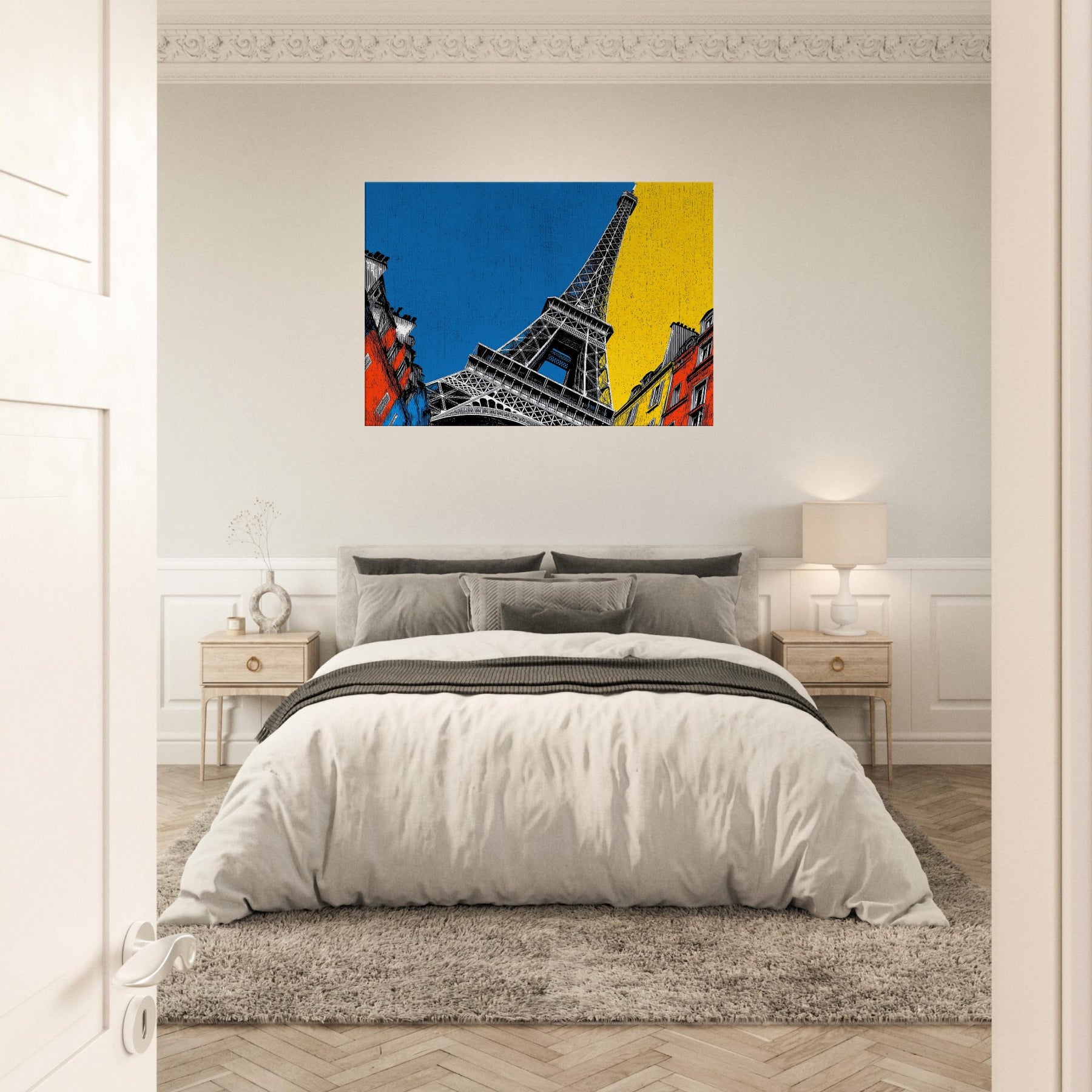 This abstract ode to the Eiffel Tower bathes a room in bold color and quiet drama. The lattice structure rises against a cobalt sky and a sun yellow glow, while surrounding buildings burnished in red and ochre anchor the scene. The piece invites the eye to travel the skyline, evoking twilight strolls and timeless Parisian charm. Place it in a living room or workspace to spark conversation, warmth, and a refined, cosmopolitan atmosphere that feels both modern and timeless.