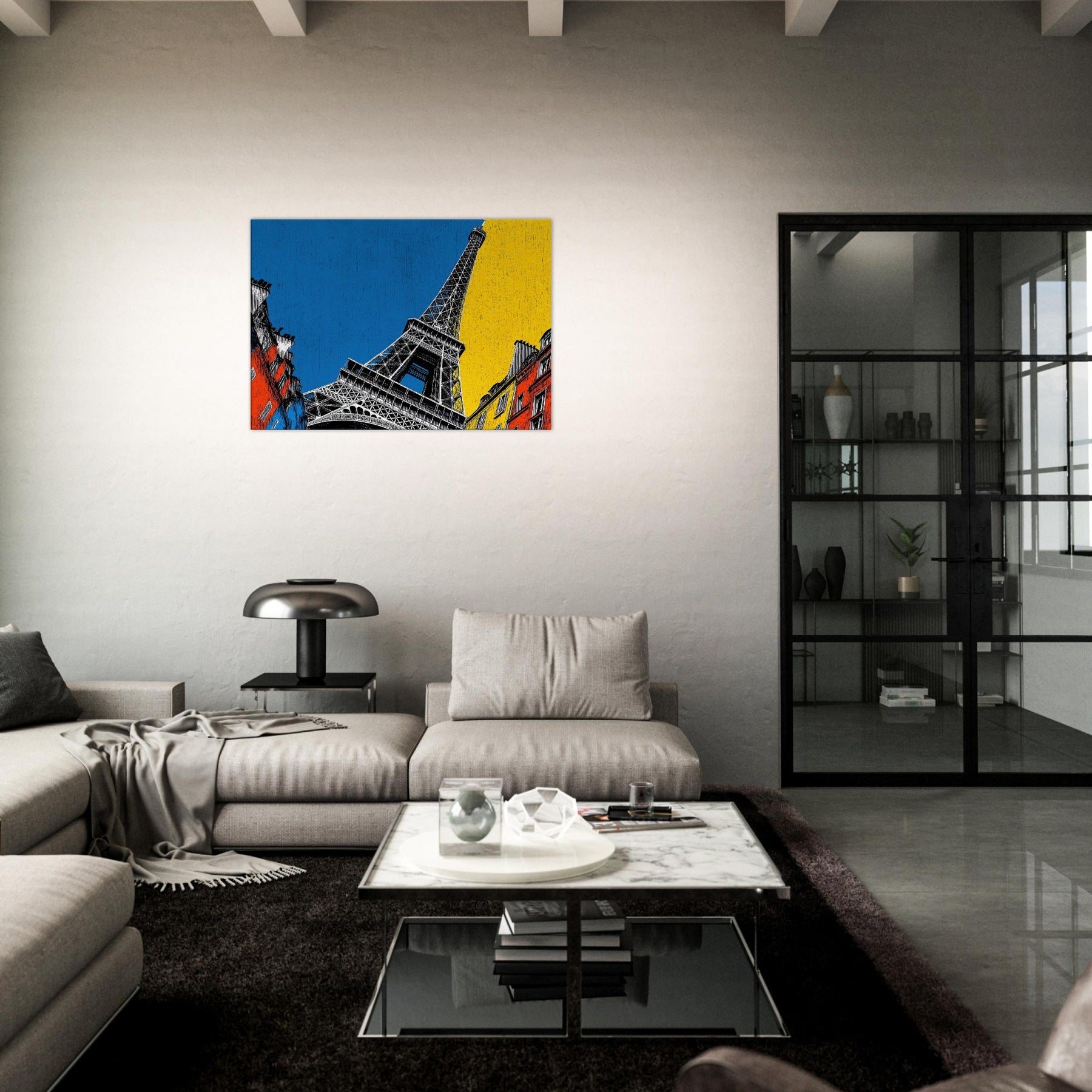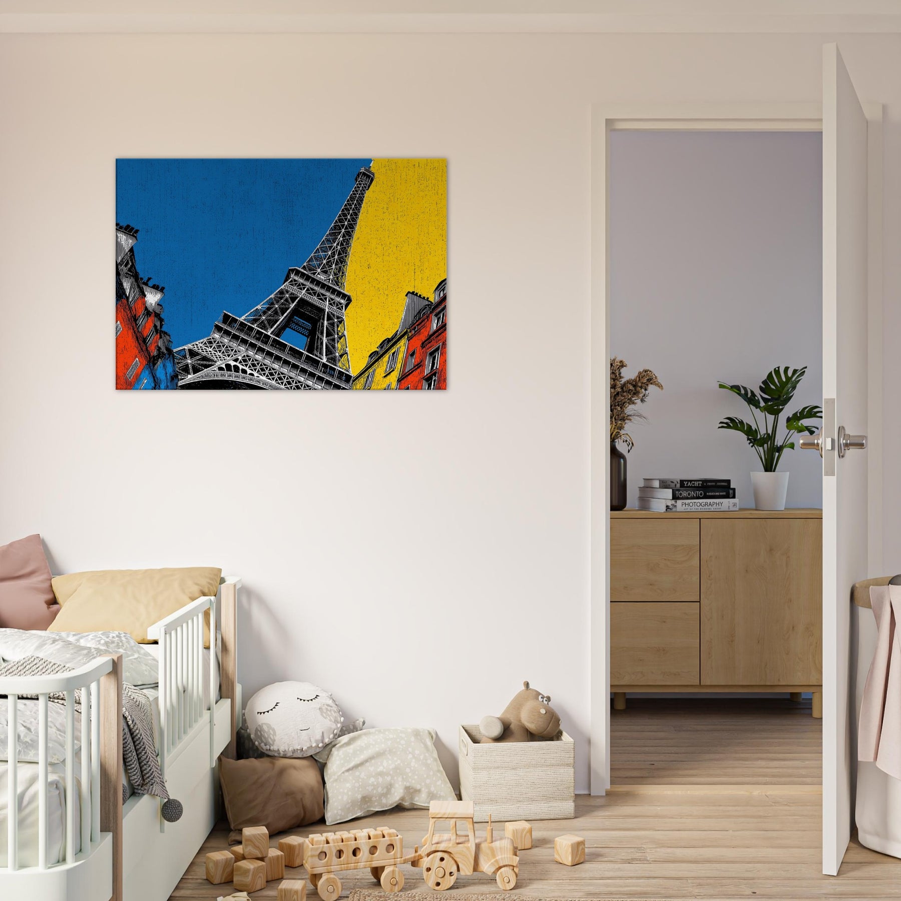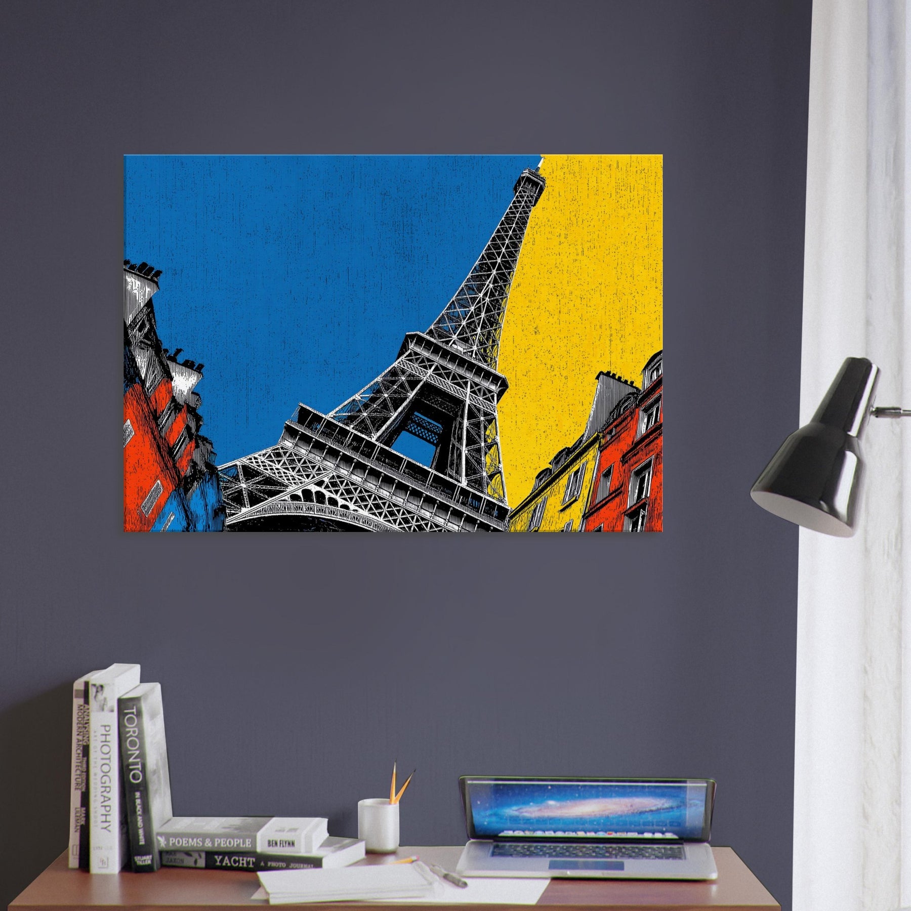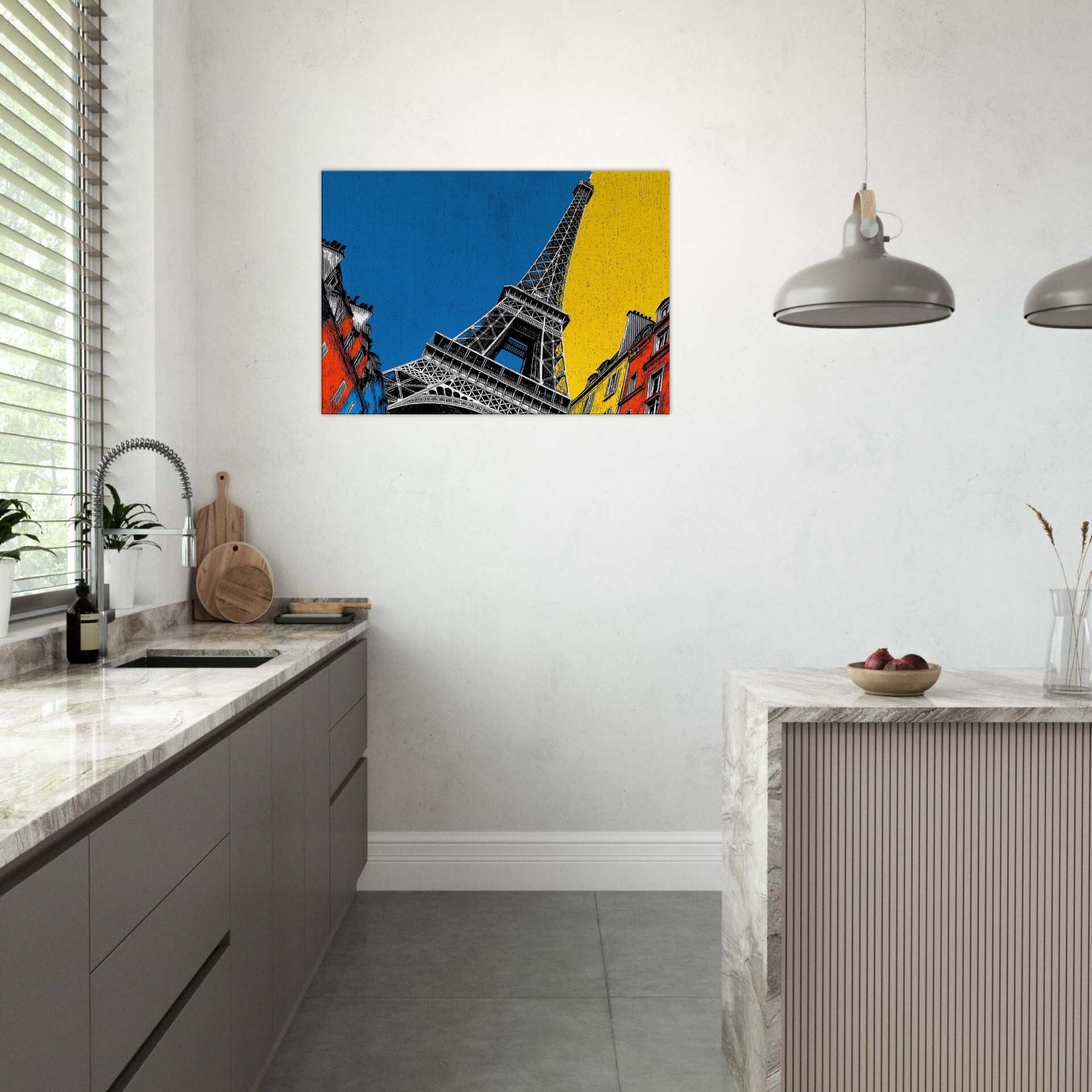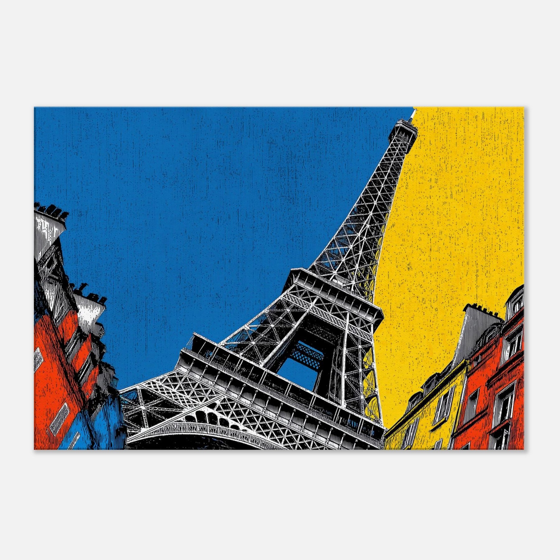 This abstract ode to the Eiffel Tower bathes a room in bold color and quiet drama. The lattice structure rises against a cobalt sky and a sun yellow glow, while surrounding buildings burnished in red and ochre anchor the scene. The piece invites the eye to travel the skyline, evoking twilight strolls and timeless Parisian charm. Place it in a living room or workspace to spark conversation, warmth, and a refined, cosmopolitan atmosphere that feels both modern and timeless.