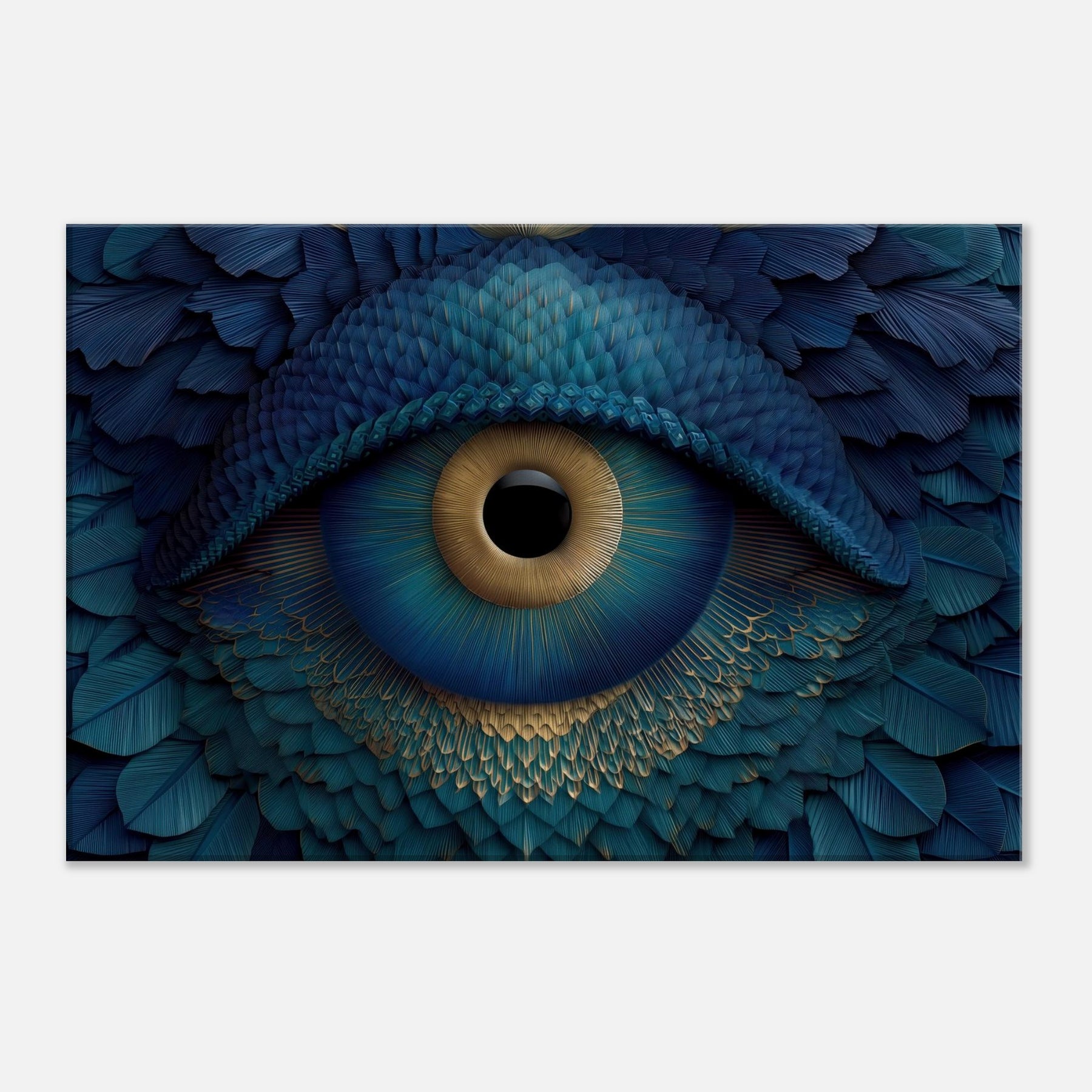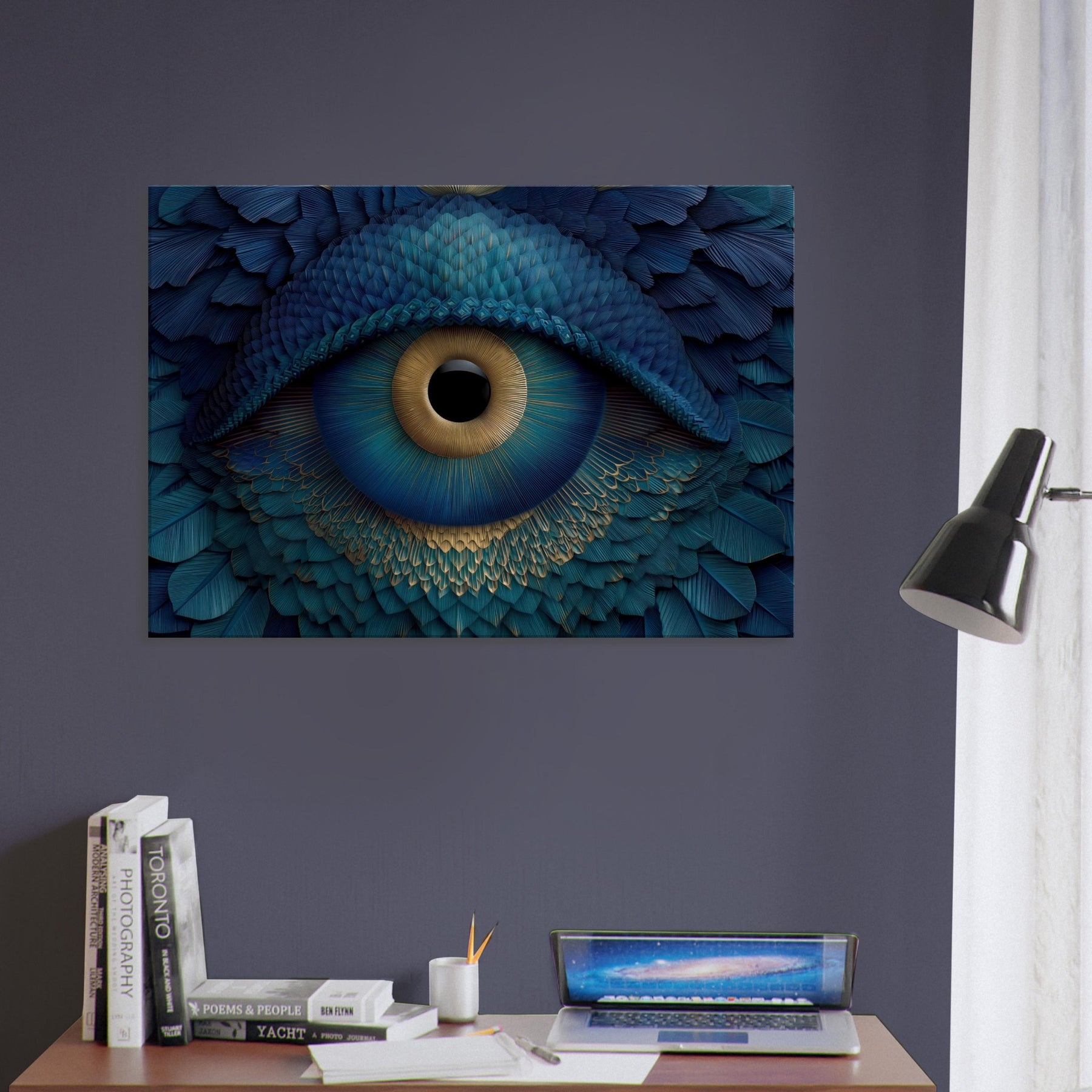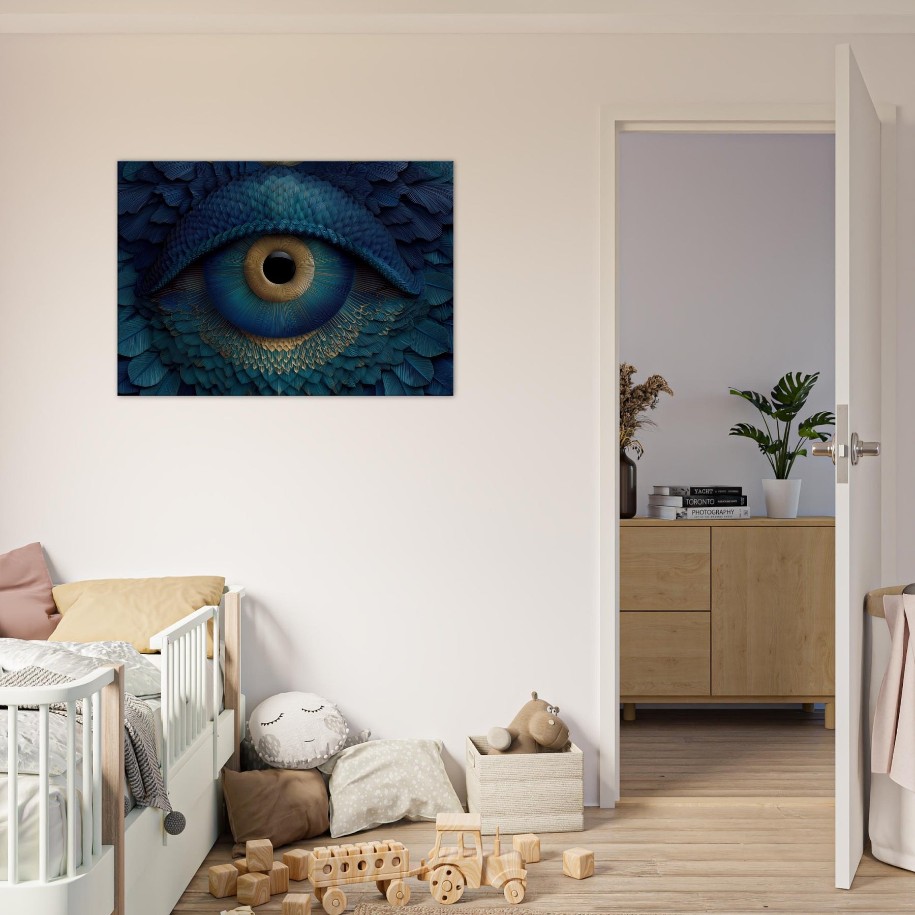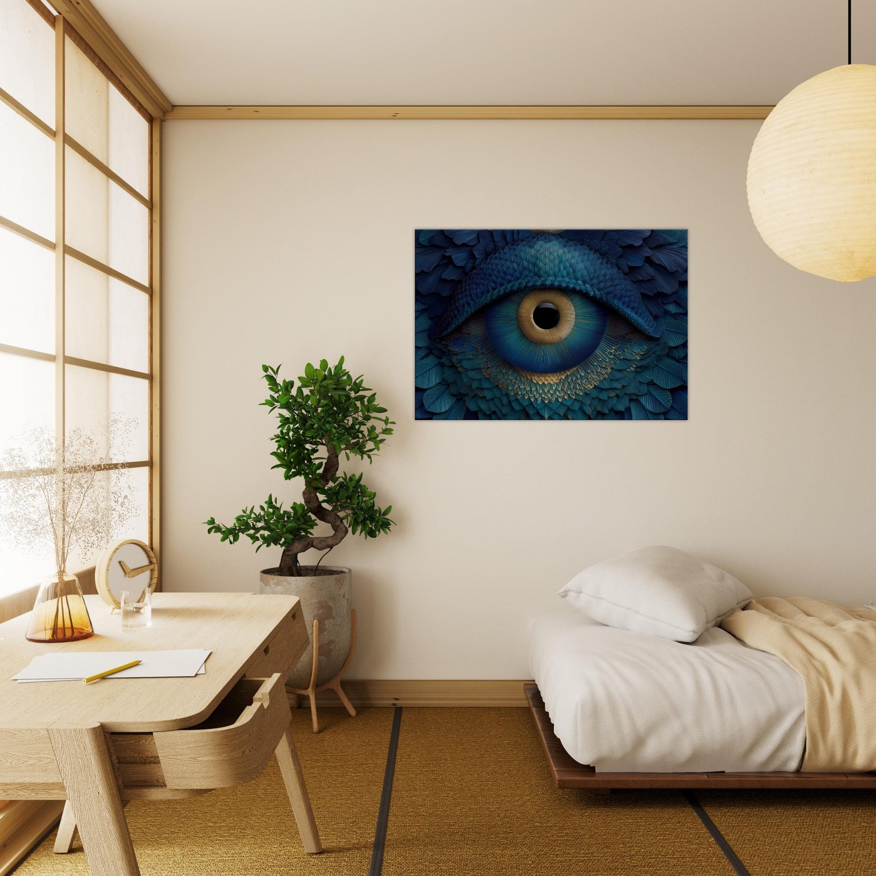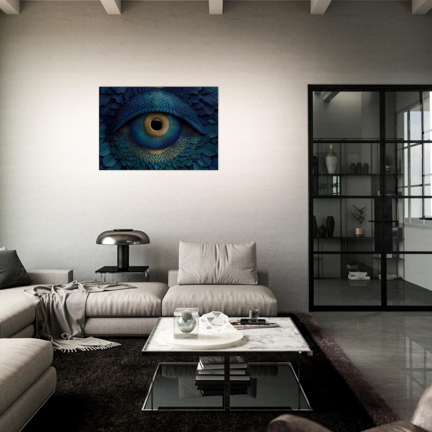 An orbit of color centers on the Eye of Providence, its pupil an abyss of velvet black rimmed by a gold corona. Abstract feathered textures ripple outward in cobalt and teal, like a sky lit from within. The piece invites quiet contemplation, turning any wall into a chamber of mystery perfect for a living room, study, or hallway. The atmosphere hums with dreamlike clarity, a mystical focal point that reframes light and invites you to look deeper.